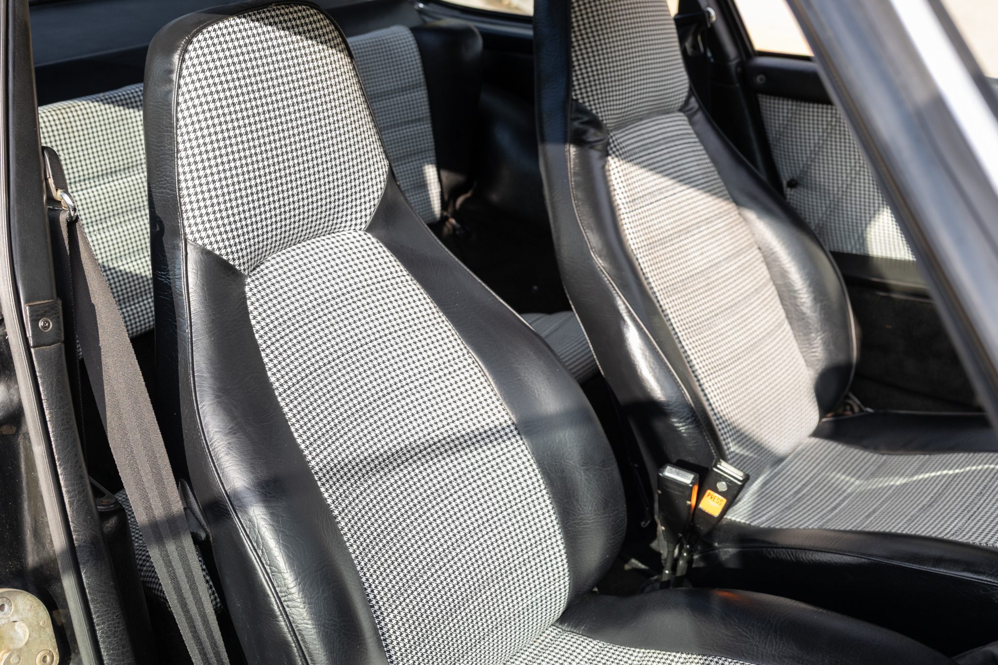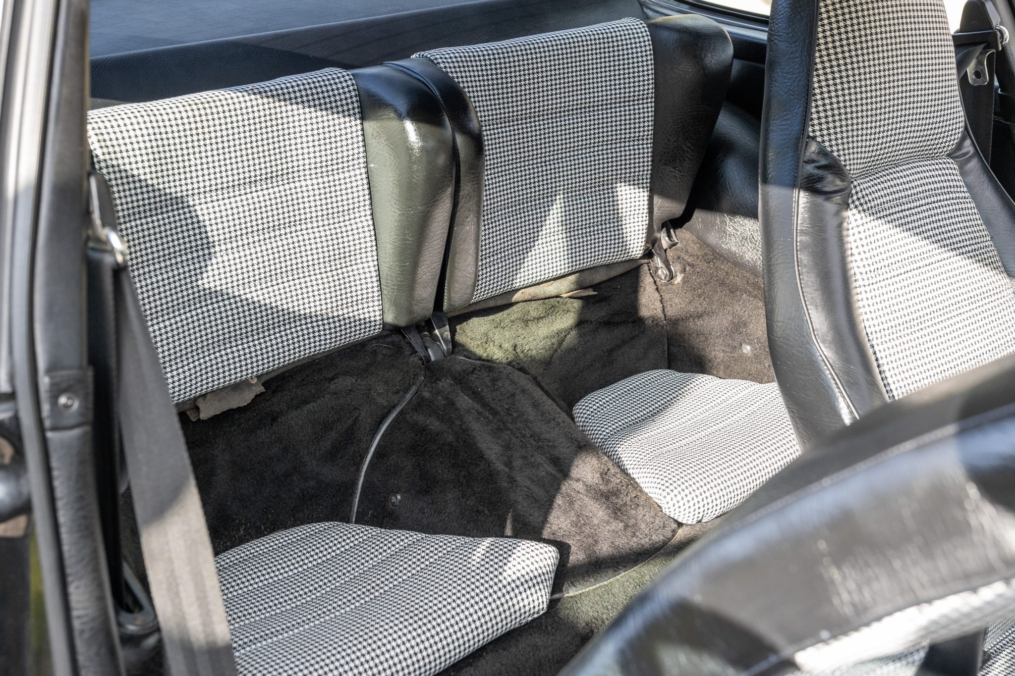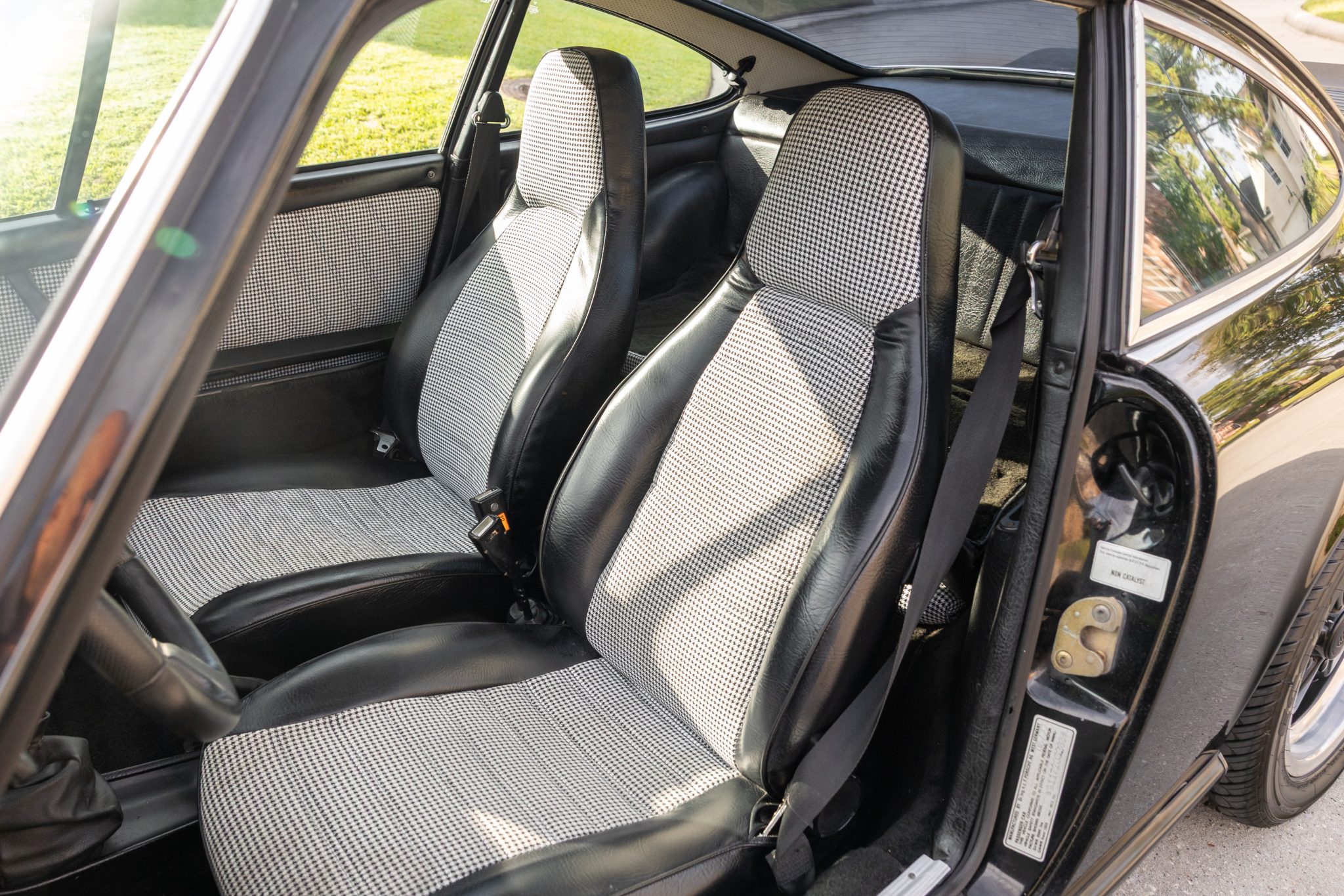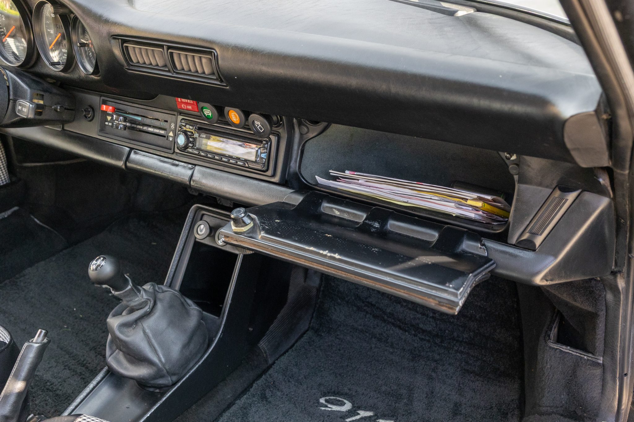 Subsequent recommissioning involved servicing the brakes, refreshing the fuel system, and replacing the battery, tires, starter, and shocks. The car is powered by a 2.7-liter flat-six mated to a five-speed manual transaxle and is finished in black over black leatherette and Pepita cloth upholstery. Equipment includes an aftermarket front bumper, a whale-tail rear spoiler, 15″ Fuchs alloy wheels, a sunroof, fog lights, body-color bumpers, front bucket seats, and air conditioning.