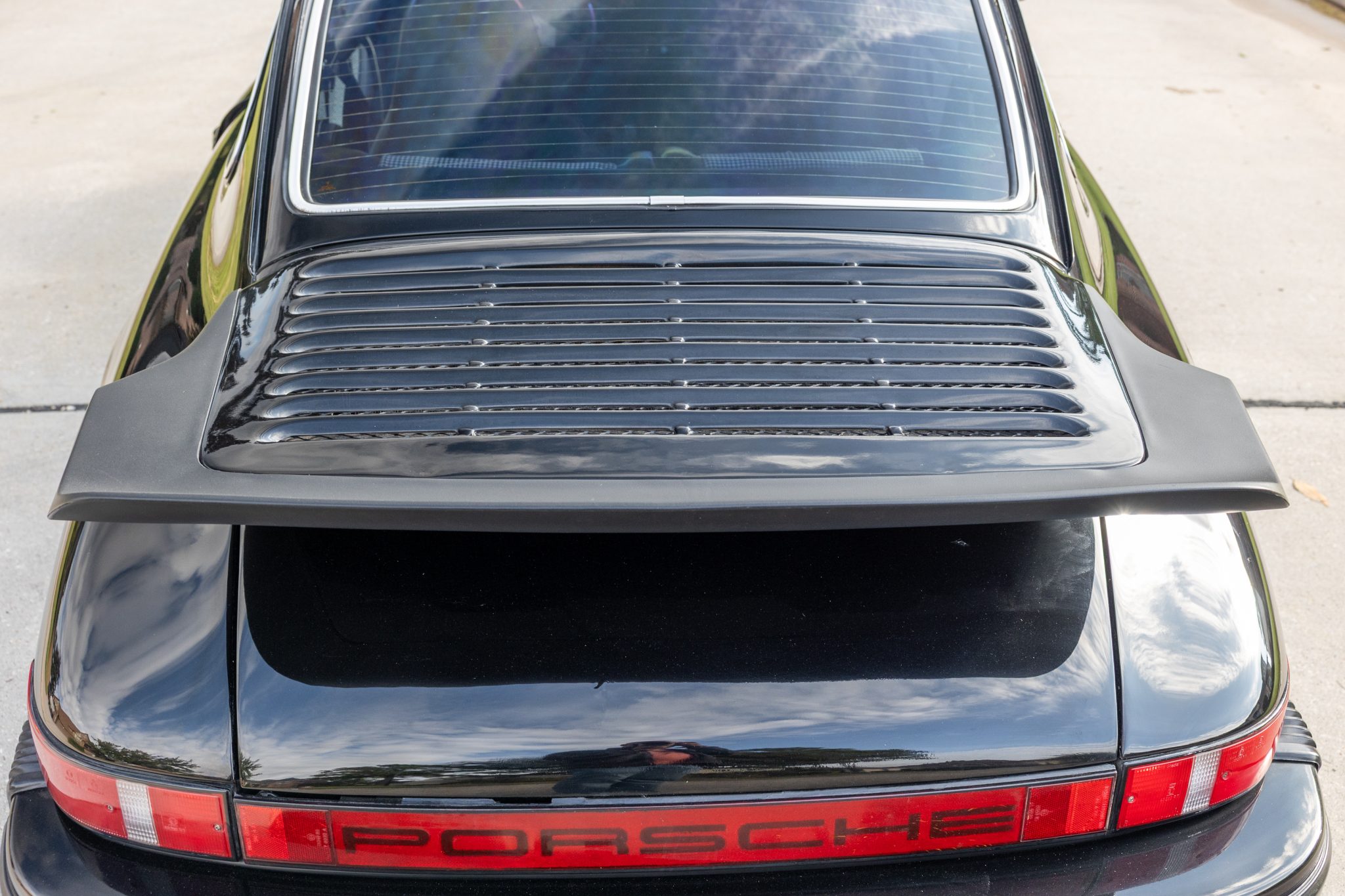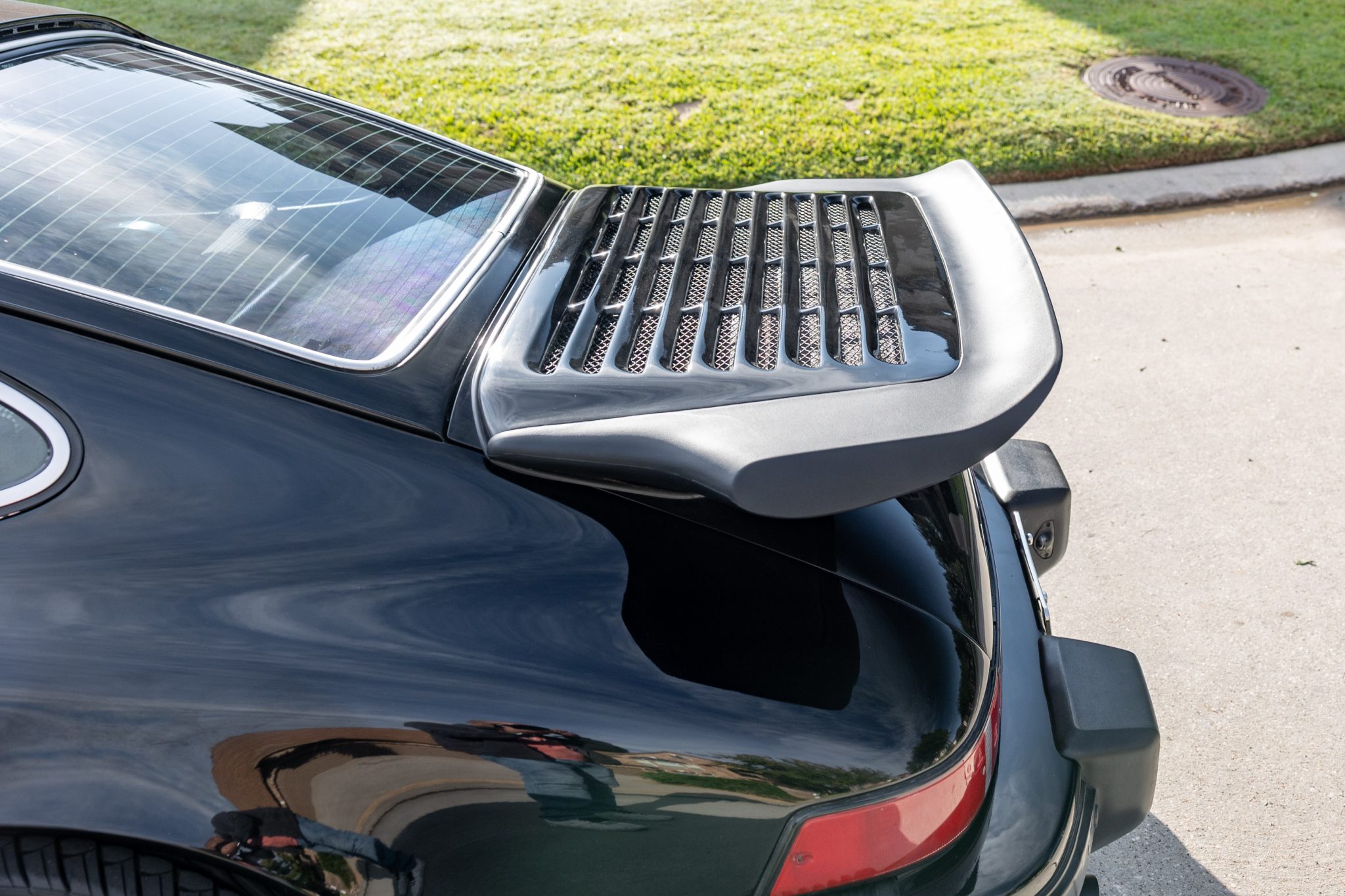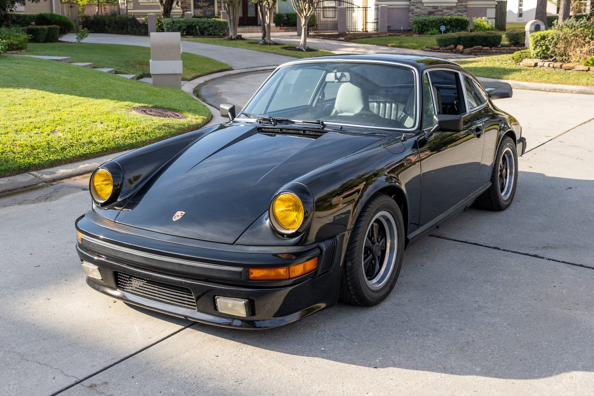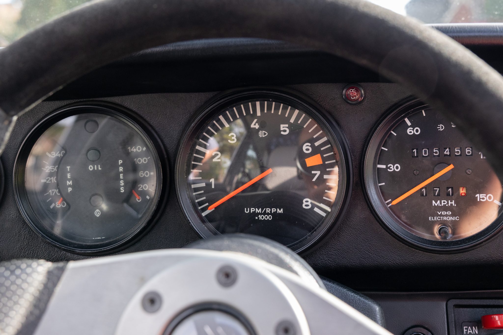 Subsequent recommissioning involved servicing the brakes, refreshing the fuel system, and replacing the battery, tires, starter, and shocks. The car is powered by a 2.7-liter flat-six mated to a five-speed manual transaxle and is finished in black over black leatherette and Pepita cloth upholstery. Equipment includes an aftermarket front bumper, a whale-tail rear spoiler, 15″ Fuchs alloy wheels, a sunroof, fog lights, body-color bumpers, front bucket seats, and air conditioning.