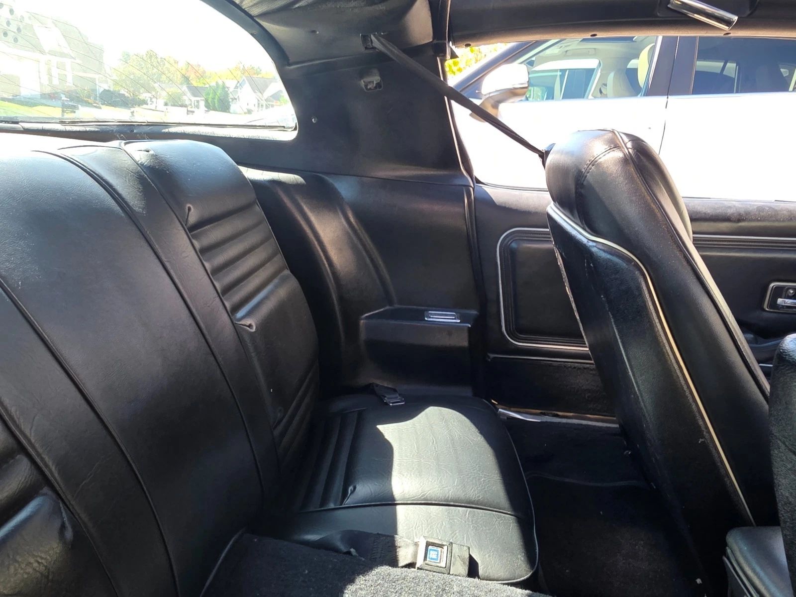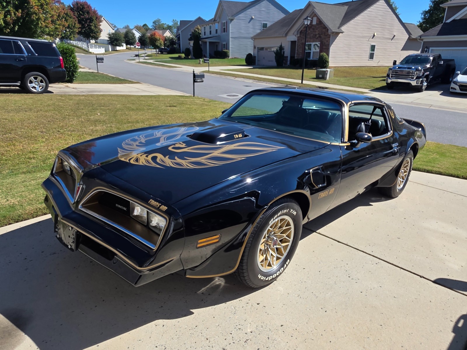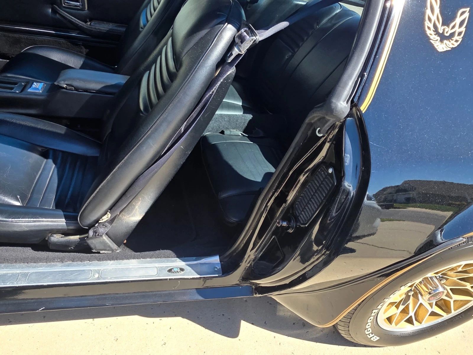 This car is driver quality. You can drive it and not have to worry about rock chips. It has not been restored, but it has had both quarters and rockers replaced by the previous owner before purchasing it. The T/A was originally red from the factory and was also painted black by the previous owner. The paint job is ok with some nicks and scratches from being driven, and it looks good from 10 feet away. The previous owner also had a Phoenix graphics decal kit installed. The wheels are 1977 15" snowflake wheels that are in pretty good shape. It also has an aftermarket Pontiac head unit, and the radio antenna is in the windshield. It also has a factory rear defrost.