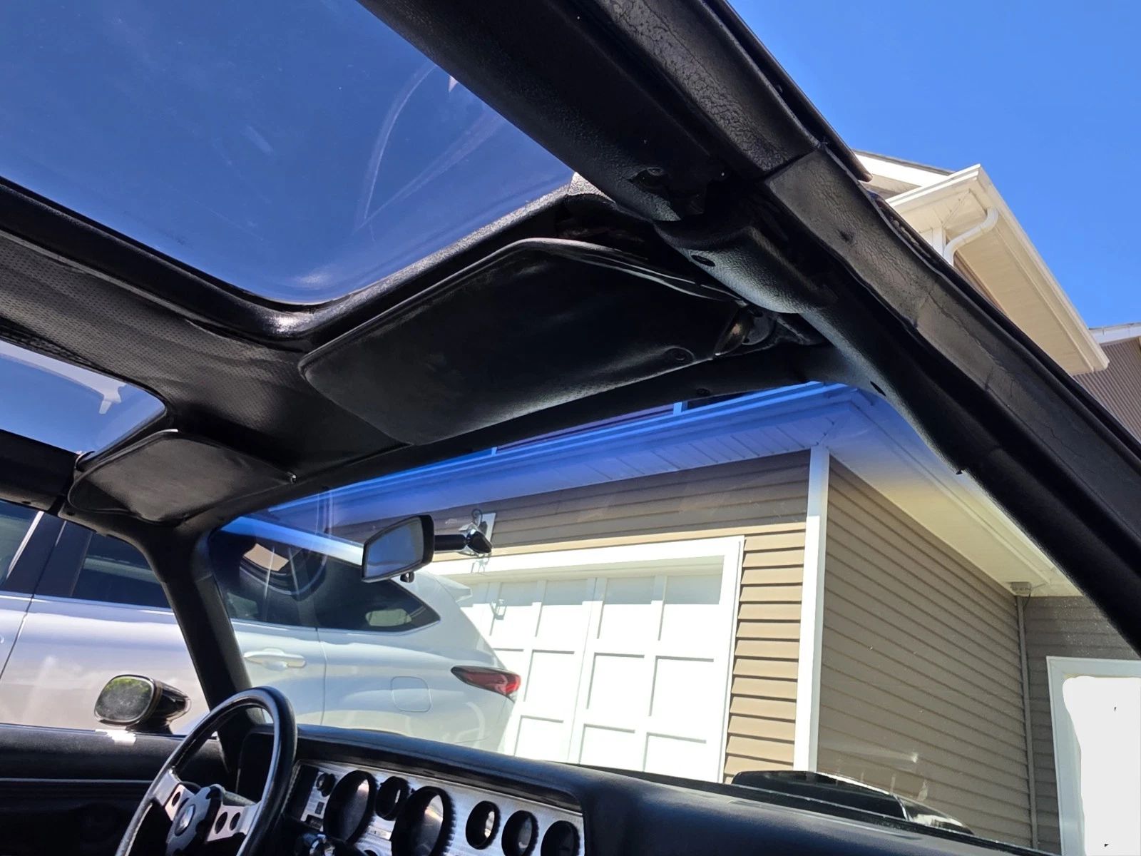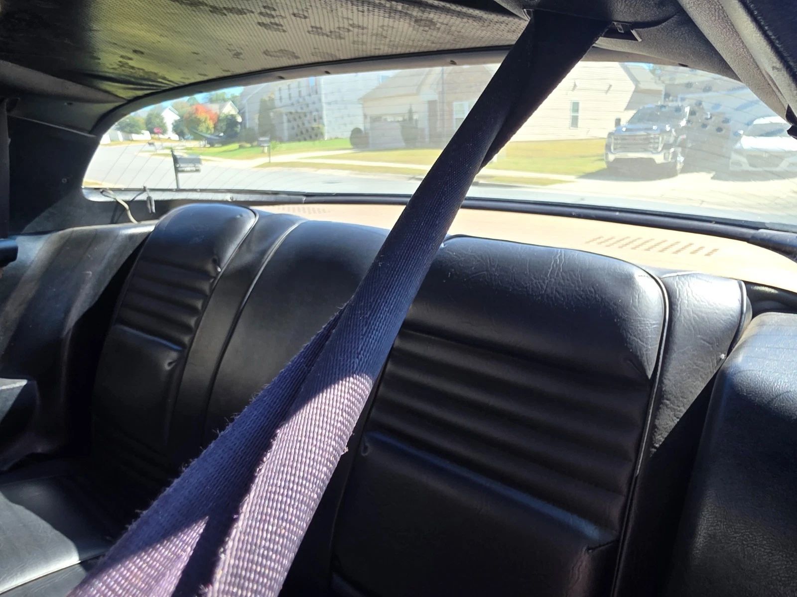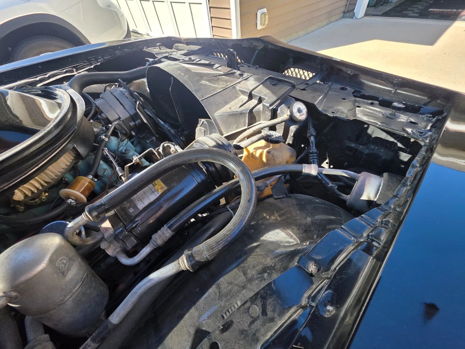 This car is driver quality. You can drive it and not have to worry about rock chips. It has not been restored, but it has had both quarters and rockers replaced by the previous owner before purchasing it. The T/A was originally red from the factory and was also painted black by the previous owner. The paint job is ok with some nicks and scratches from being driven, and it looks good from 10 feet away. The previous owner also had a Phoenix graphics decal kit installed. The wheels are 1977 15" snowflake wheels that are in pretty good shape. It also has an aftermarket Pontiac head unit, and the radio antenna is in the windshield. It also has a factory rear defrost.