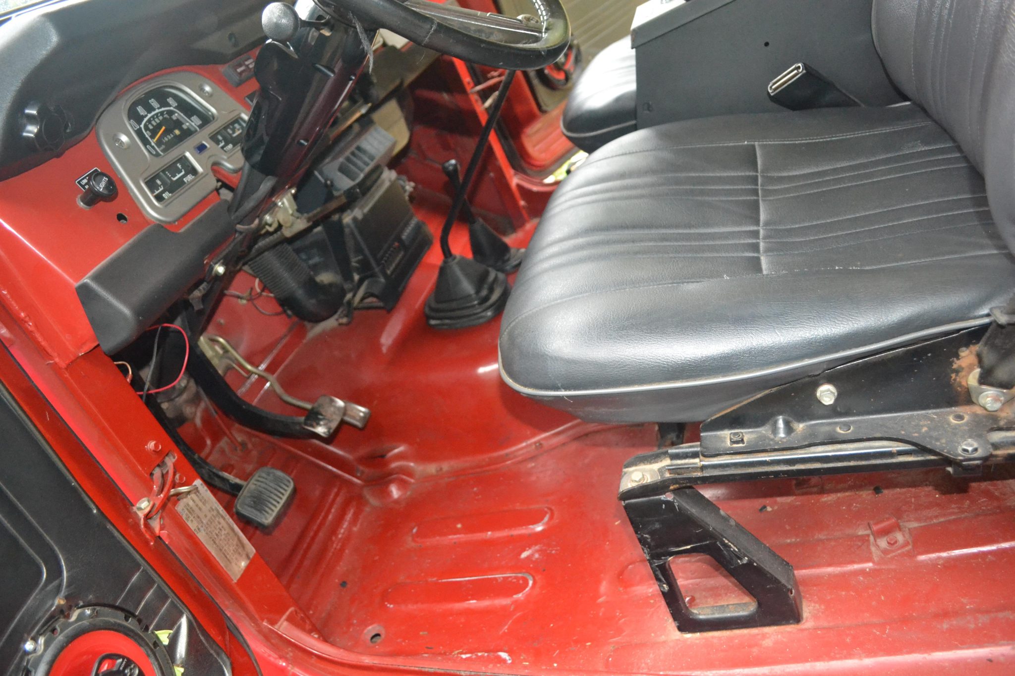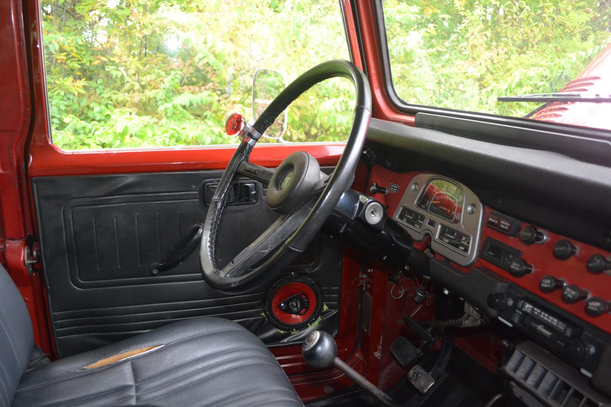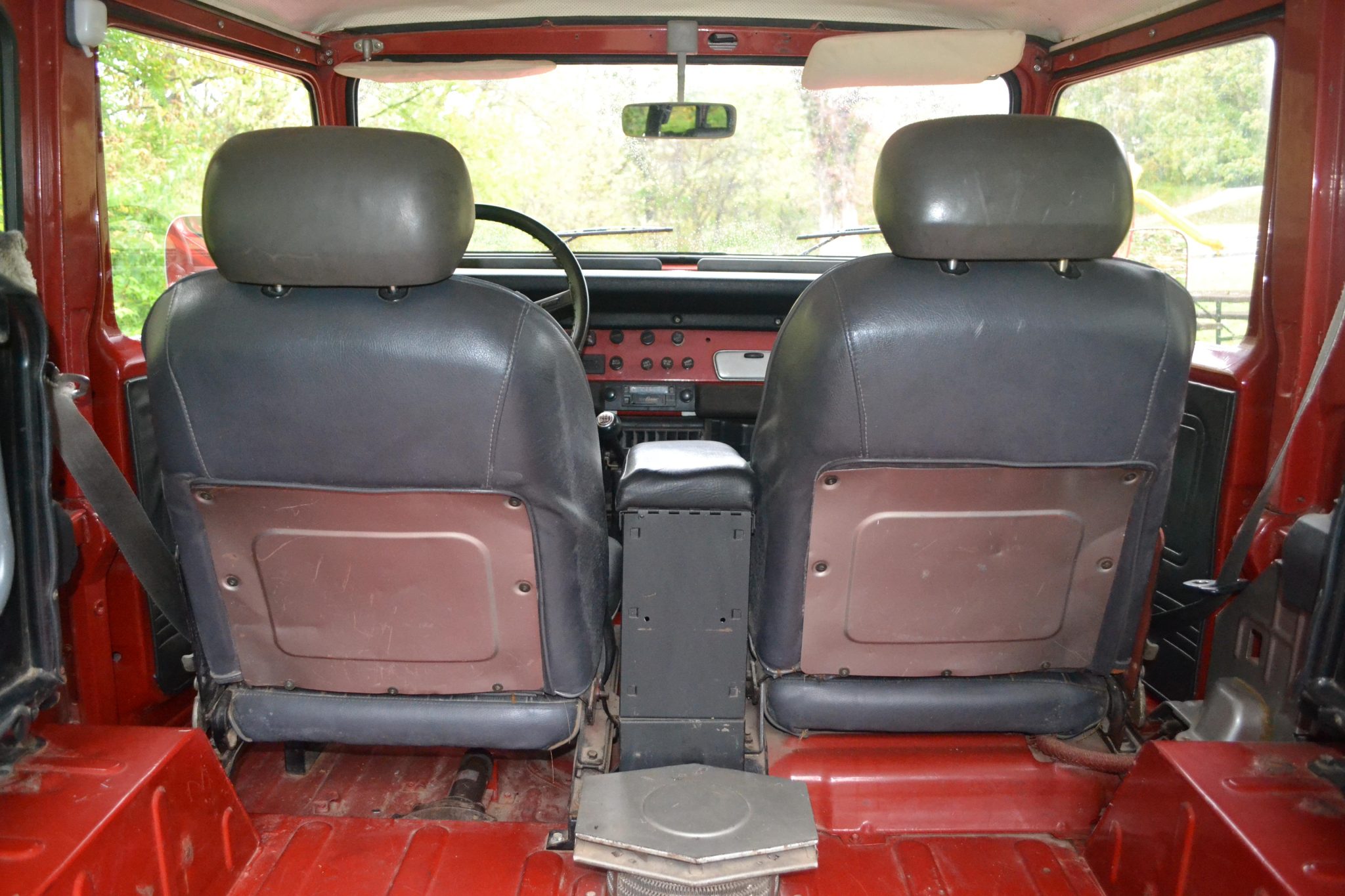 This 1978 Toyota Land Cruiser FJ40 has been refinished in red over gray vinyl upholstery and is powered by a 4.2-liter 2F inline-six linked with a four-speed manual transmission and a dual-range transfer case. The truck has 15″ aftermarket wheels, manually locking front hubs, power steering, a removable hardtop, a receiver hitch, front and rear cabin heaters, a locking center console, and rear jump seats.