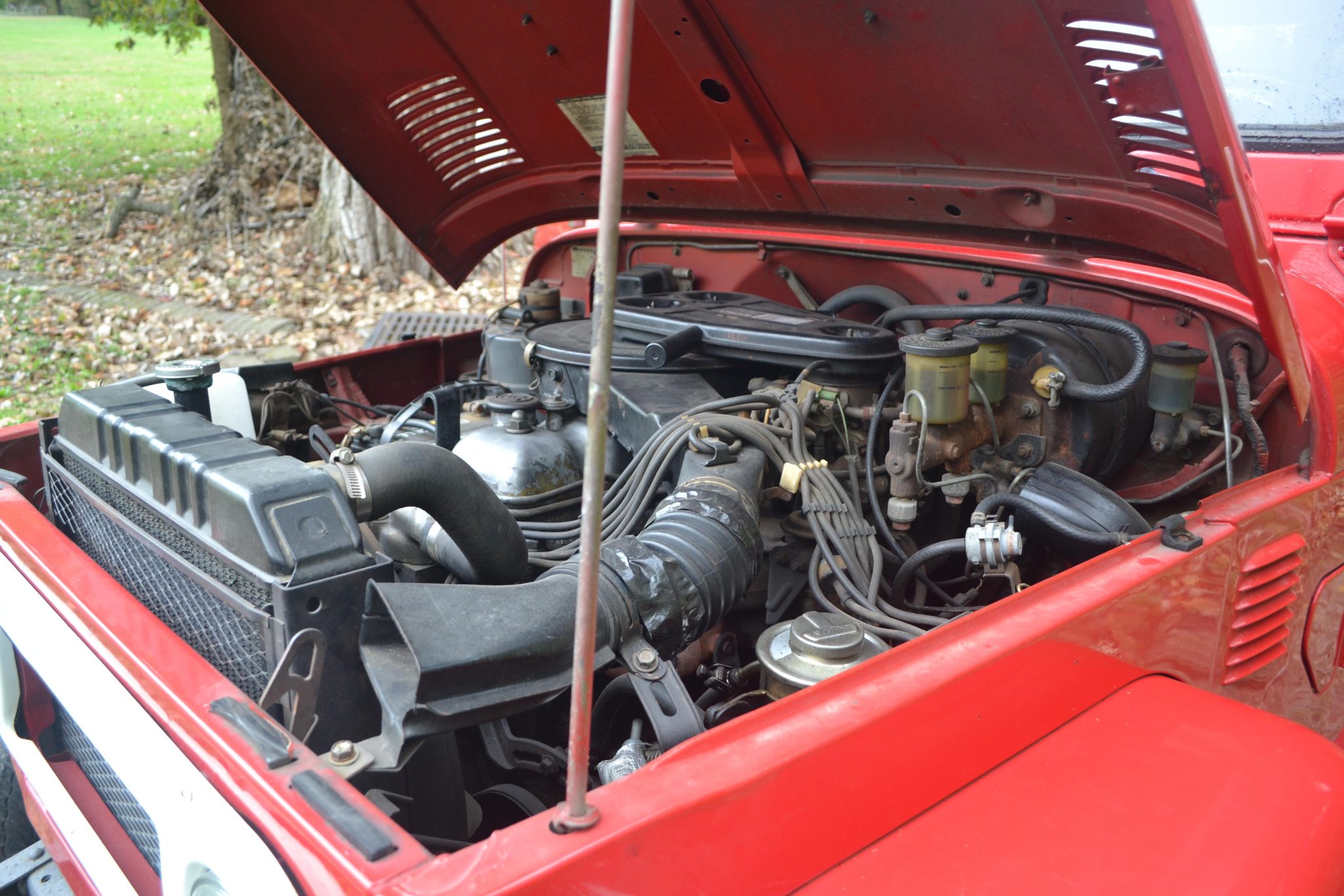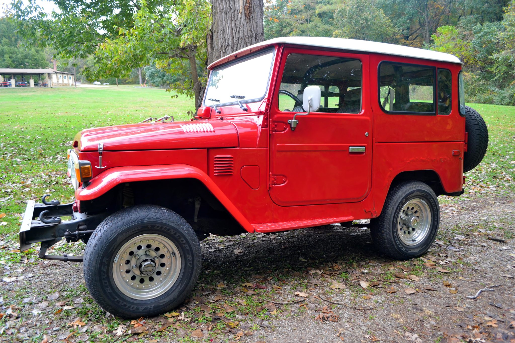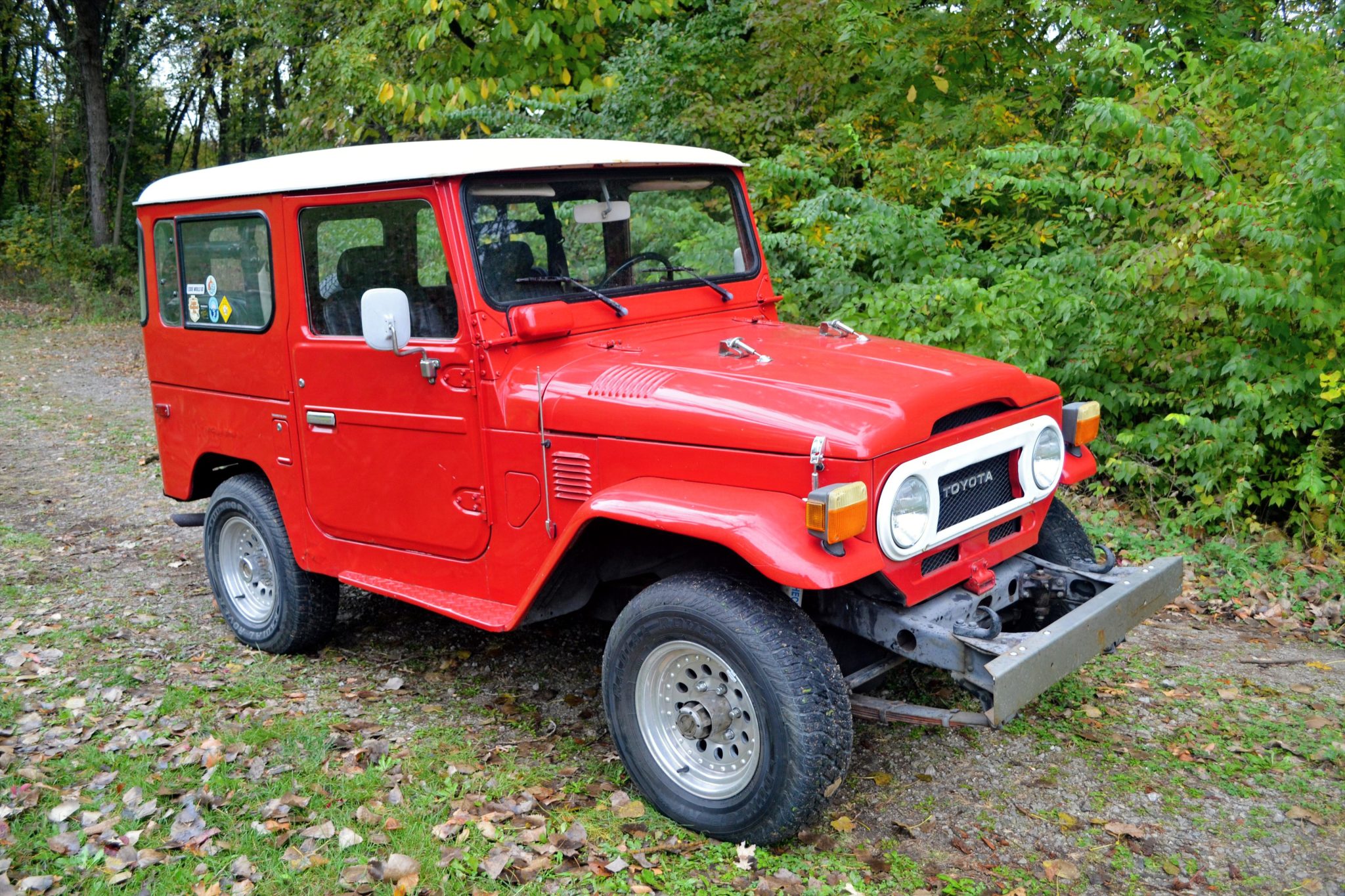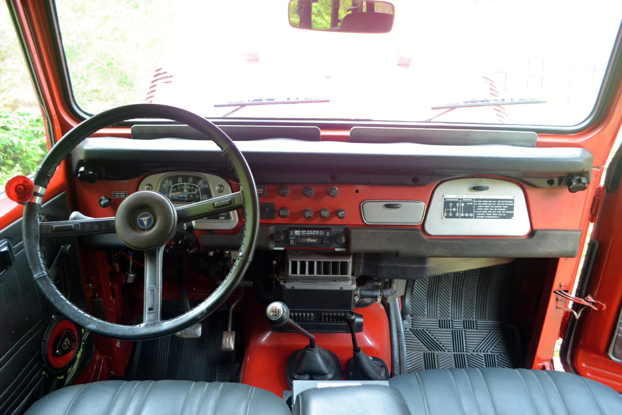 This 1978 Toyota Land Cruiser FJ40 has been refinished in red over gray vinyl upholstery and is powered by a 4.2-liter 2F inline-six linked with a four-speed manual transmission and a dual-range transfer case. The truck has 15″ aftermarket wheels, manually locking front hubs, power steering, a removable hardtop, a receiver hitch, front and rear cabin heaters, a locking center console, and rear jump seats.