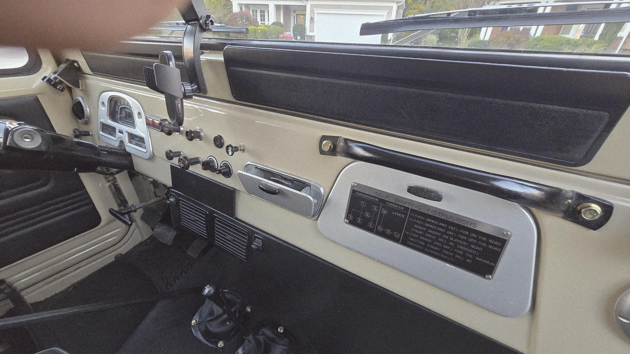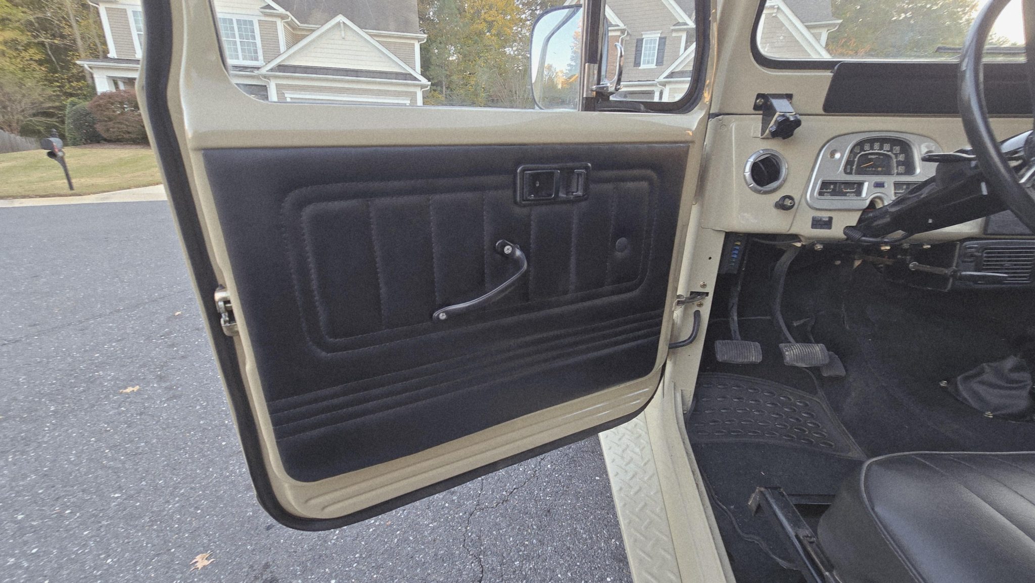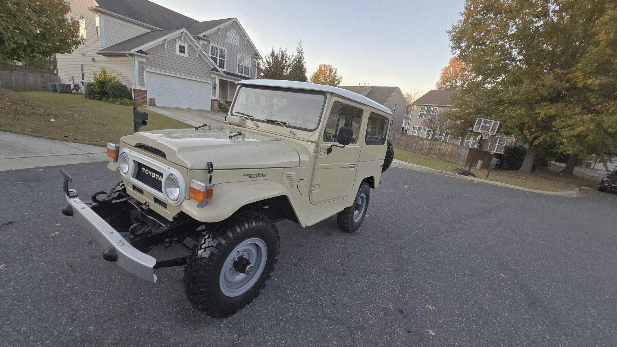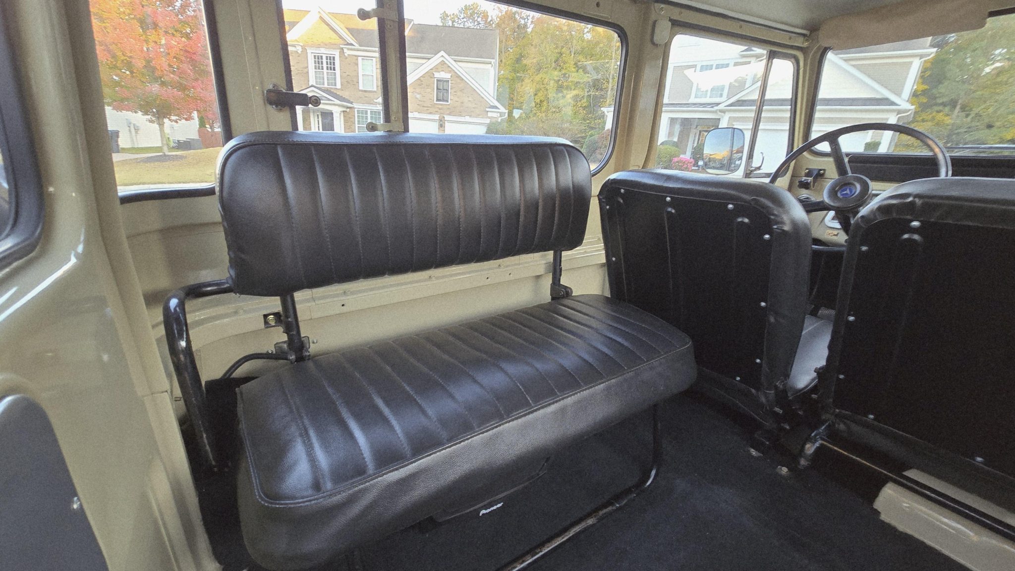Finished in beige over black upholstery, the truck is powered by a 4.2-liter 2F inline-six linked with a four-speed manual transmission and a dual-range transfer case. Details include a removable hardtop and a white roof as well as 16″ wheels, manually locking front hubs, power steering, four-wheel disc brakes, and a rear pintle hitch and tow ball. Inside, air conditioning, rear jump seats, power windows, and a Bluetooth-enabled sound system are fitted.
