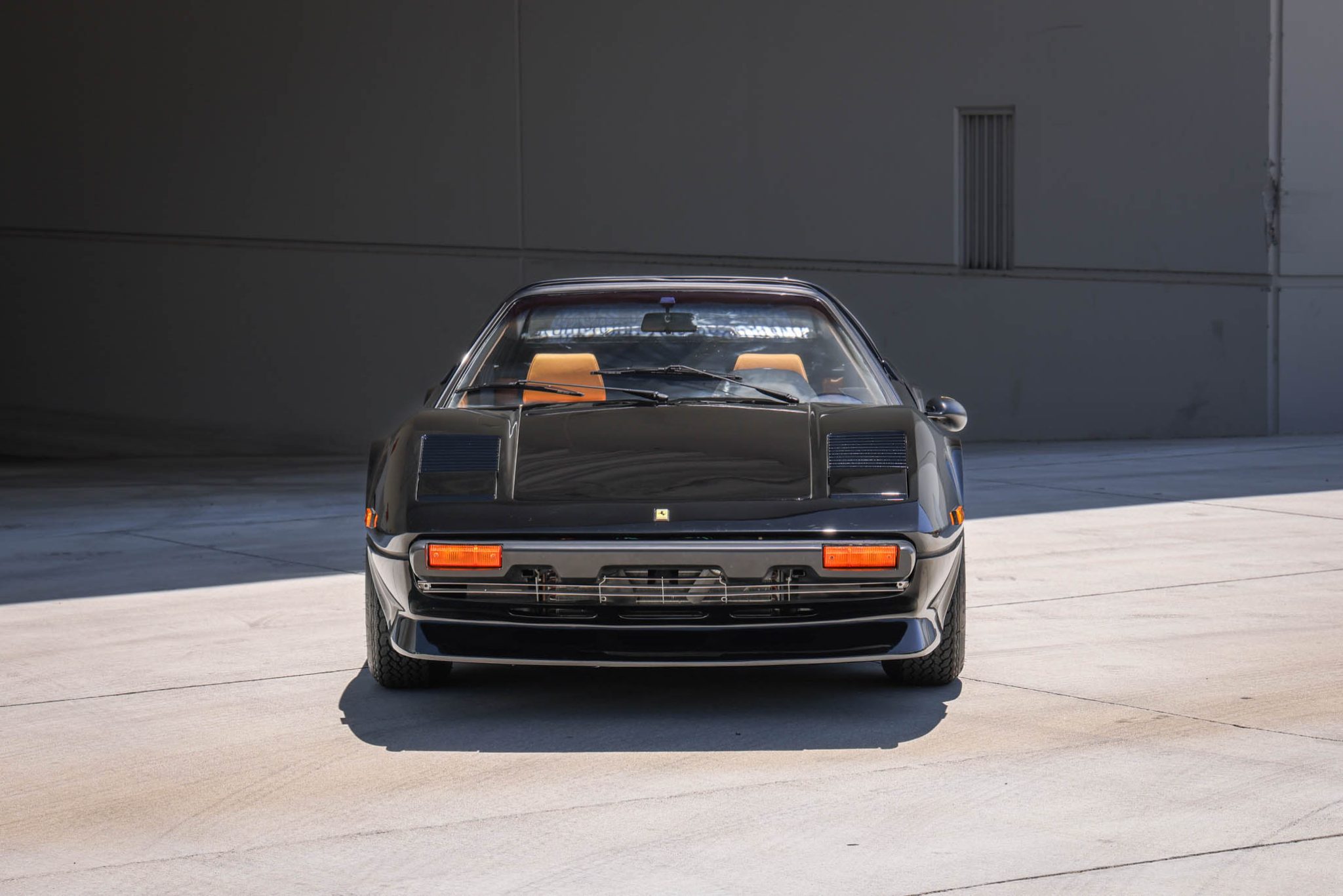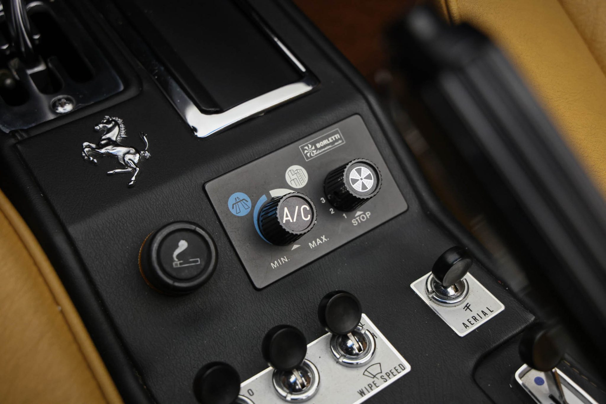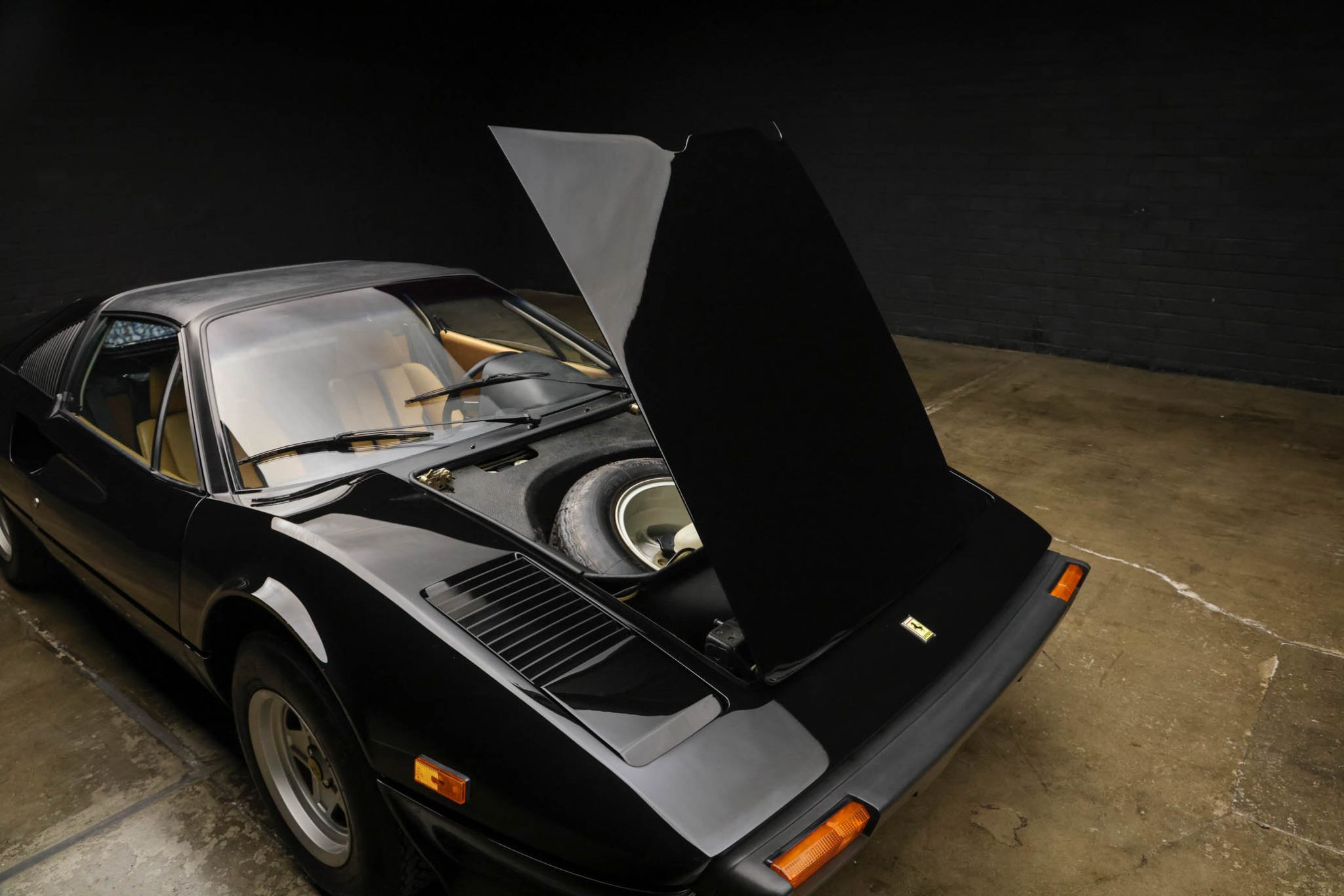 Chassis 30583 was subsequently issued a Ferrari Classiche Red Book in 2016 and now shows 2,100 miles. The car is finished in Nero with a black removable roof panel over tan leather upholstery and is powered by a 2.9-liter quad-cam V8 linked with a five-speed manual transaxle and a limited-slip differential. It rides on 14″ Campagnolo five-spoke alloy wheels coupled with ventilated disc brakes and Koni shocks at all four corners. Inside, a MOMO steering wheel is paired with a gated shifter and accompanied by an Alpine cassette stereo, Borletti air conditioning, and electric windows.