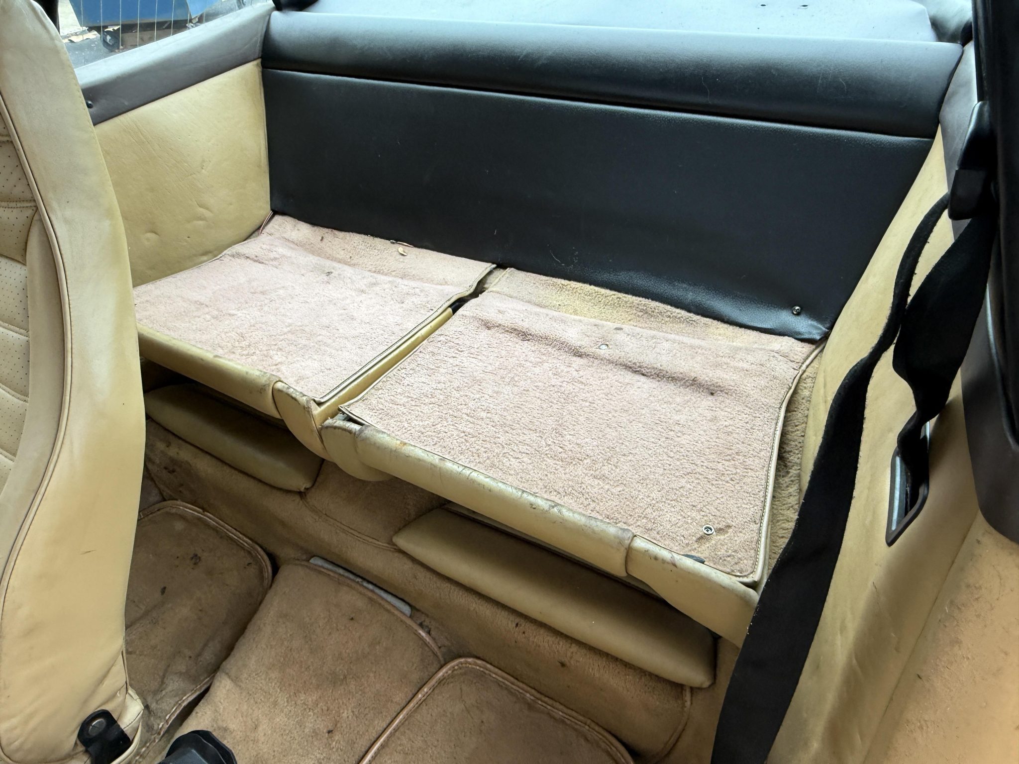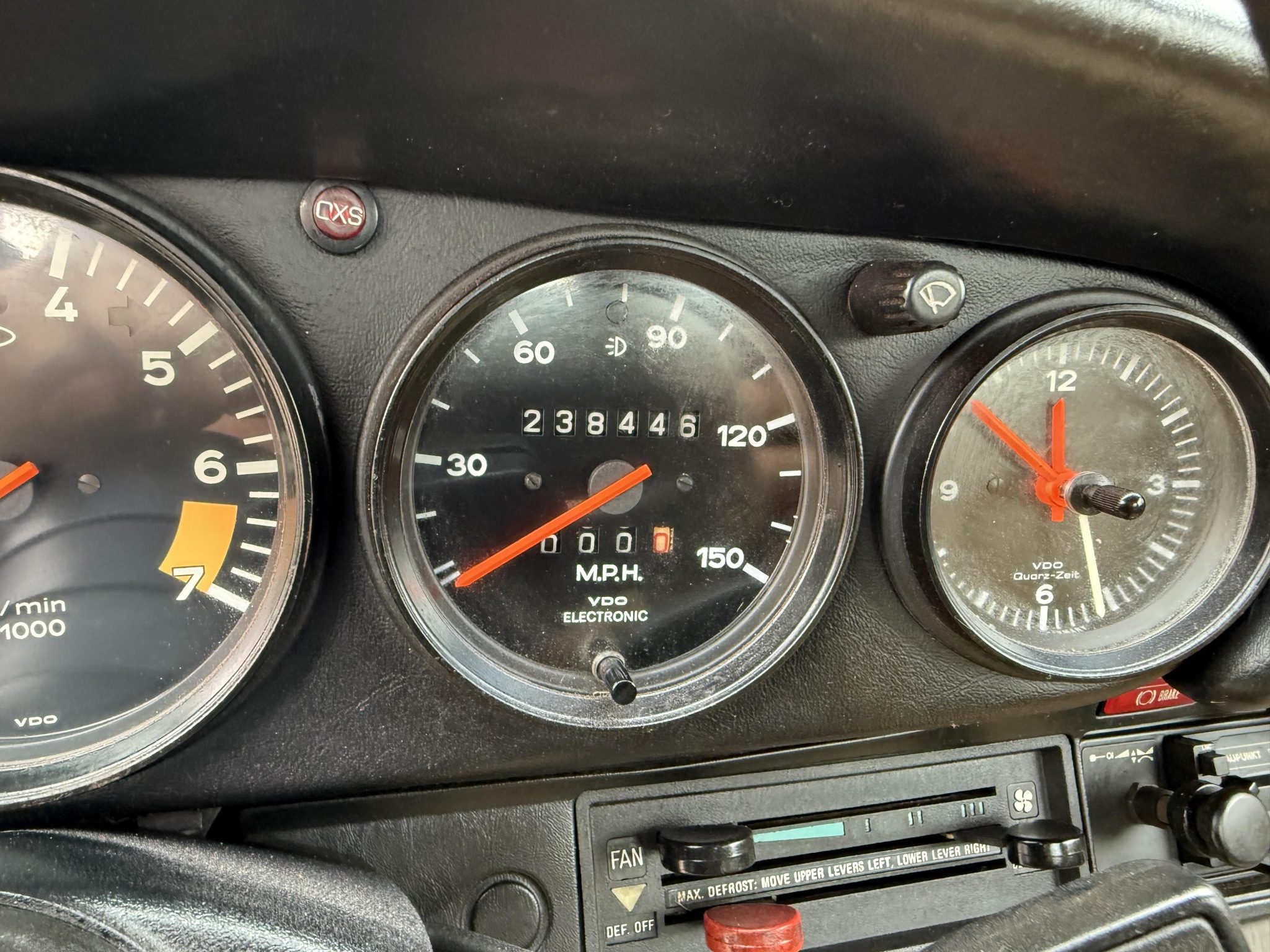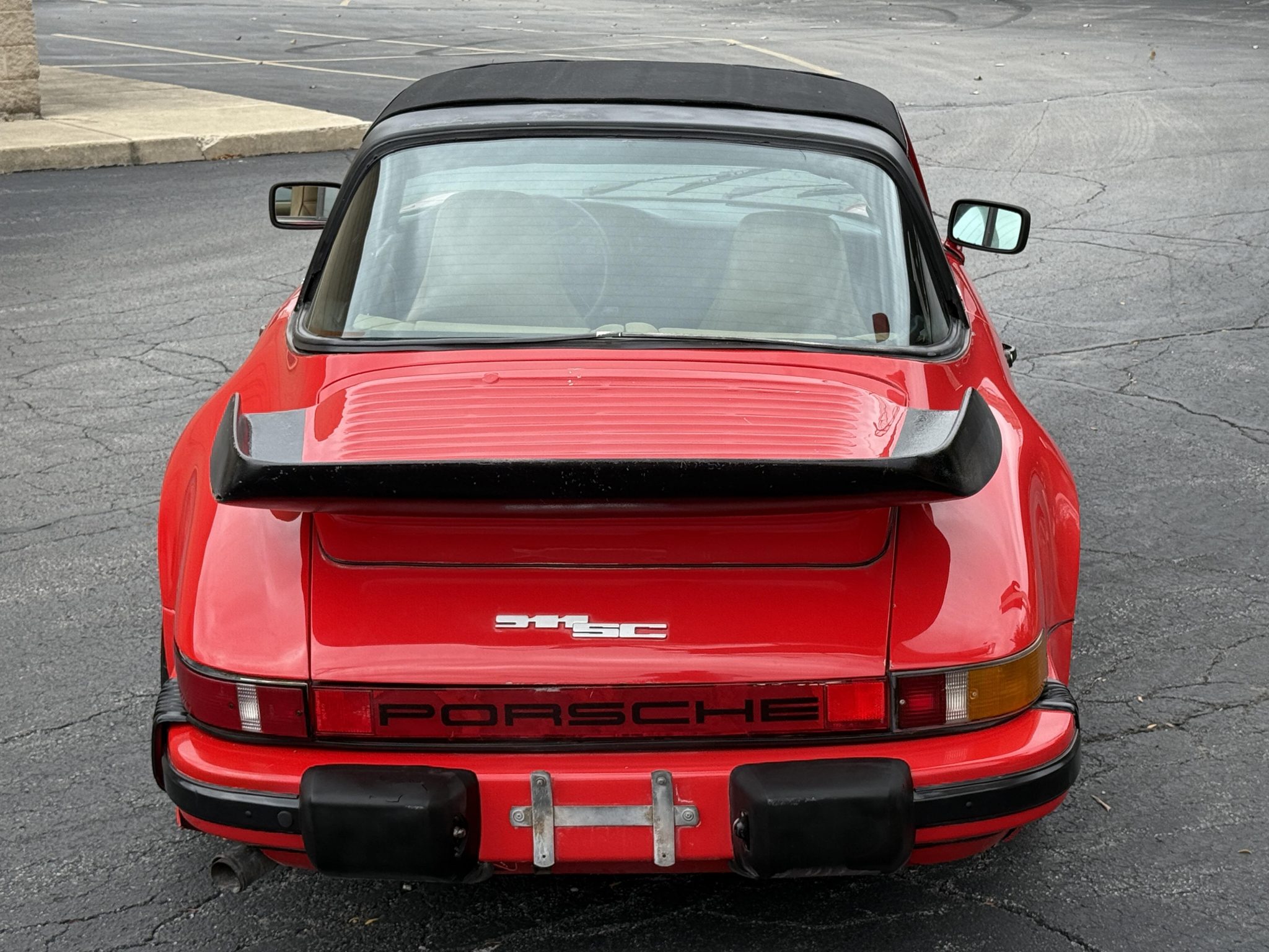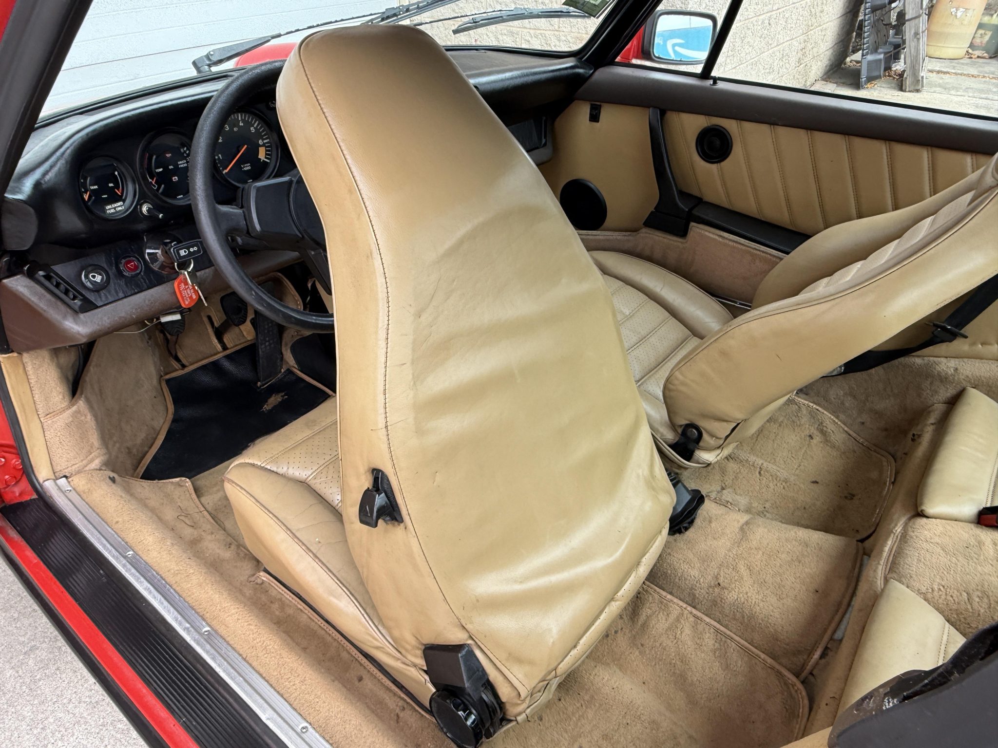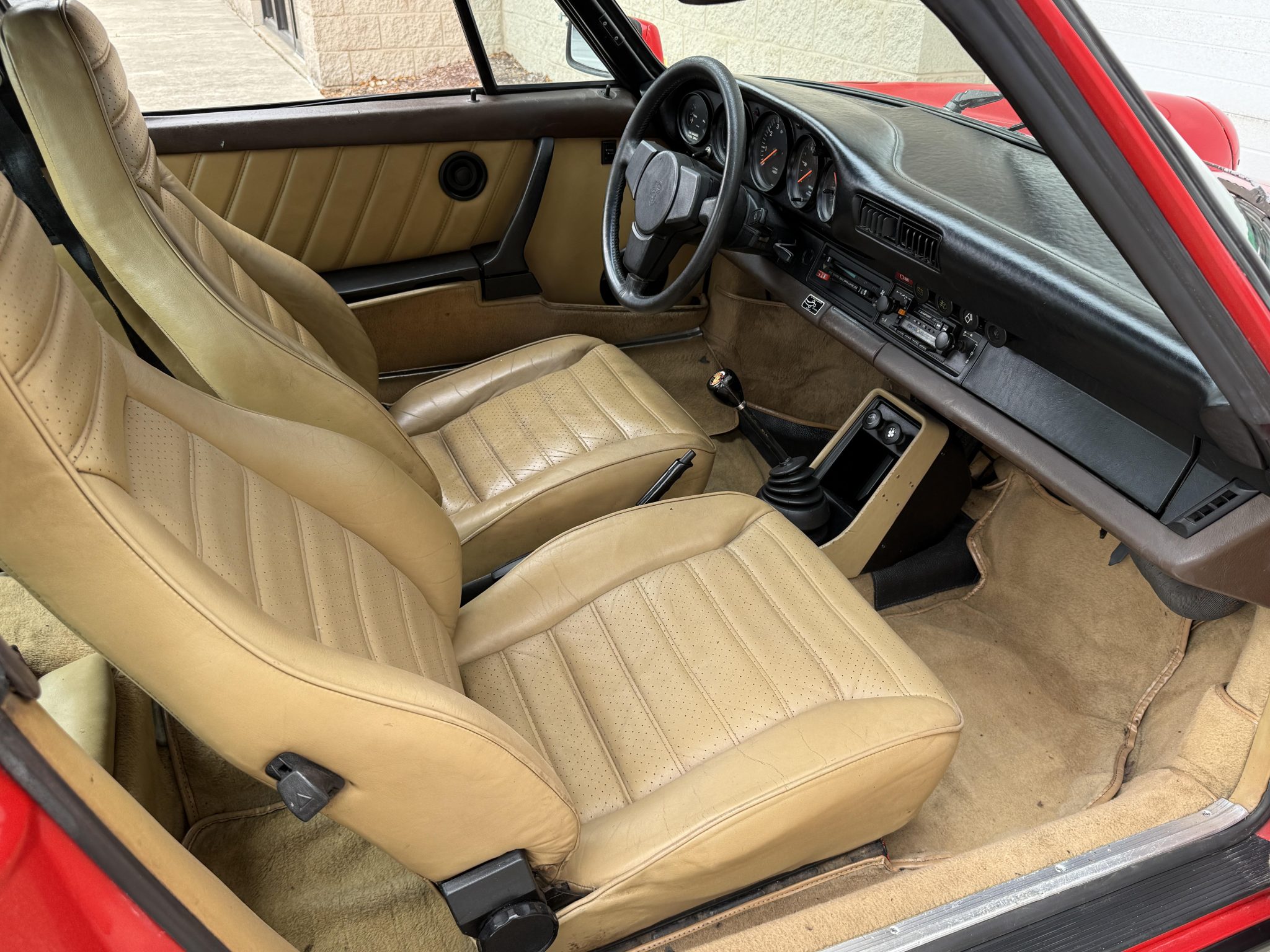 Powered by a 3.0-liter flat-six paired with a five-speed manual transaxle, the car is finished in Guards Red over beige leather upholstery. Equipment includes 16″ Fuchs alloy wheels, a rear spoiler, a removable roof panel, power windows, cruise control, and a Blaupunkt cassette stereo.