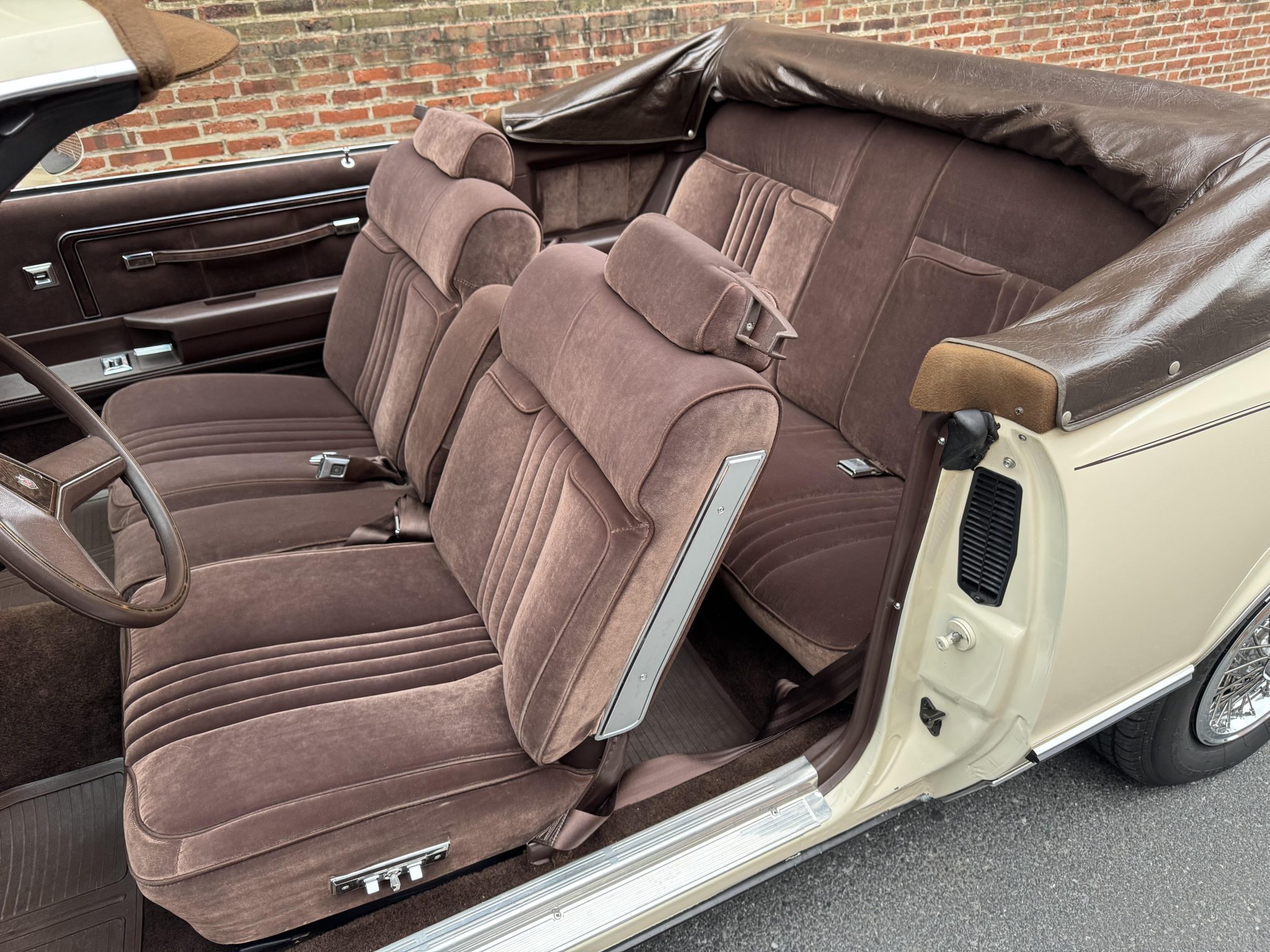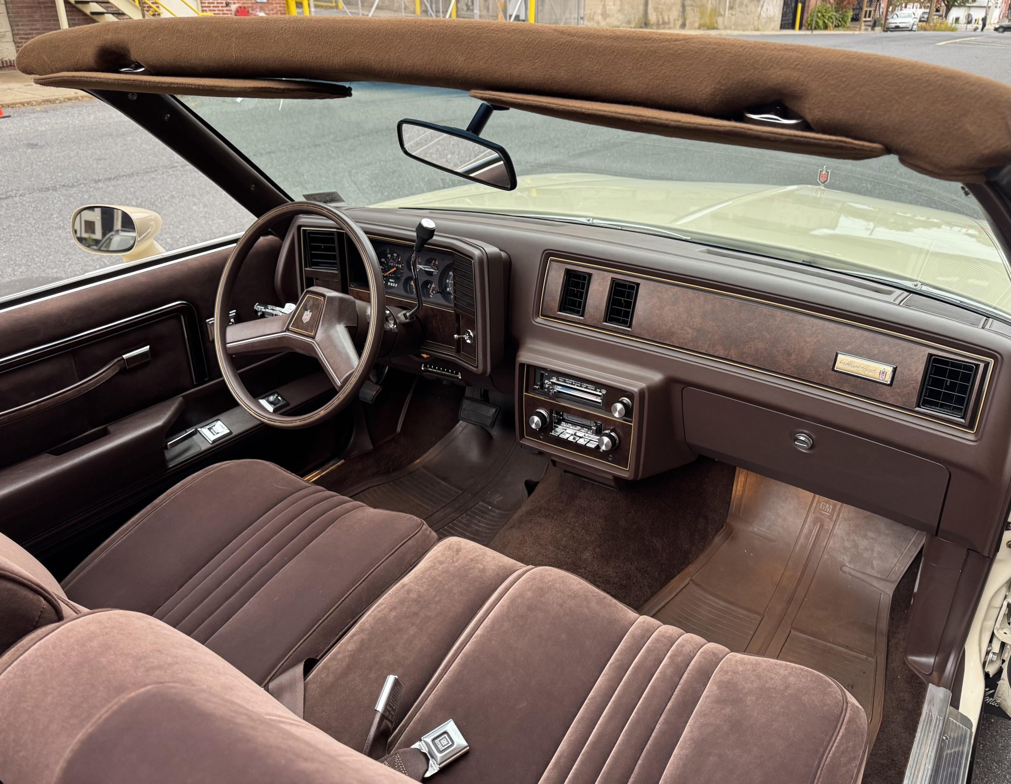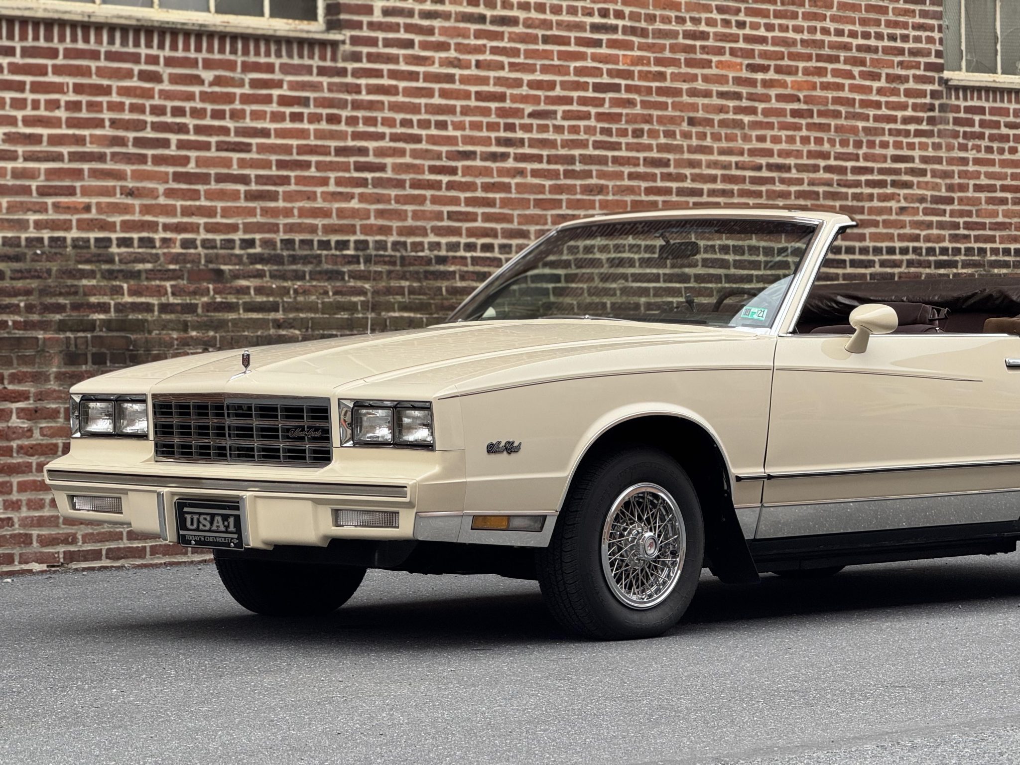 Finished in beige over Dark Brown cloth, the car has a brown soft top and was specified with an F41 sport suspension, power steering, and 14″ wheels with wire covers as well as a cassette stereo, power windows and locks, cruise control, and air conditioning. Power is provided by a 5.0-liter V8 linked to a three-speed automatic transmission. This Monte Carlo convertible