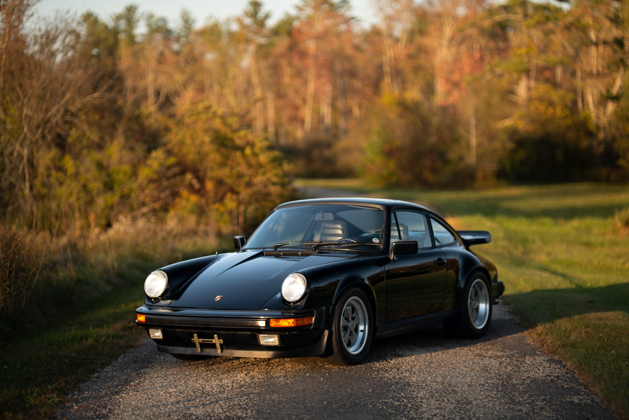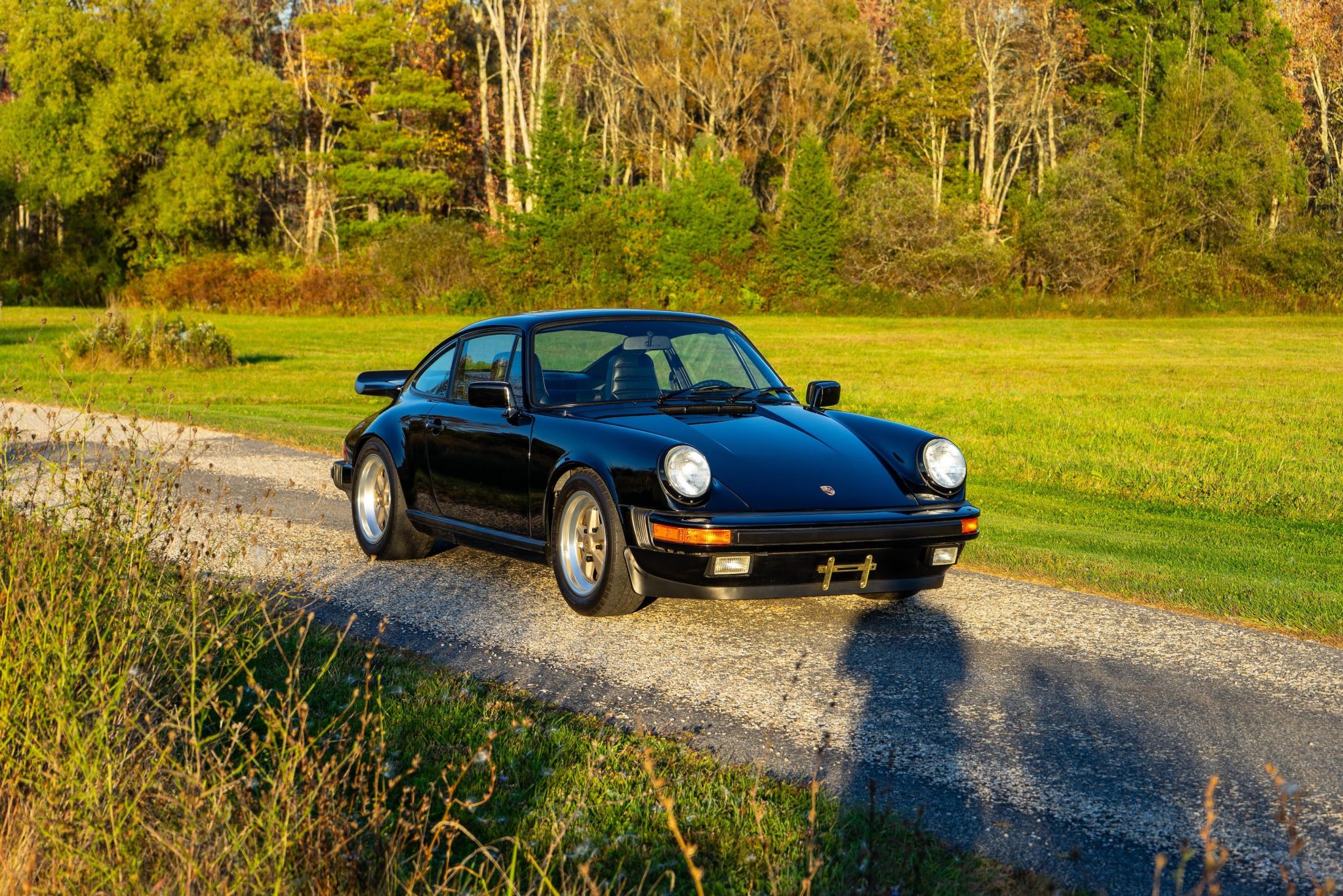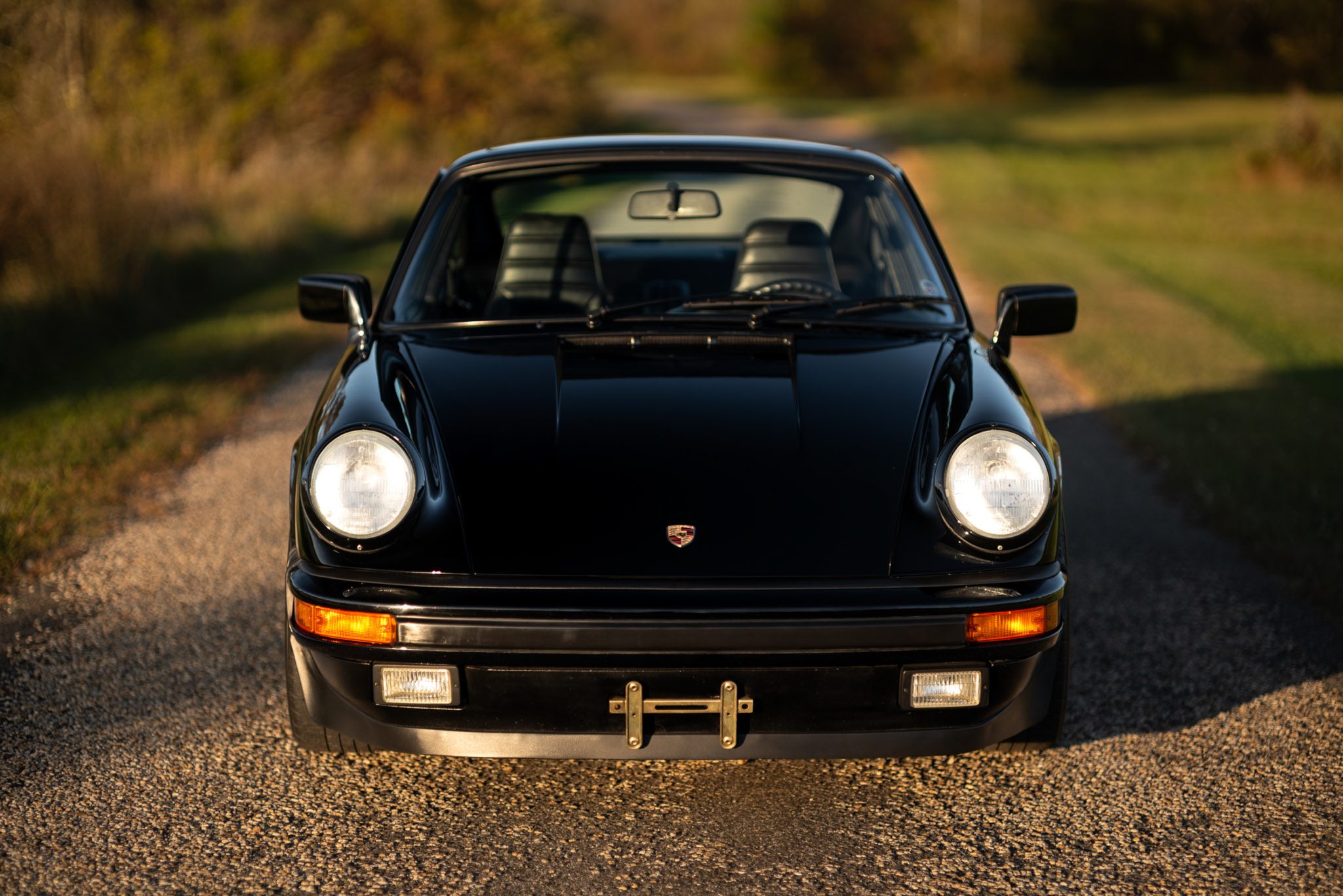 This black-on-black 1983 Porsche 911SC coupe shows 29k miles Powered by a 3.0-liter flat-six paired with a five-speed manual transaxle, it is equipped with 16″ Fuchs alloy wheels, SSI heat exchangers, an aftermarket muffler, sport shocks, a sunroof, fog lights, front and rear spoilers, air conditioning, power windows, and a Blaupunkt cassette stereo.