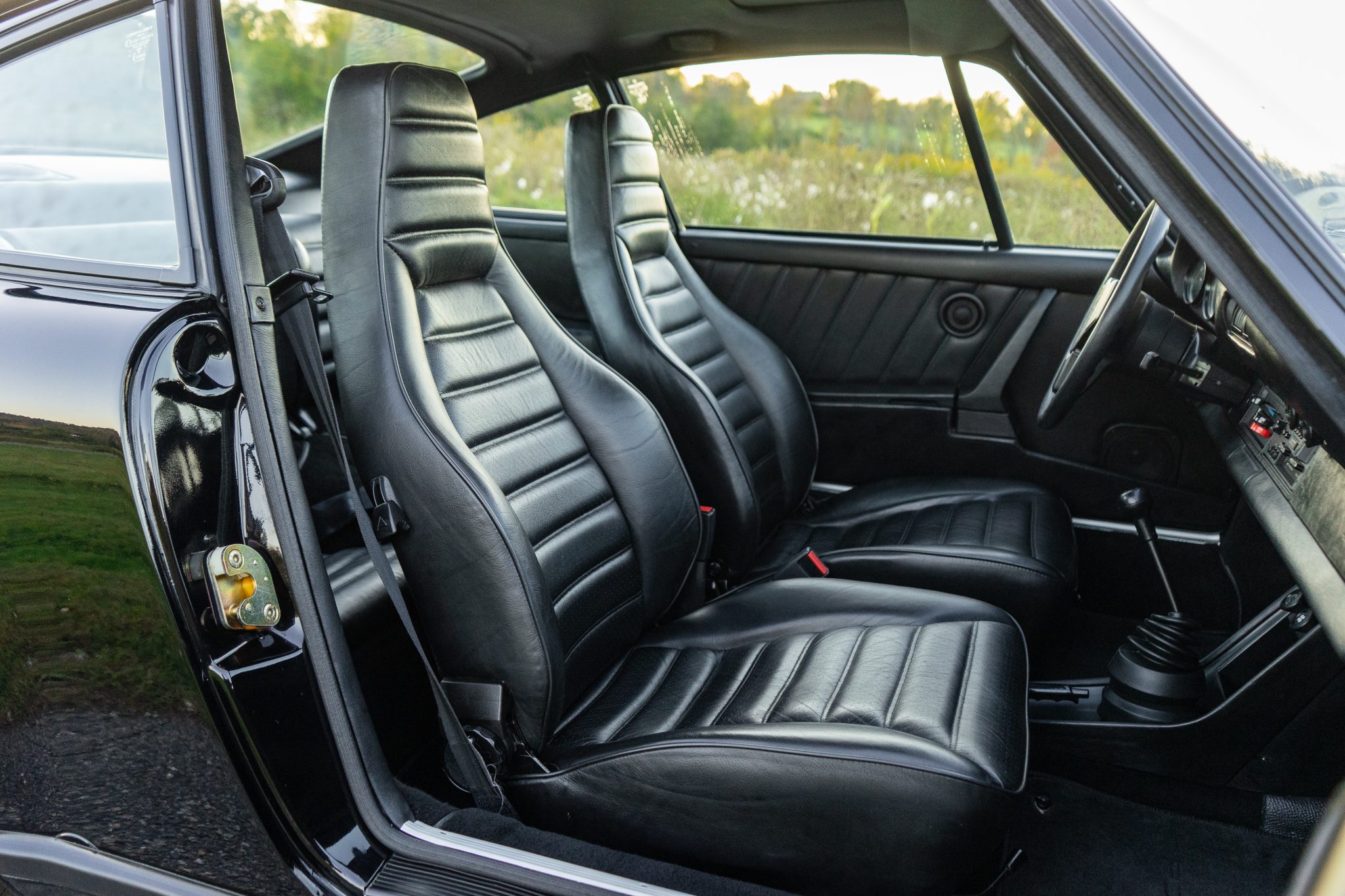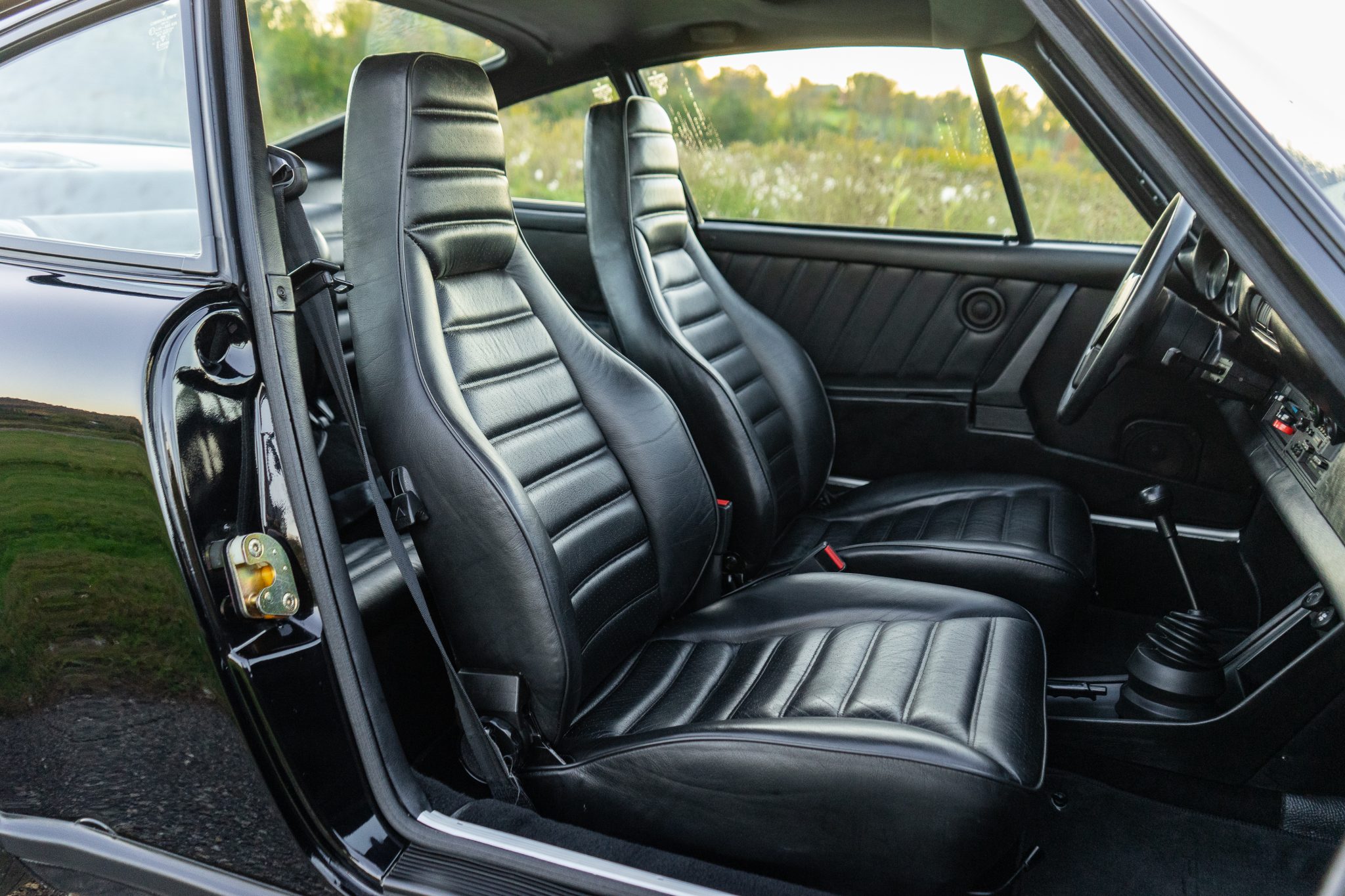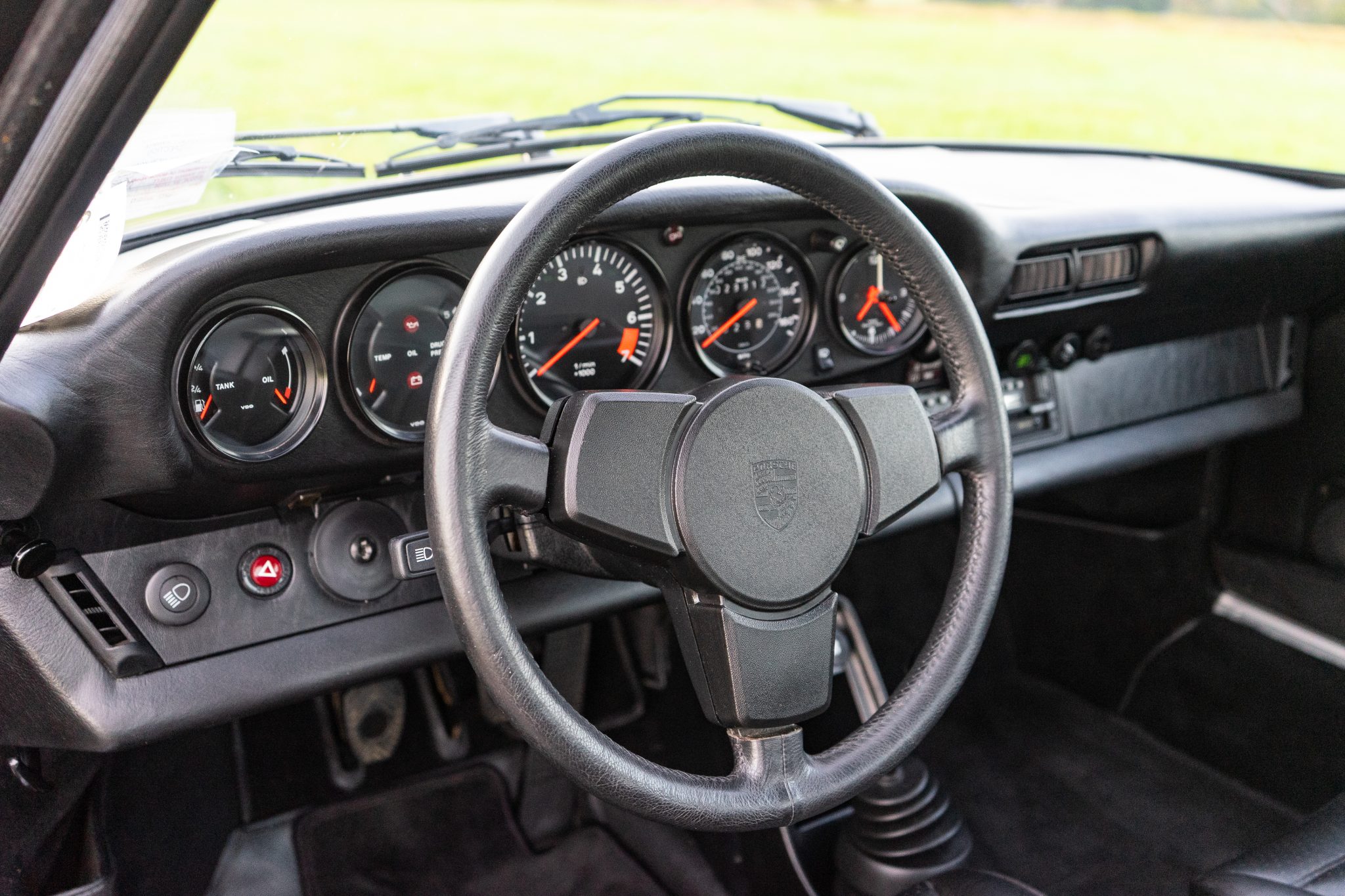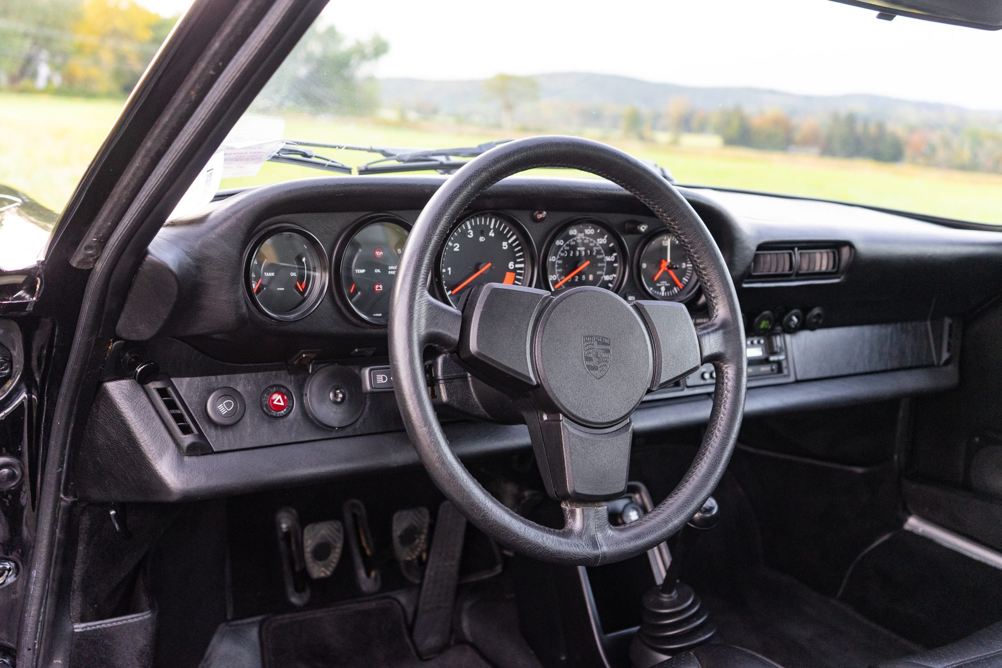 This black-on-black 1983 Porsche 911SC coupe shows 29k miles Powered by a 3.0-liter flat-six paired with a five-speed manual transaxle, it is equipped with 16″ Fuchs alloy wheels, SSI heat exchangers, an aftermarket muffler, sport shocks, a sunroof, fog lights, front and rear spoilers, air conditioning, power windows, and a Blaupunkt cassette stereo.