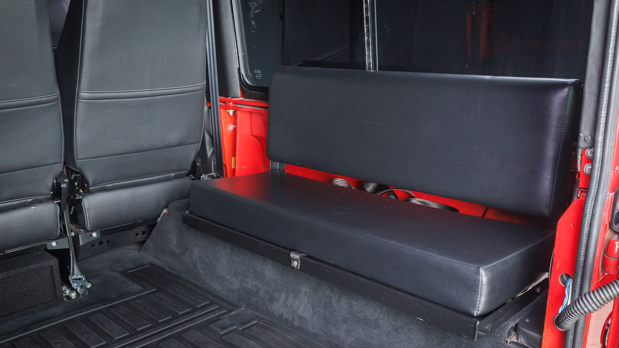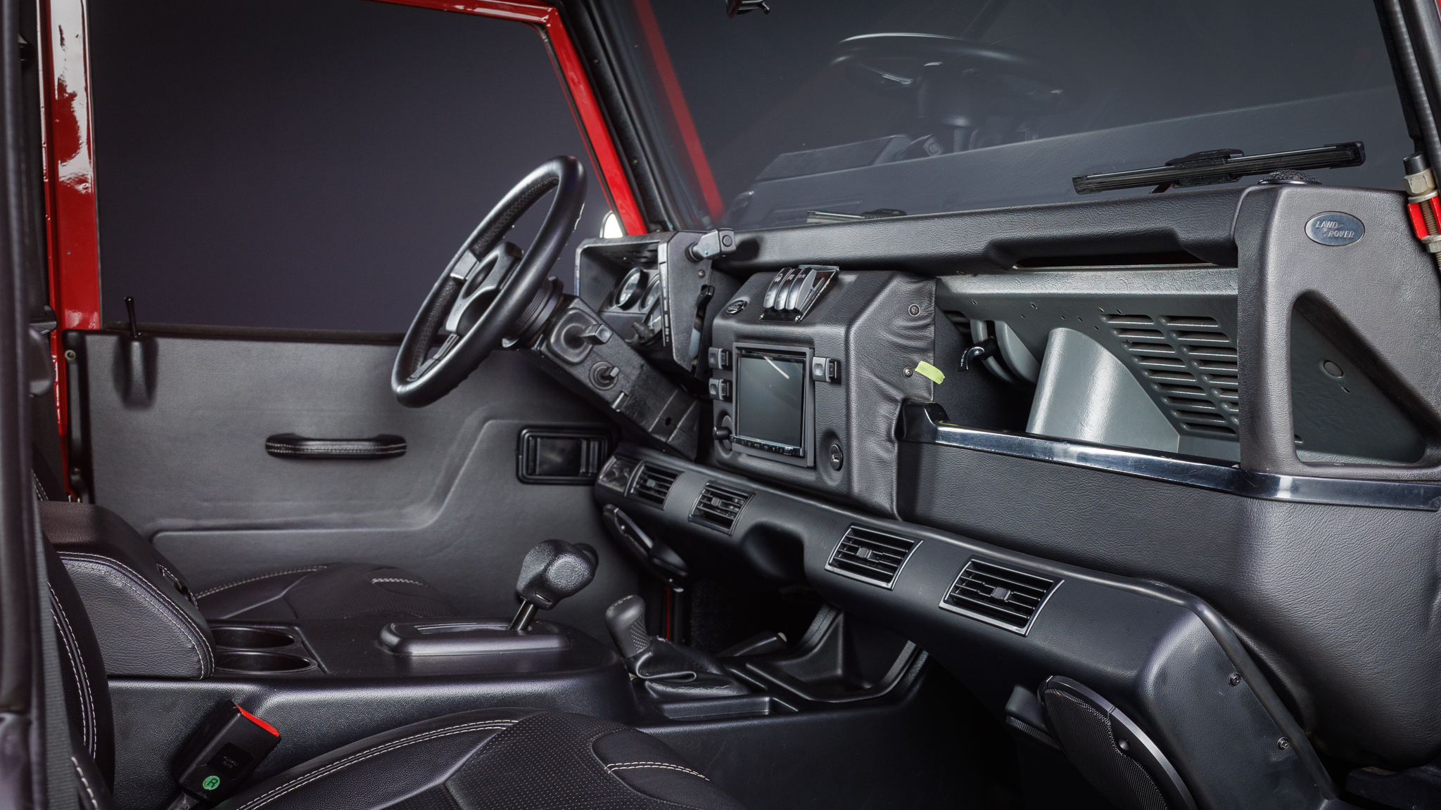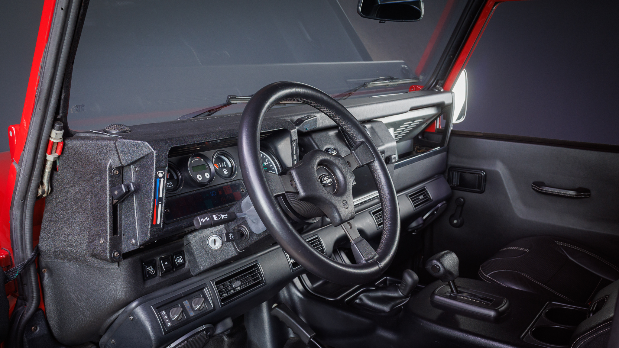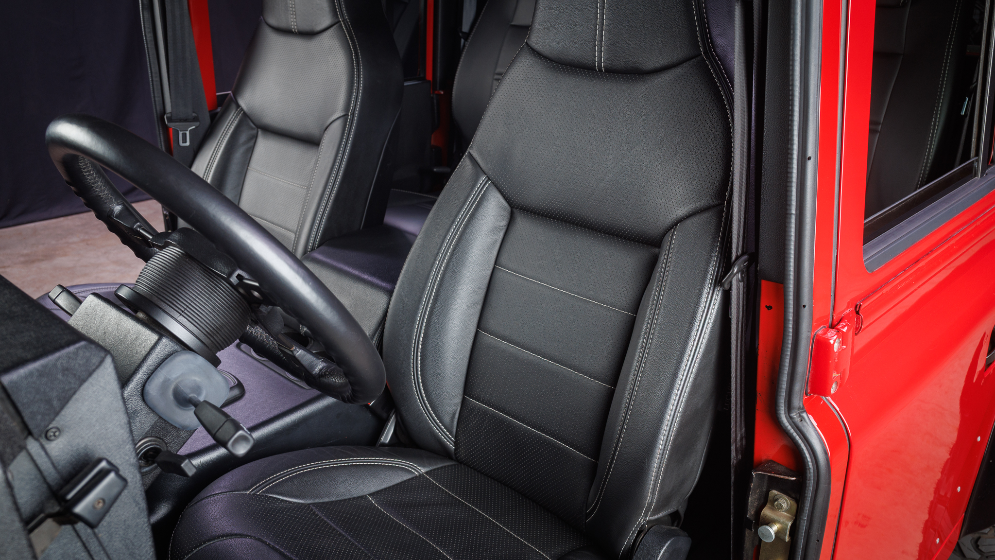 It was subsequently re-powered with a Cummins R2.8 turbodiesel inline-four and a ZF four-speed automatic transmission by British 4×4 of Reno in Nevada as part of a $44k build. The truck has been refinished in red with a black roof, and additional modifications include 16″ Sawtooth alloy wheels, an Old Man Emu suspension lift kit, a Frontrunner roof rack, a rear ladder, LED lights, a Warn front winch, aftermarket bumpers, air conditioning, cruise control, a Kenwood touchscreen stereo, black leather upholstery, and heated Lucari front bucket seats. Further equipment consists of a dual-range transfer case, a receiver hitch, and a center console with storage.