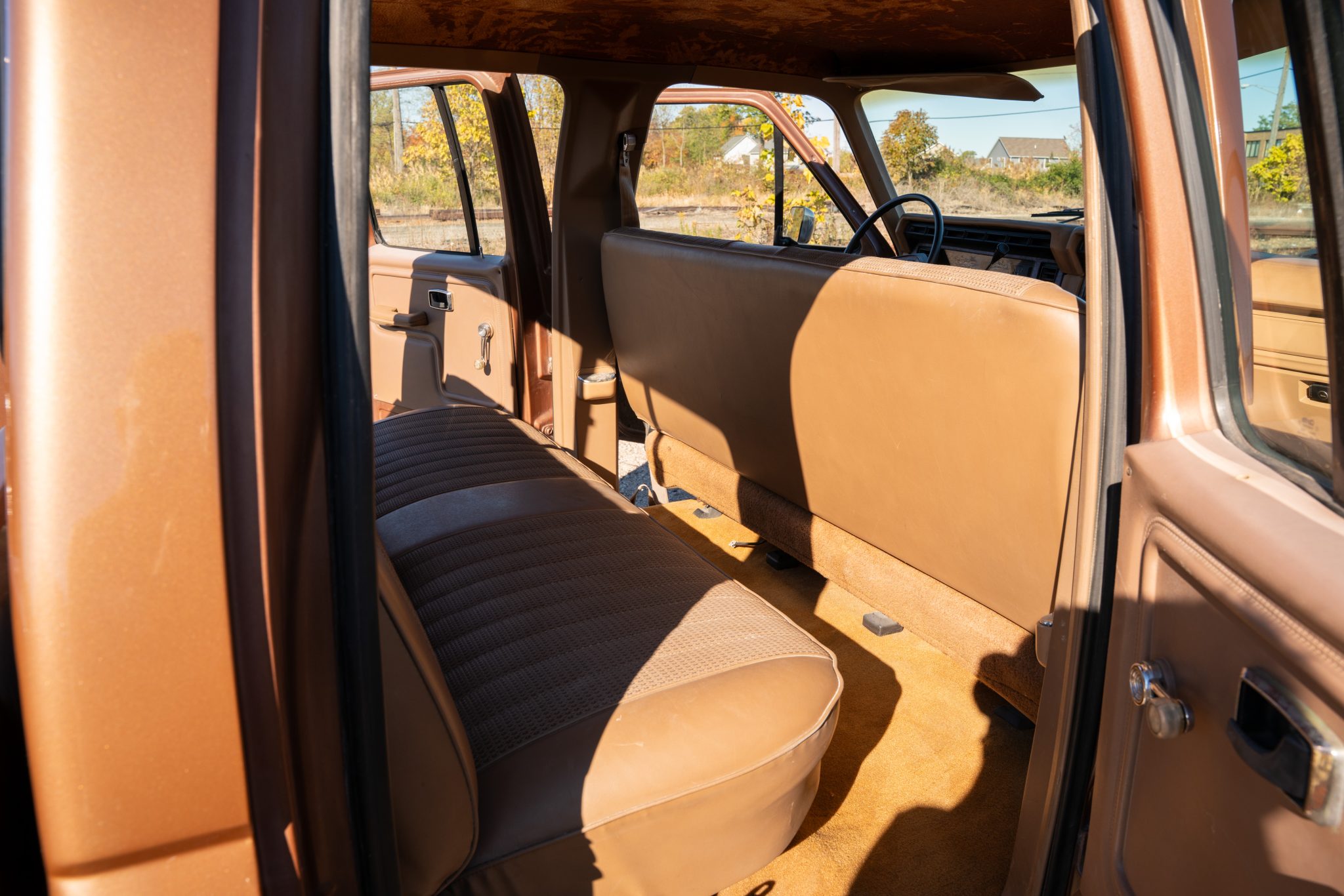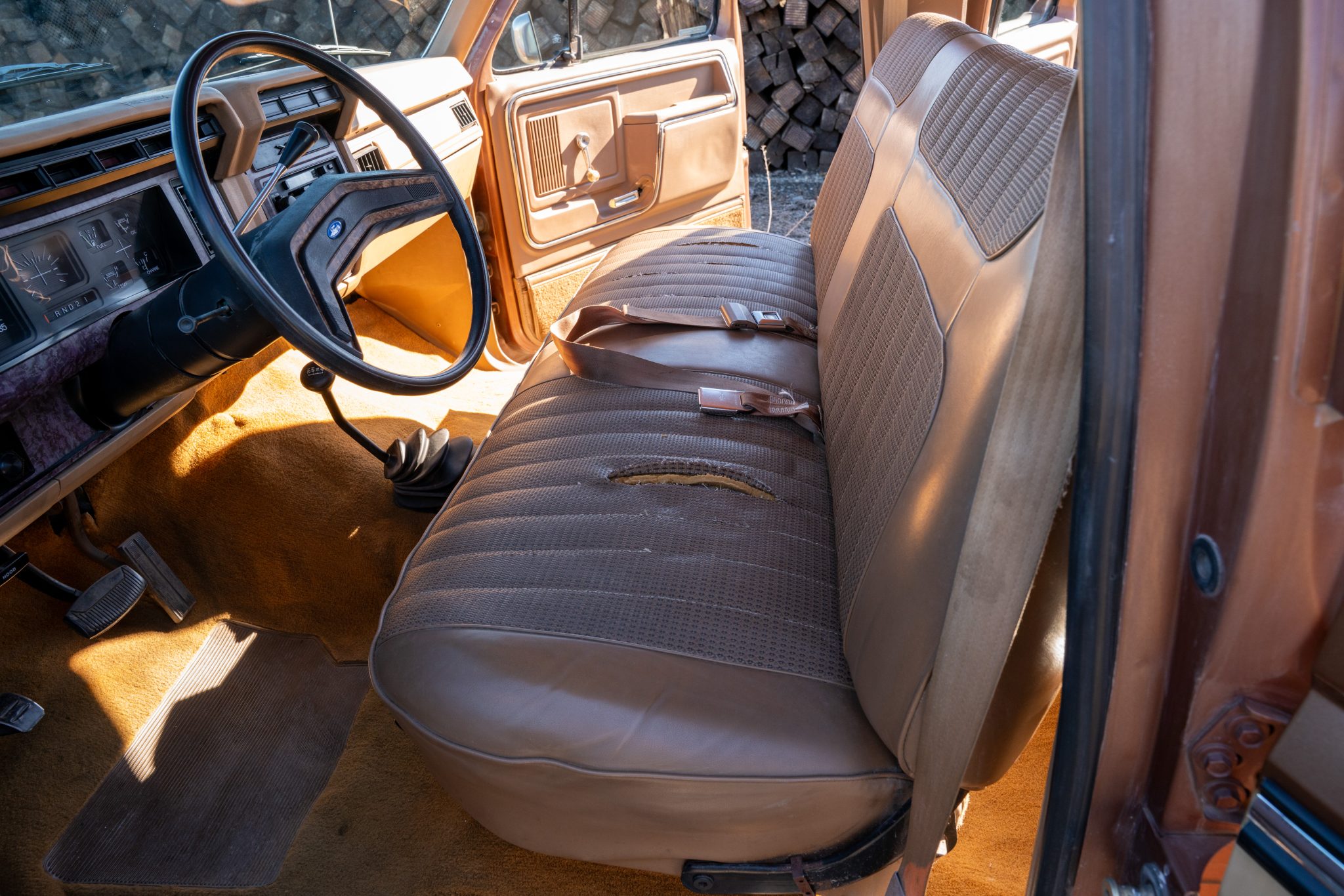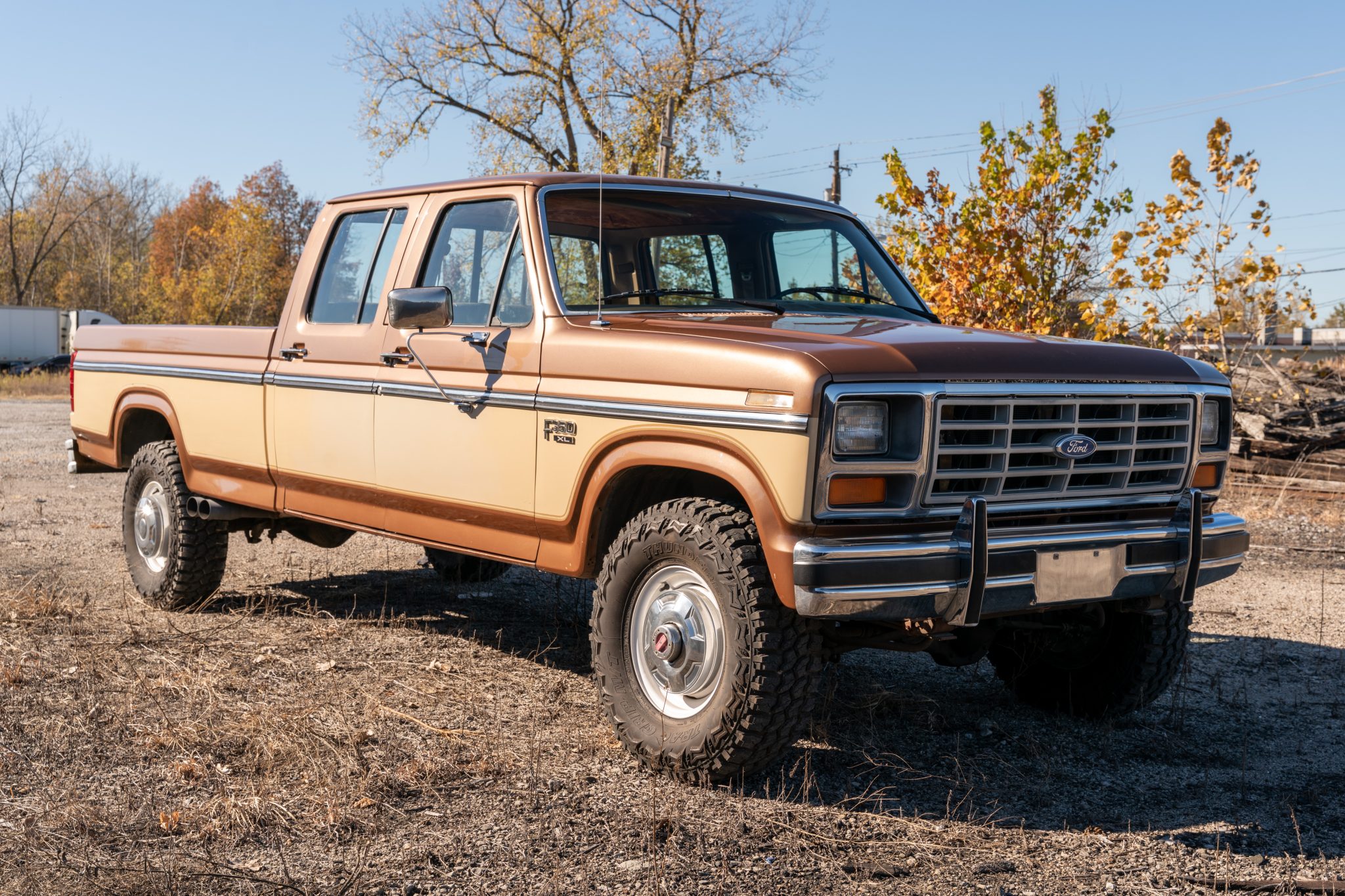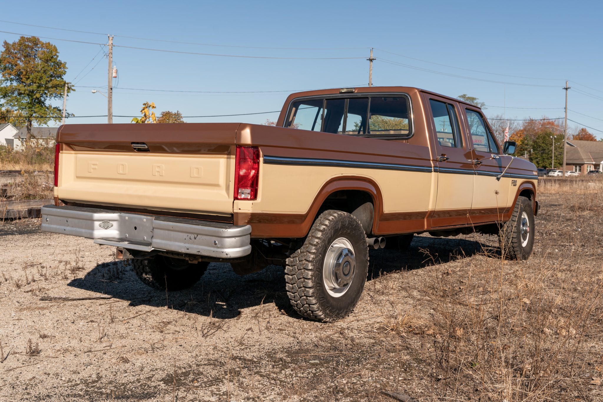This 1985 Ford F-350 XL 4×4 crew cab pickup is powered by a 7.5-liter V8 linked with a three-speed automatic transmission and a dual-range transfer case and finished in two-tone Desert Tan Metallic and Light Desert Tan Metallic over tan cloth and vinyl. Features include 16.5″ eight-lug steel wheels, front disc brakes, dual fuel tanks, a sliding rear window, a chrome front bumper, a rear step bumper, and an AM/FM/cassette stereo.