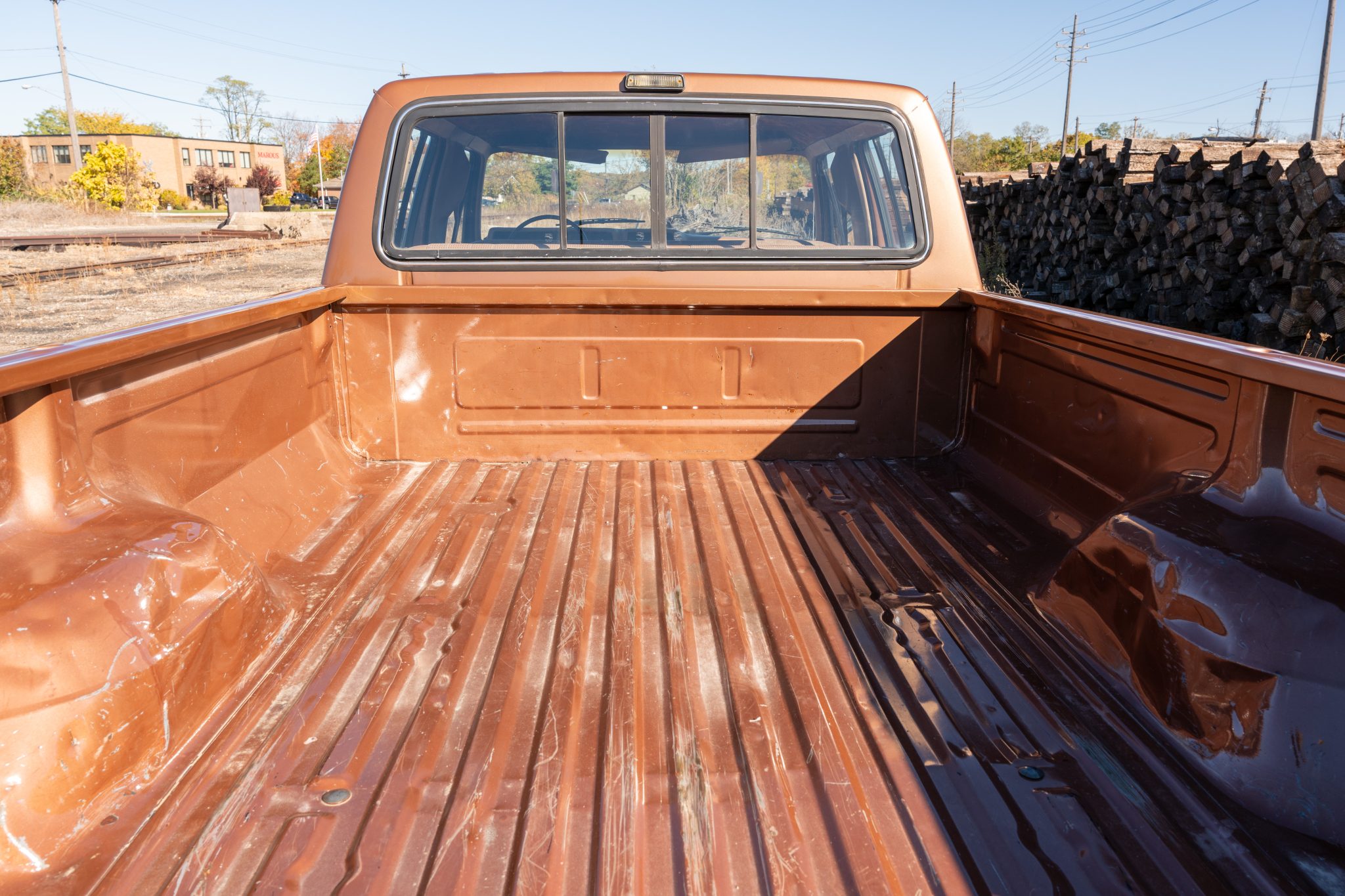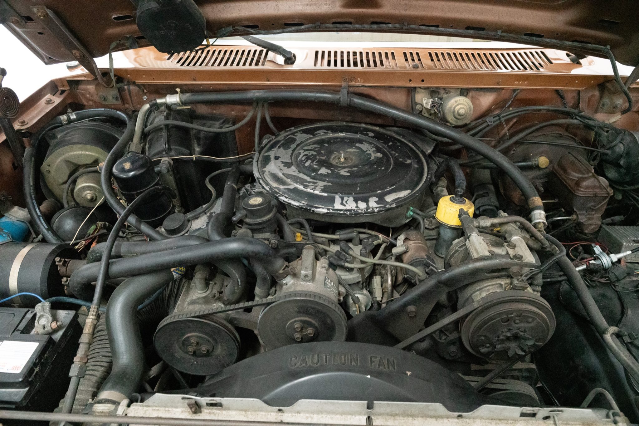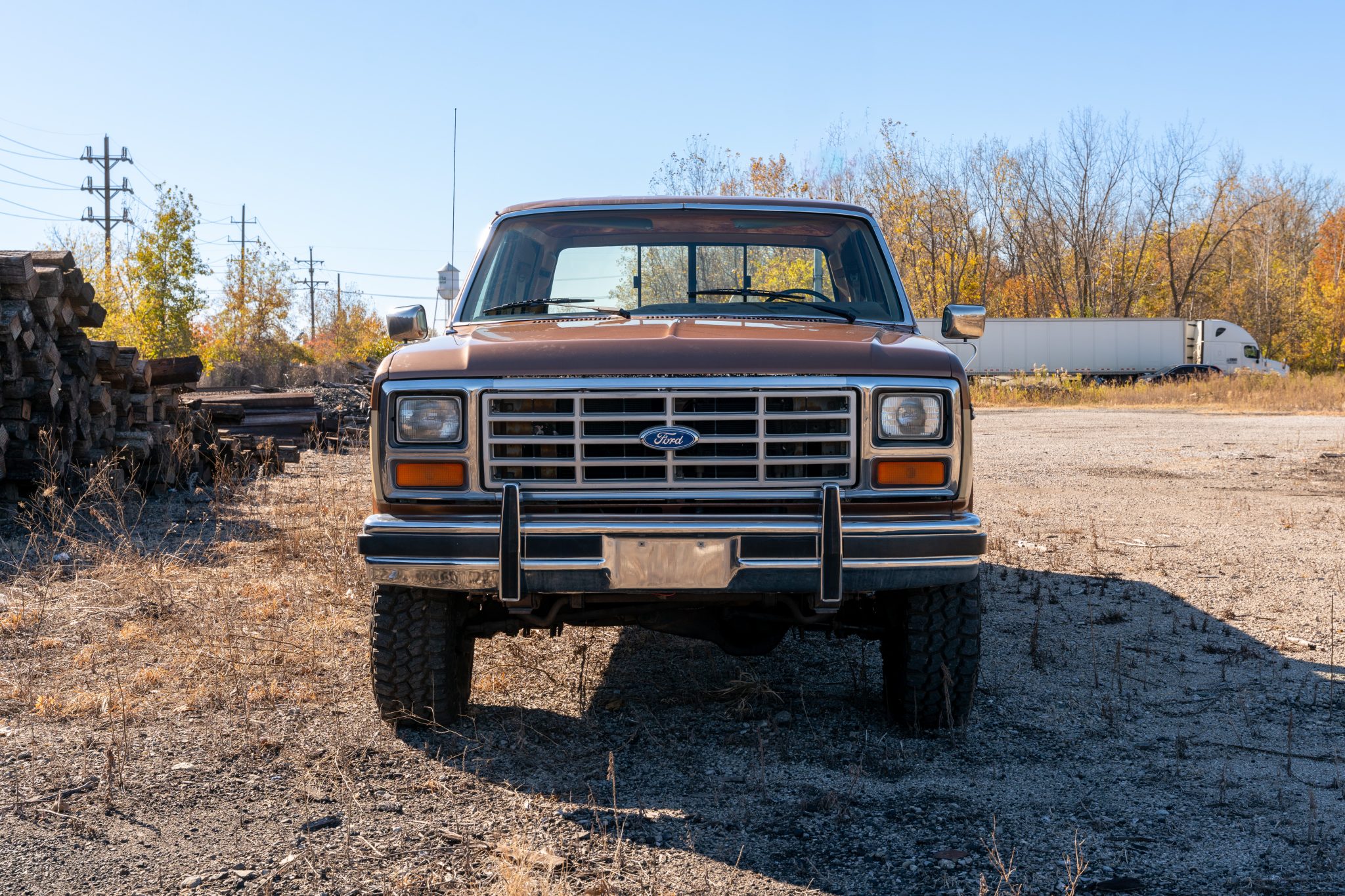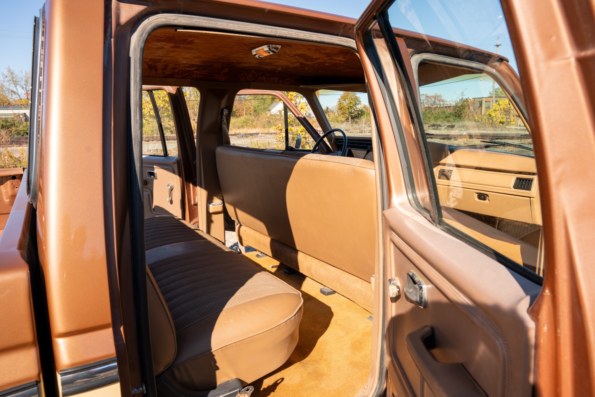 This 1985 Ford F-350 XL 4×4 crew cab pickup is powered by a 7.5-liter V8 linked with a three-speed automatic transmission and a dual-range transfer case and finished in two-tone Desert Tan Metallic and Light Desert Tan Metallic over tan cloth and vinyl. Features include 16.5″ eight-lug steel wheels, front disc brakes, dual fuel tanks, a sliding rear window, a chrome front bumper, a rear step bumper, and an AM/FM/cassette stereo.