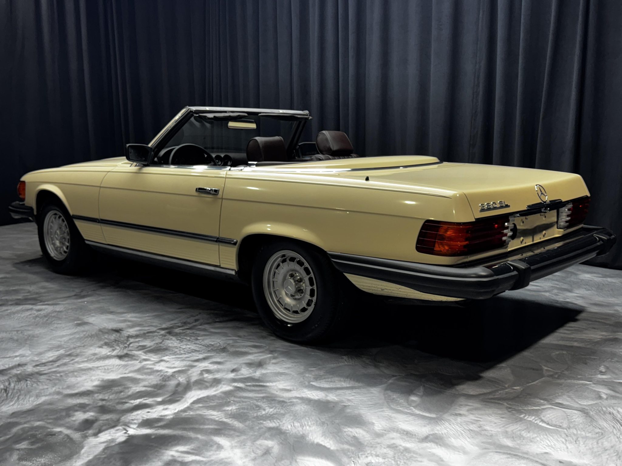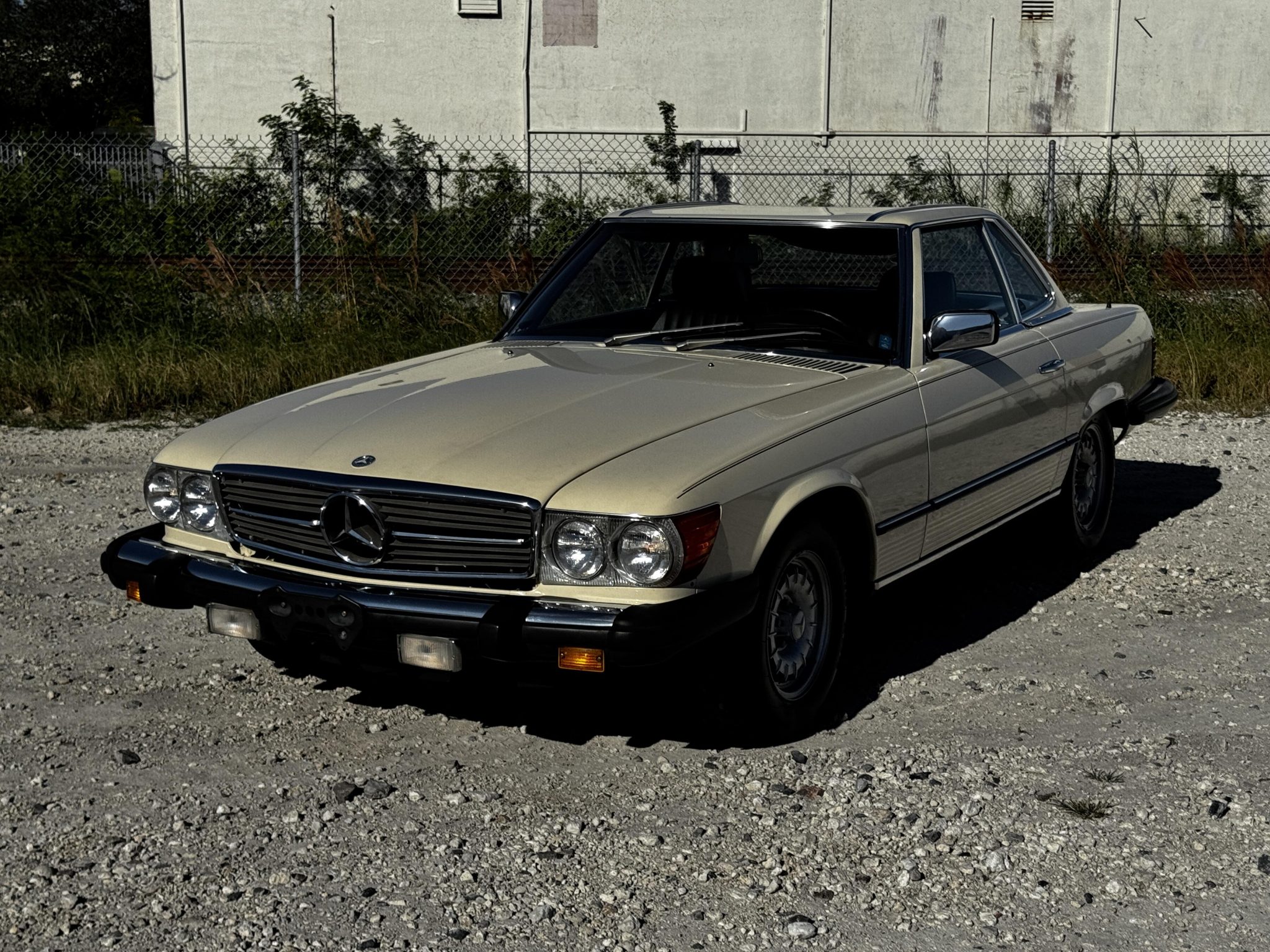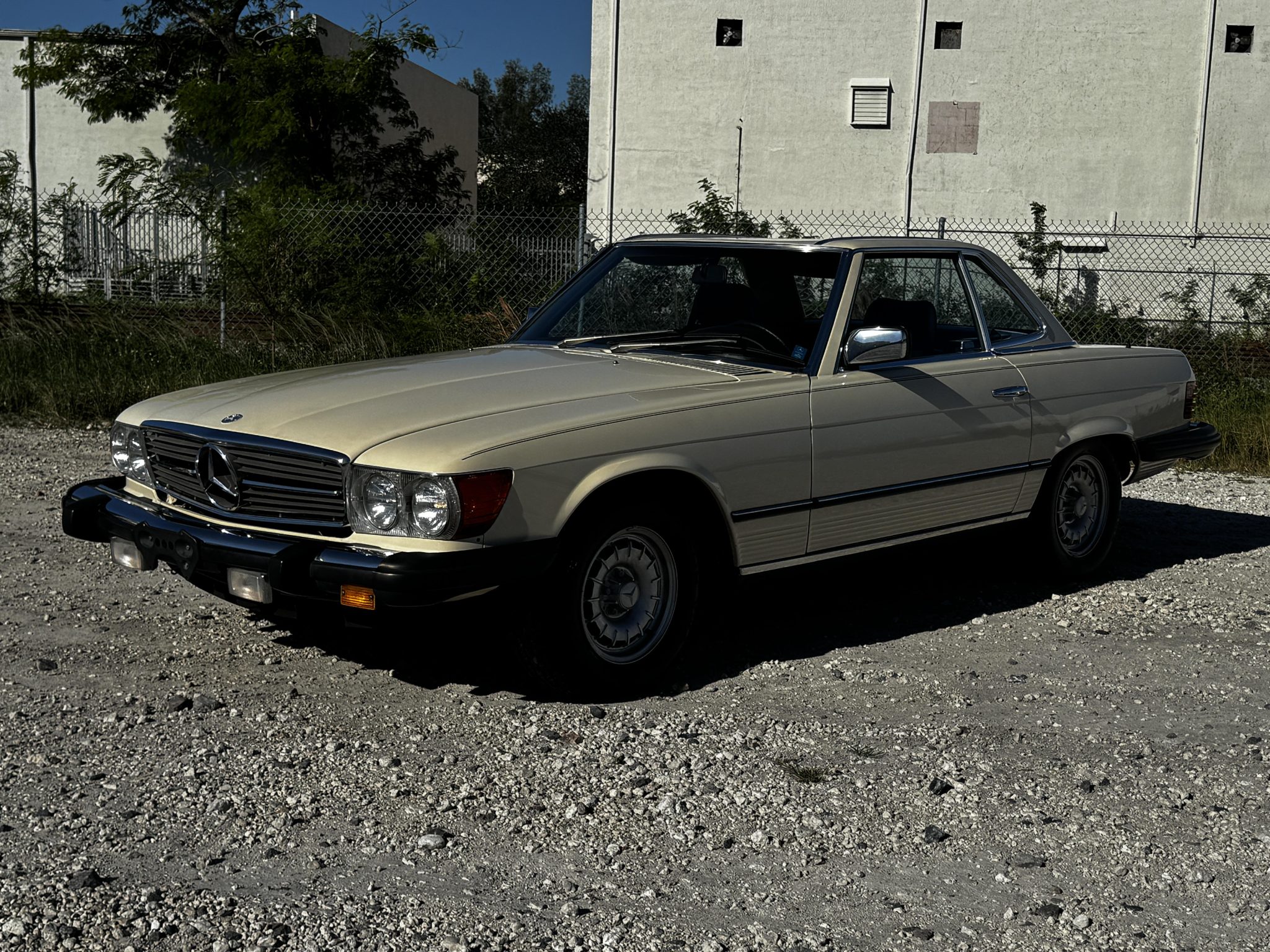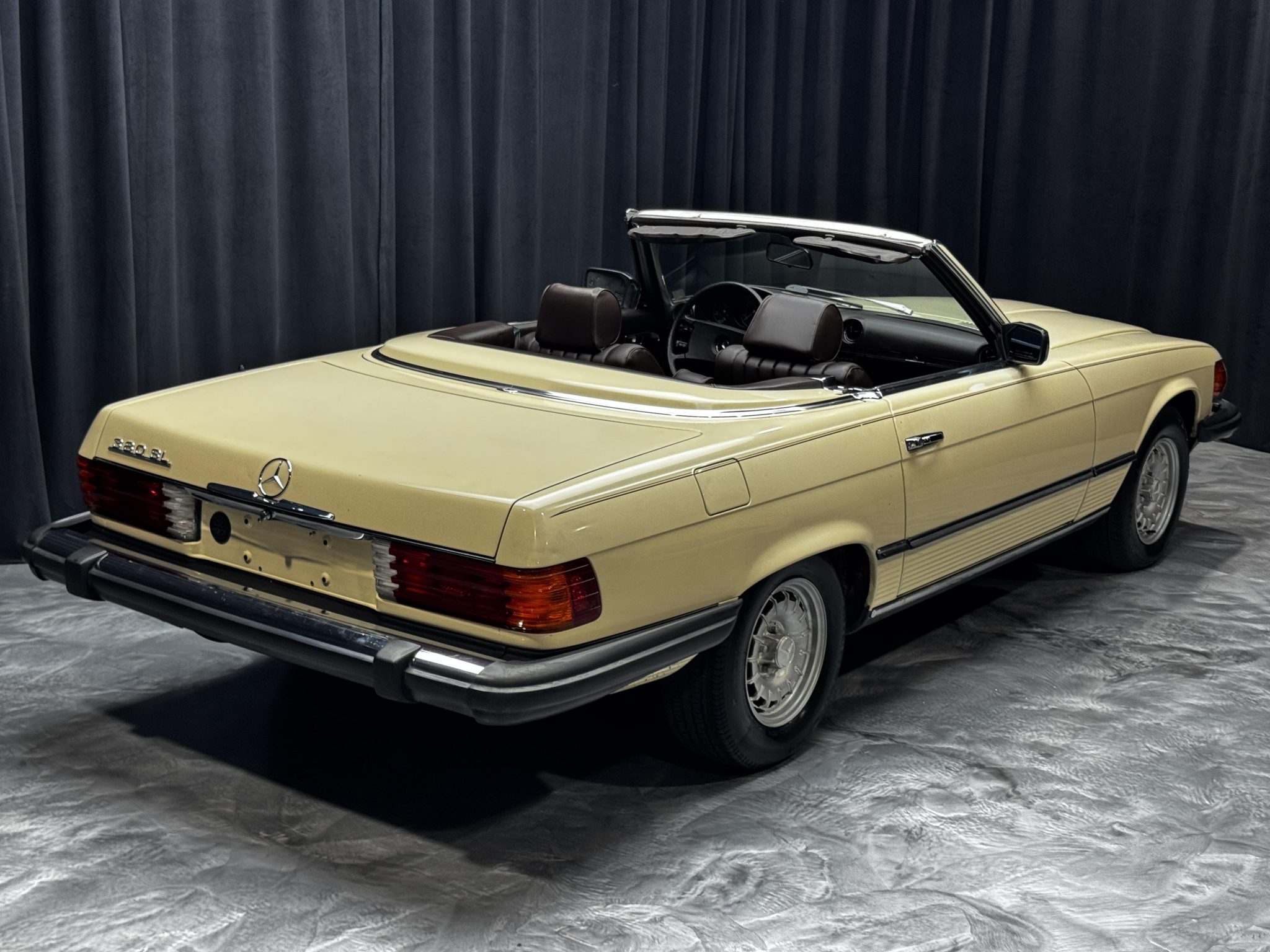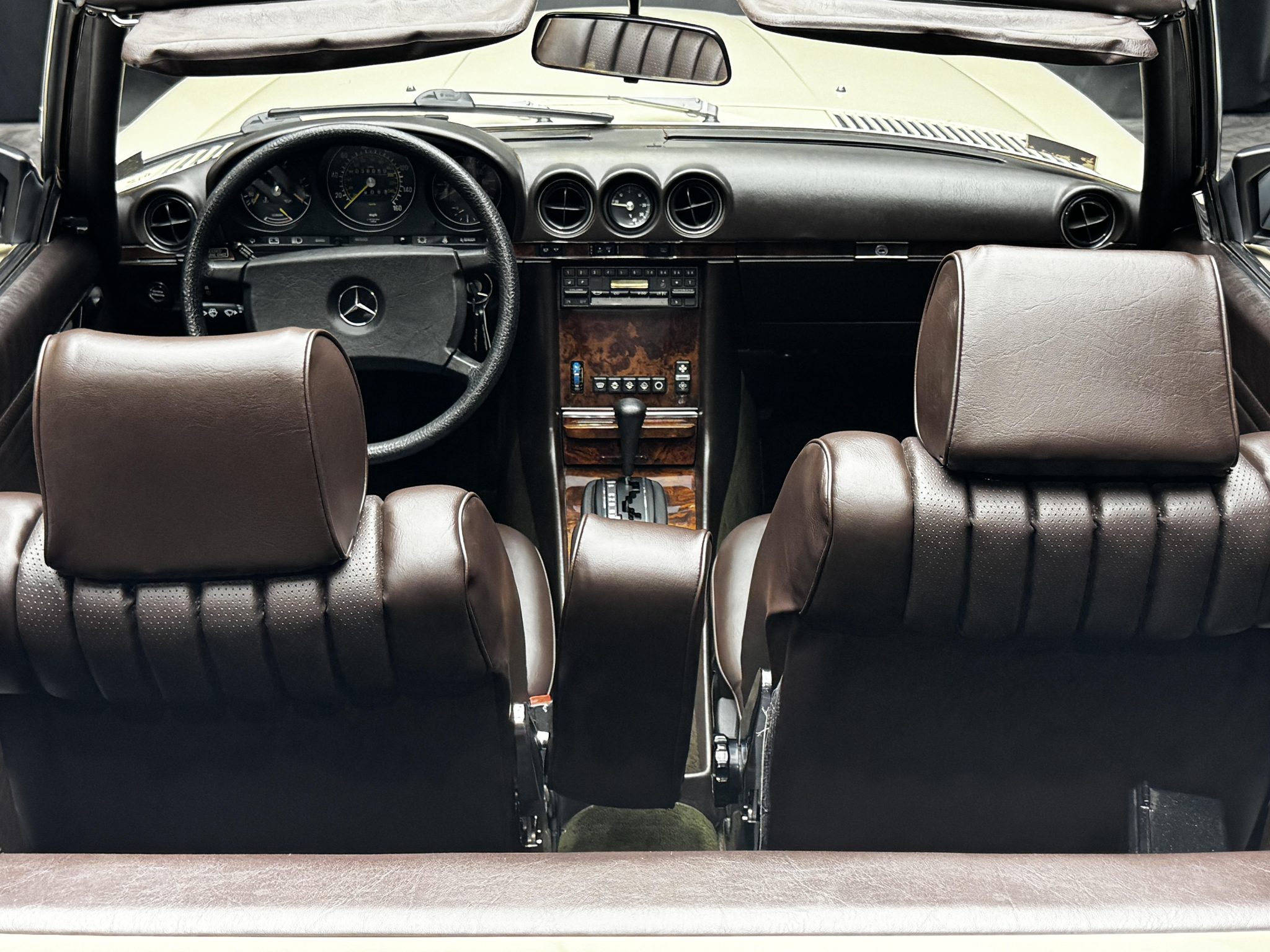 This 1985 Mercedes-Benz 380SL has remained registered in Iowa since new and shows 38k miles. Finished in Light Ivory over Dark Brown leather upholstery, the car is powered by a 3.8-liter V8 paired with a four-speed automatic transmission. Equipment includes a dark brown soft top, a removable hardtop, 14″ Bundt alloy wheels, fog lights, power windows, cruise control, a cassette stereo, and automatic climate control.