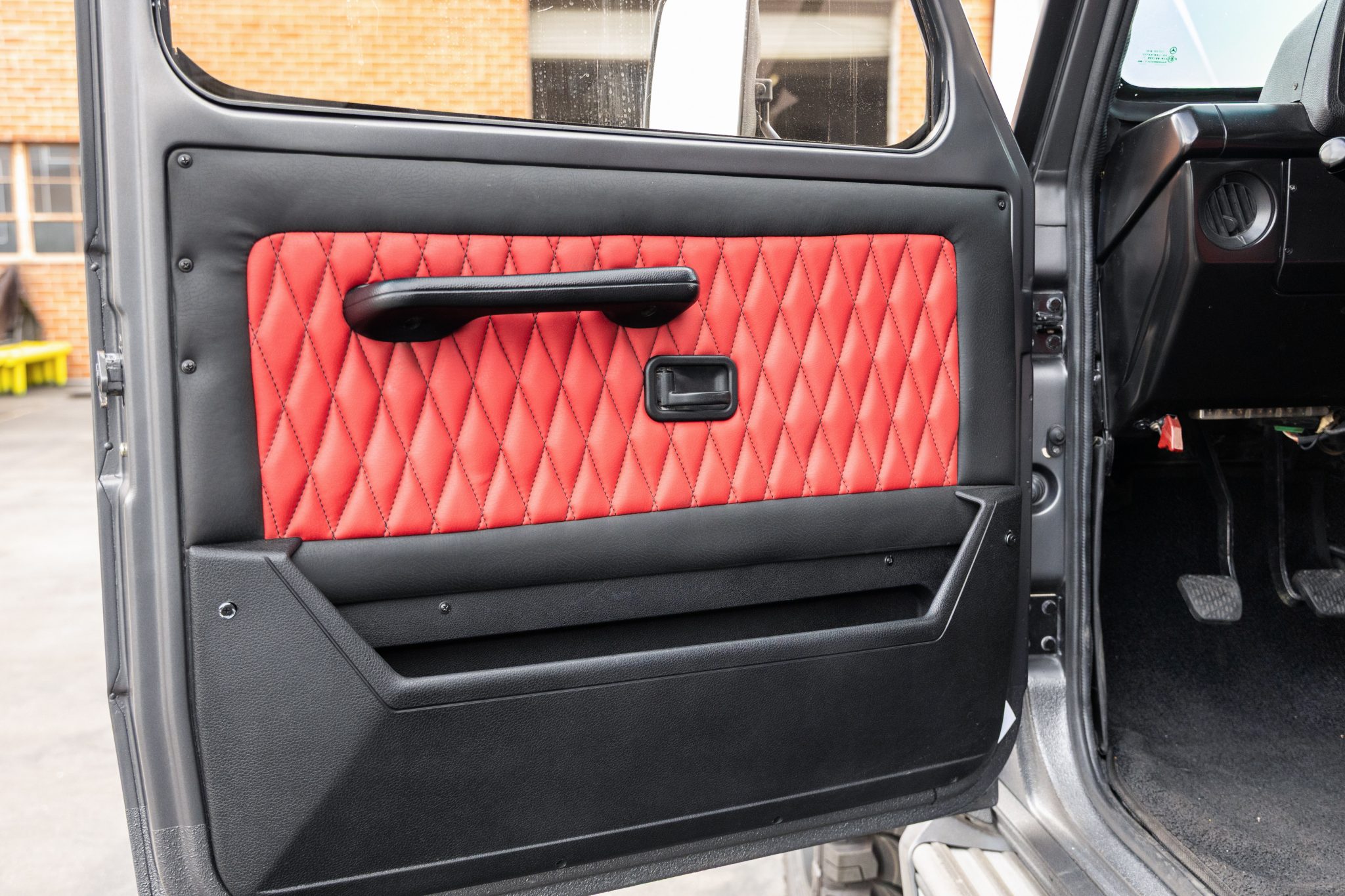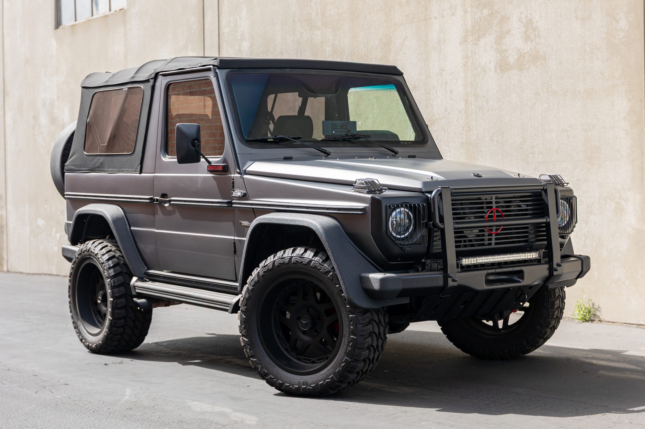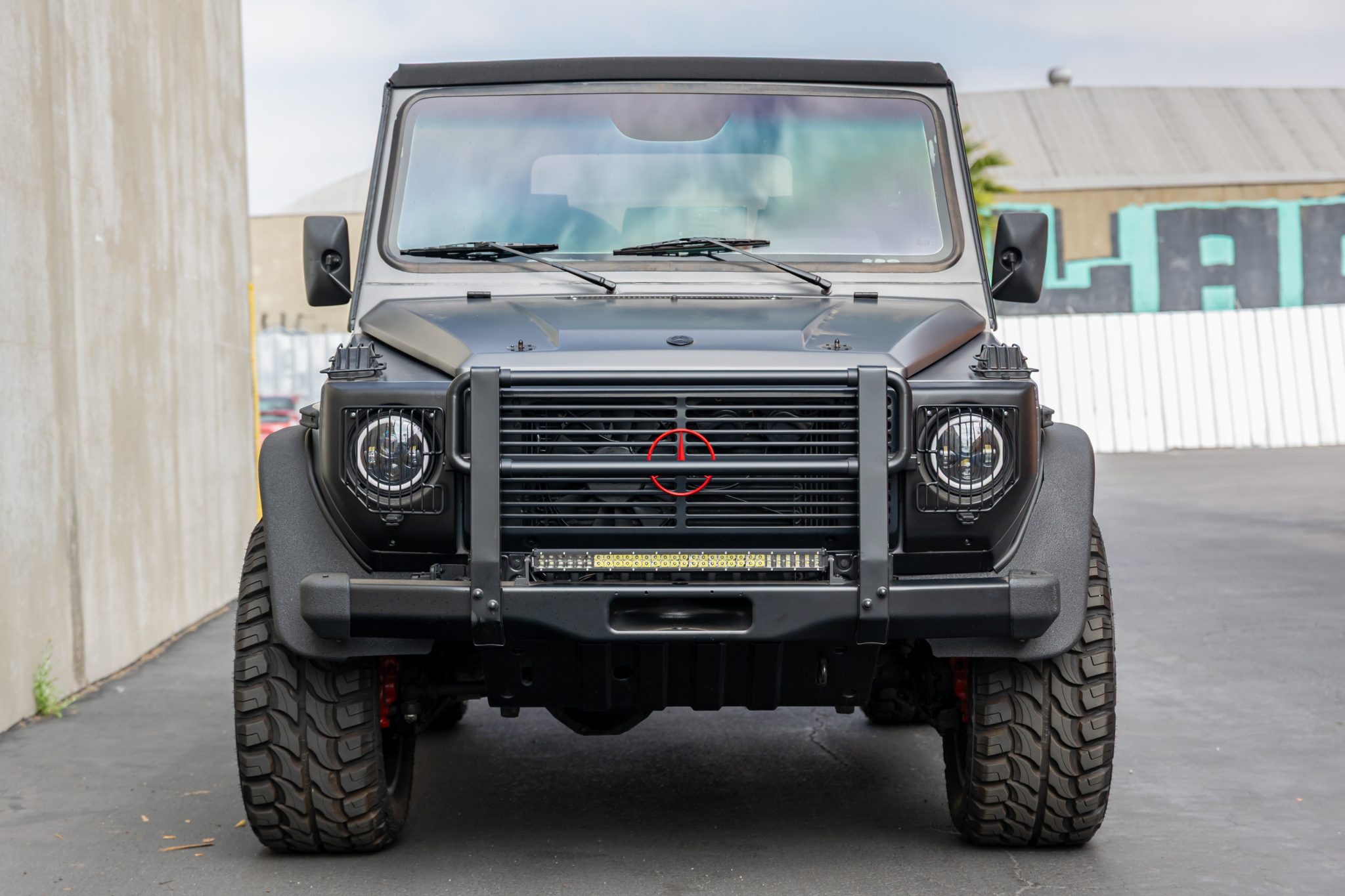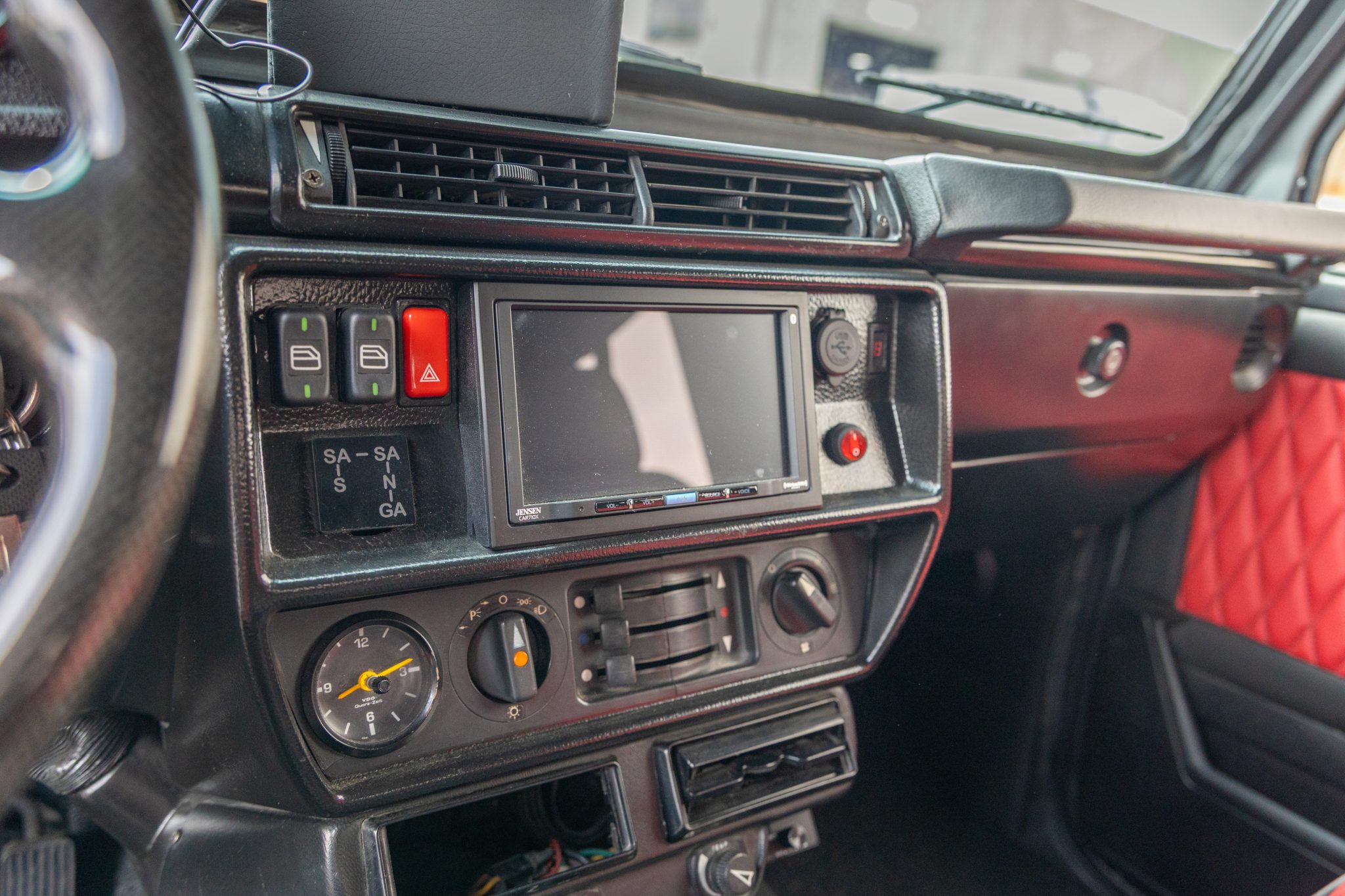 It is powered by a 2.8-liter M110 inline-six linked to a five-speed manual transmission, a dual-range transfer case, and locking front and rear differentials. Equipment includes a black canvas top, LED lighting, black 20″ aftermarket wheels, a body lift, front disc brakes, air conditioning, power windows, a Jensen touchscreen Bluetooth head unit, and front- and rear-facing cameras.