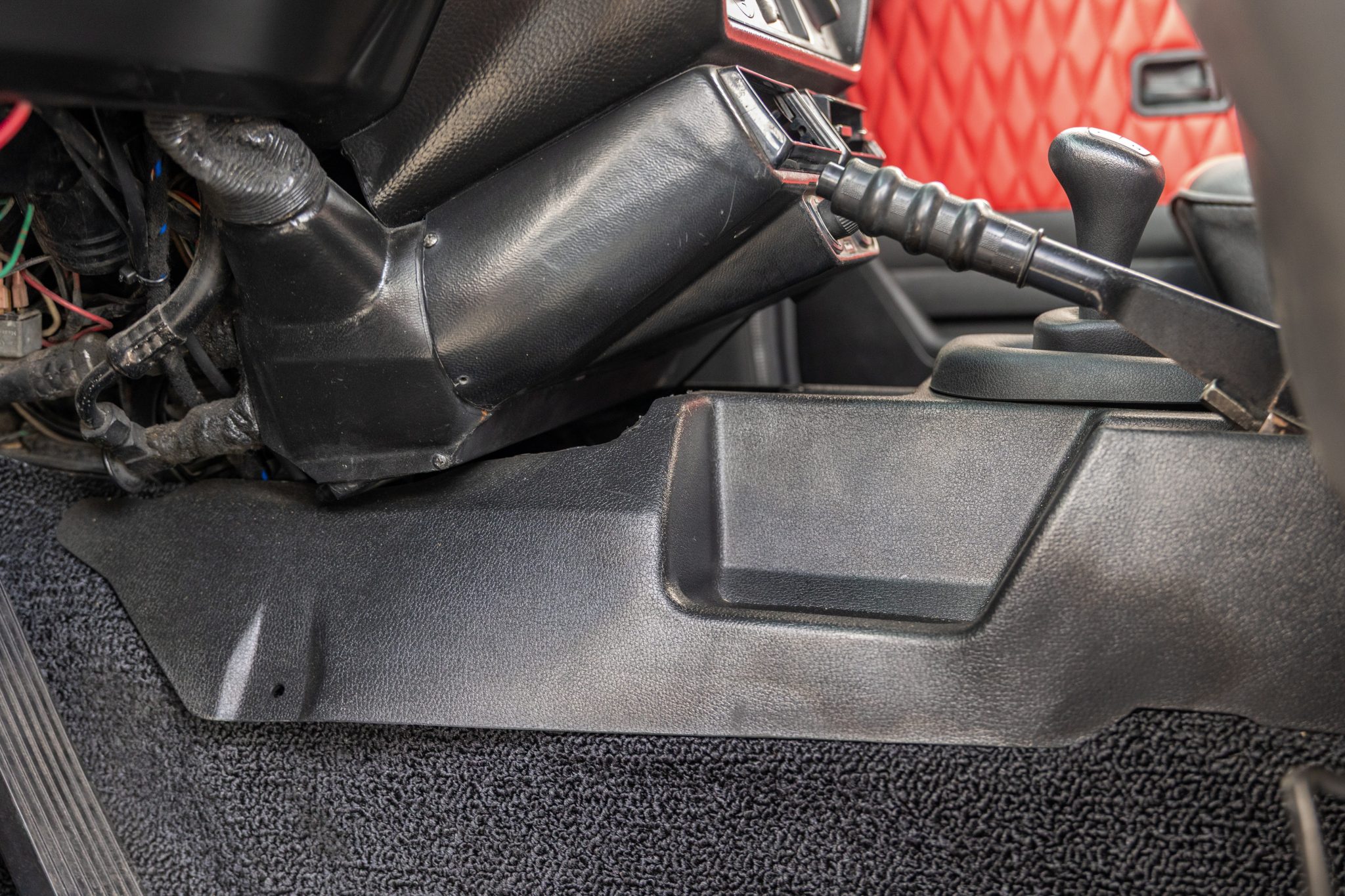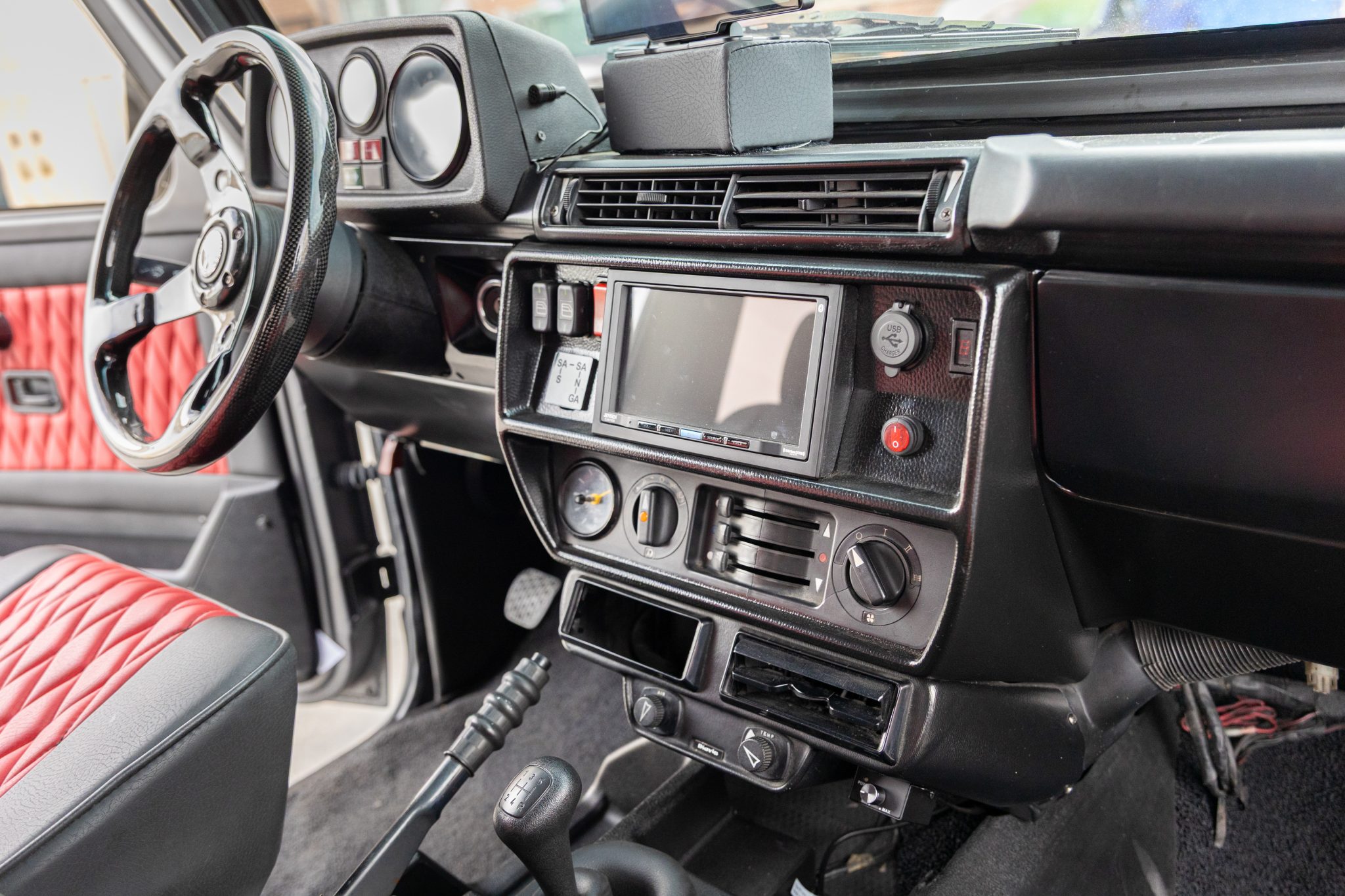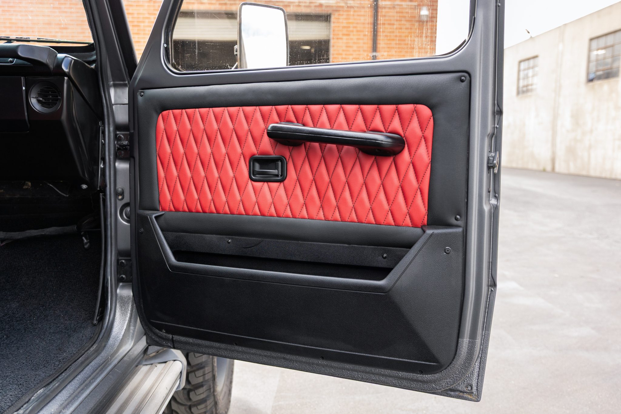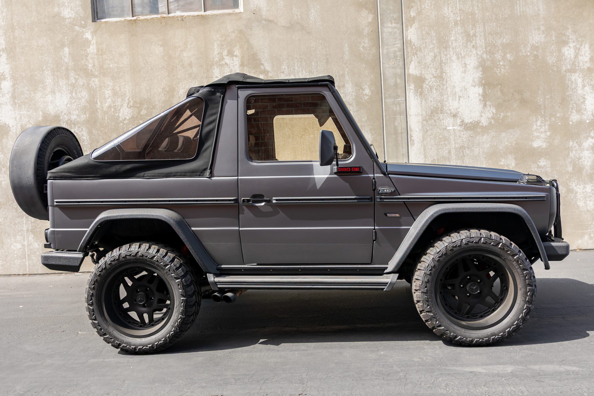 It is powered by a 2.8-liter M110 inline-six linked to a five-speed manual transmission, a dual-range transfer case, and locking front and rear differentials. Equipment includes a black canvas top, LED lighting, black 20″ aftermarket wheels, a body lift, front disc brakes, air conditioning, power windows, a Jensen touchscreen Bluetooth head unit, and front- and rear-facing cameras.