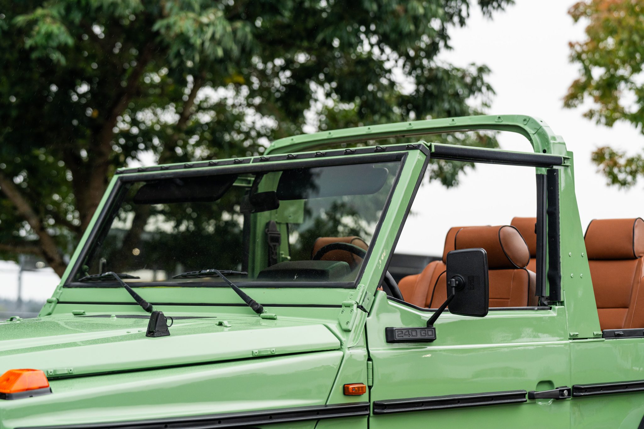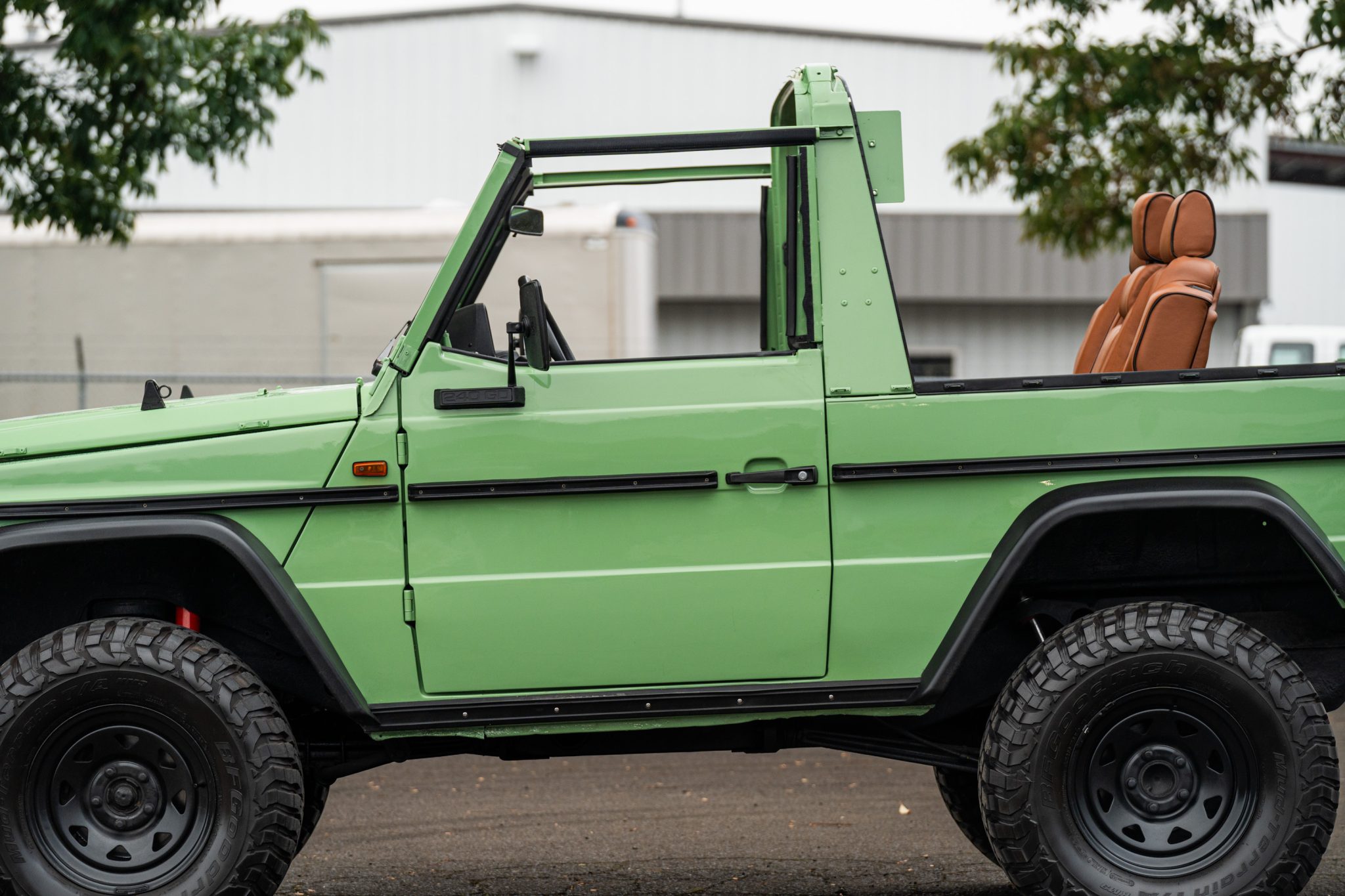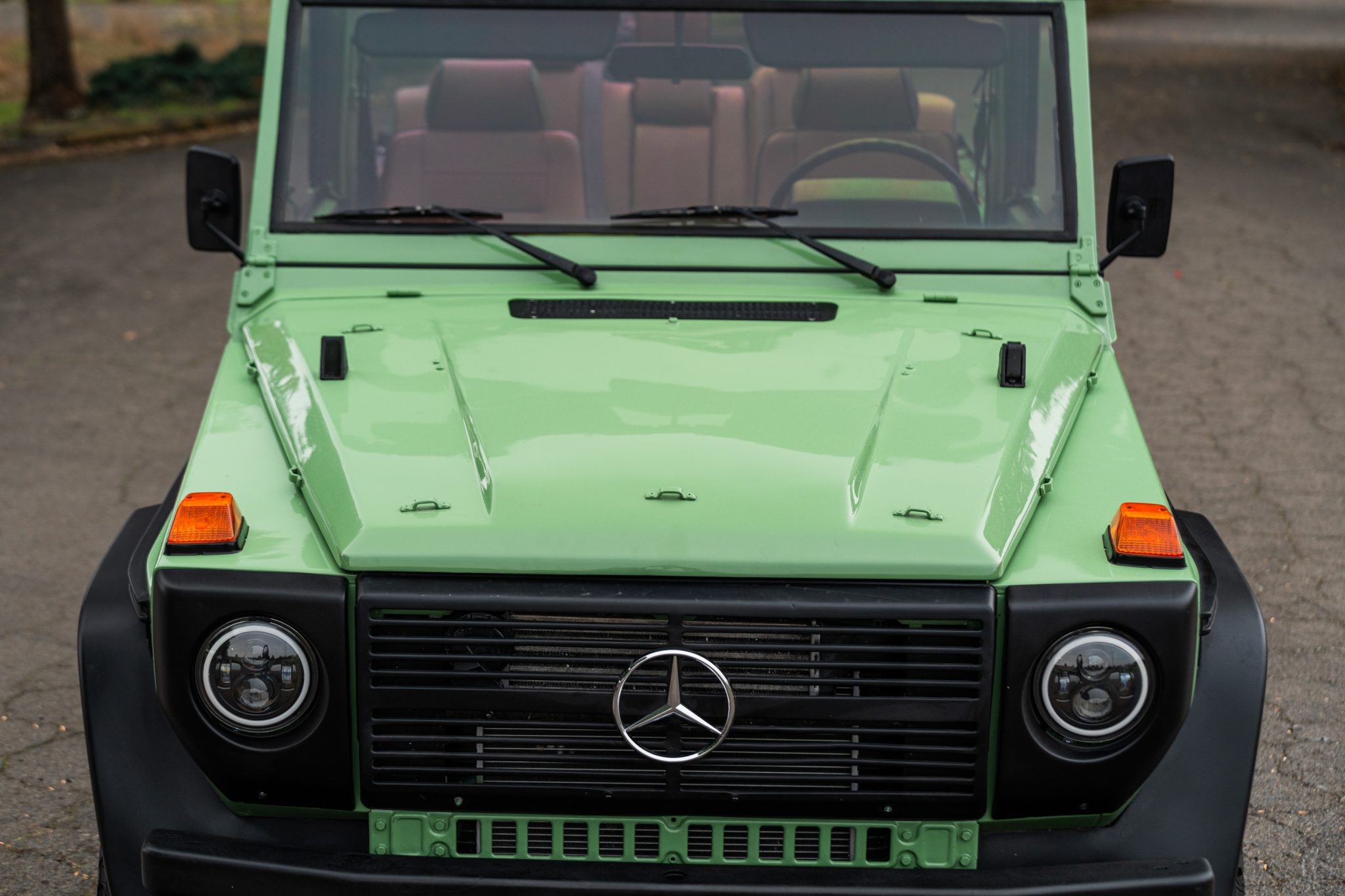 Finished in green over brown upholstery, the truck is powered by a retrofitted 3.0-liter OM606 turbodiesel inline-six linked to a four-speed automatic transmission, a dual-range transfer case, and locking front and rear differentials. Features include power steering, a 2″ suspension lift kit, disc brakes, 16″ steel wheels, LED lighting, a rear spare carrier, a cabin heater, crank windows, a rearview camera, and JVC touchscreen infotainment. This 240GD shows 74k kilometers