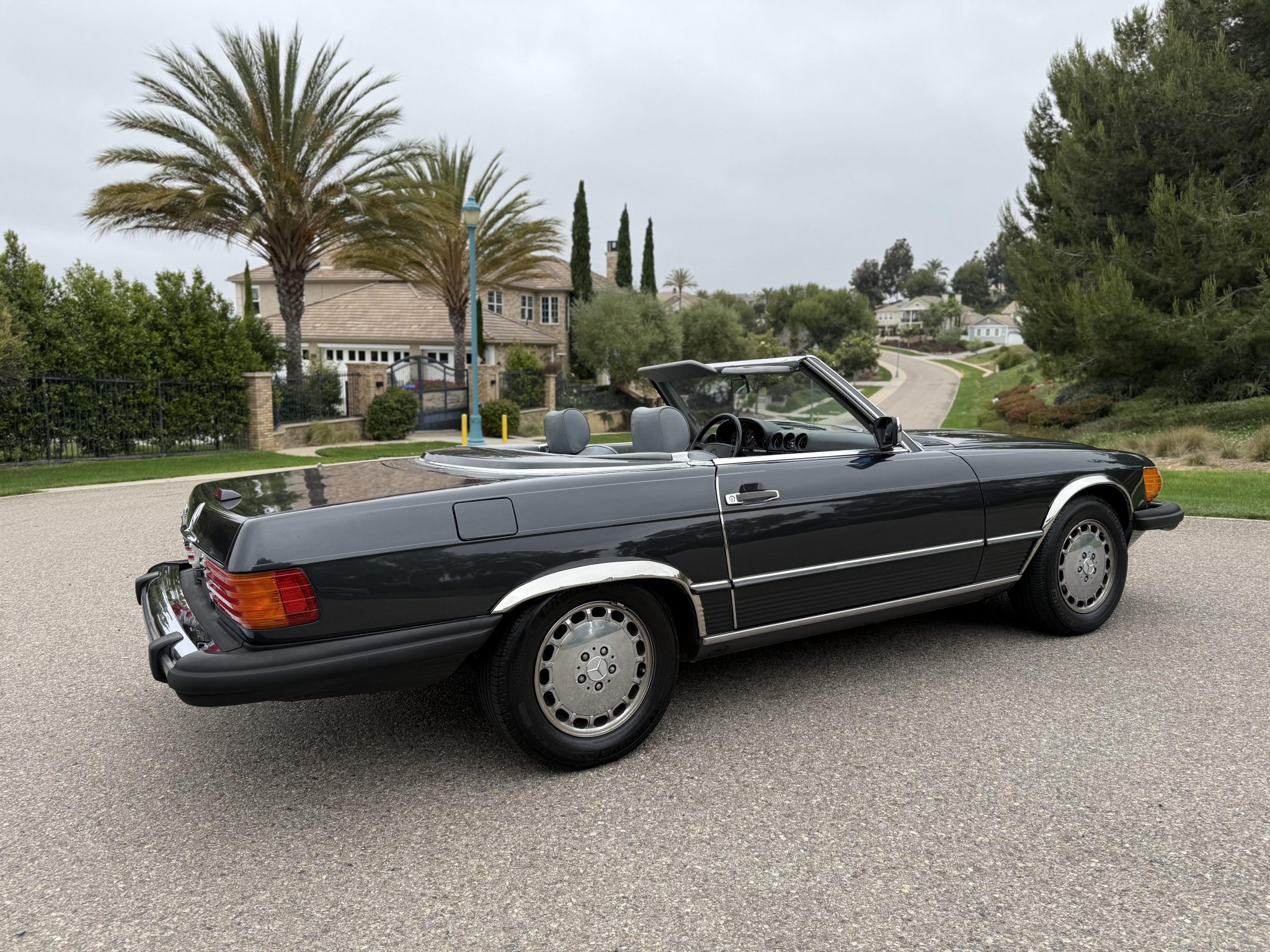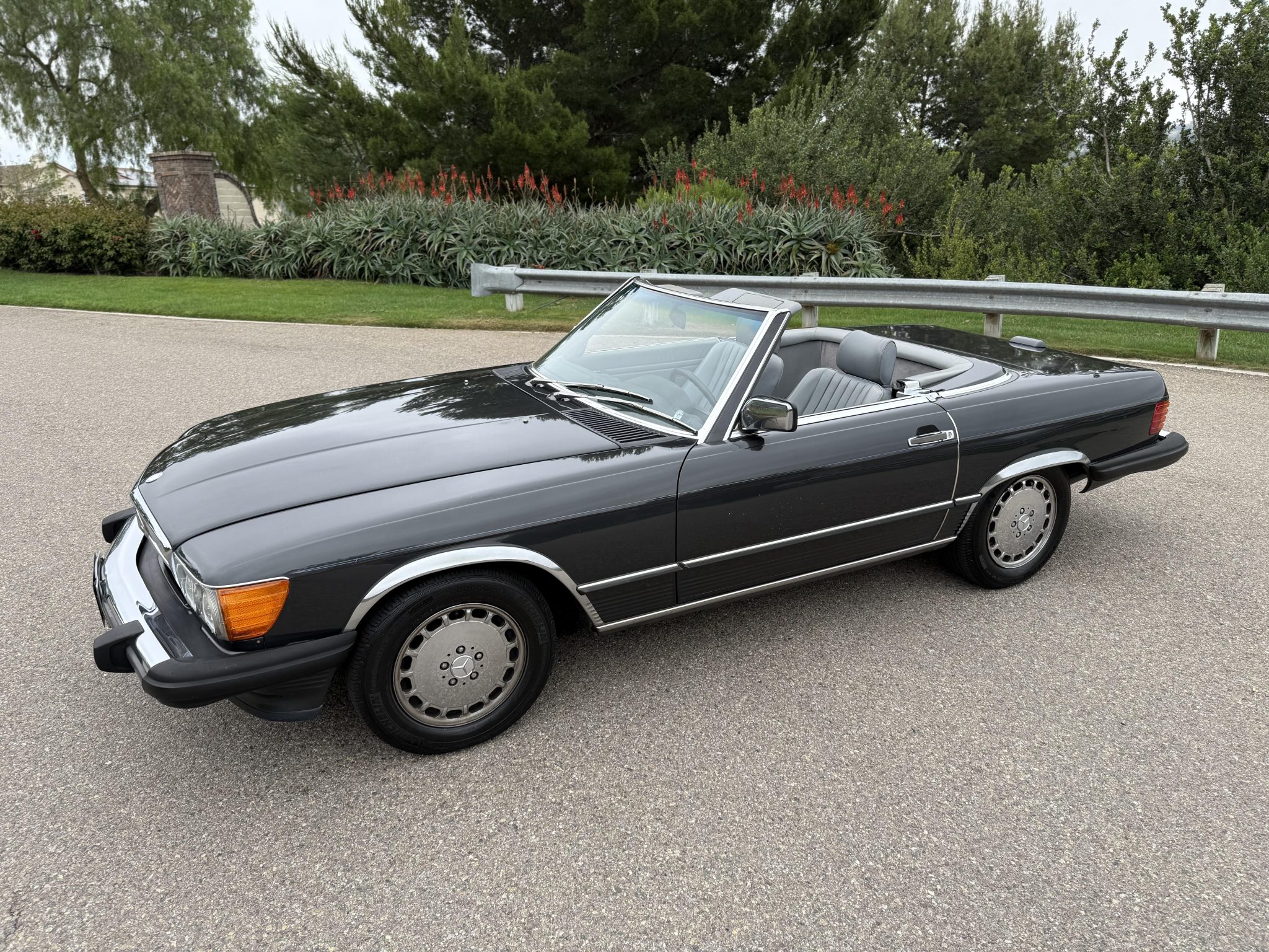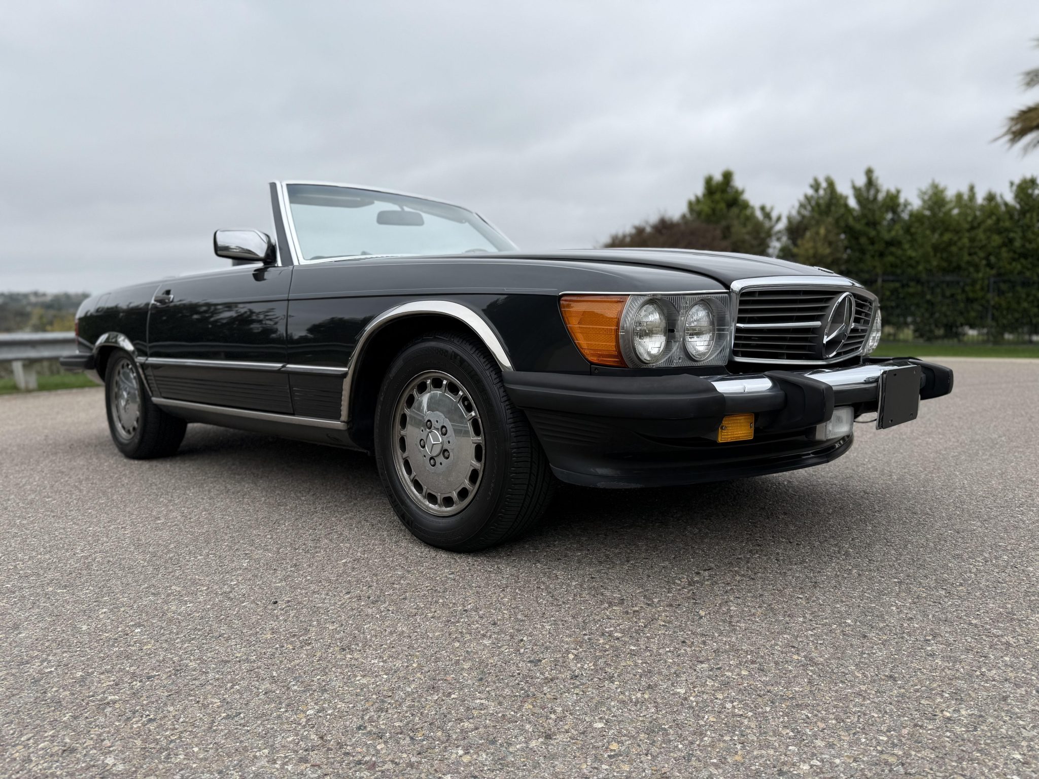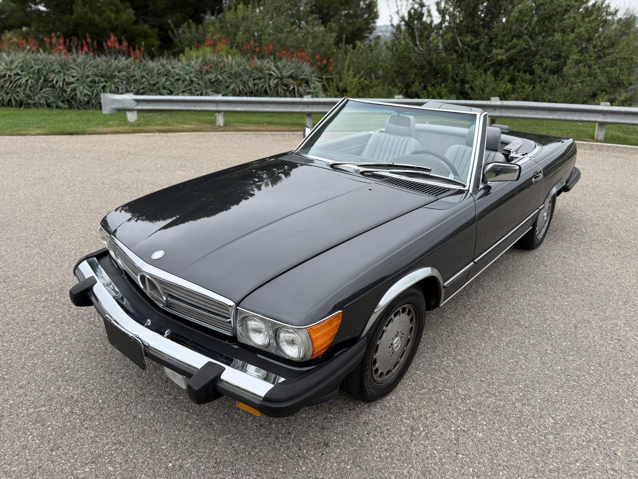 Finished in Blue Black Metallic over gray leather upholstery, the car is powered by a 5.5-liter V8 paired with a four-speed automatic transmission. Equipment includes a limited-slip differential, a black soft top, a removable hardtop, chrome-plated 15″ Gullideckel alloy wheels, fog lights, a cassette stereo, electric windows, central locking, cruise control, and automatic climate control.