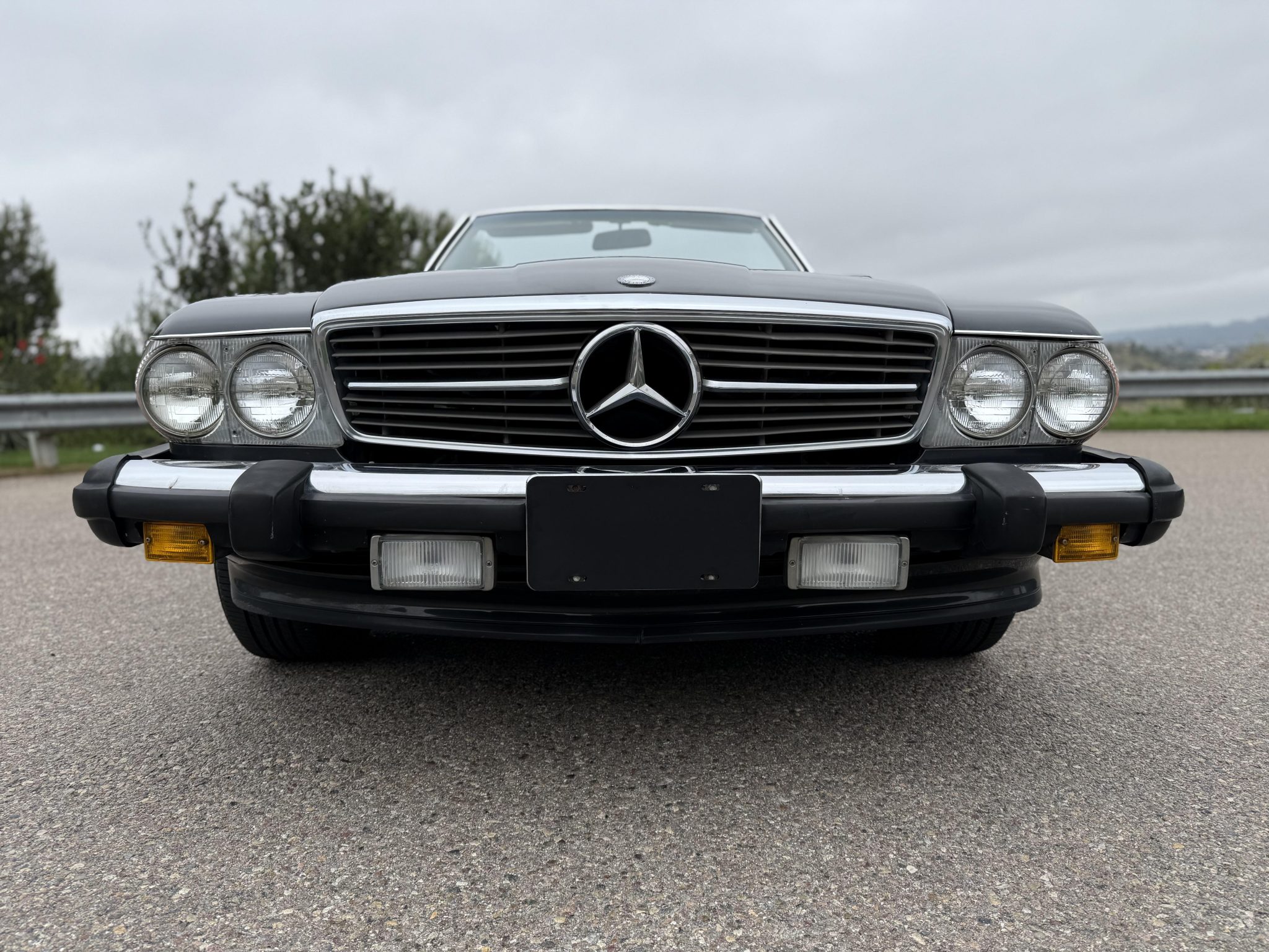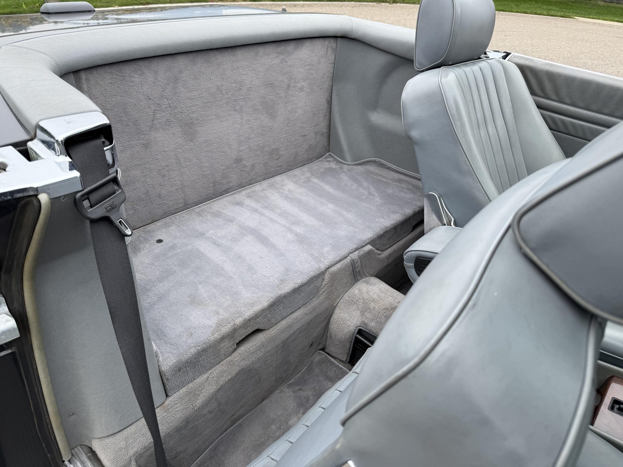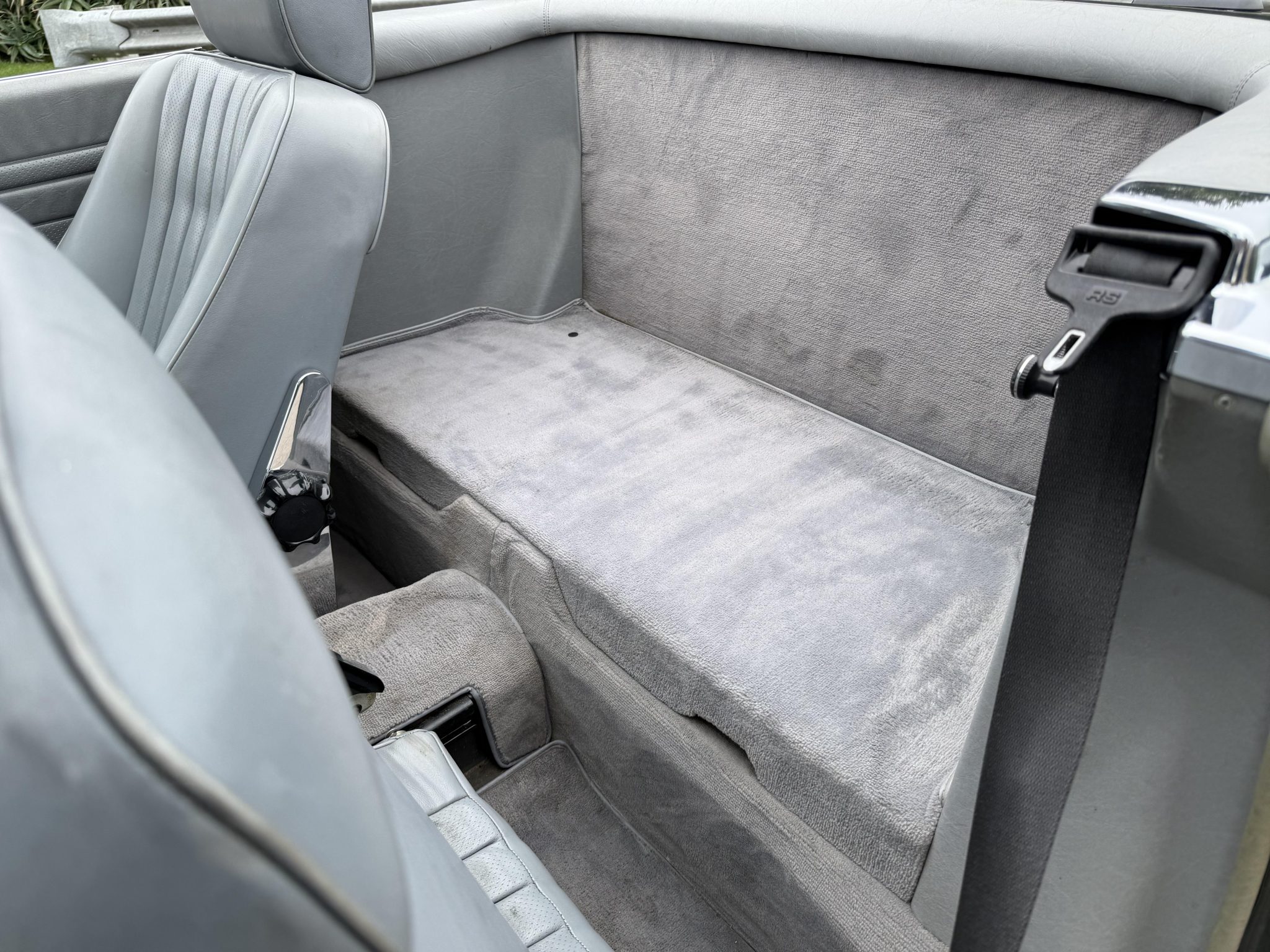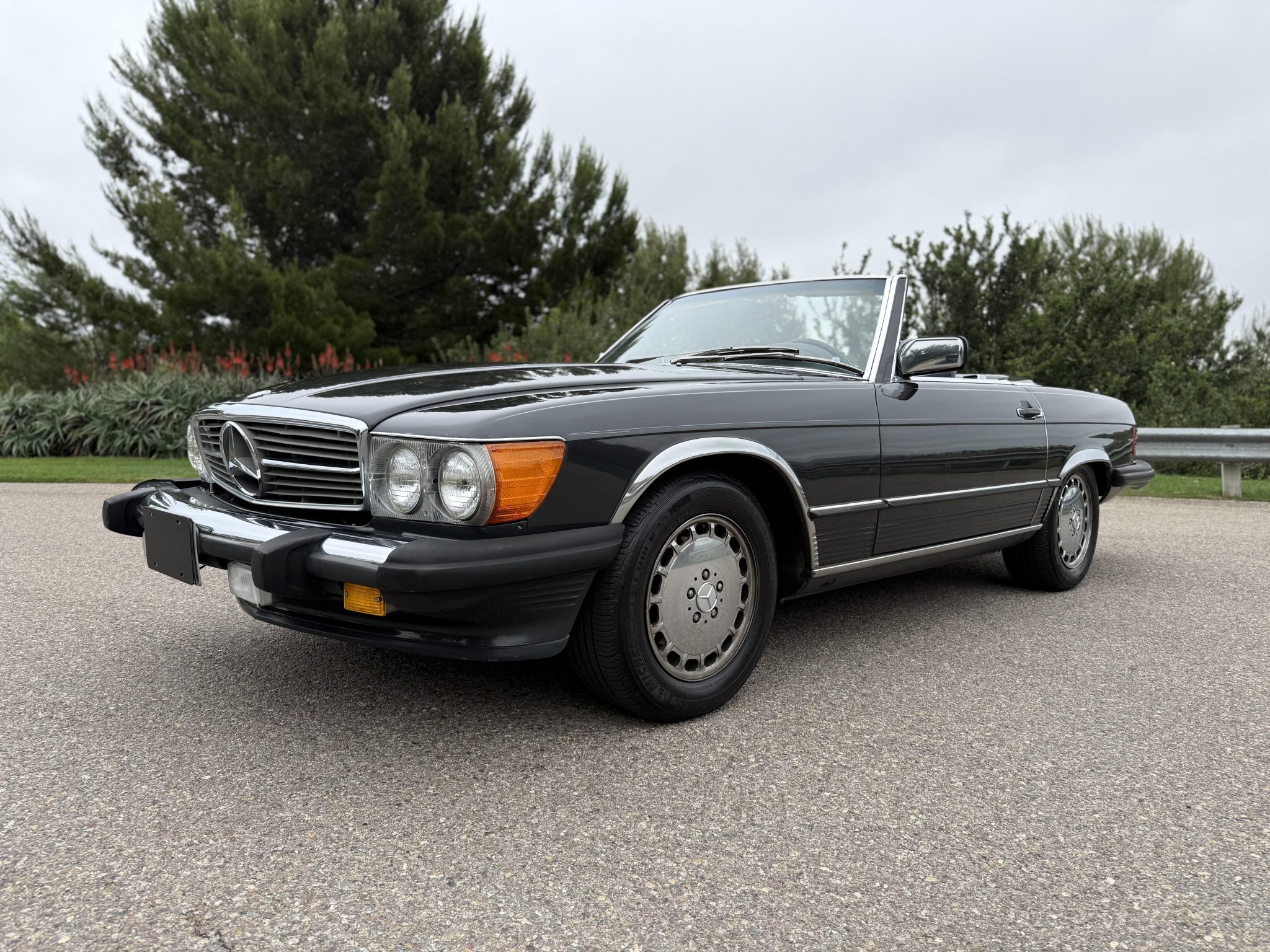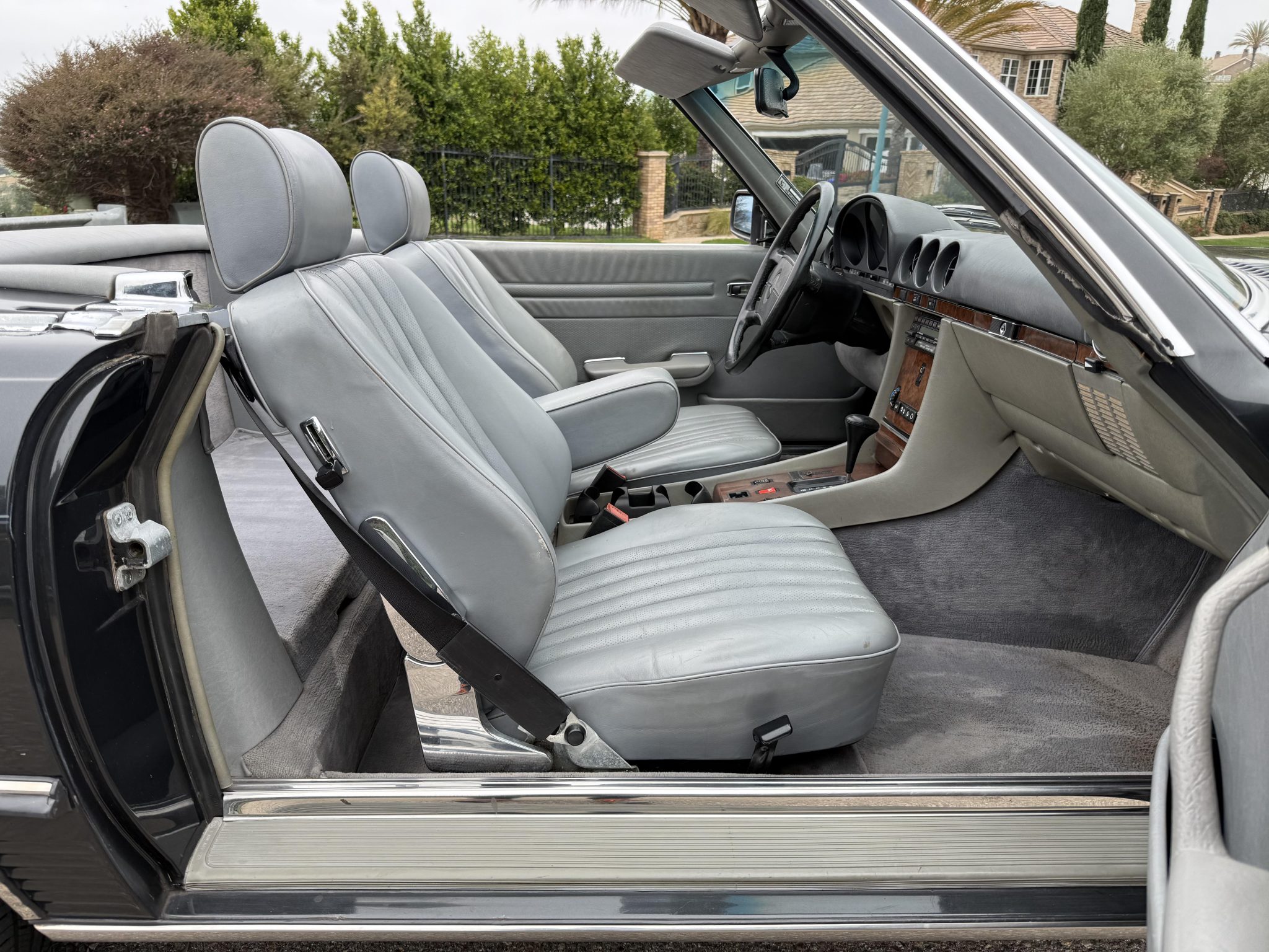 Finished in Blue Black Metallic over gray leather upholstery, the car is powered by a 5.5-liter V8 paired with a four-speed automatic transmission. Equipment includes a limited-slip differential, a black soft top, a removable hardtop, chrome-plated 15″ Gullideckel alloy wheels, fog lights, a cassette stereo, electric windows, central locking, cruise control, and automatic climate control.