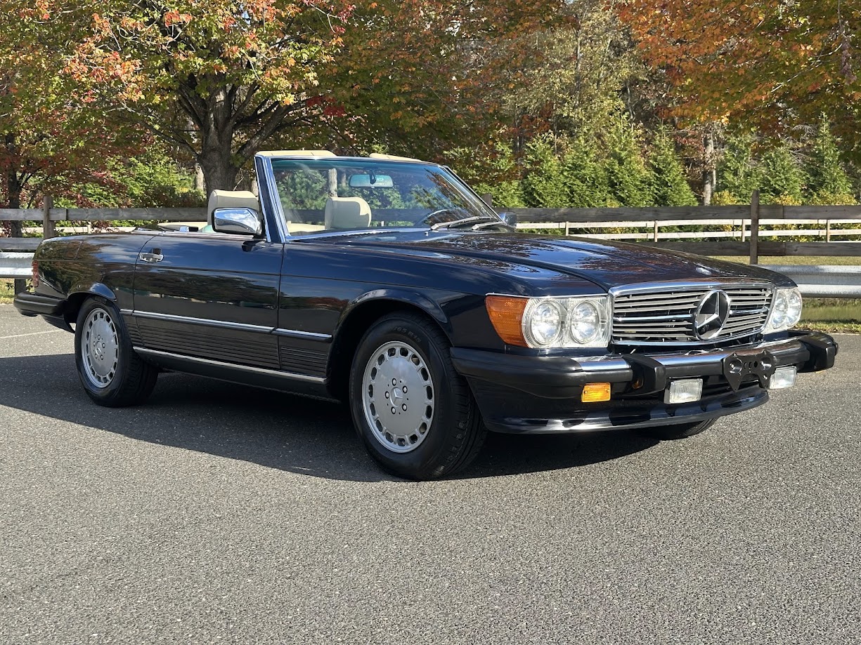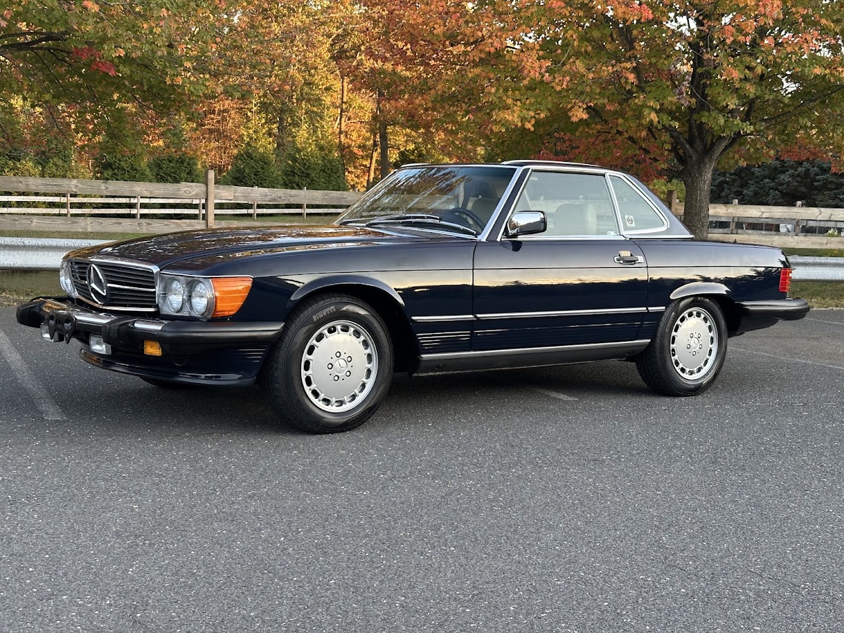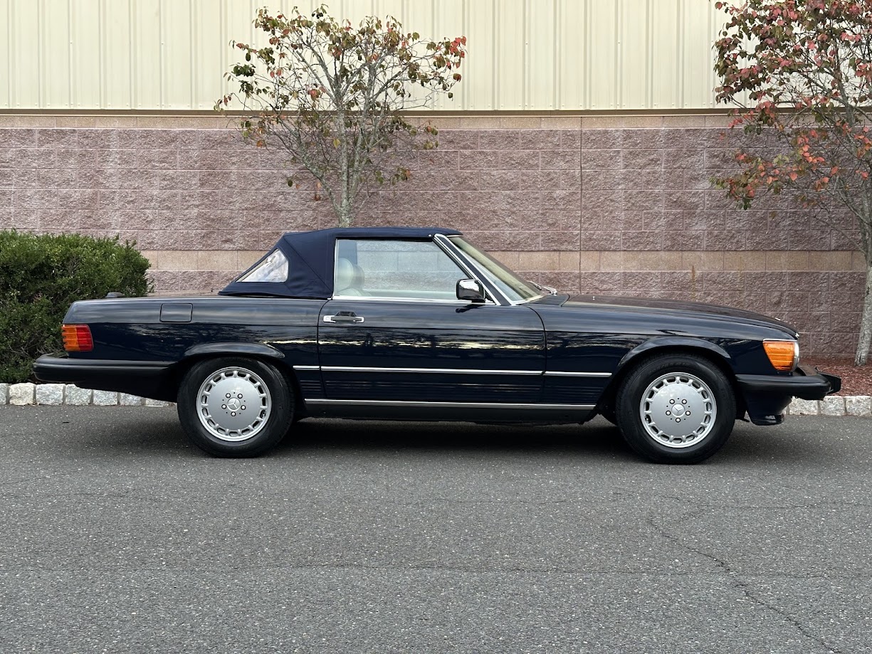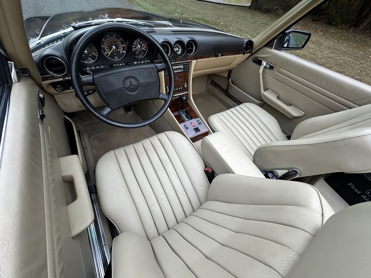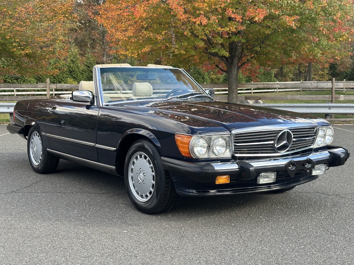The car is finished in Midnight Blue over Cream Beige leather and is powered by a 5.5-liter V8 paired with a four-speed automatic transmission. Equipment includes a limited-slip differential, a dark blue soft top, a removable hardtop, silver-finished 15″ Gullideckel alloy wheels, fog lights, a Becker AM/FM/cassette stereo, an alarm system, electric windows, central locking, cruise control, and automatic climate control.