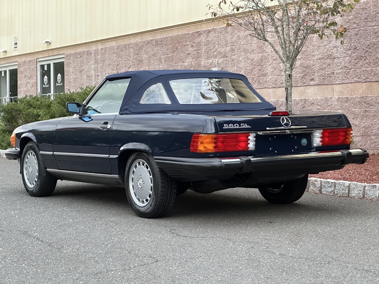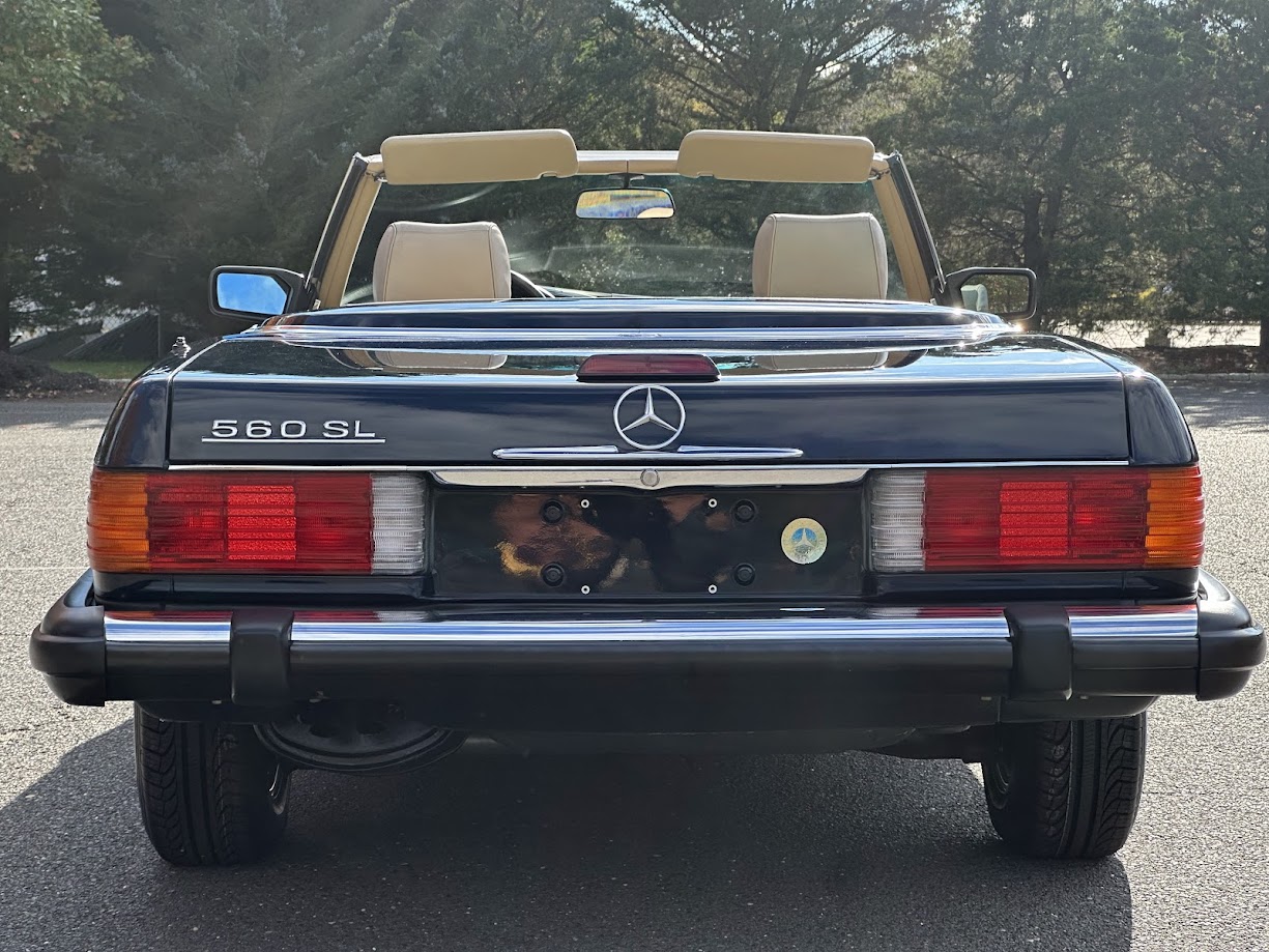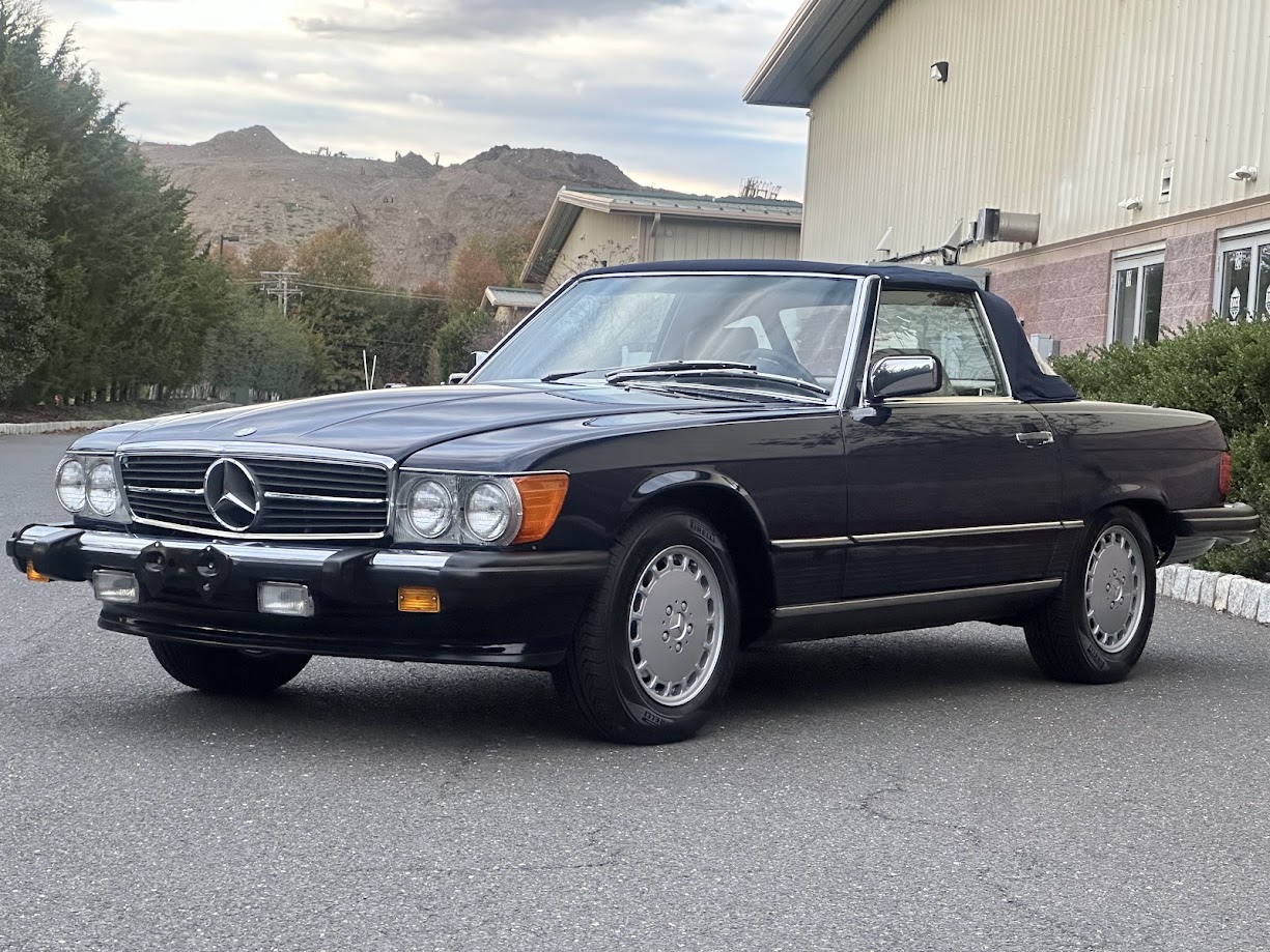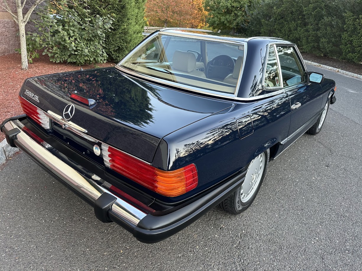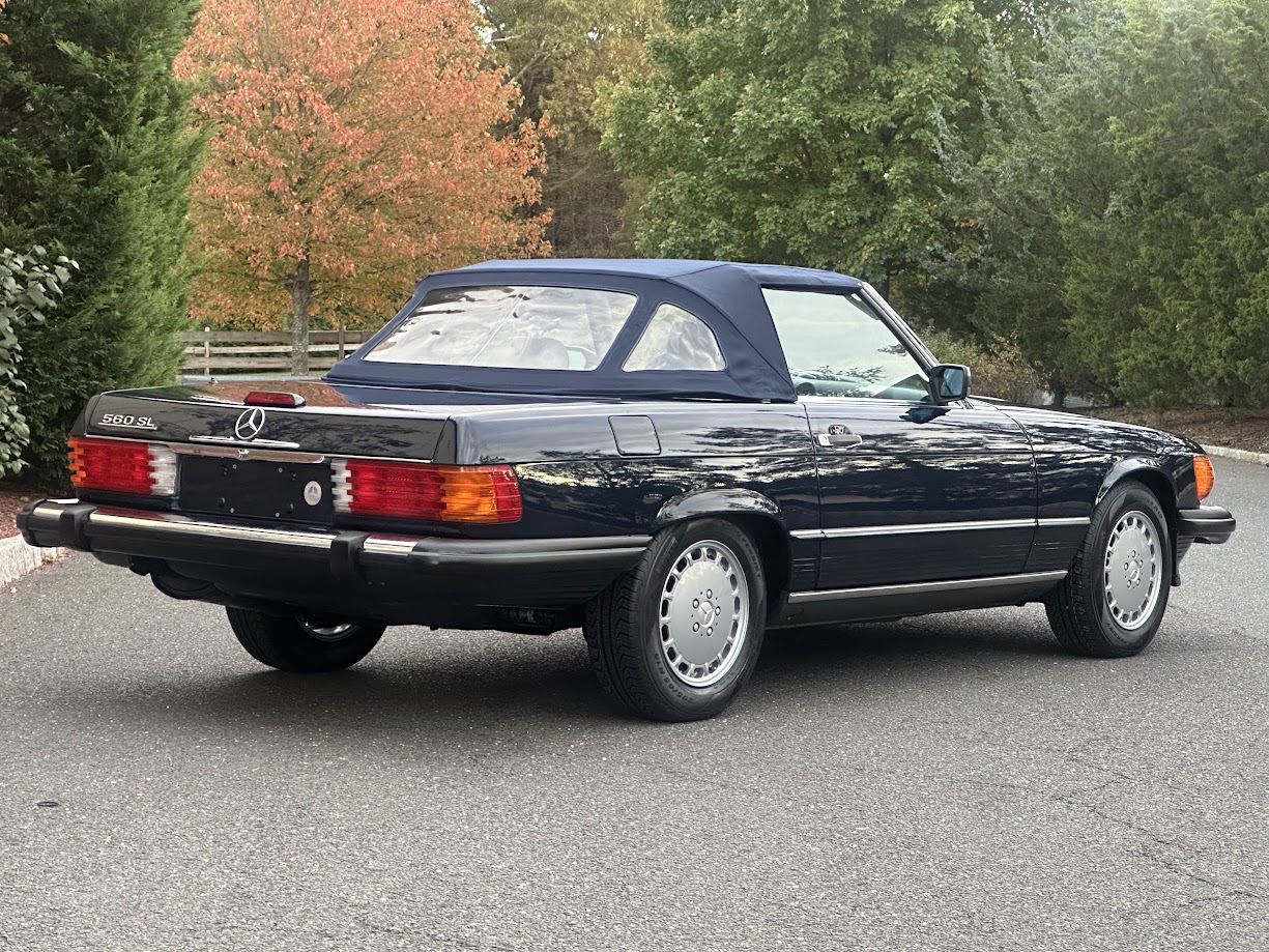 The car is finished in Midnight Blue over Cream Beige leather and is powered by a 5.5-liter V8 paired with a four-speed automatic transmission. Equipment includes a limited-slip differential, a dark blue soft top, a removable hardtop, silver-finished 15″ Gullideckel alloy wheels, fog lights, a Becker AM/FM/cassette stereo, an alarm system, electric windows, central locking, cruise control, and automatic climate control.