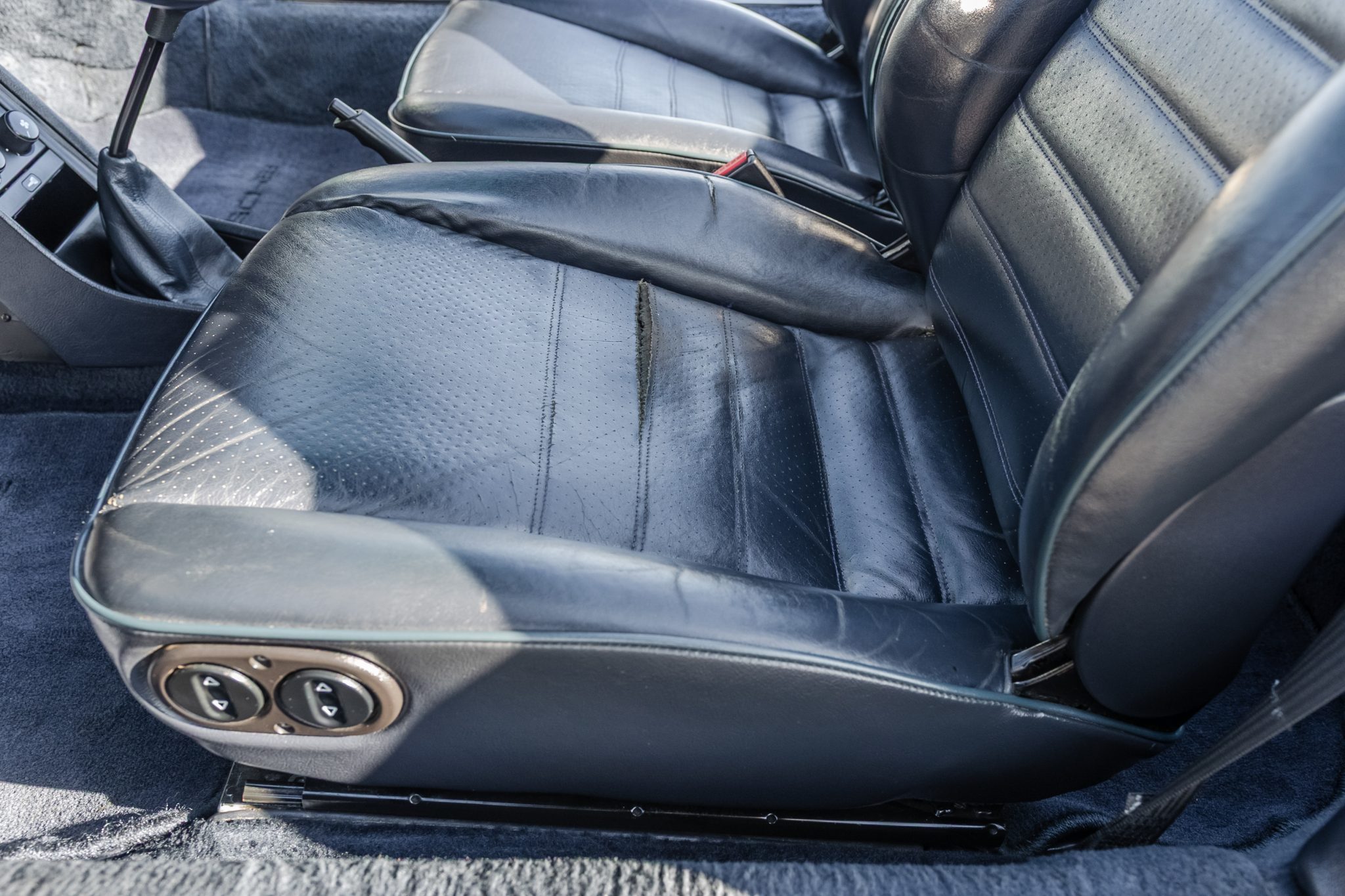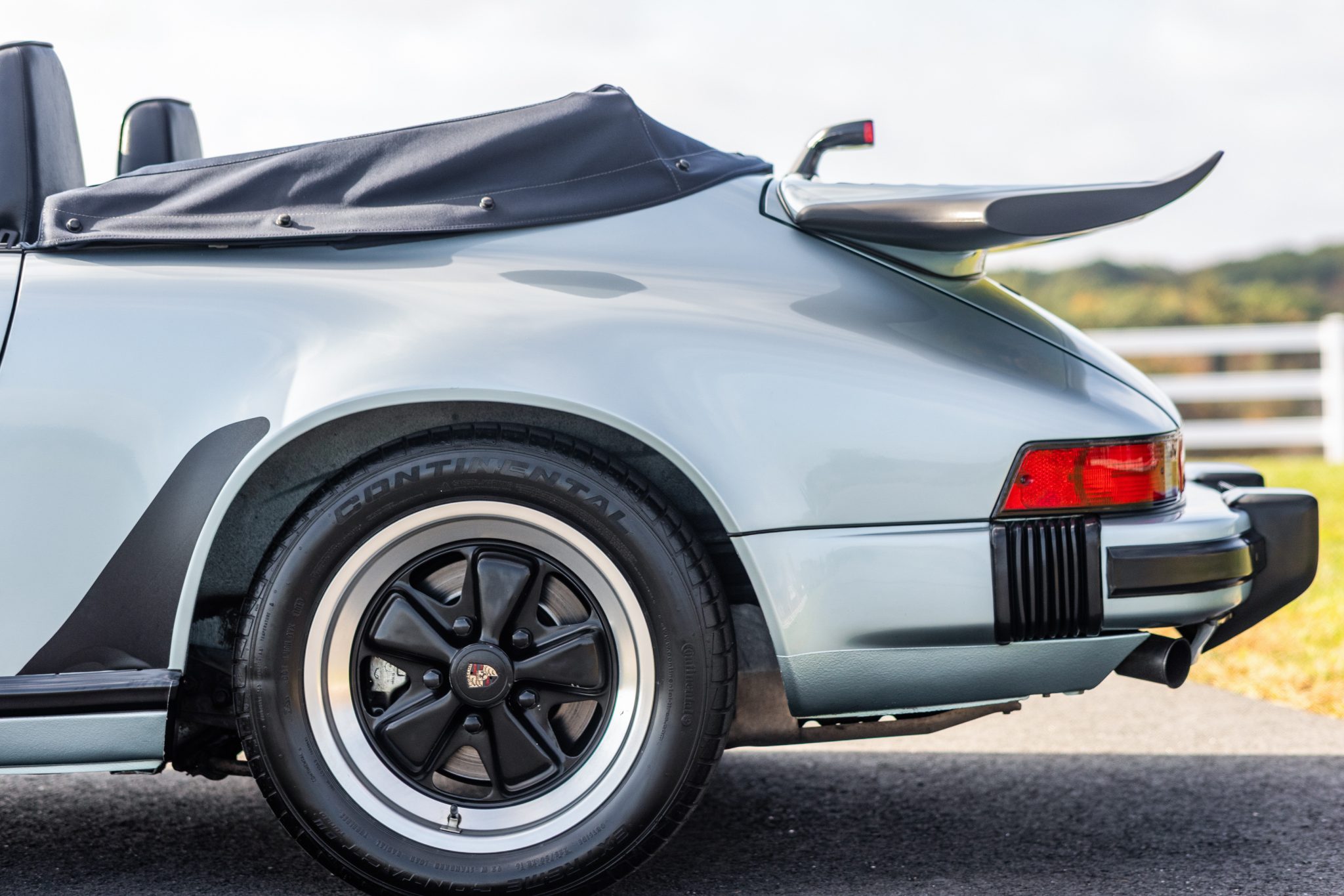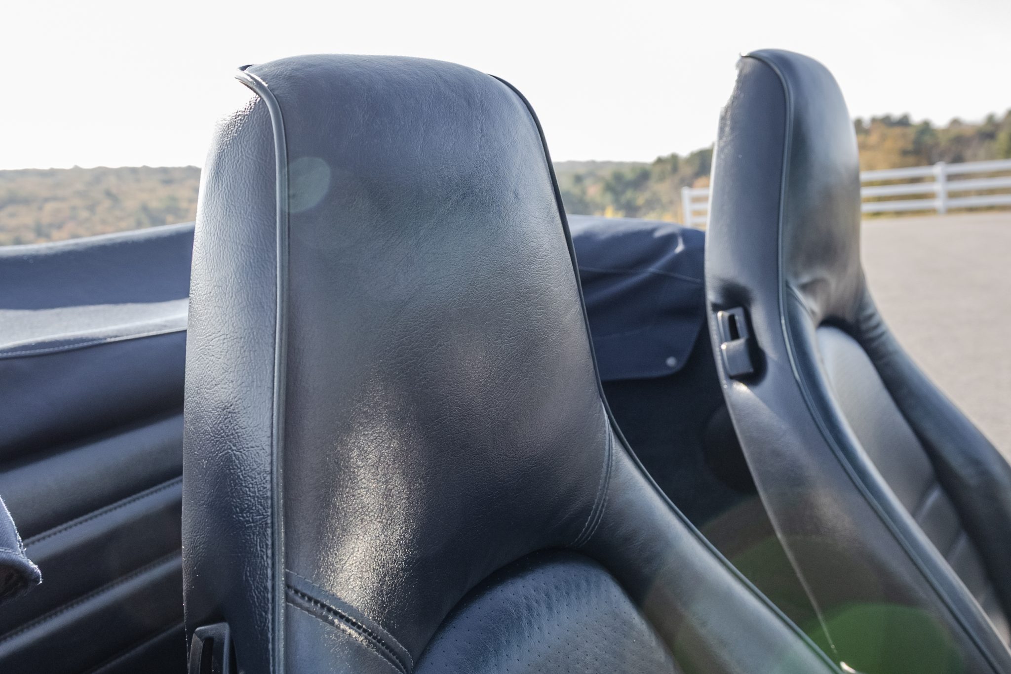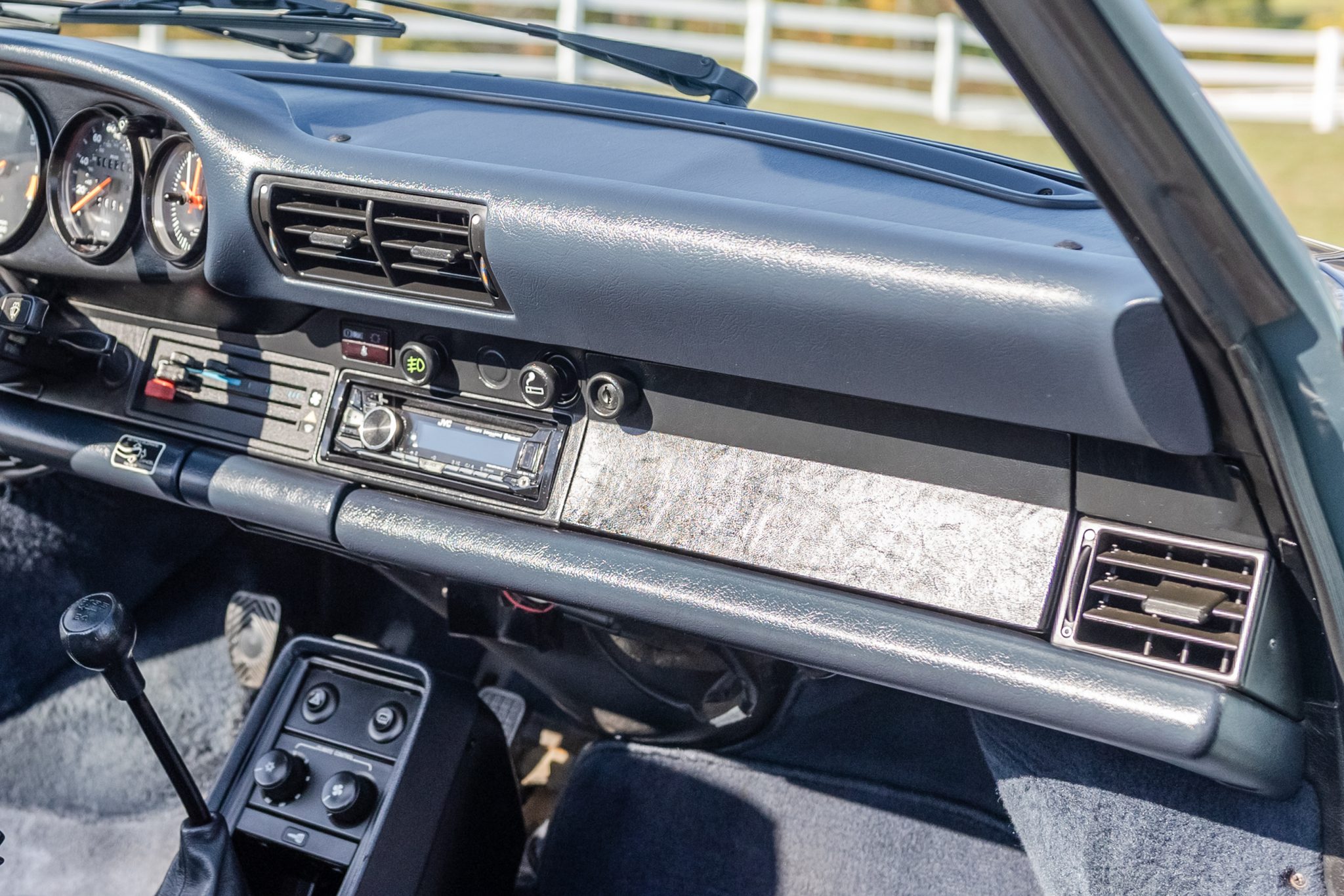 The car is finished in Lagoon Green Metallic over Marine Blue leather and is powered by a 3.2-liter flat-six paired with a G50 five-speed manual transaxle. Equipment includes 16″ Fuchs alloy wheels, a blue soft top, a rear spoiler, a three-spoke steering wheel, power-adjustable front seats, central locking, power windows, and a JVC CD stereo with Bluetooth connectivity, USB input, and satellite radio capability.