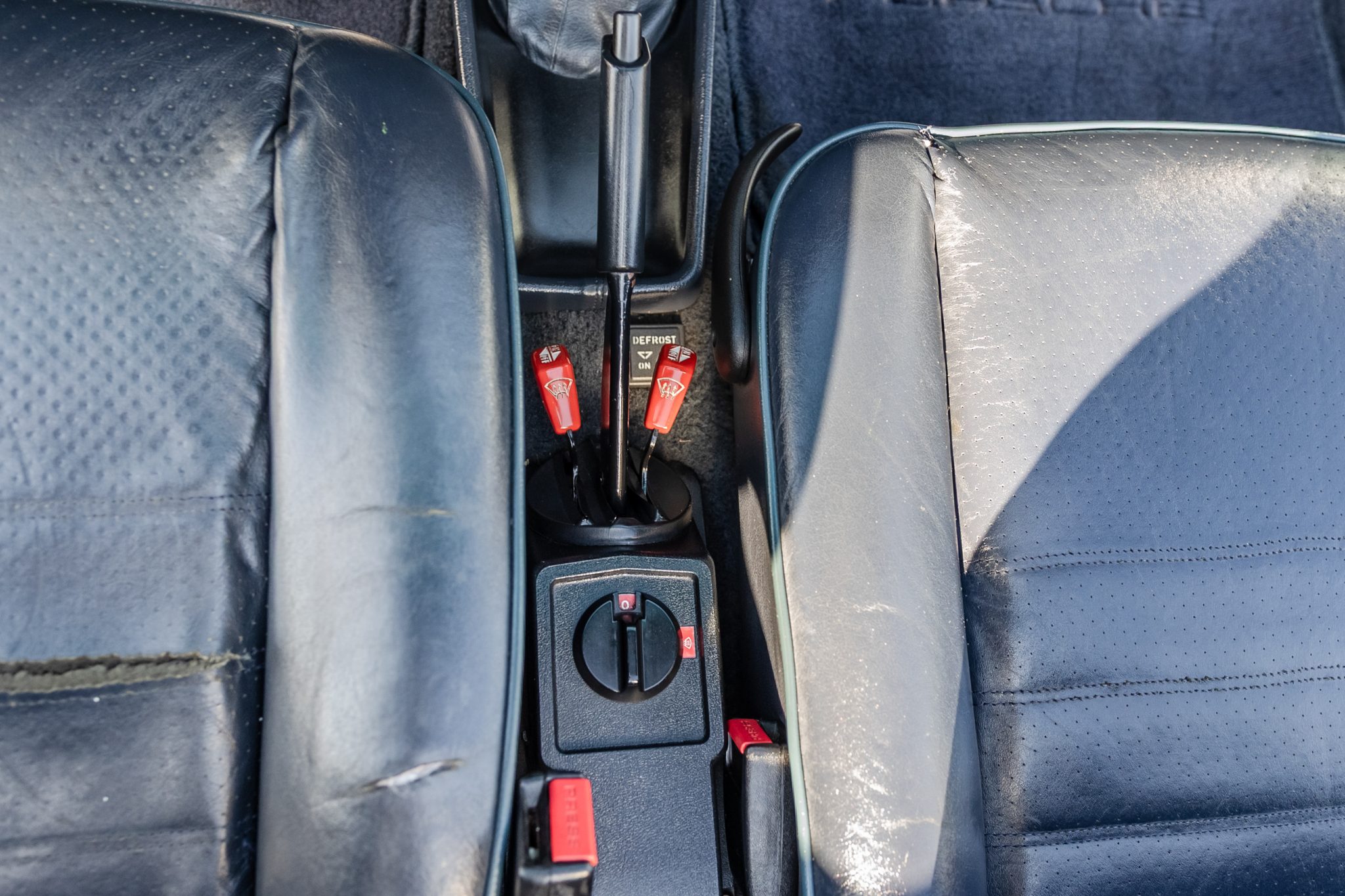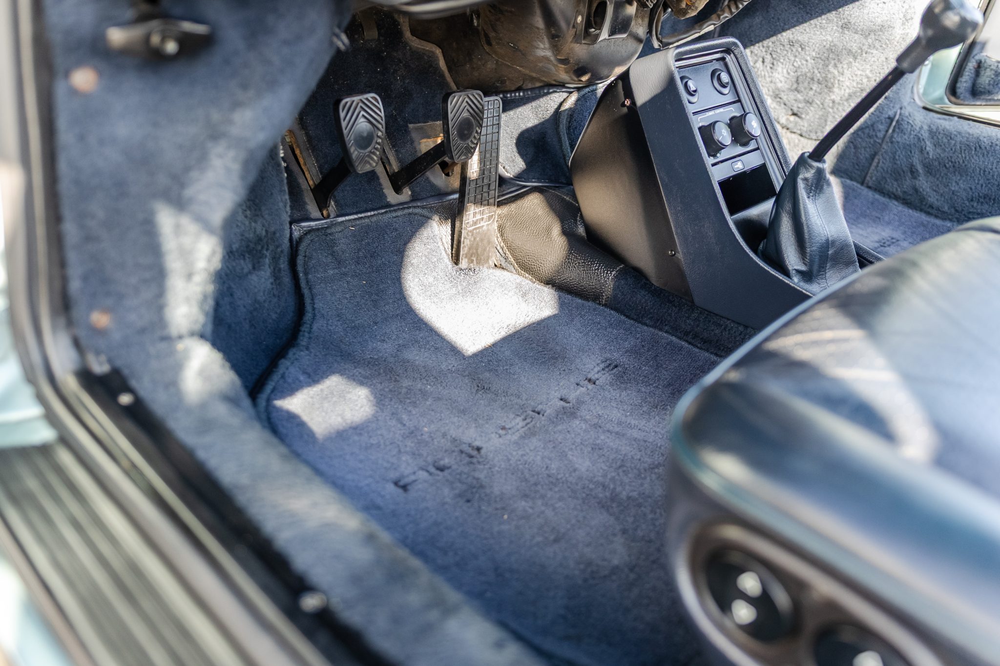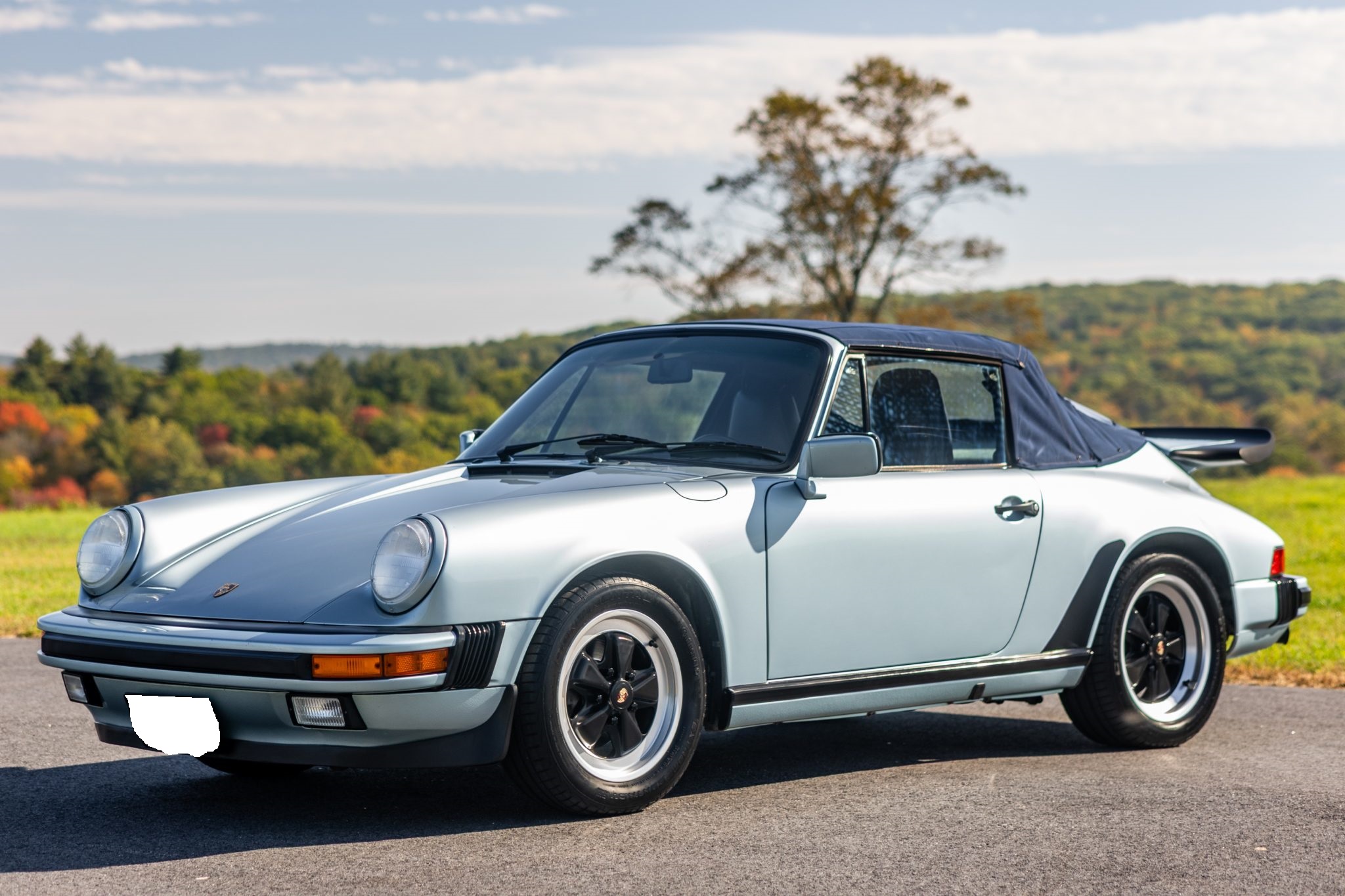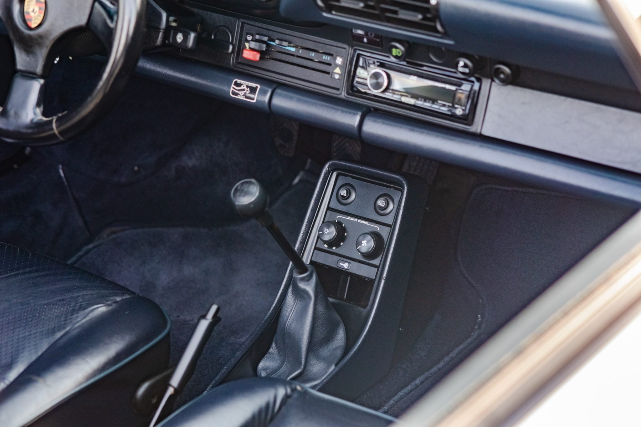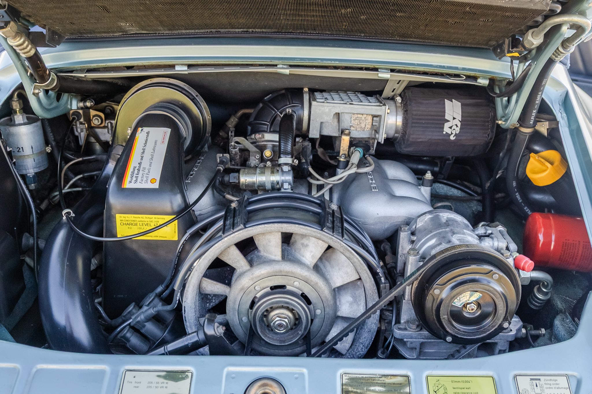 The car is finished in Lagoon Green Metallic over Marine Blue leather and is powered by a 3.2-liter flat-six paired with a G50 five-speed manual transaxle. Equipment includes 16″ Fuchs alloy wheels, a blue soft top, a rear spoiler, a three-spoke steering wheel, power-adjustable front seats, central locking, power windows, and a JVC CD stereo with Bluetooth connectivity, USB input, and satellite radio capability.