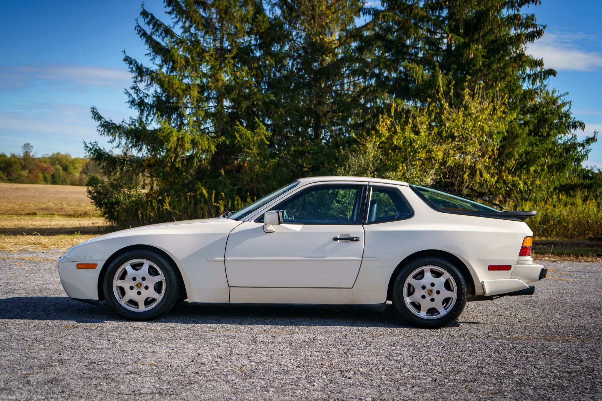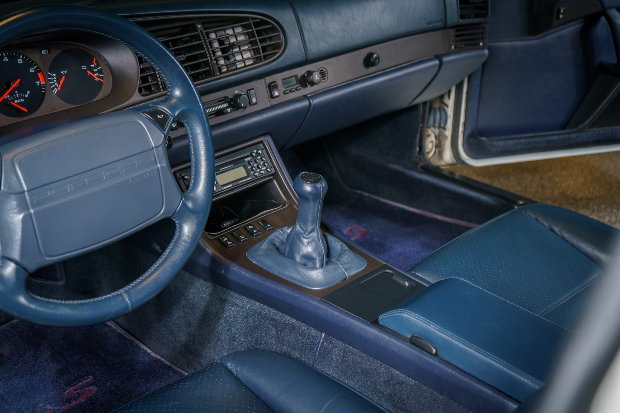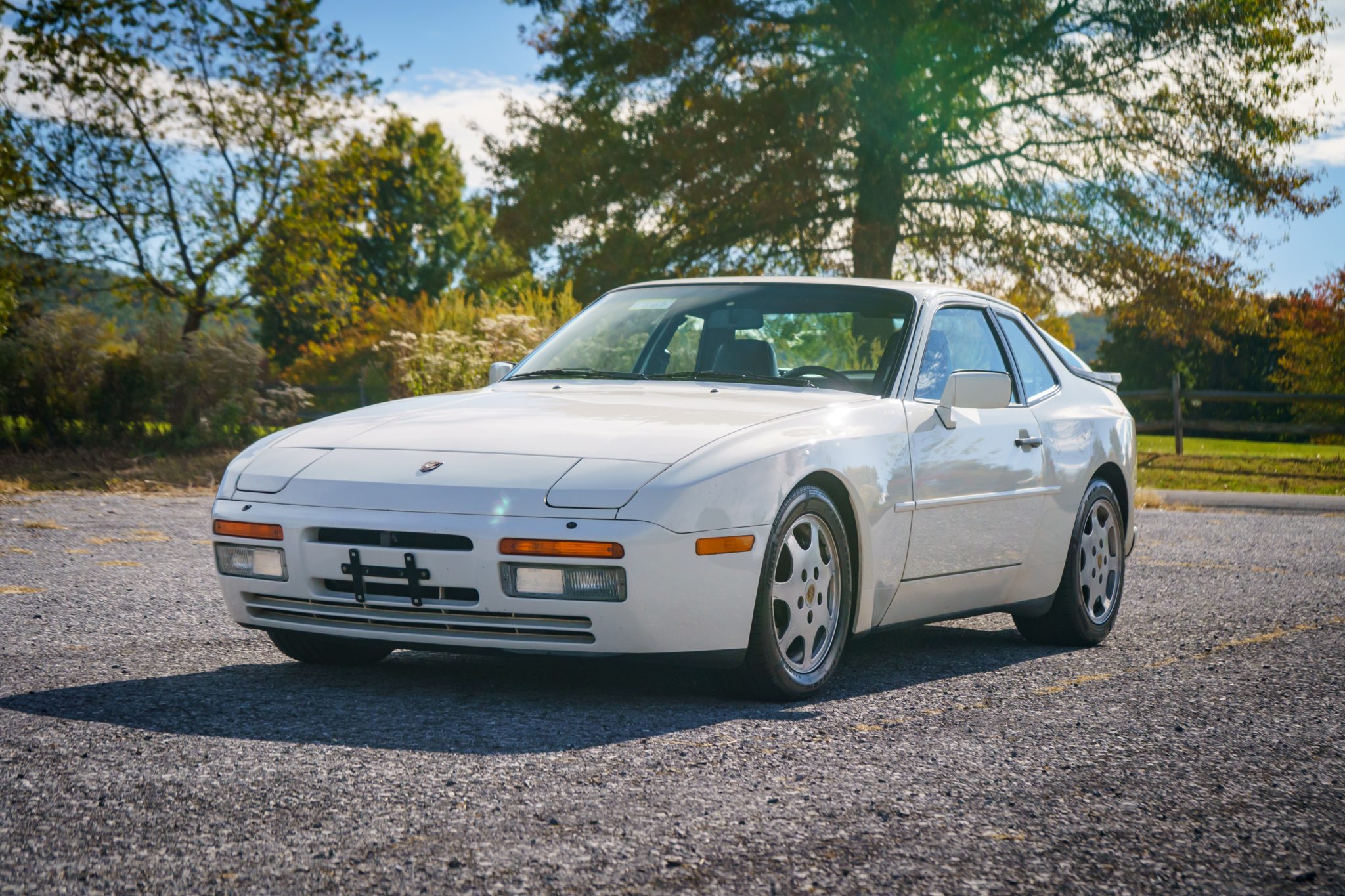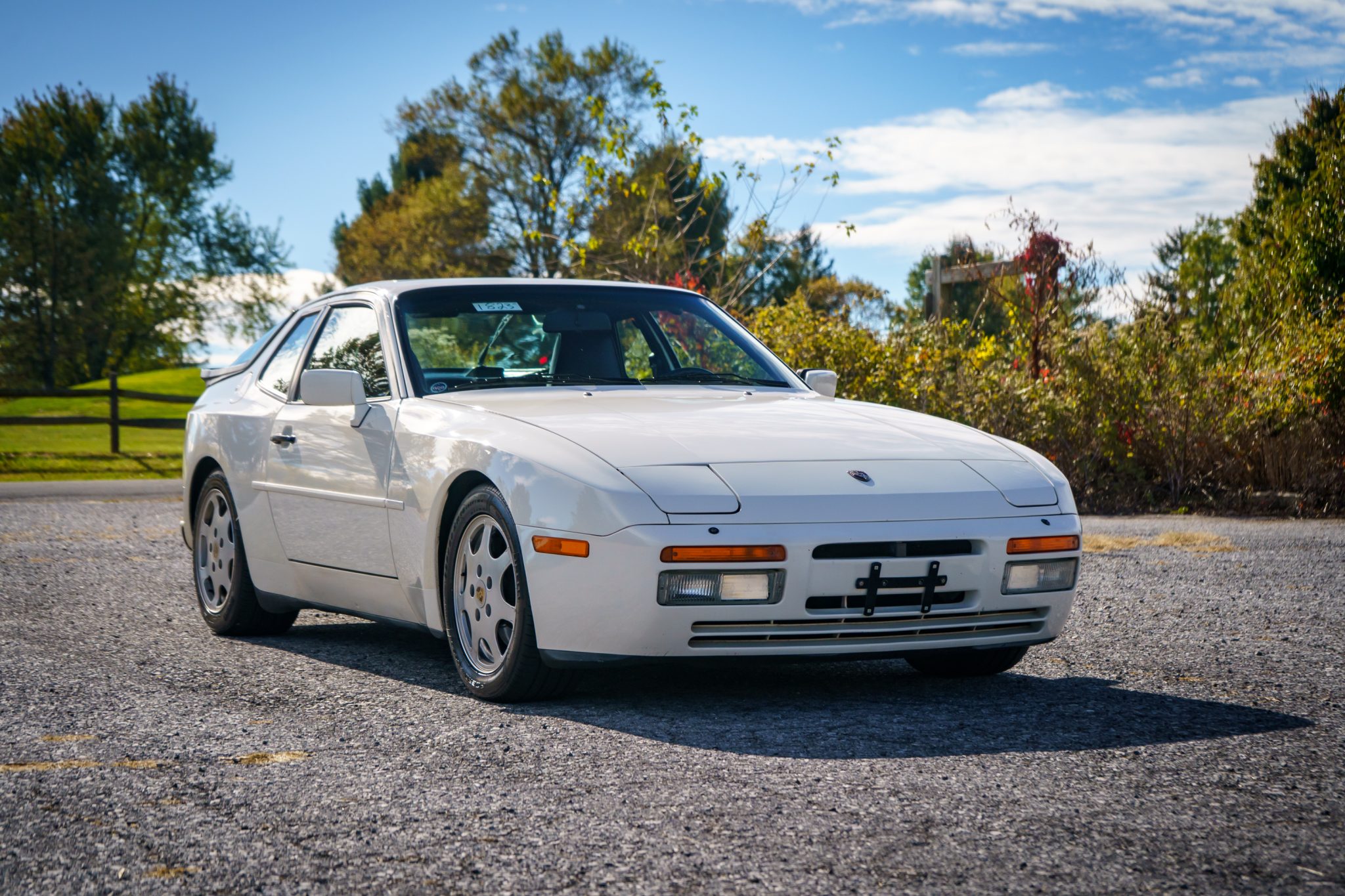 This 1989 Porsche 944 Turbo is powered by a turbocharged 2.5-liter inline-four paired with a five-speed manual transaxle and is finished in Alpine White over Marine Blue leather upholstery. Showing 61k miles, the car is equipped with 16″ Club Sport alloy wheels, a limited-slip differential, pop-up headlights, fog lights, power-adjustable front seats, a sunroof, a Blaupunkt CD stereo, cruise control, and air conditioning.