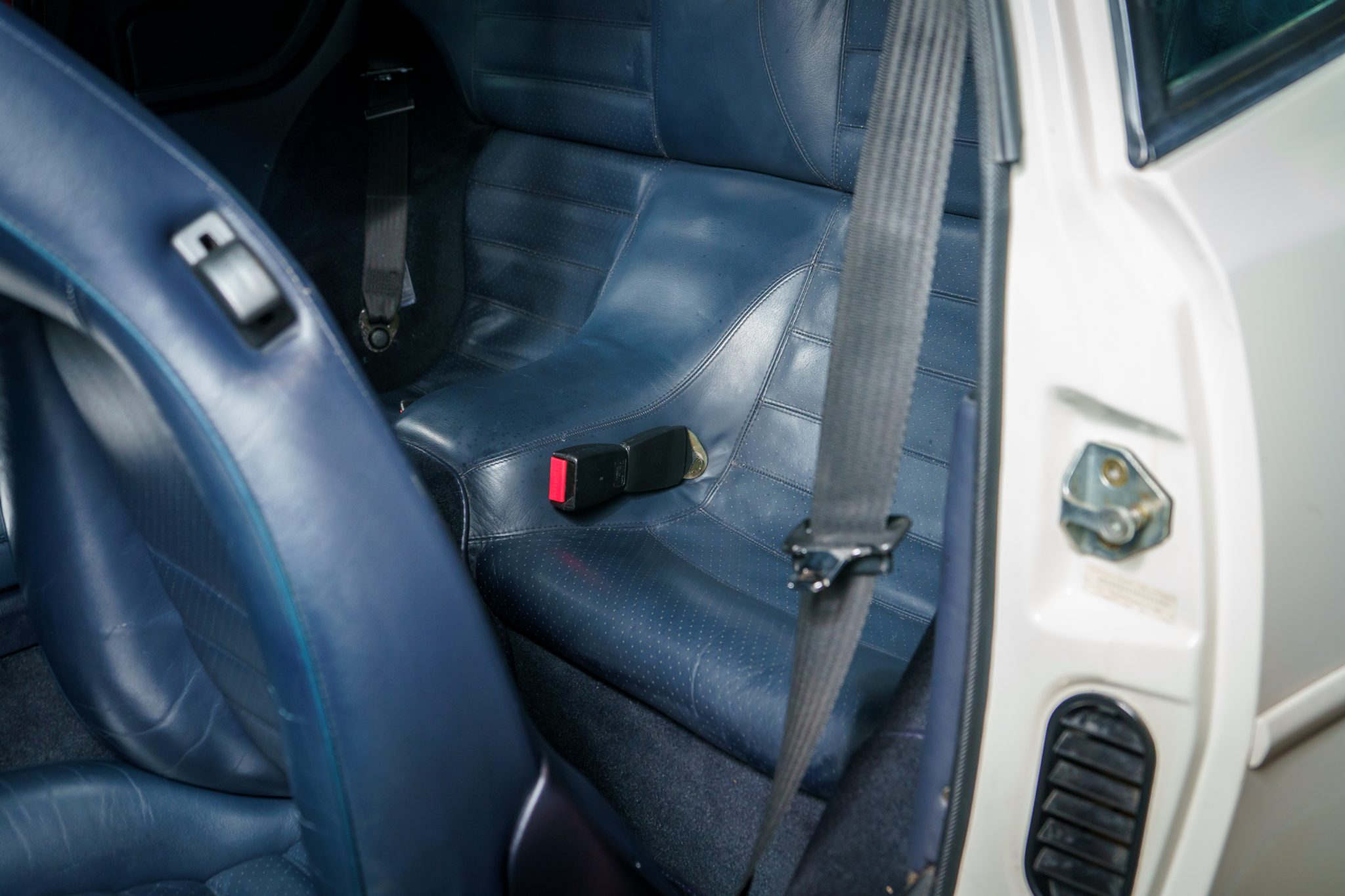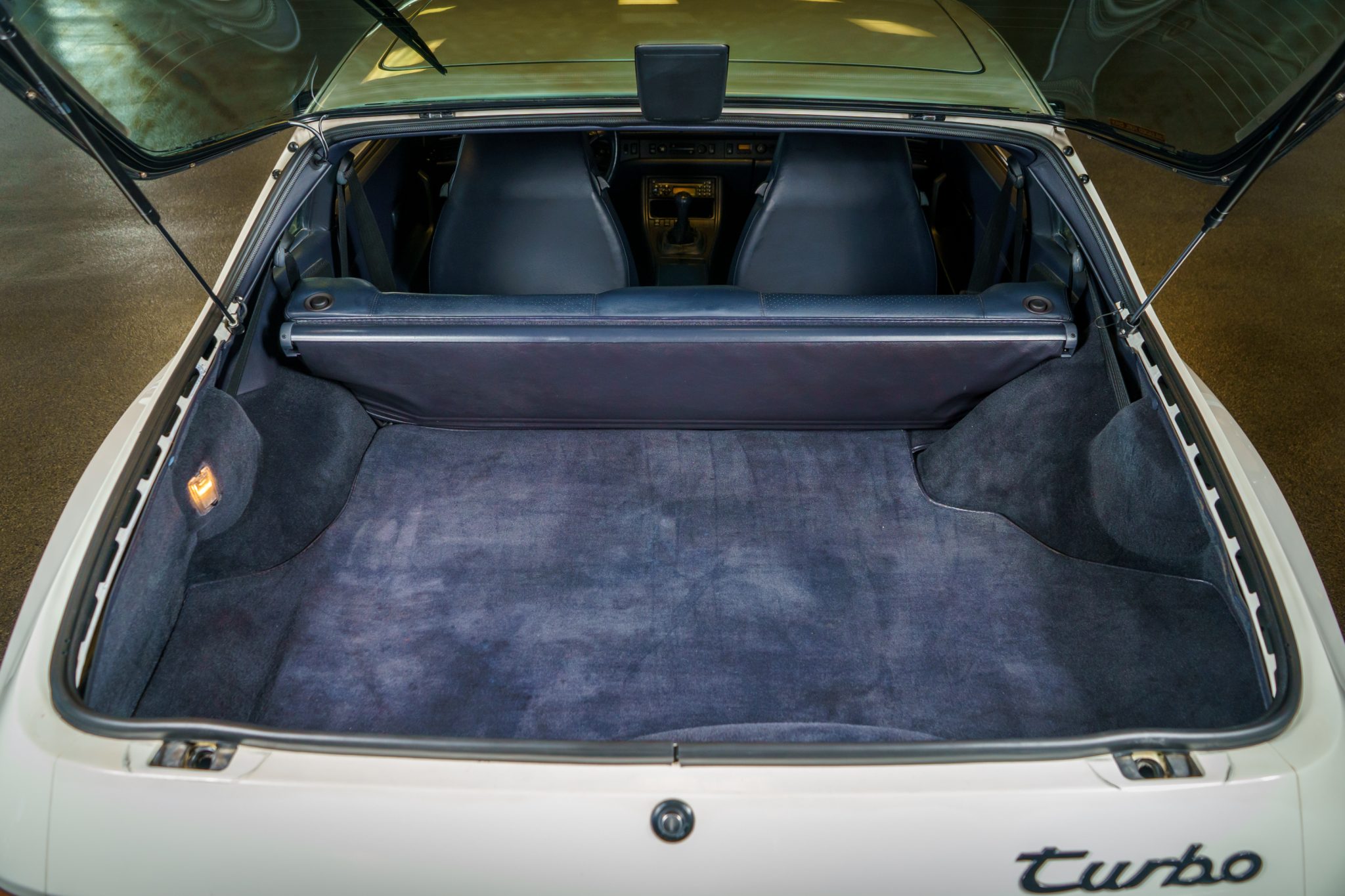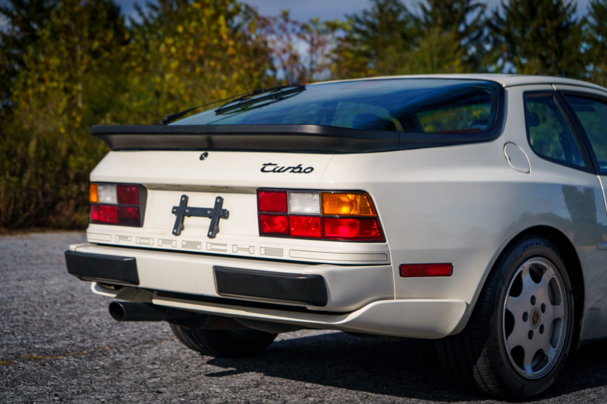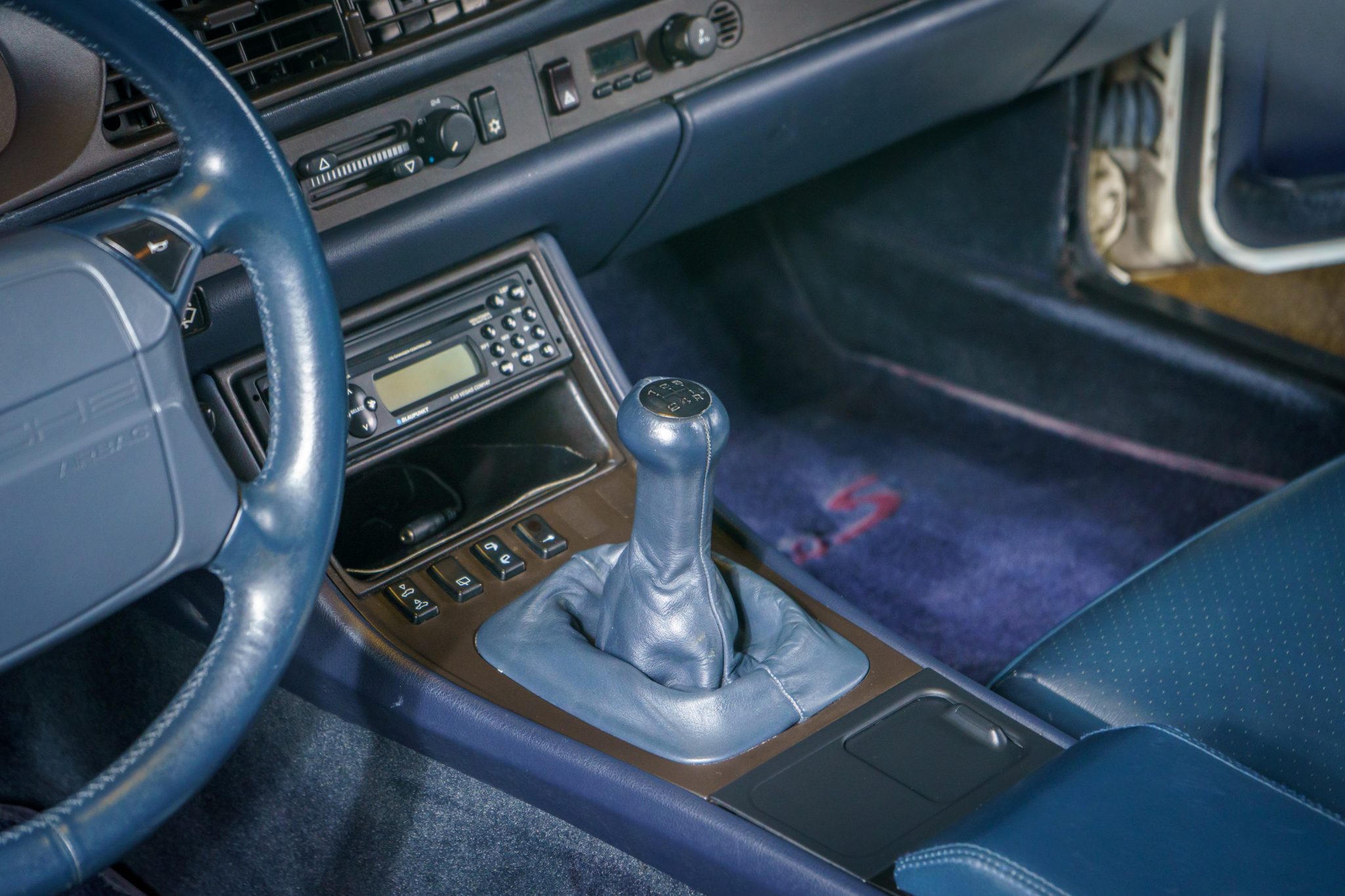 This 1989 Porsche 944 Turbo is powered by a turbocharged 2.5-liter inline-four paired with a five-speed manual transaxle and is finished in Alpine White over Marine Blue leather upholstery. Showing 61k miles, the car is equipped with 16″ Club Sport alloy wheels, a limited-slip differential, pop-up headlights, fog lights, power-adjustable front seats, a sunroof, a Blaupunkt CD stereo, cruise control, and air conditioning.
