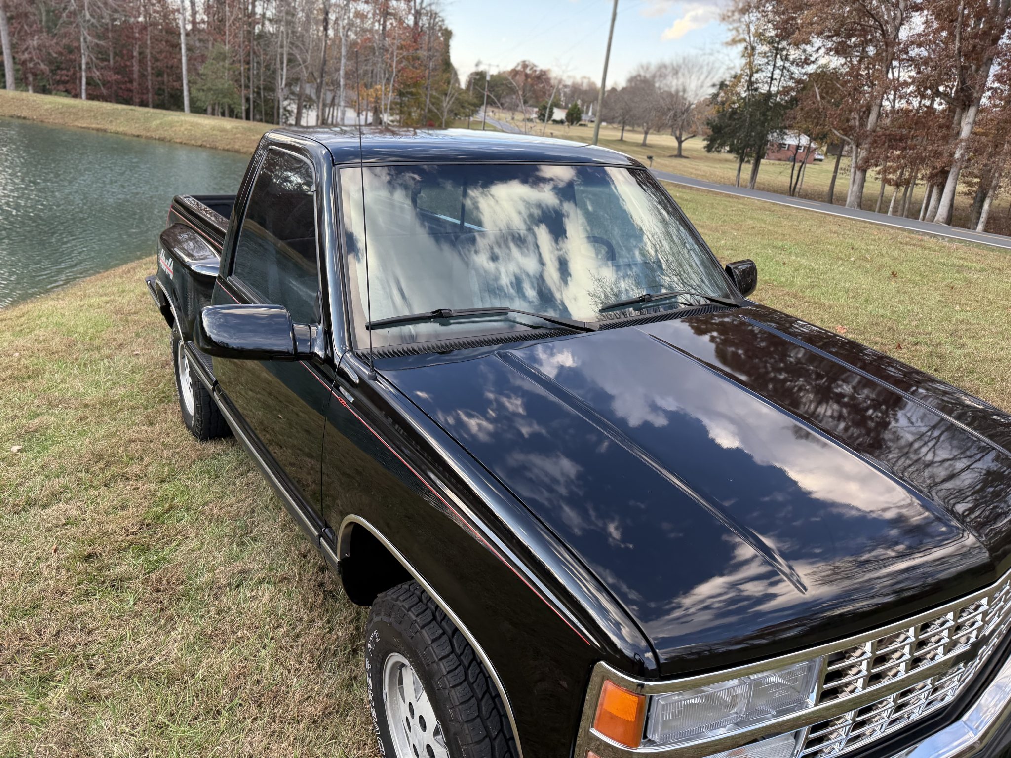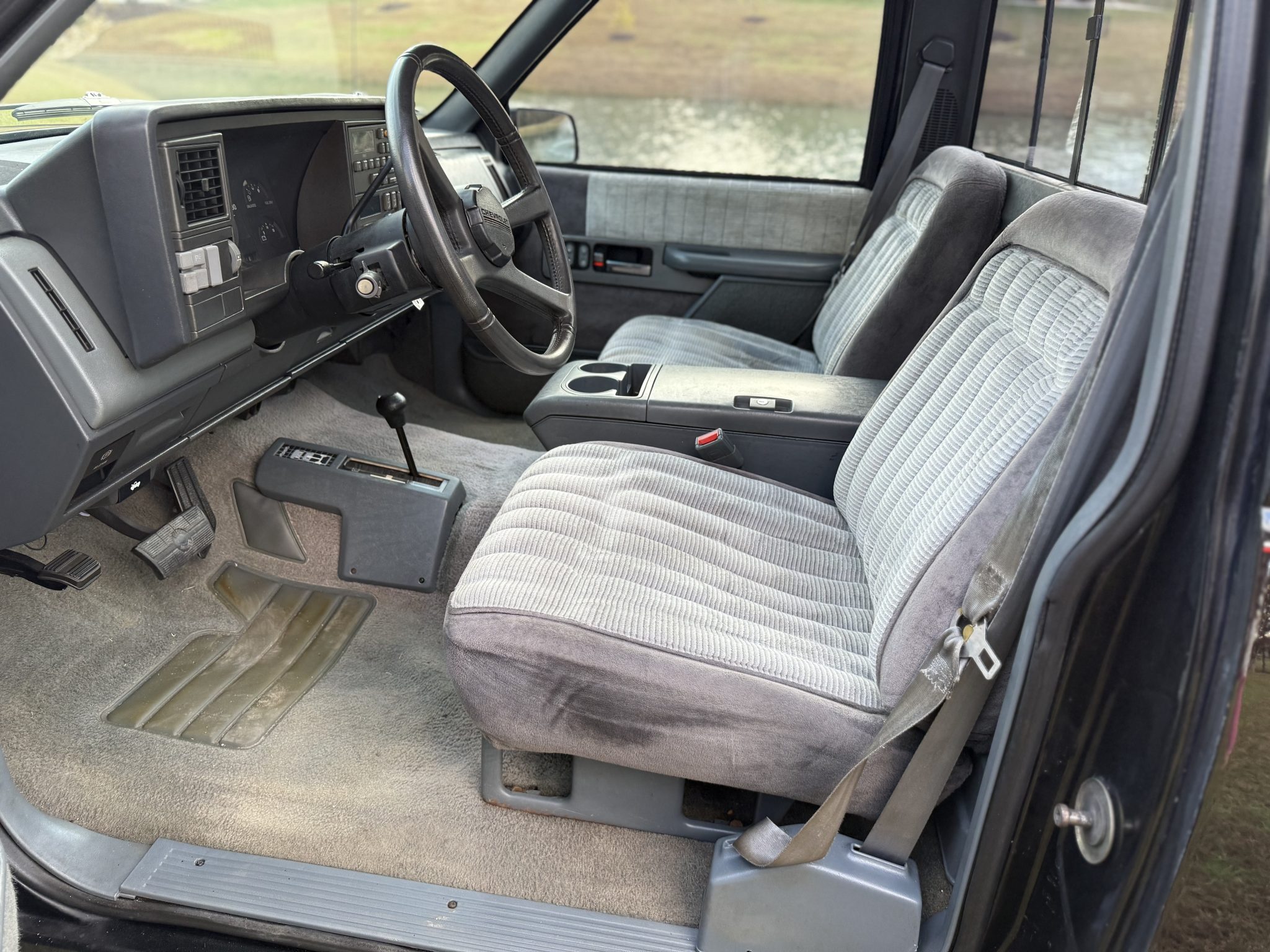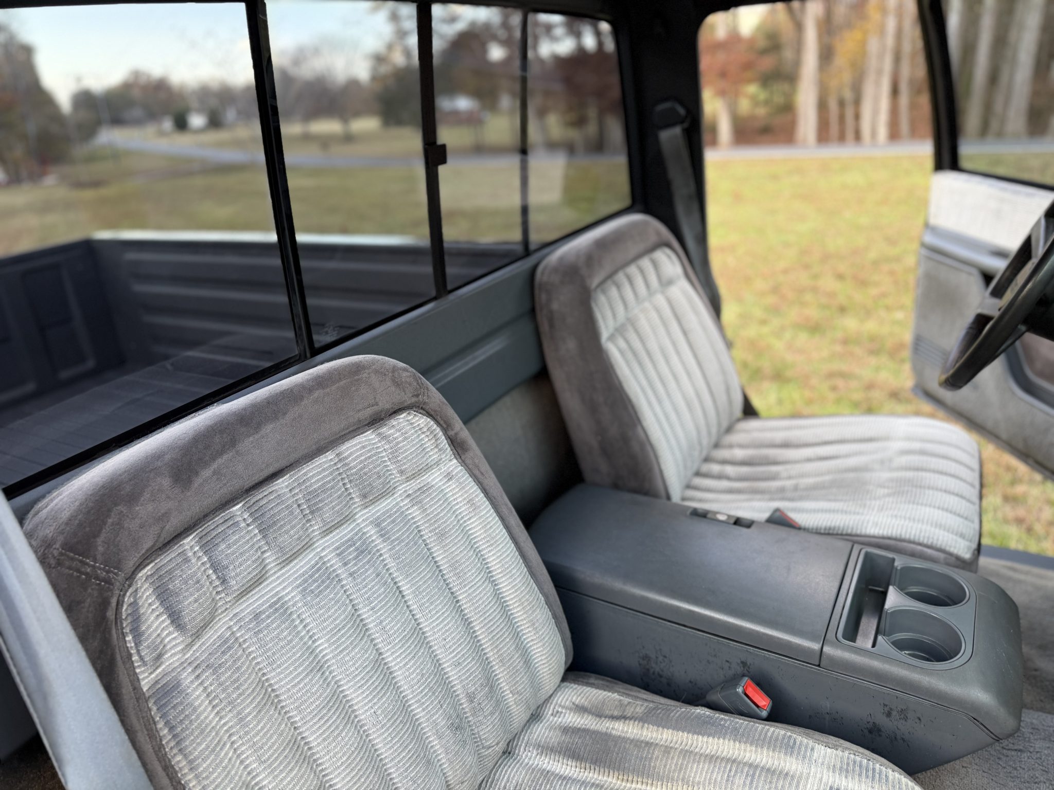 This 1990 Chevrolet K1500 Silverado 4×4 Sportside pickup has been refinished in Onyx Black over gray cloth. Powered by a 5.7-liter V8 linked with a four-speed automatic transmission, a dual-range transfer case, and a locking rear differential, the truck is equipped with 16″ six-spoke alloy wheels, air conditioning, cruise control, power windows, and a cassette stereo.