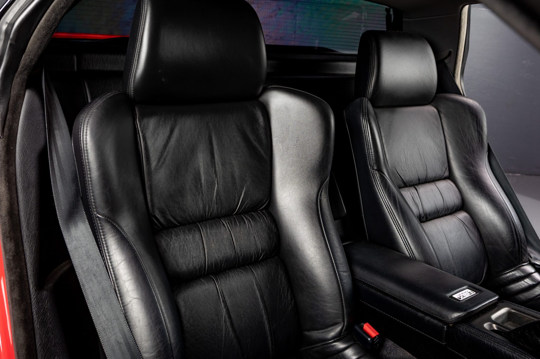 Powered by a 3.0-liter VTEC V6 paired with a five-speed manual transaxle, the car is finished in Formula Red over black leather upholstery. Equipment includes staggered-diameter 15″ and 16″ forged wheels, a limited-slip differential, a black roof panel, pop-up headlights, power-adjustable seats, automatic climate control, cruise control, and a Bose sound system