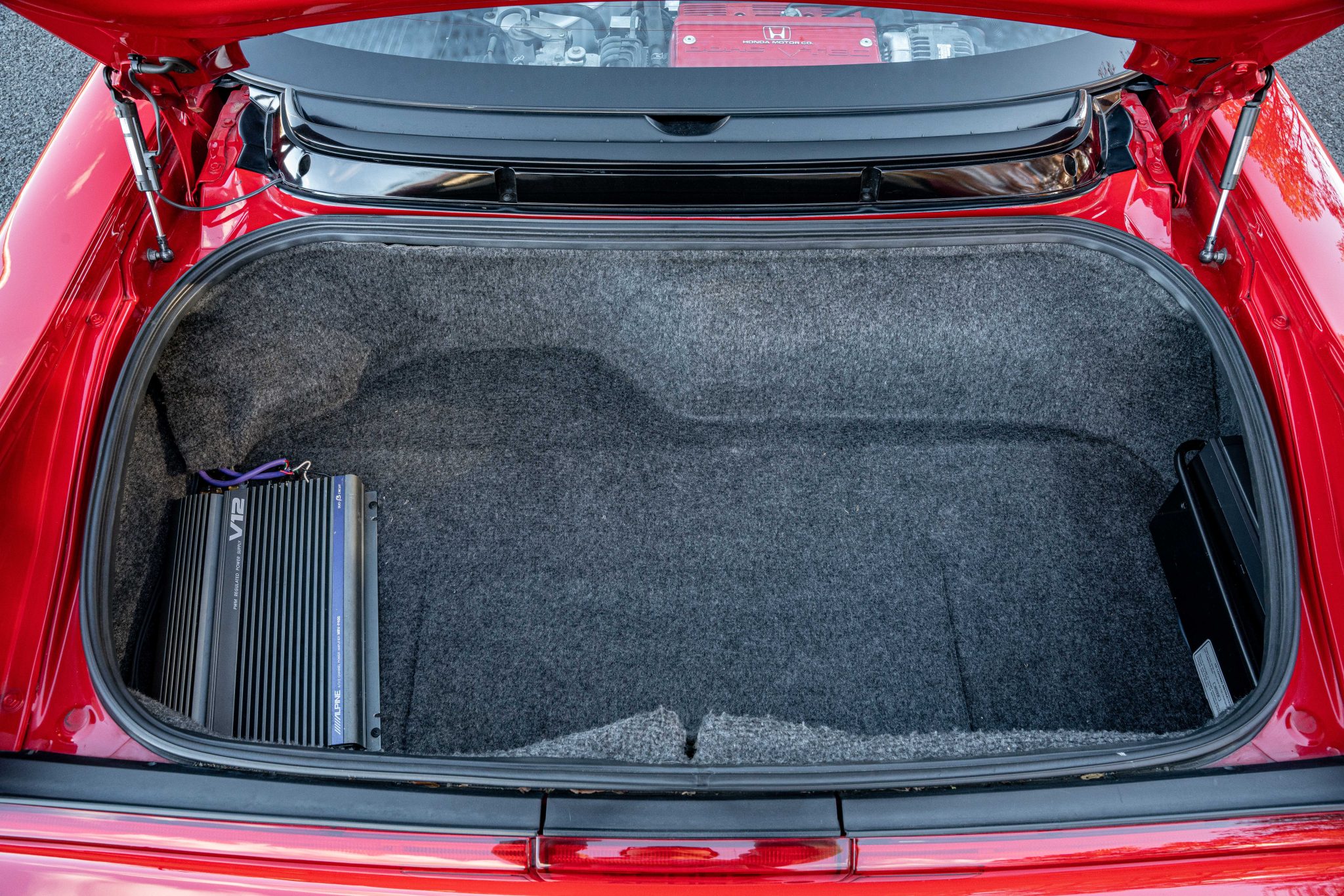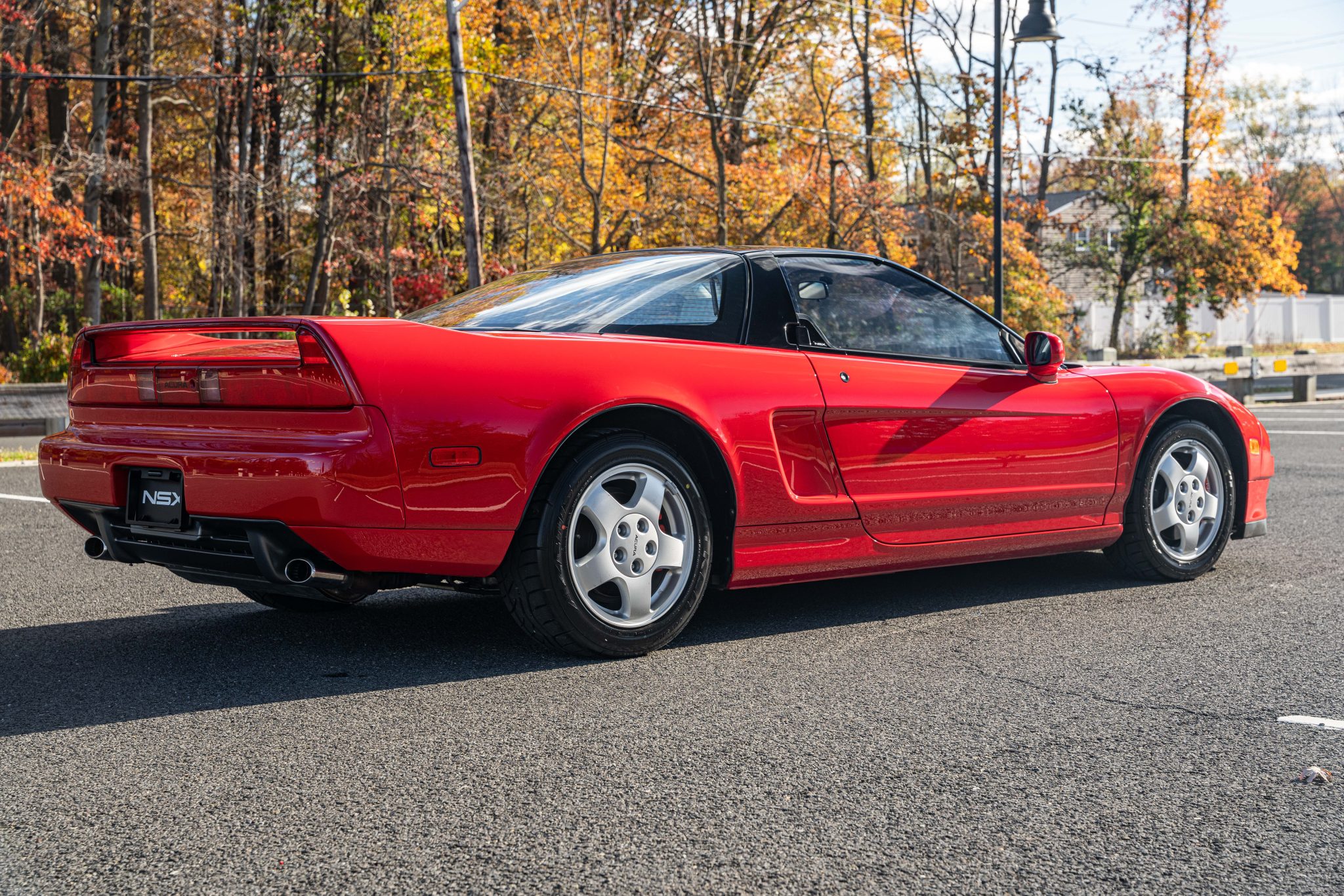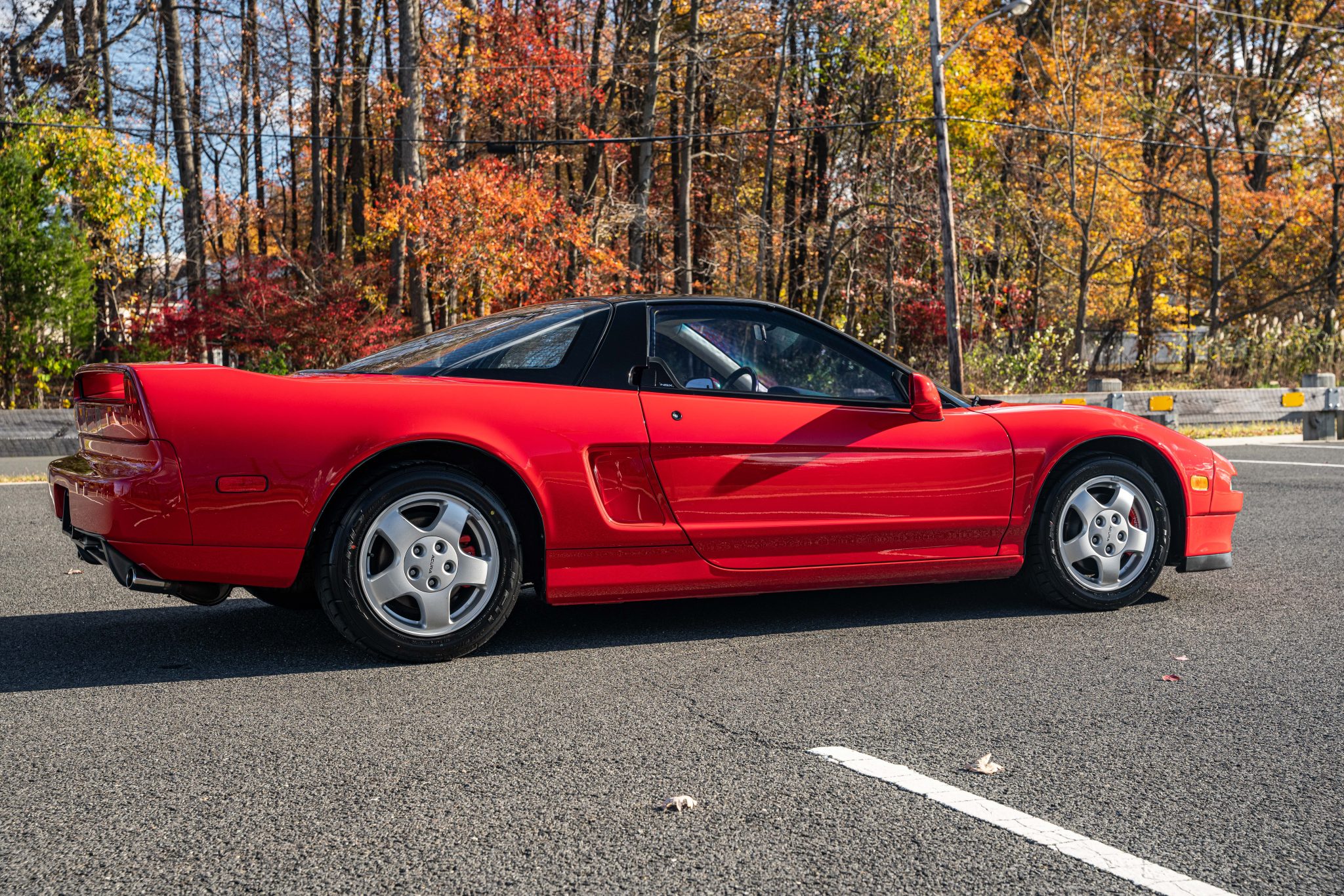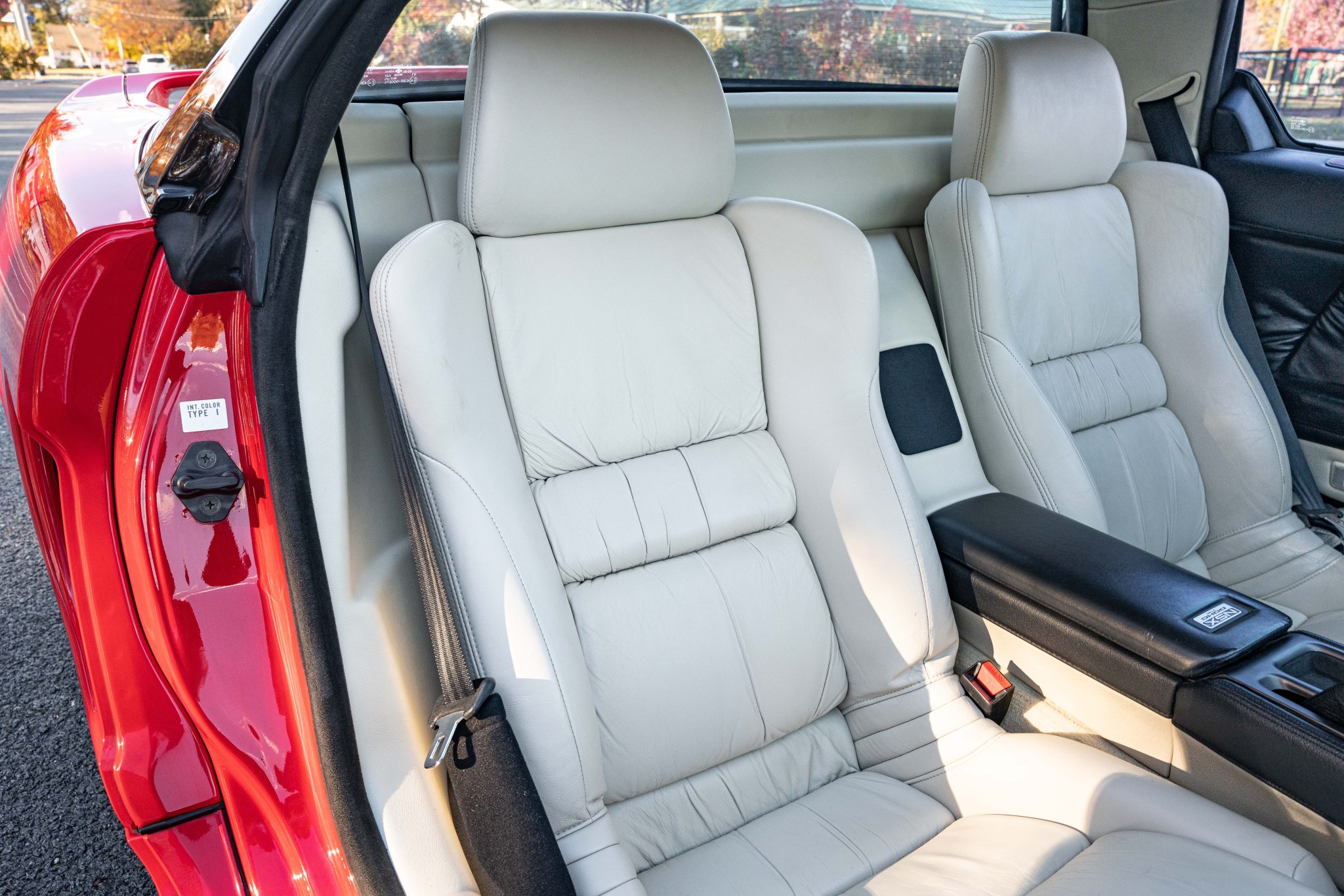 This 1991 Acura NSX is finished in Formula Red over Ivory leather, and service following the selling dealer’s acquisition in 2025 included mounting Falken tires and replacing the timing belt, rear main seal, clutch components, spark plugs, and coolant expansion tank. Power is provided by a 3.0-liter VTEC V6 mated to a five-speed manual transaxle and a limited-slip differential. The car also has 15″ and 16″ forged wheels, tubular headers, a black roof panel, pop-up headlights, power-adjustable seats, cruise control, and a cassette stereo linked to an Alpine amplifier and MB Quart speakers.