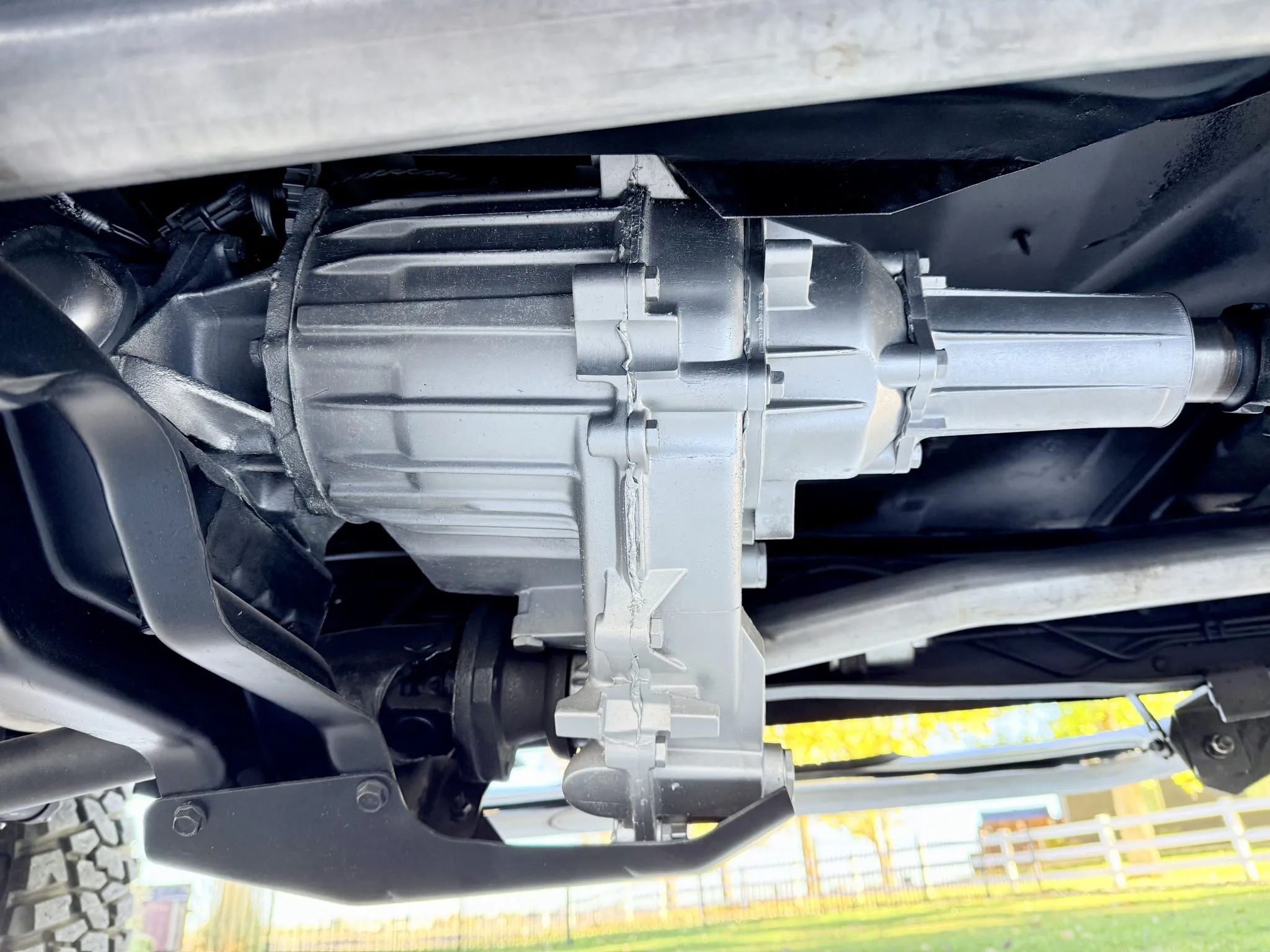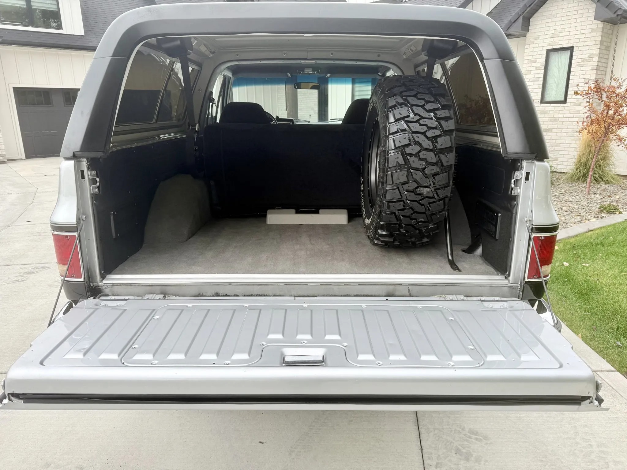 replacing the carpeting, window regulators, and rubber door seals, and installing Dynamat sound insulation, a four-inch suspension lift kit, a retro-style digital stereo, Dick Cepek tires, and 17″ Raceline wheels with Dick Cepek Extreme Country tires. The truck is finished in black and silver over black cloth upholstery and it is powered by a 5.7-liter V8 linked with a four-speed automatic transmission and a dual-range transfer case. Additional equipment includes a removable hardtop, a powered rear window, a rear bench, air conditioning, cruise control, automatically locking front hubs, side steps, a dual exhaust system, and power windows and door locks.