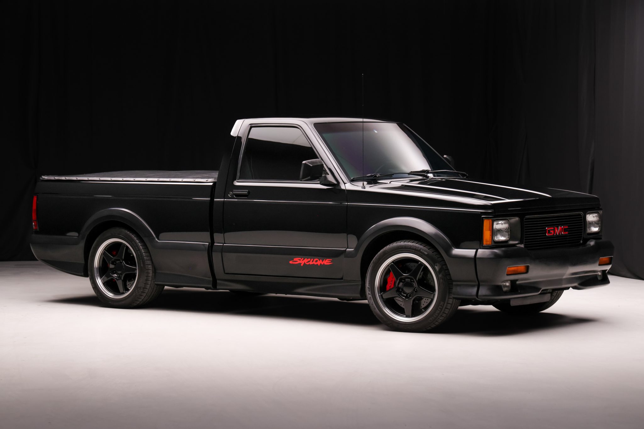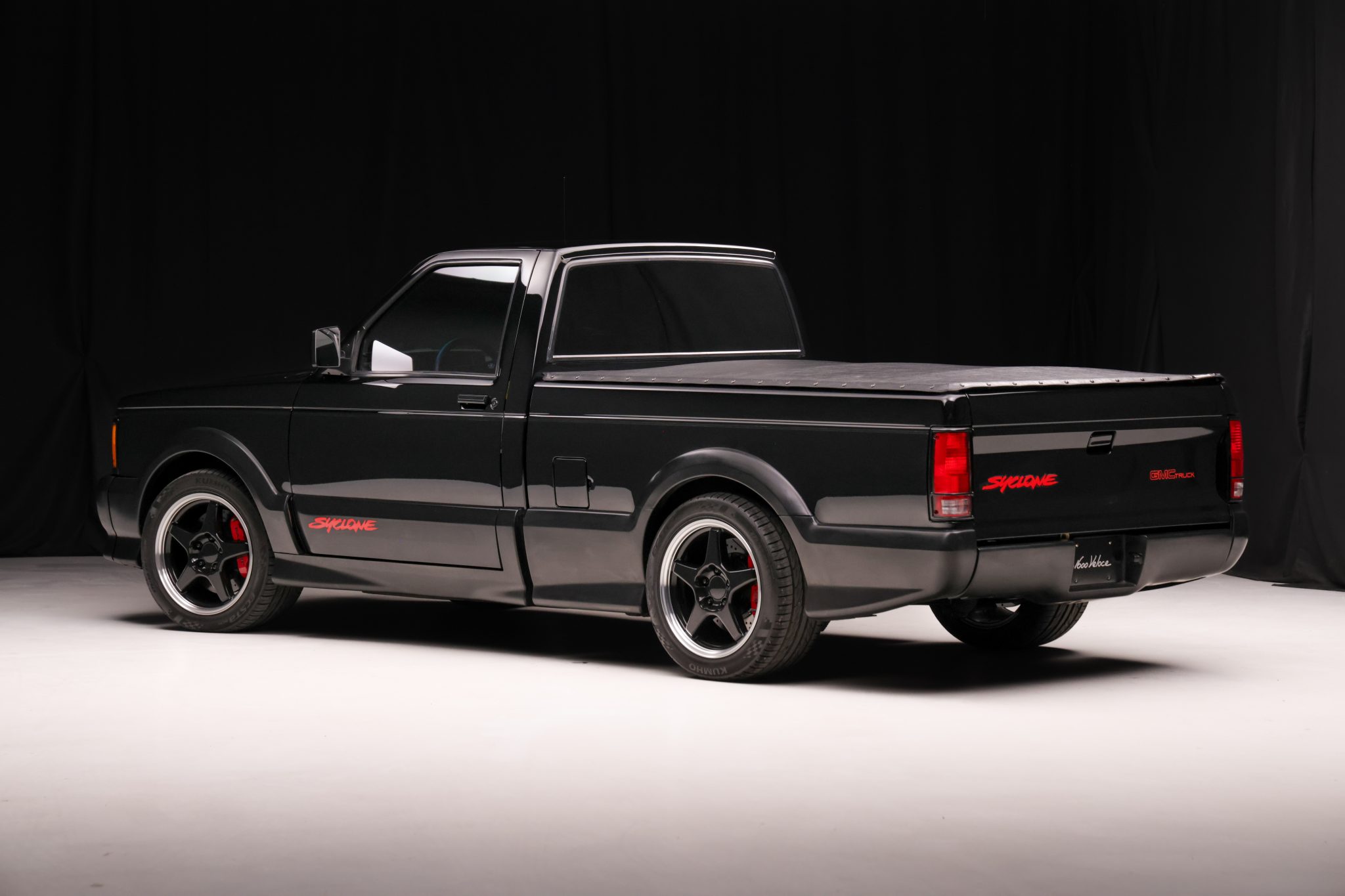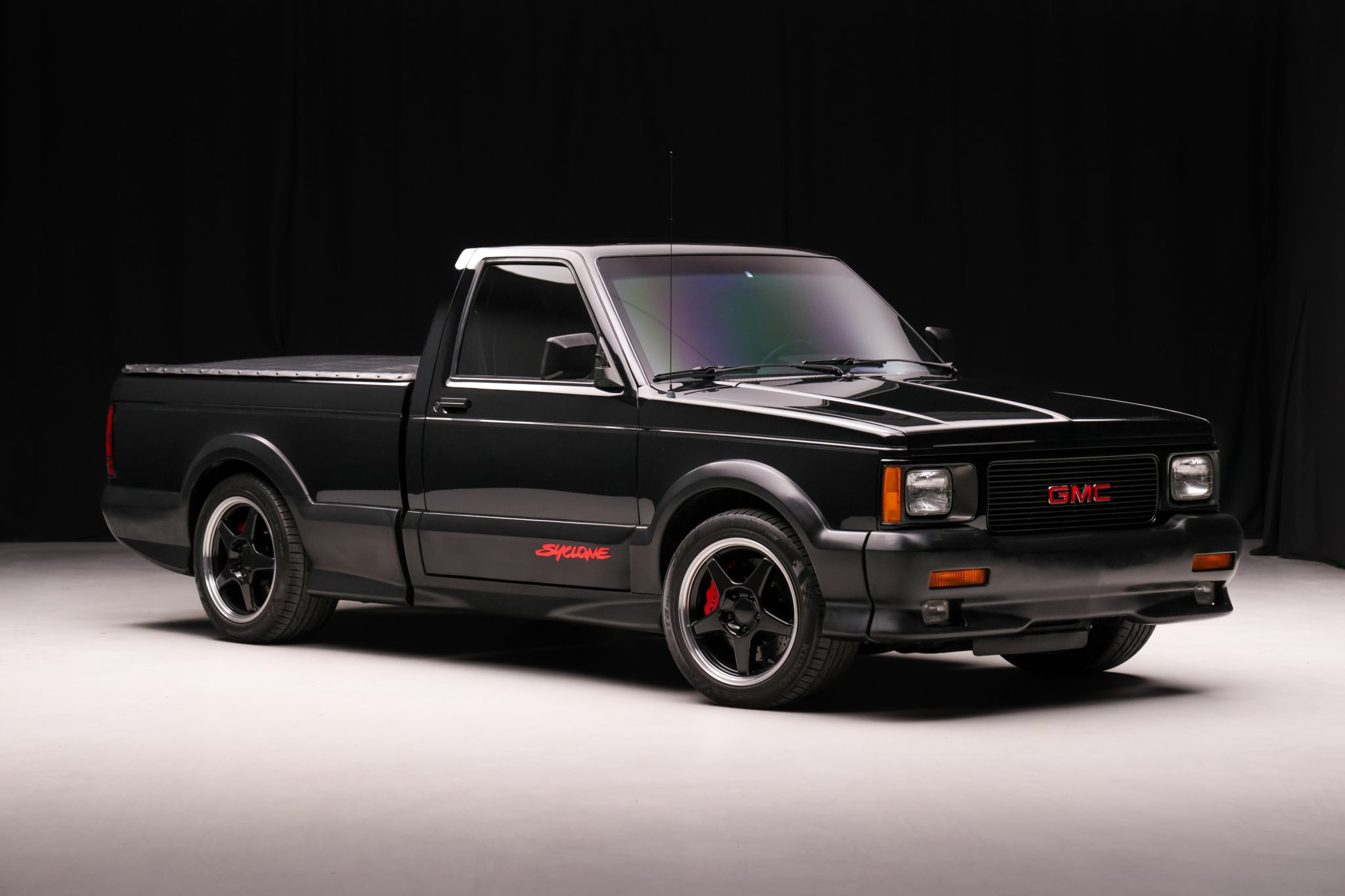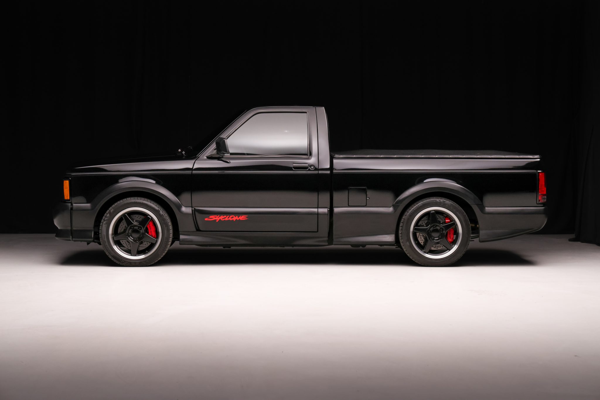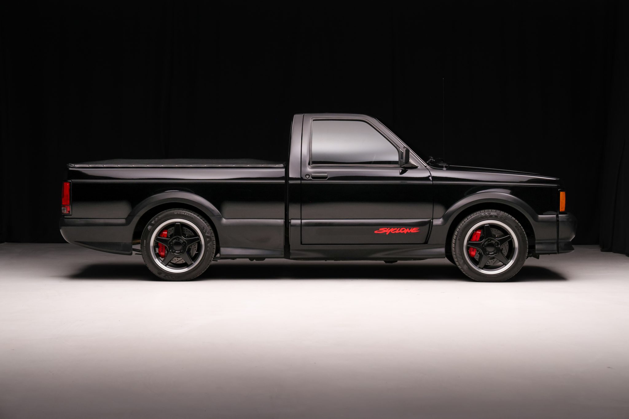 Finished in black over black velour, the truck is powered by a turbocharged 4.3-liter V6 linked with a four-speed automatic transmission, a BorgWarner transfer case, and a limited-slip rear differential. Equipment includes a vinyl tonneau cover, Bilstein shocks, Baer four-wheel disc brakes, 17″ Corvette Grand Sport wheels, air conditioning, cruise control, and a Pioneer Bluetooth stereo.
