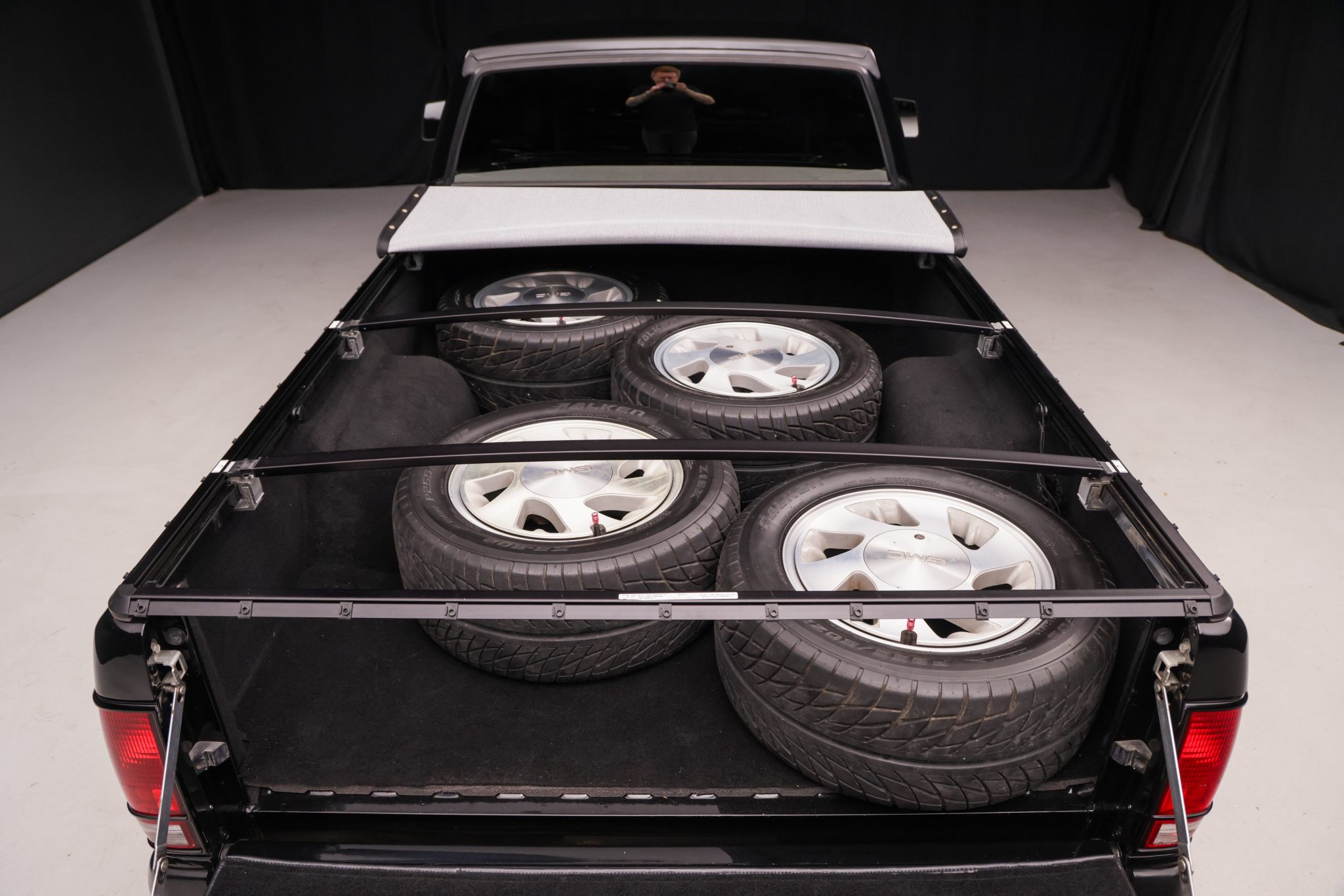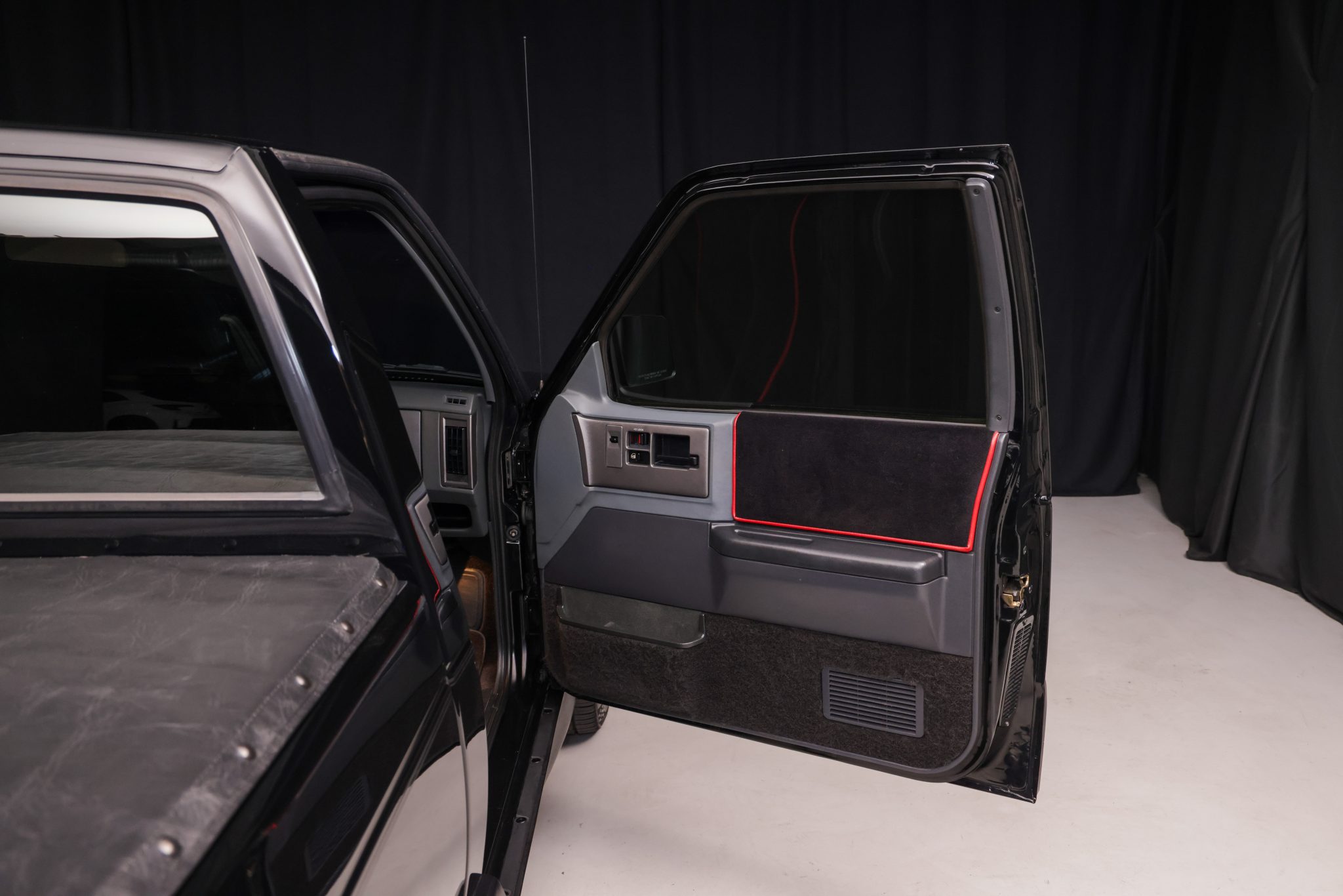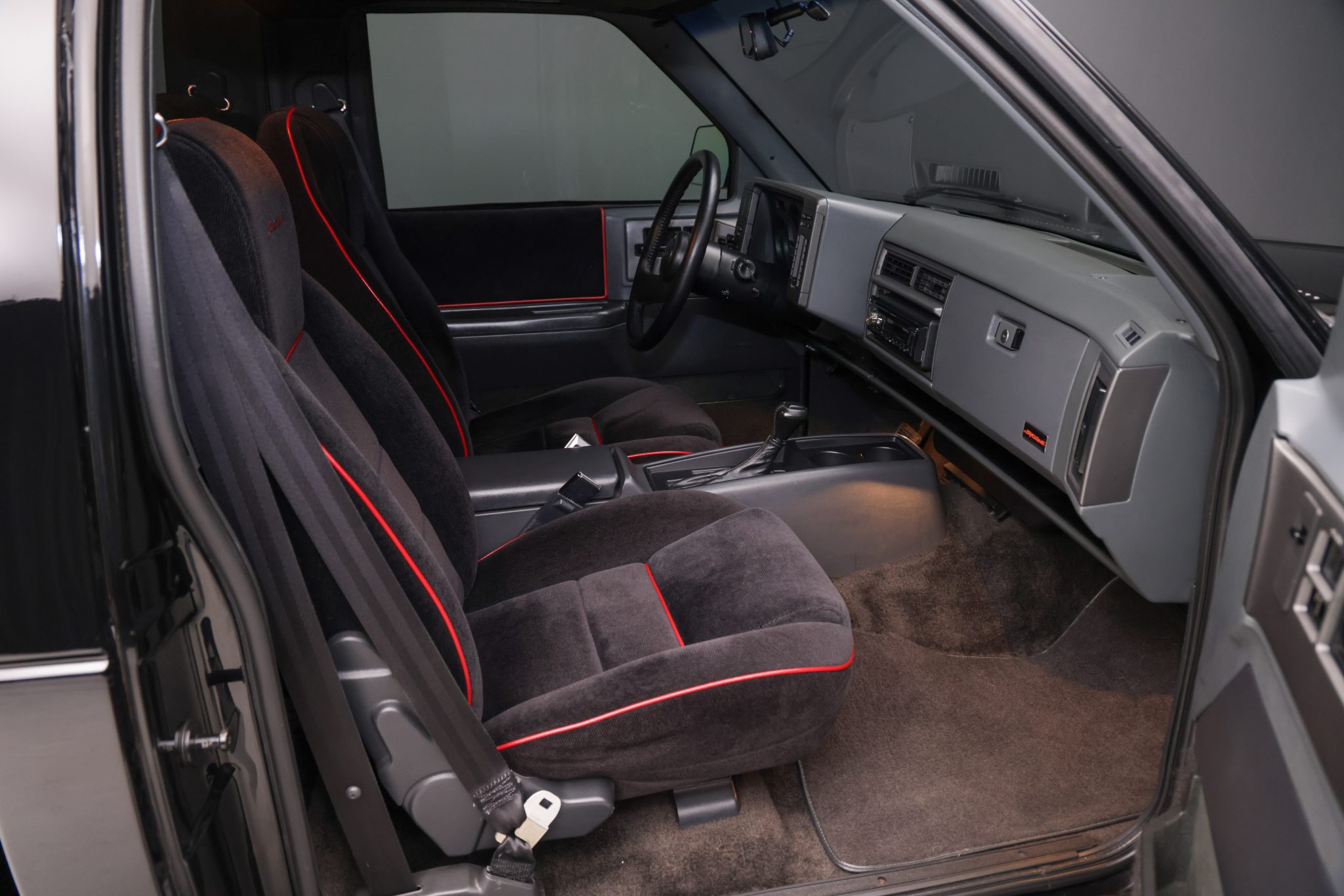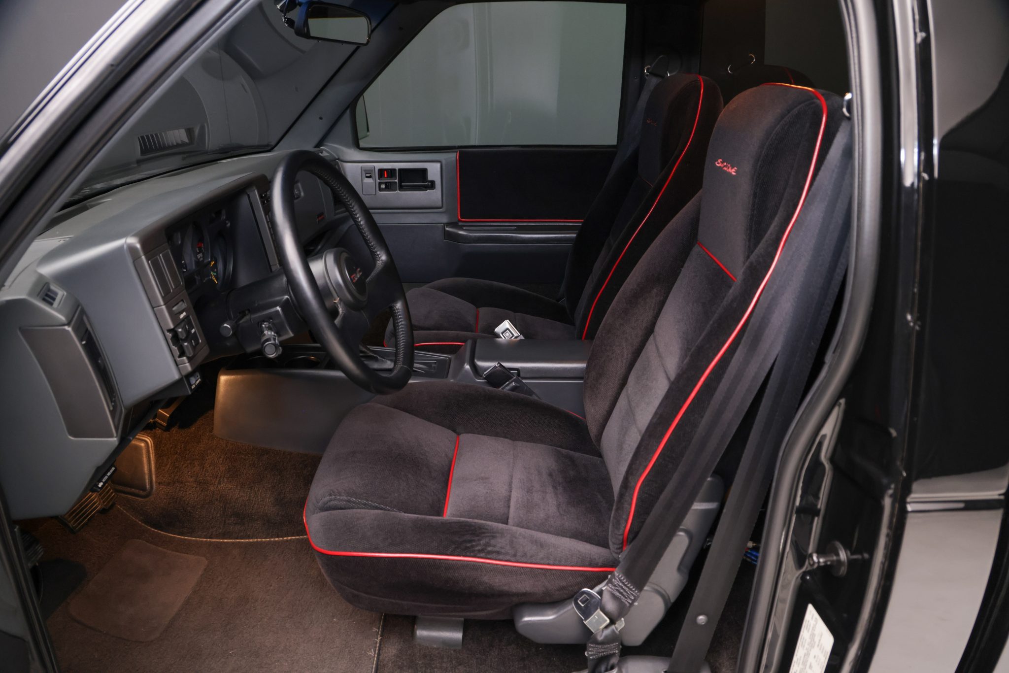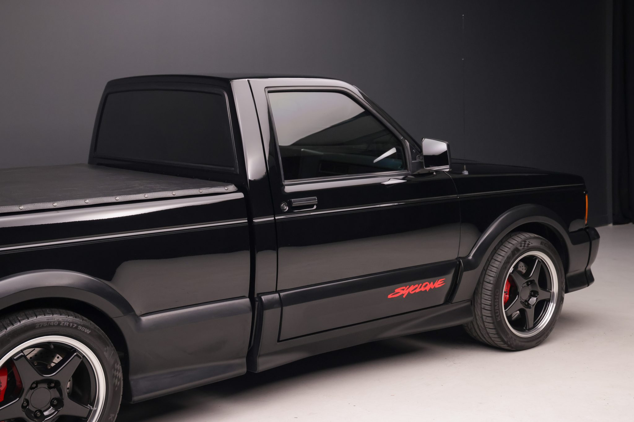 Finished in black over black velour, the truck is powered by a turbocharged 4.3-liter V6 linked with a four-speed automatic transmission, a BorgWarner transfer case, and a limited-slip rear differential. Equipment includes a vinyl tonneau cover, Bilstein shocks, Baer four-wheel disc brakes, 17″ Corvette Grand Sport wheels, air conditioning, cruise control, and a Pioneer Bluetooth stereo.