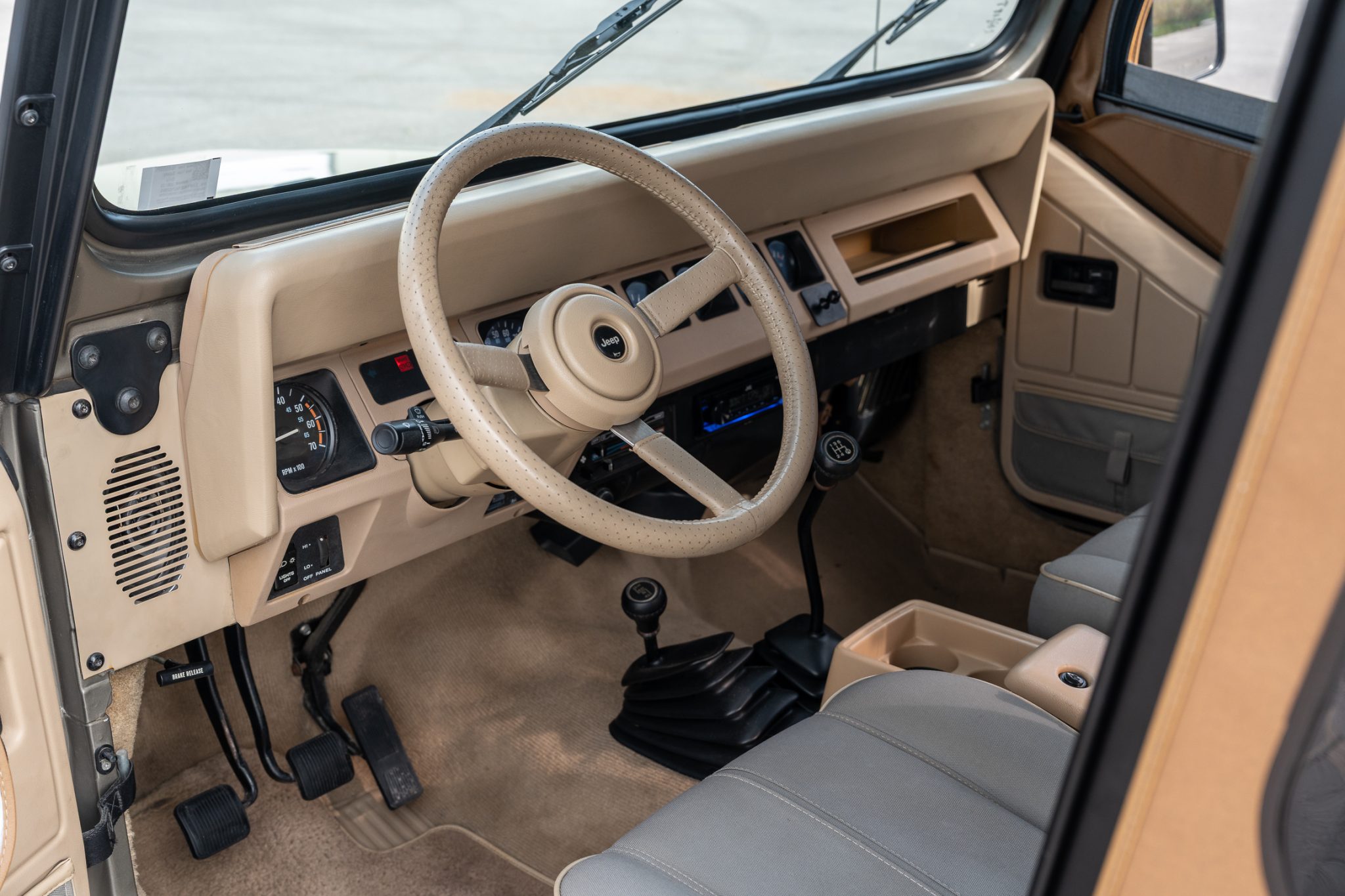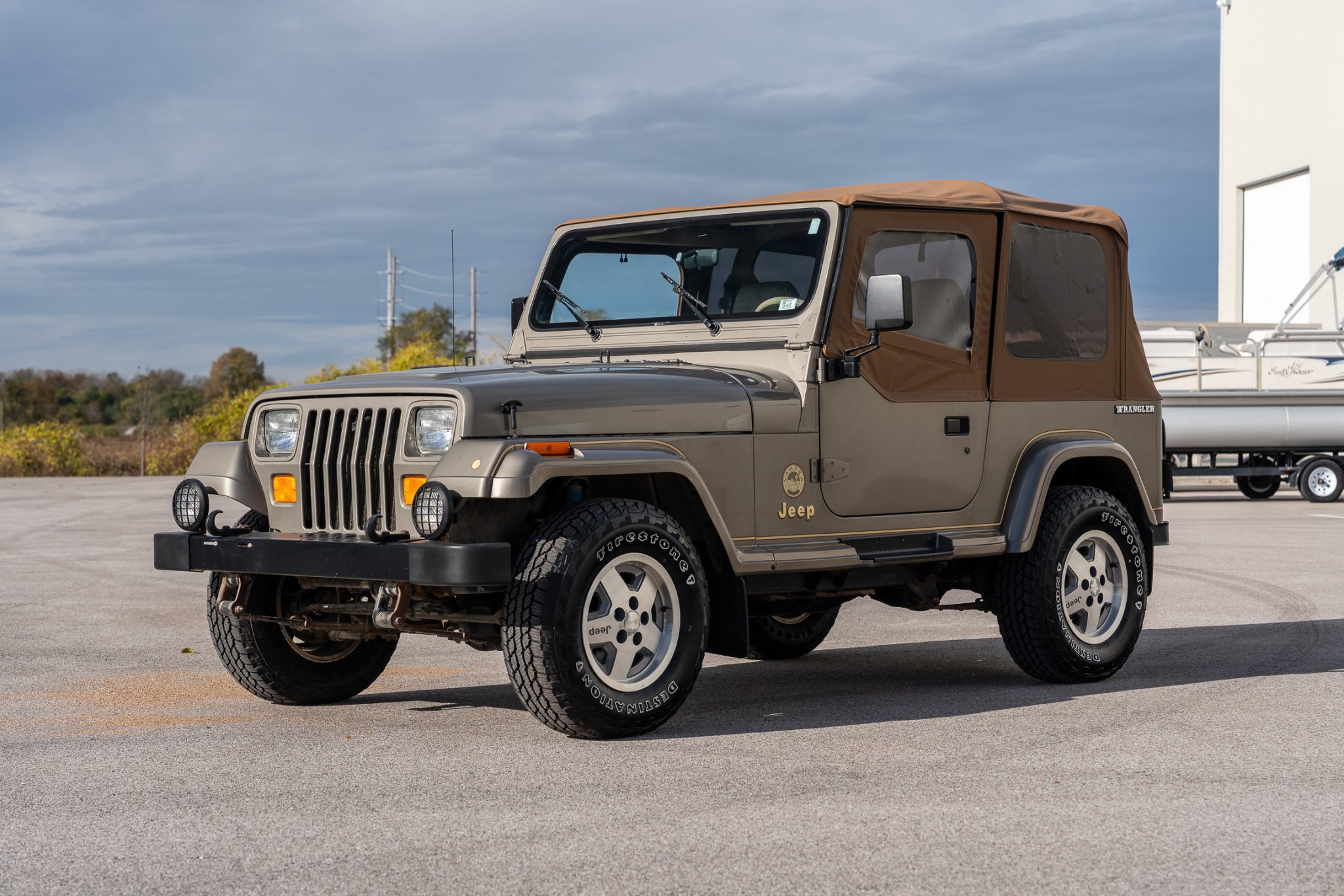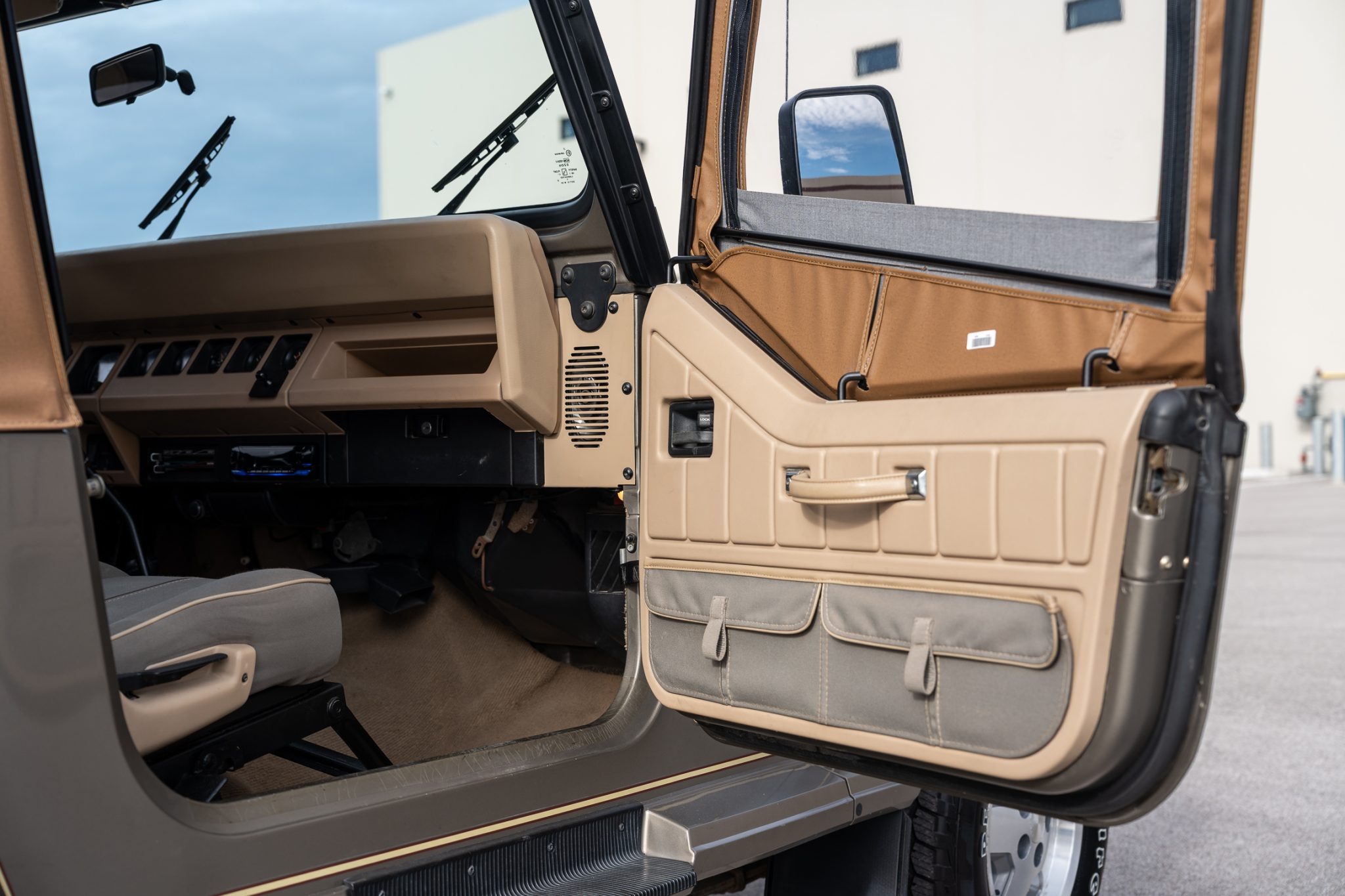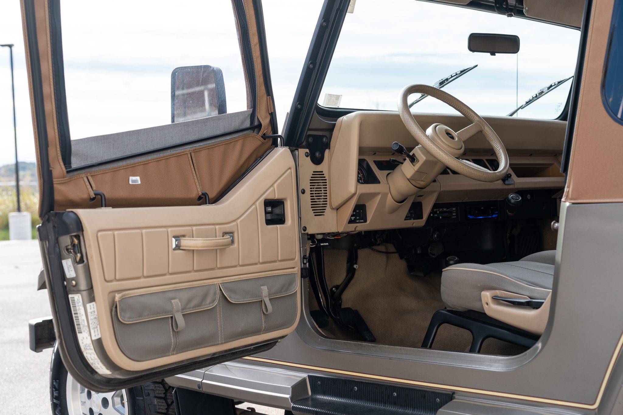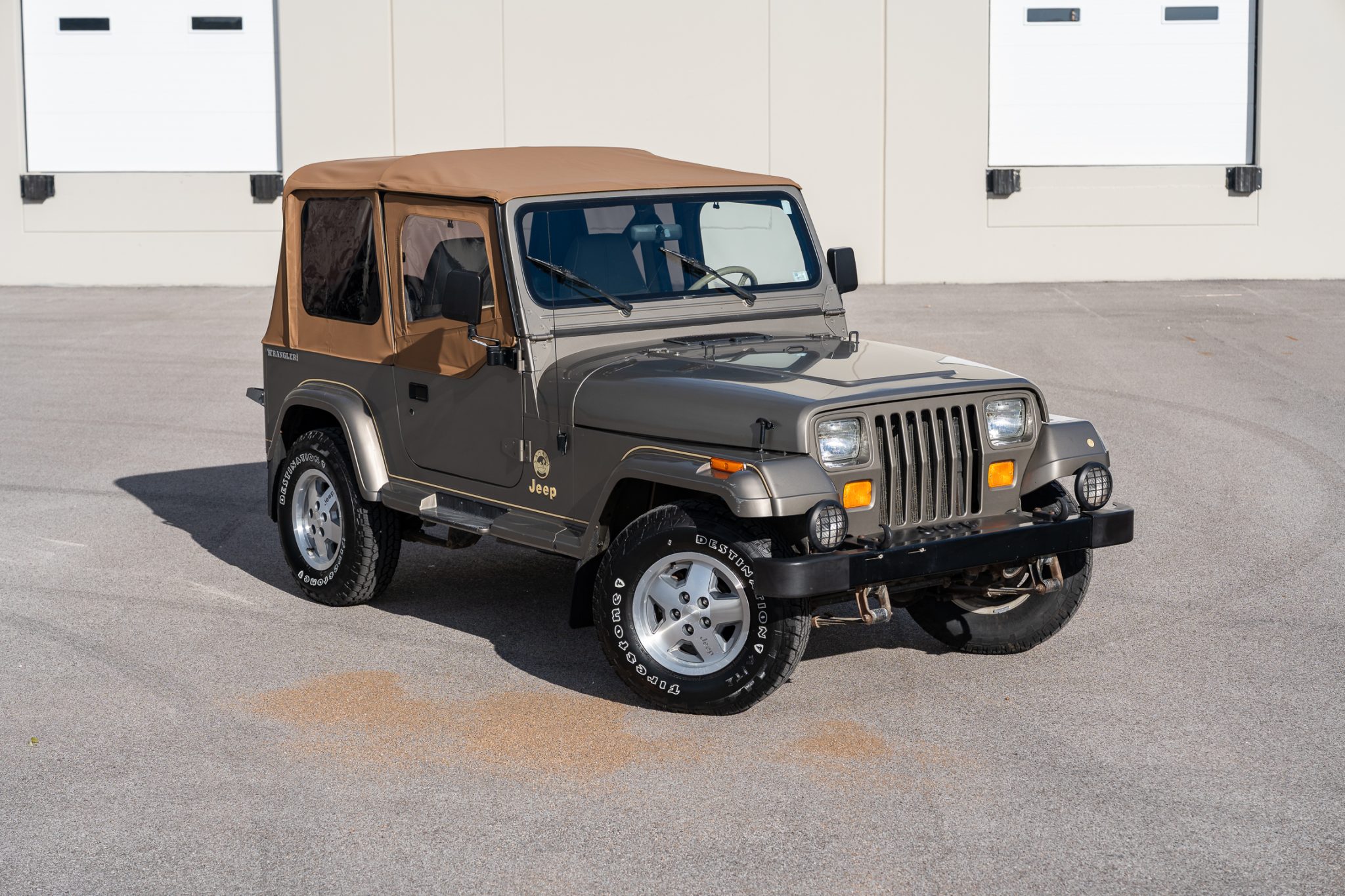 The truck is finished in Khaki Metallic over green cloth and is powered by a 4.0-liter inline-six linked with a five-speed manual transmission and a dual-range transfer case. Equipment includes a Bestop soft top, 15″ five-spoke alloy wheels, power steering, Sahara fender graphics, fog lights, a receiver hitch, rear bumperettes, a roll bar, a folding rear bench, and a JVC sound system.