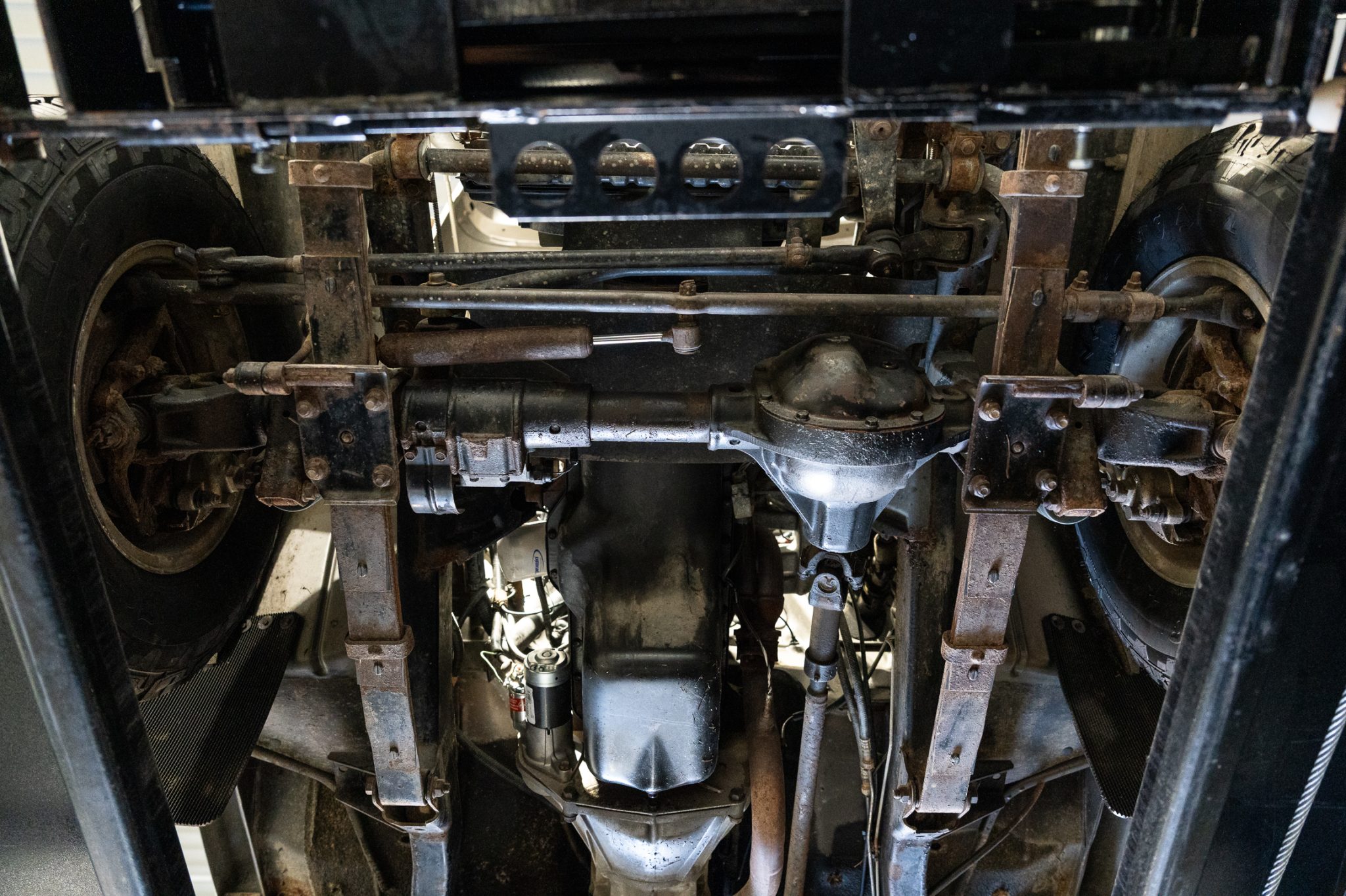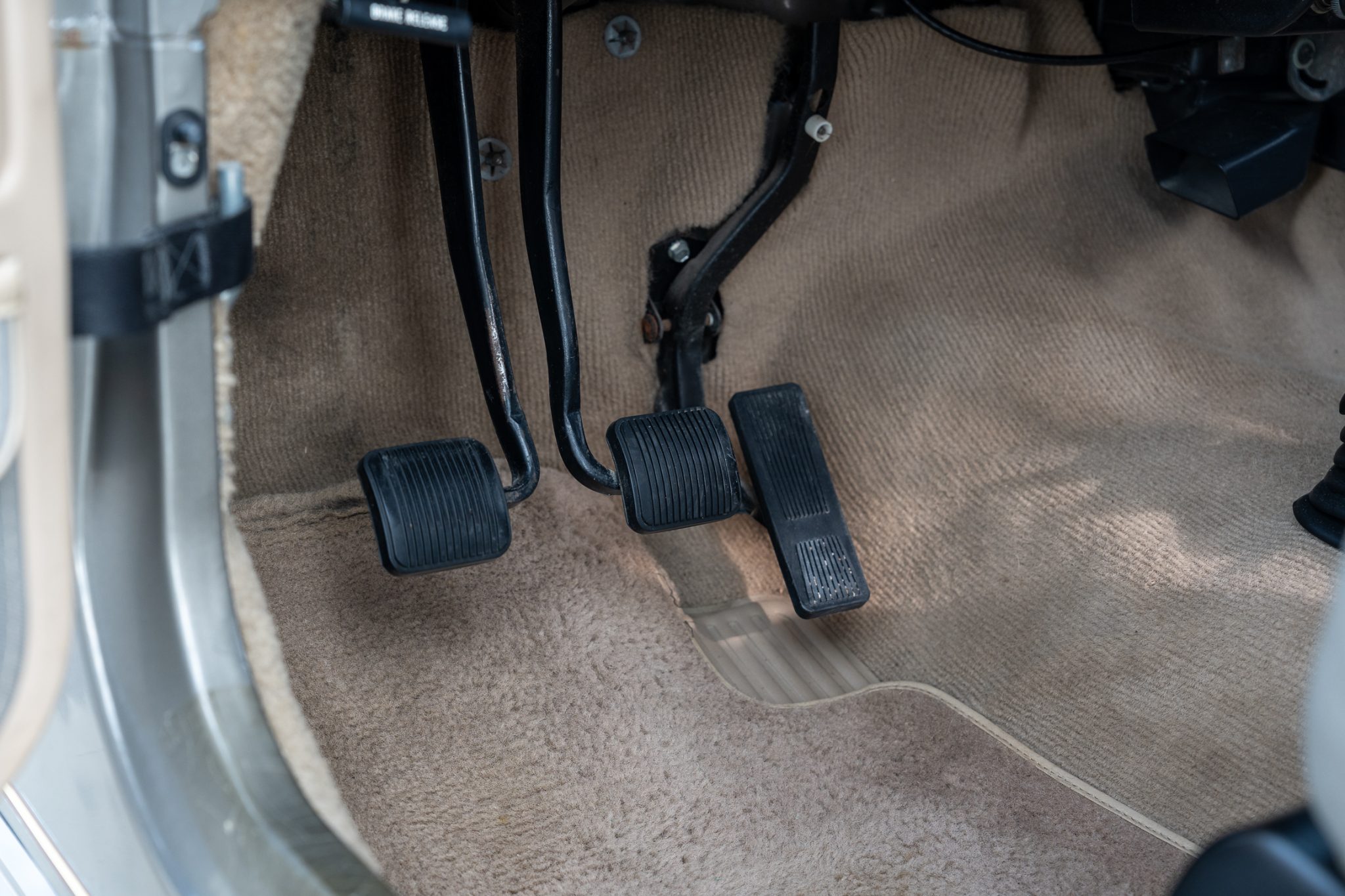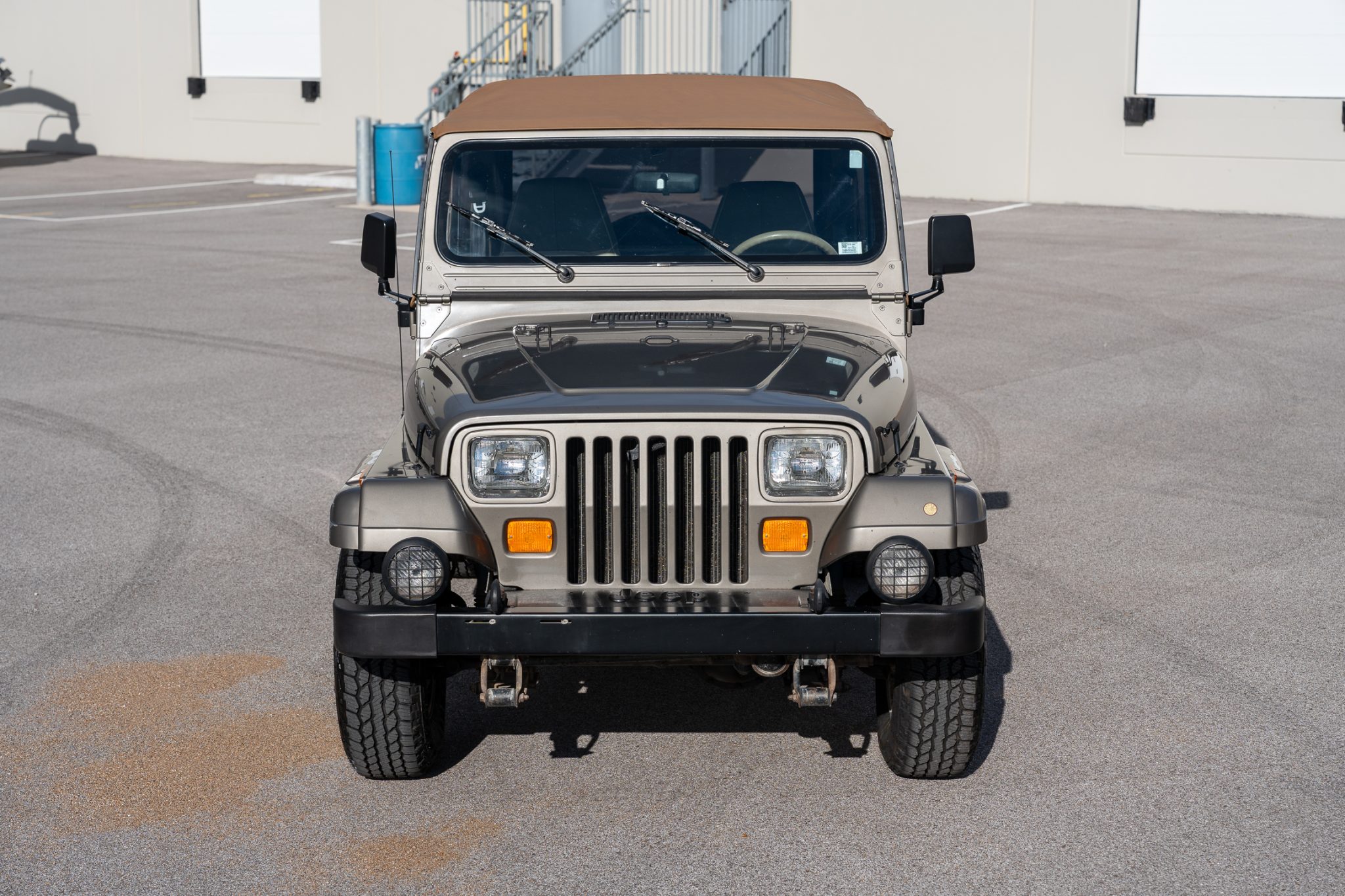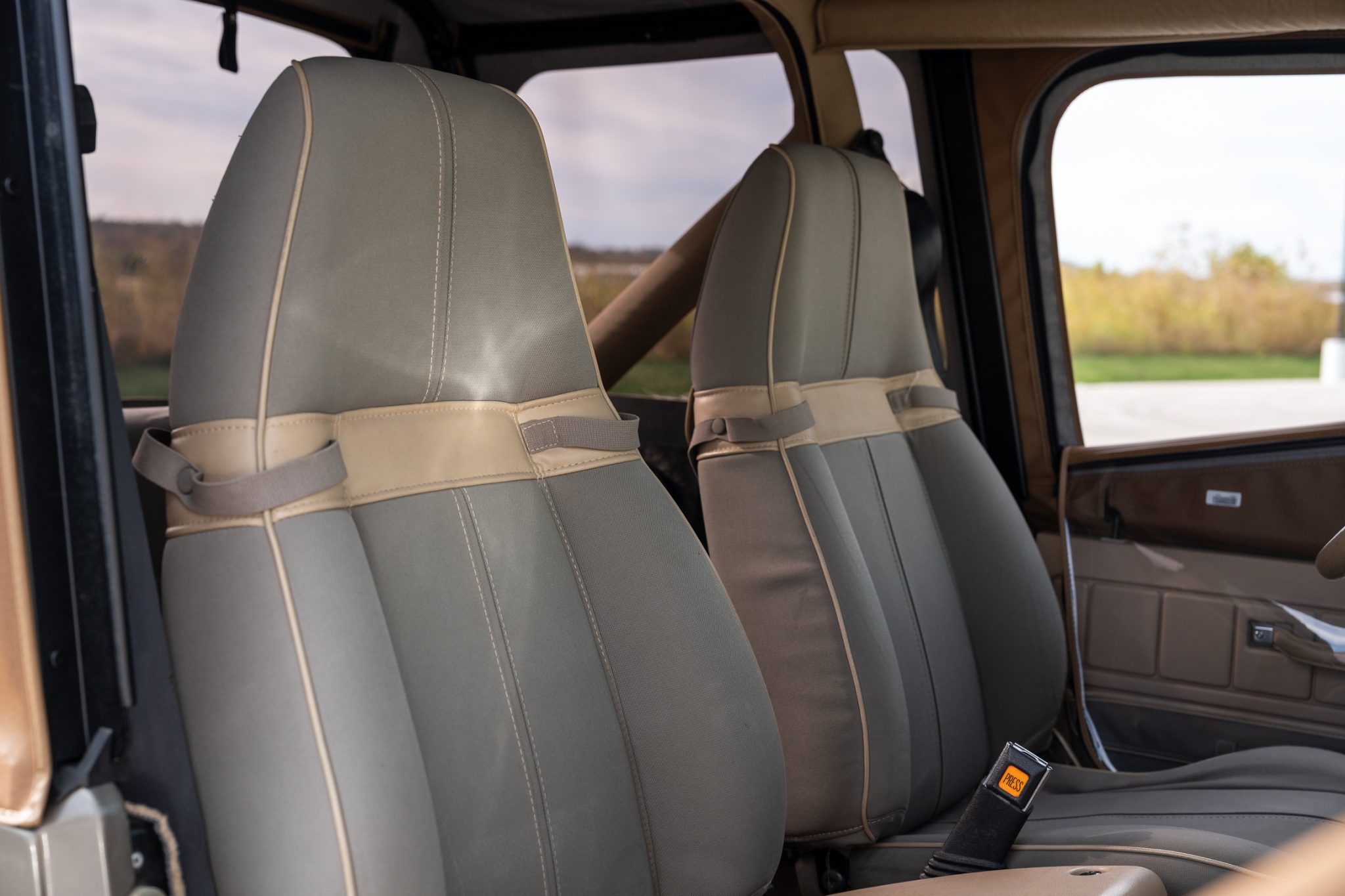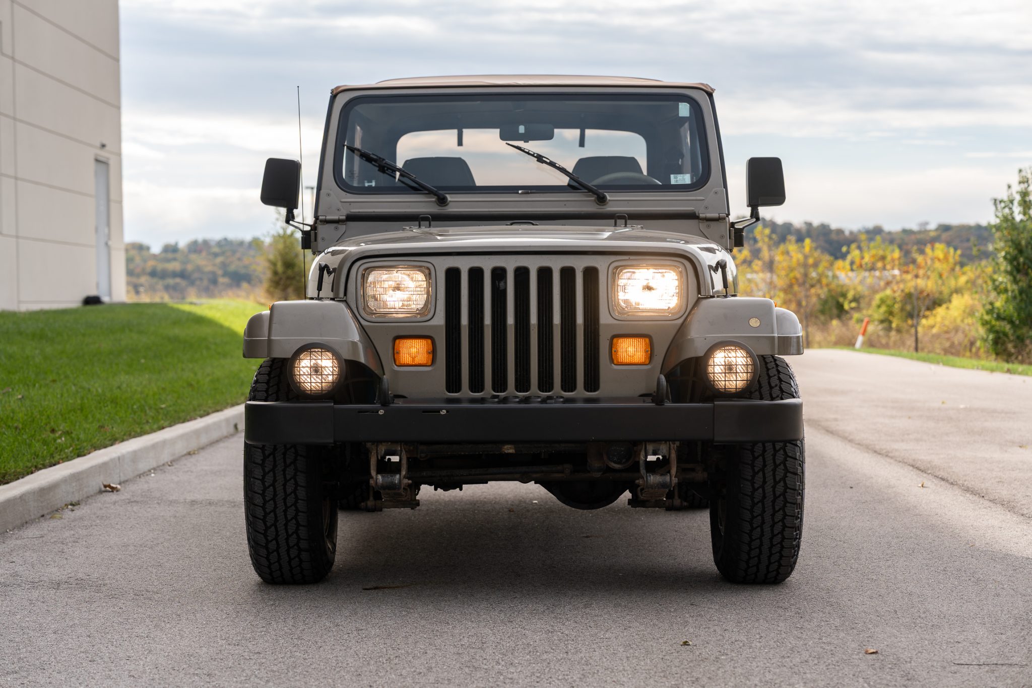 The truck is finished in Khaki Metallic over green cloth and is powered by a 4.0-liter inline-six linked with a five-speed manual transmission and a dual-range transfer case. Equipment includes a Bestop soft top, 15″ five-spoke alloy wheels, power steering, Sahara fender graphics, fog lights, a receiver hitch, rear bumperettes, a roll bar, a folding rear bench, and a JVC sound system.