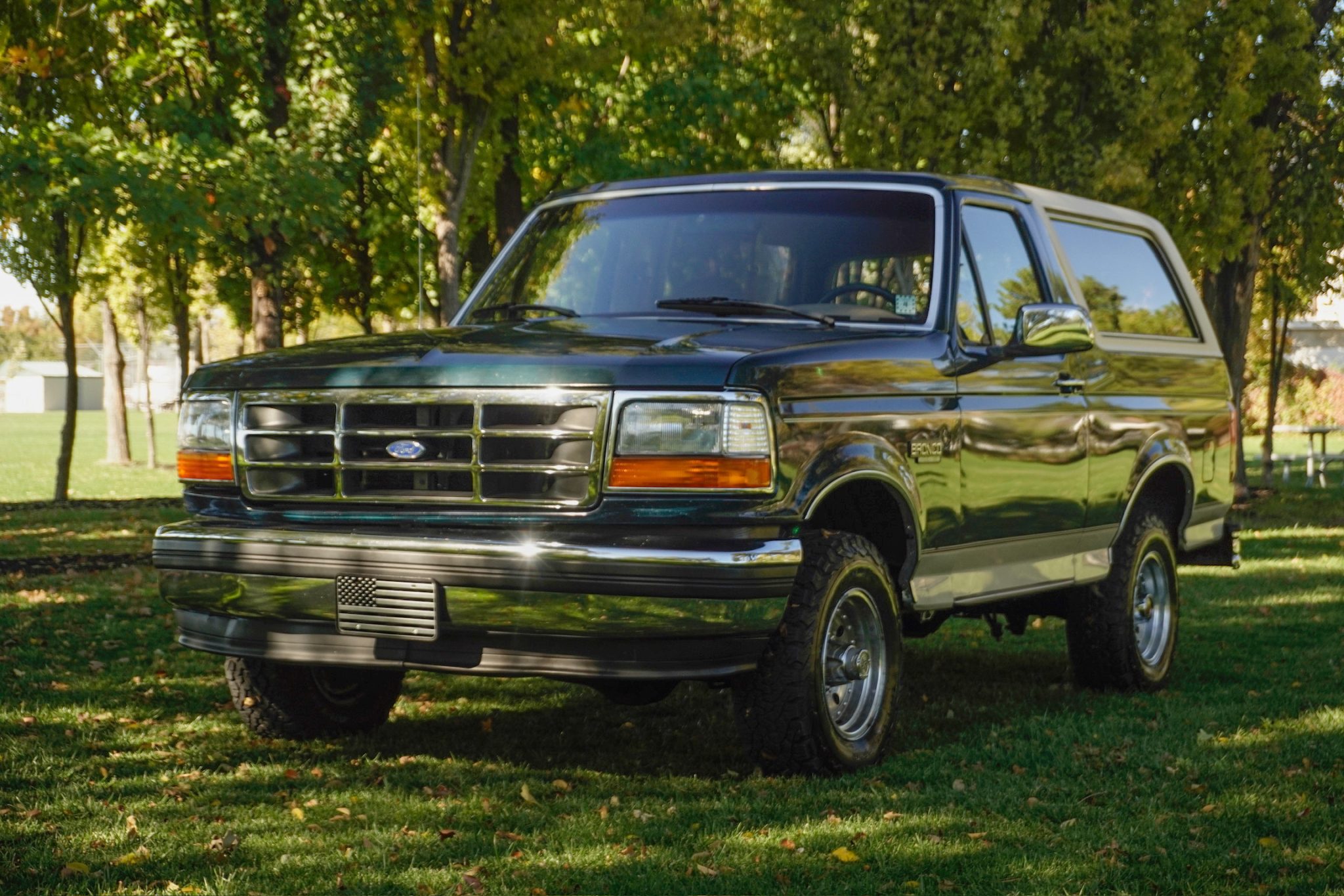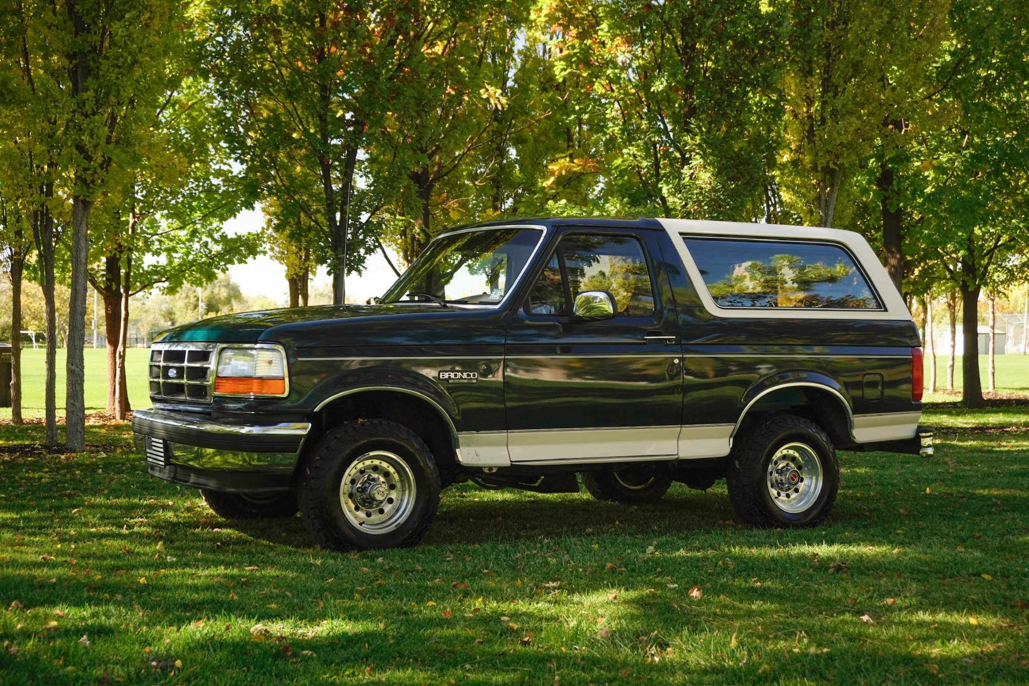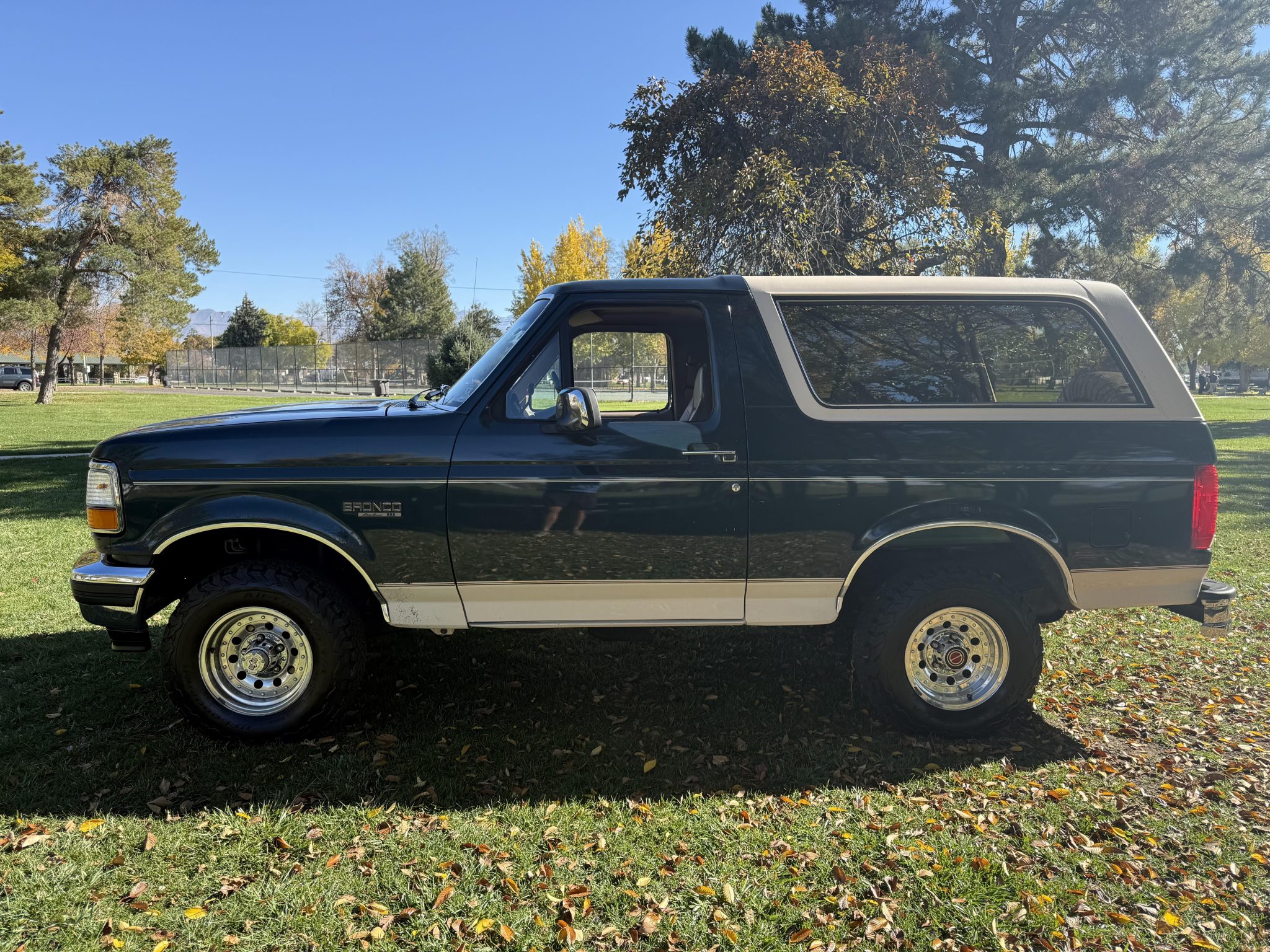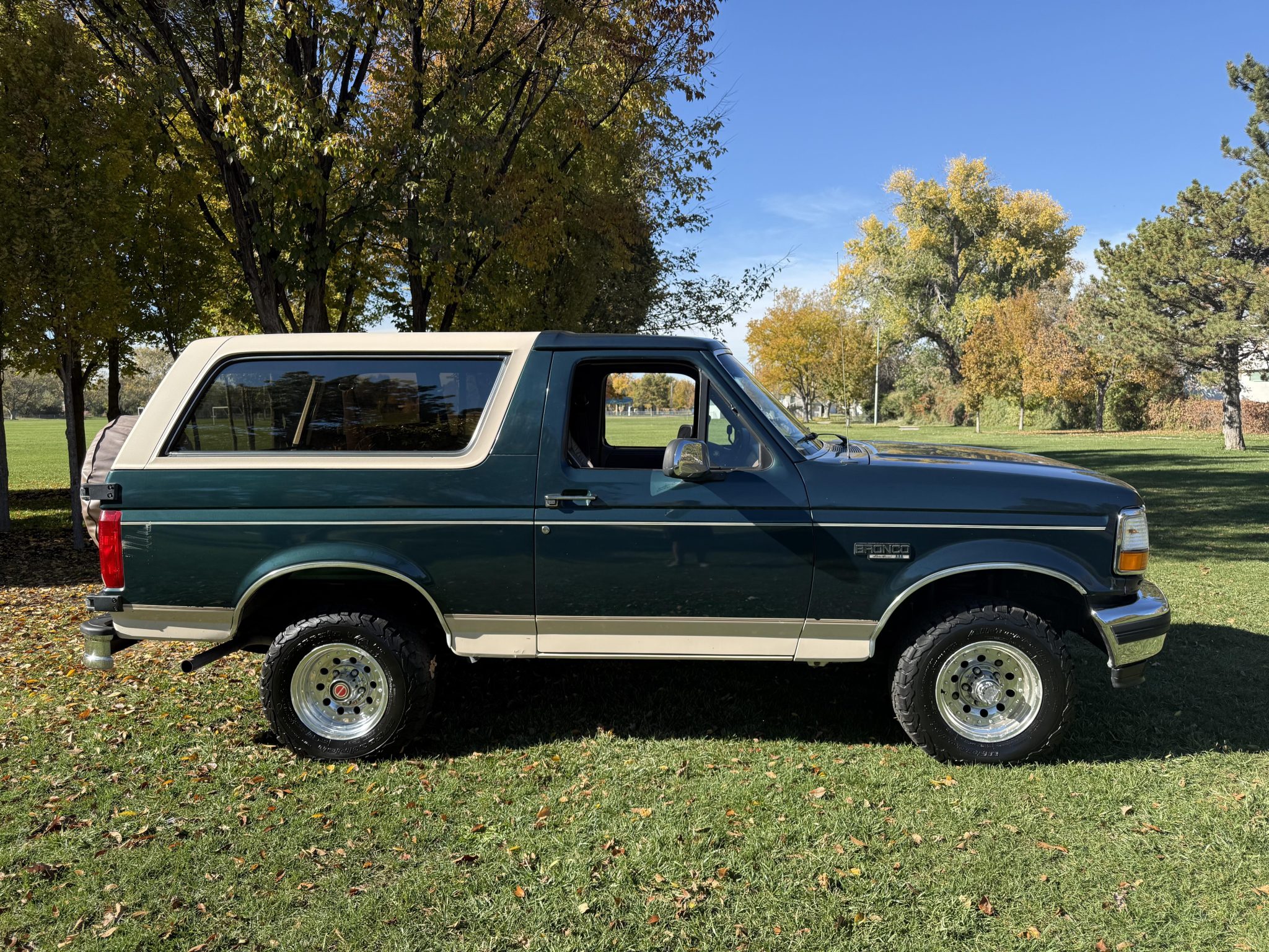 This 1993 Ford Bronco Eddie Bauer is powered by a 5.8-liter V8 linked with a four-speed automatic transmission and a dual-range transfer case. The truck is finished in Emerald Green Metallic over Medium Mocha leather and features a limited-slip rear differential, automatically locking front hubs, 15″ aluminum wheels, a Light Mocha fiberglass roof, a Kenwood stereo, cruise control, power windows, a power tailgate window, and air conditioning