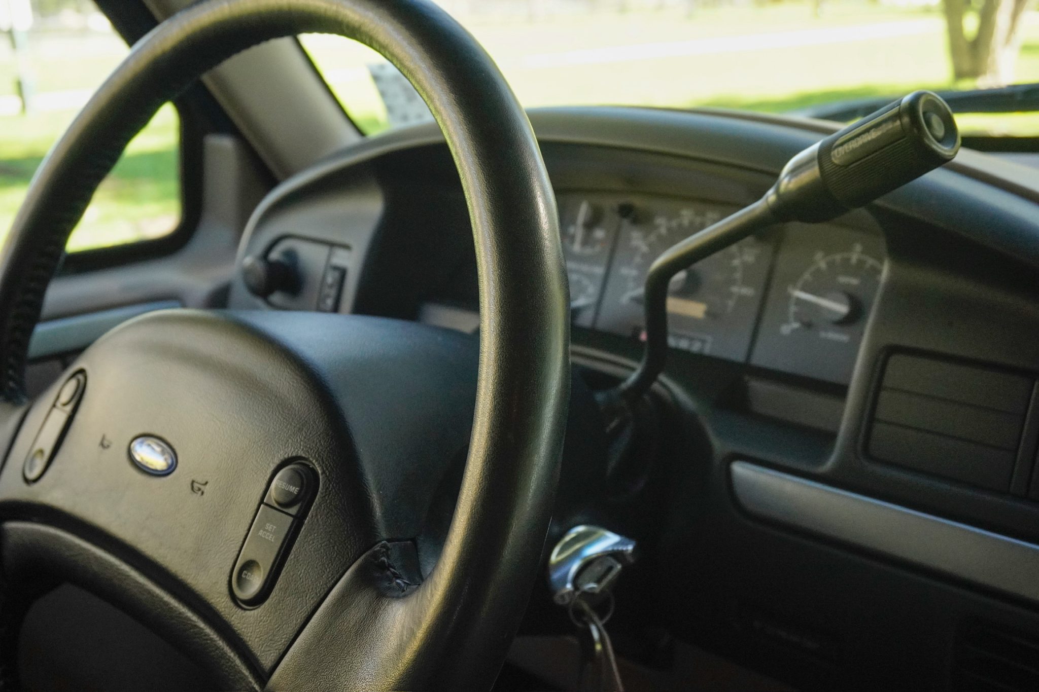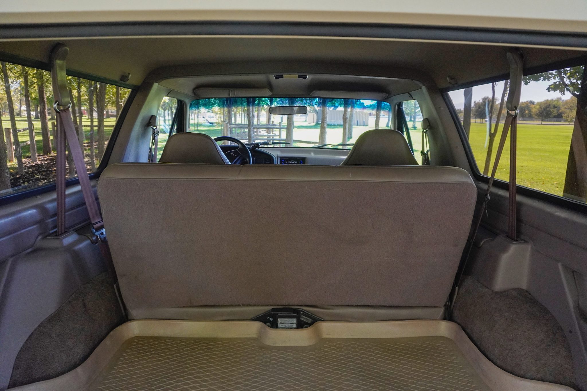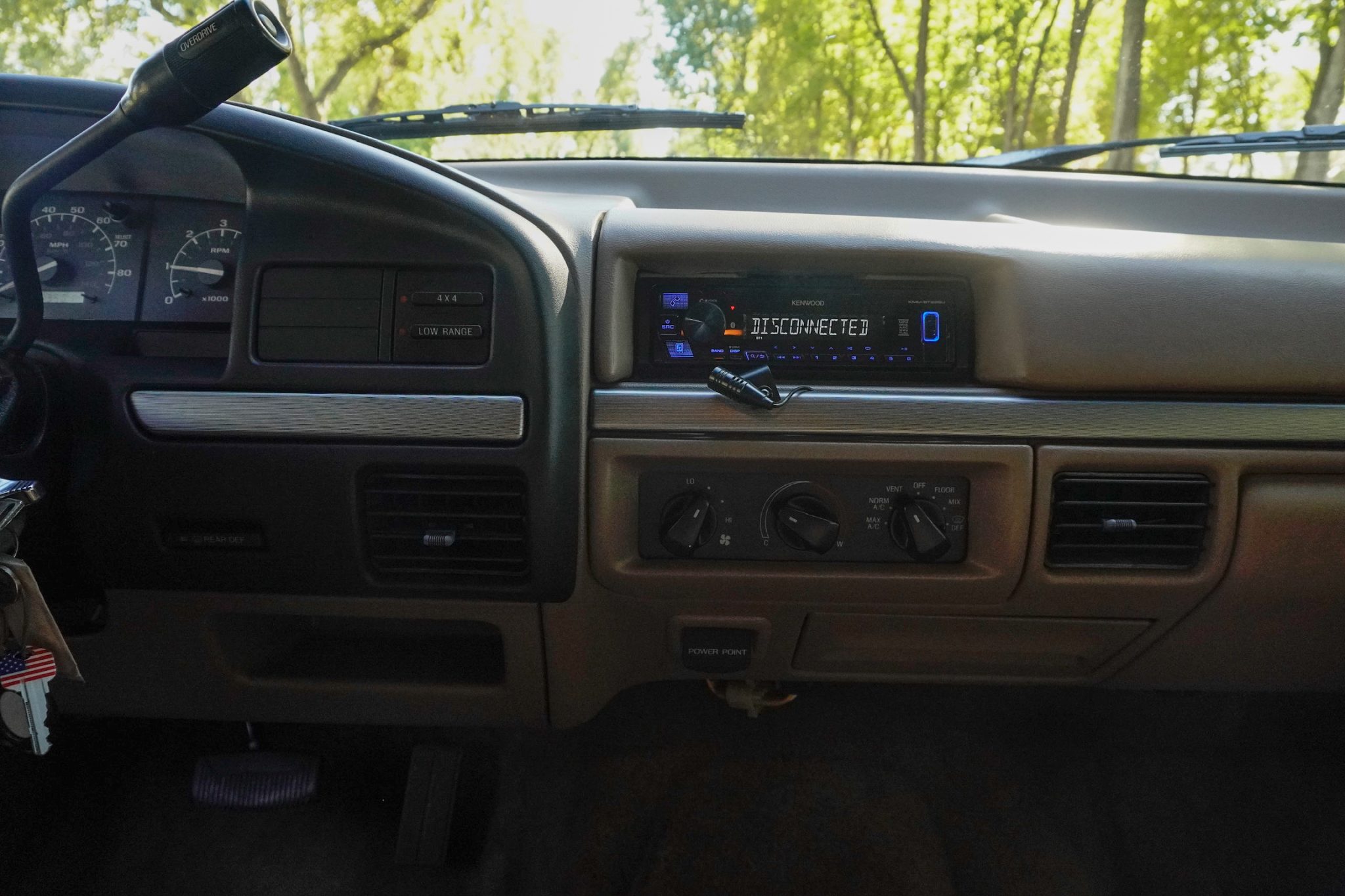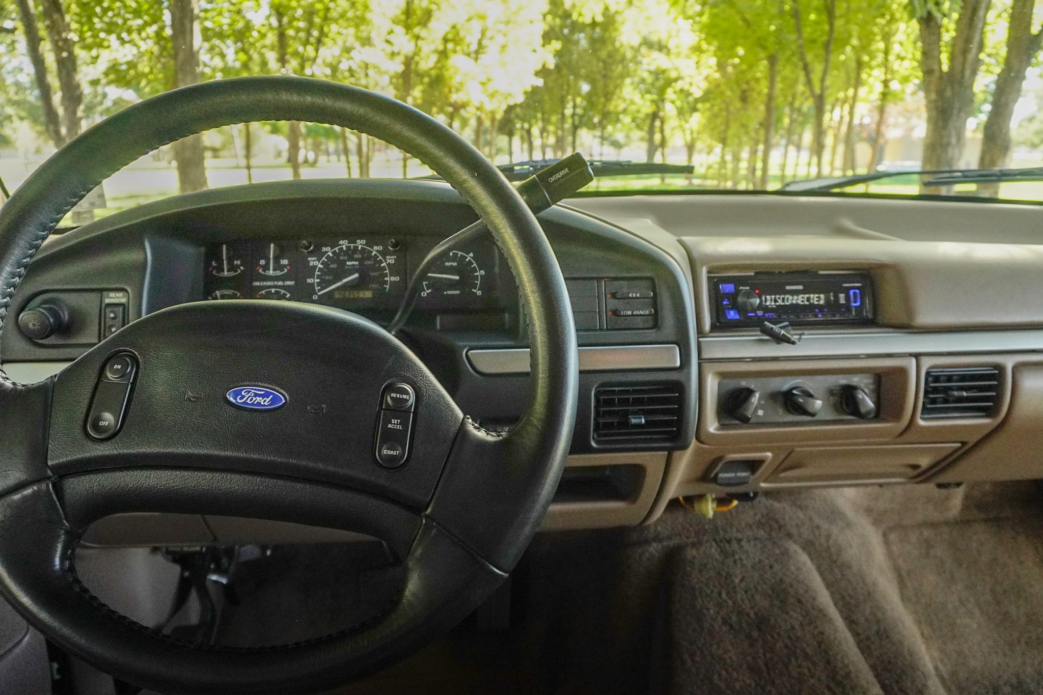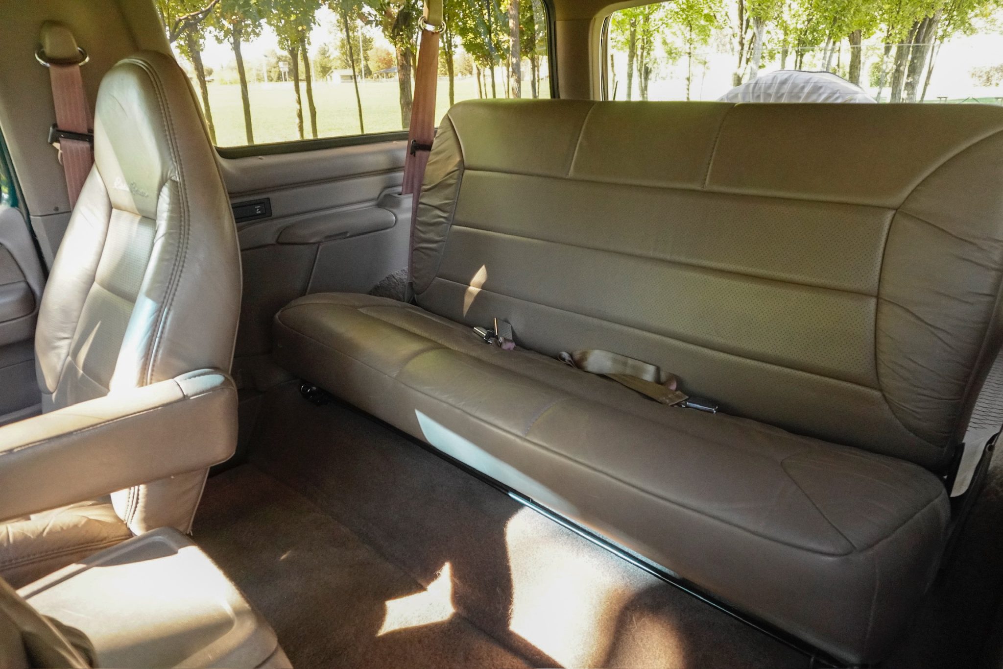 This 1993 Ford Bronco Eddie Bauer is powered by a 5.8-liter V8 linked with a four-speed automatic transmission and a dual-range transfer case. The truck is finished in Emerald Green Metallic over Medium Mocha leather and features a limited-slip rear differential, automatically locking front hubs, 15″ aluminum wheels, a Light Mocha fiberglass roof, a Kenwood stereo, cruise control, power windows, a power tailgate window, and air conditioning