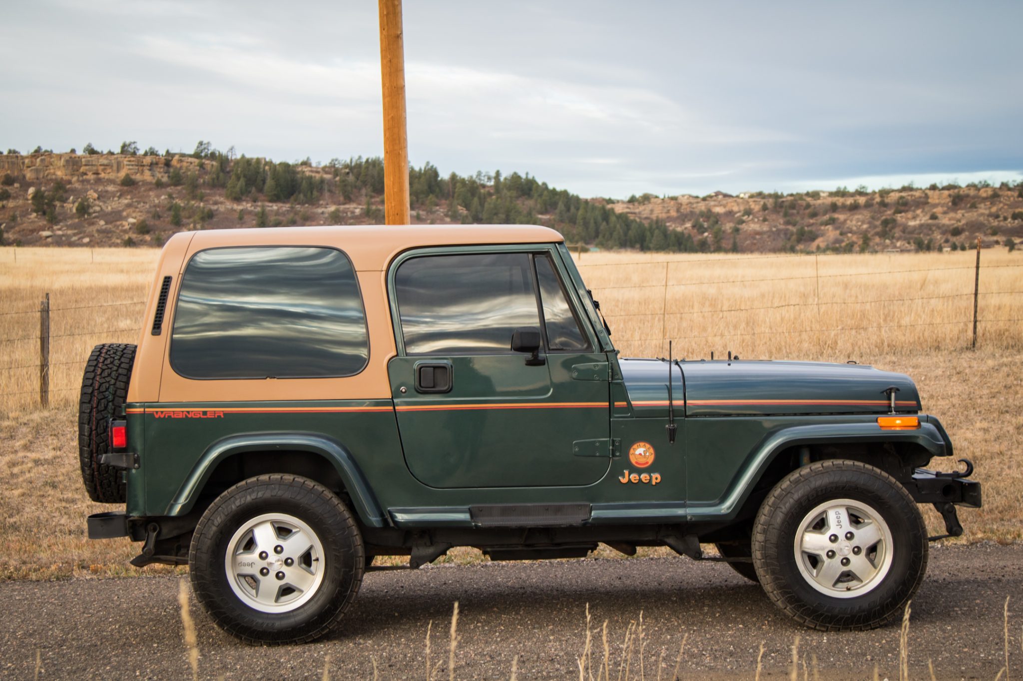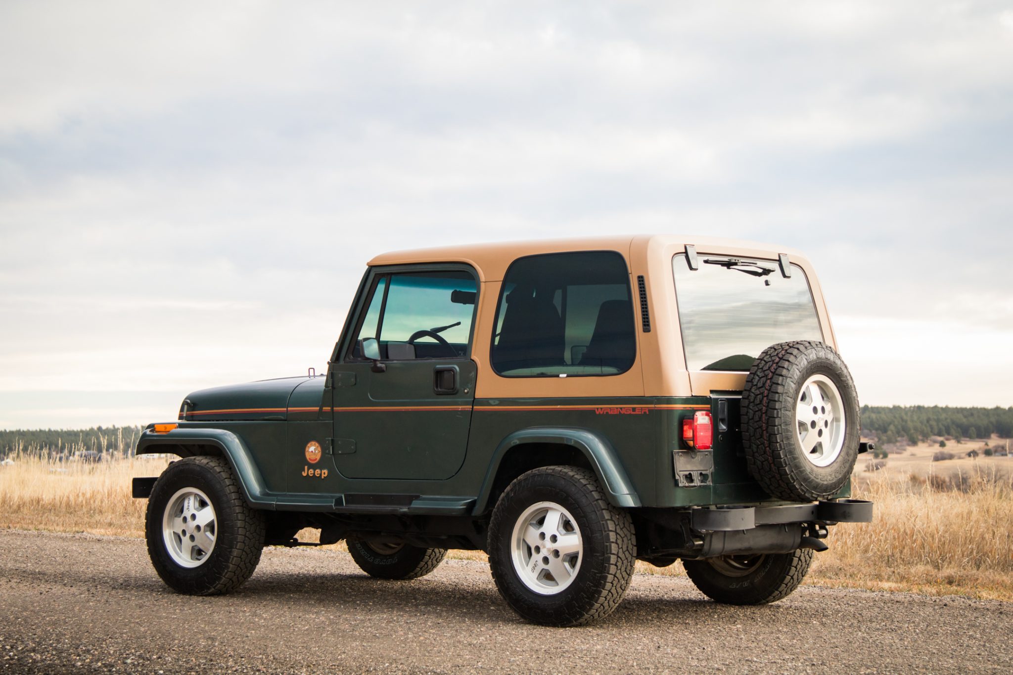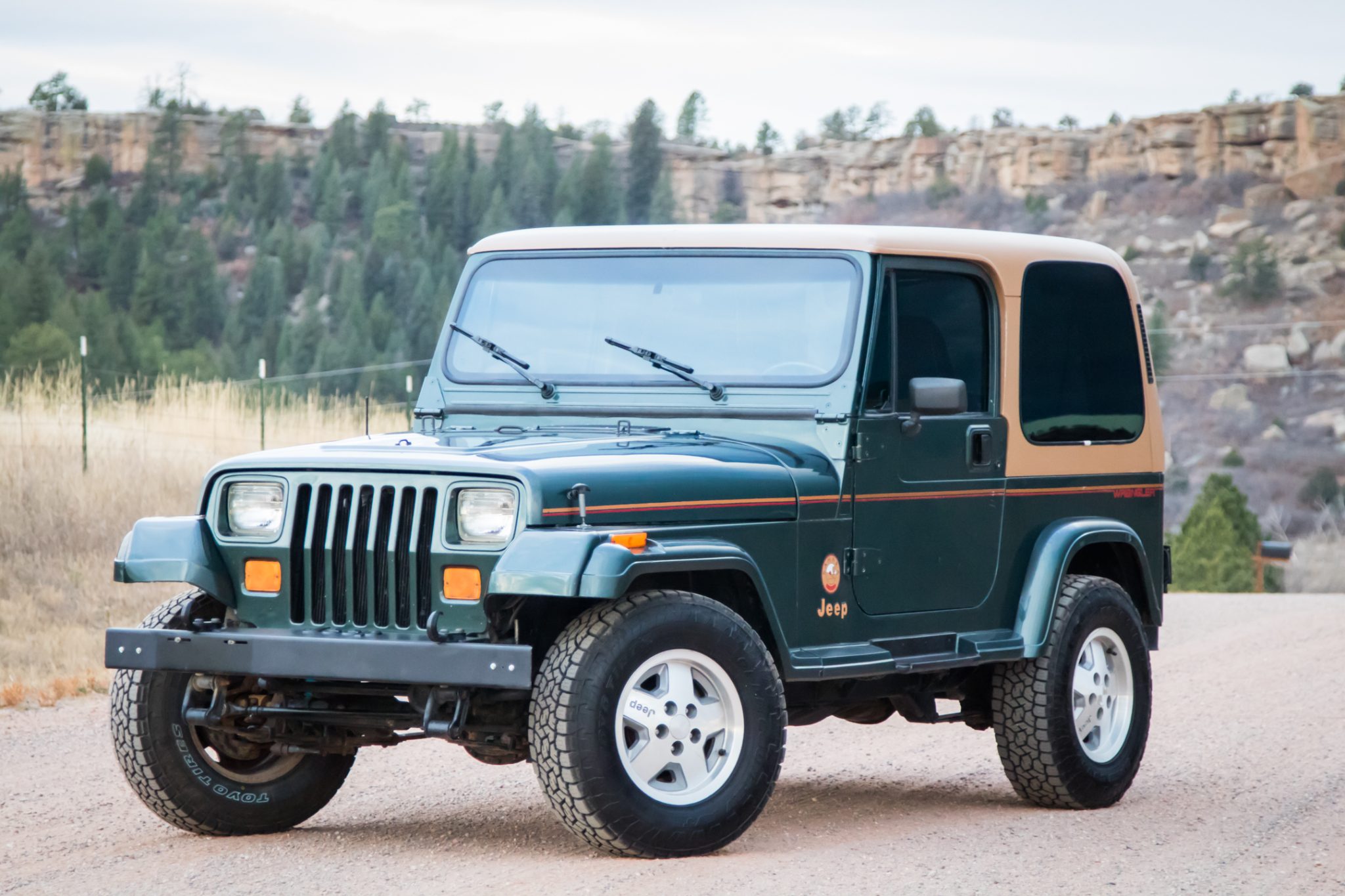 This 1993 Jeep Wrangler Sahara has remained registered in Colorado since new and shows 47k miles It is finished in Hunter Green Metallic over green cloth and powered by a 4.0-liter inline-six linked with a five-speed manual transmission and a dual-range transfer case. Equipment includes a removable tan hardtop, 15″ convex five-spoke alloy wheels, power steering, front disc brakes, a padded roll bar, and a Kenwood stereo.