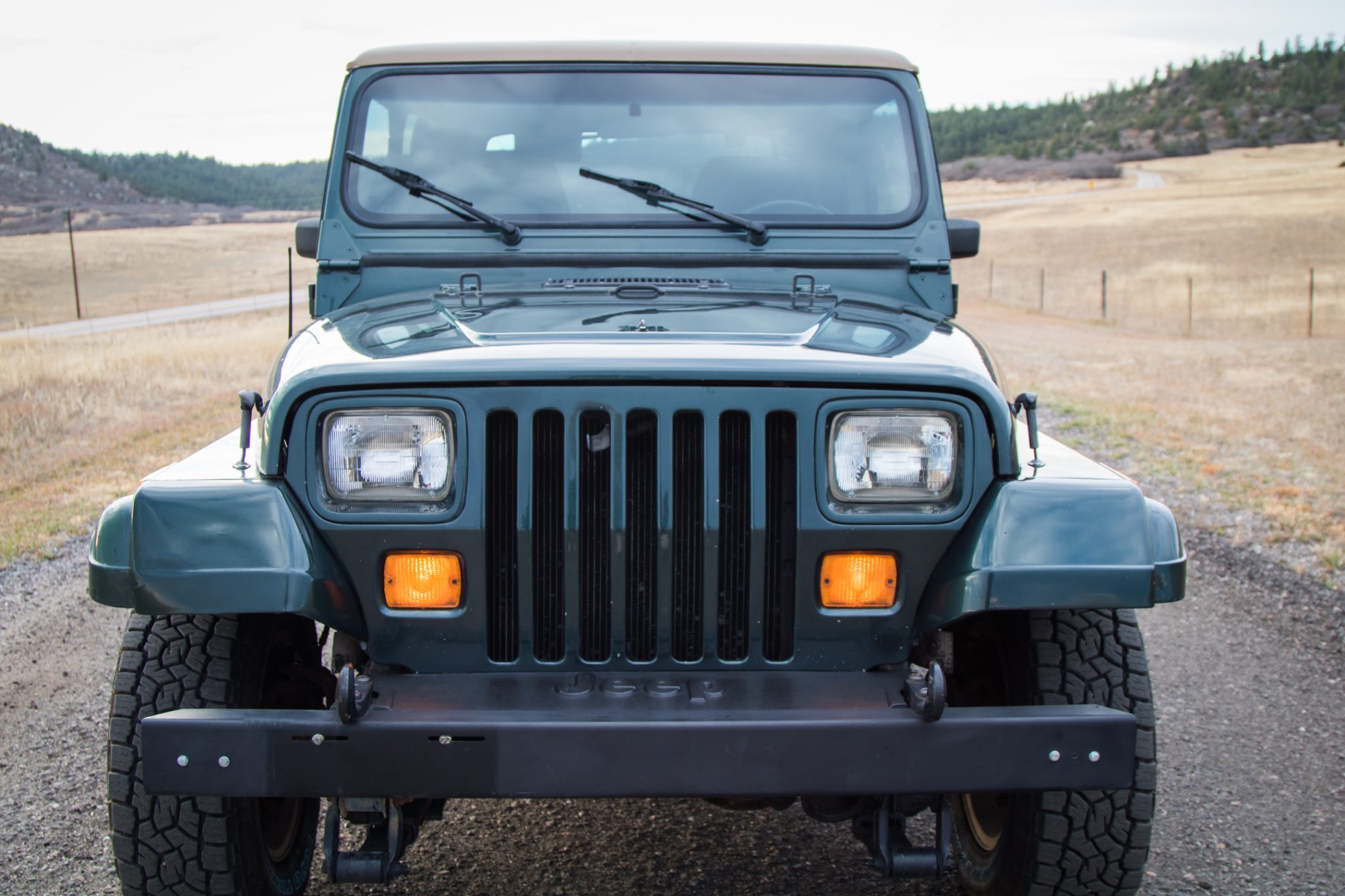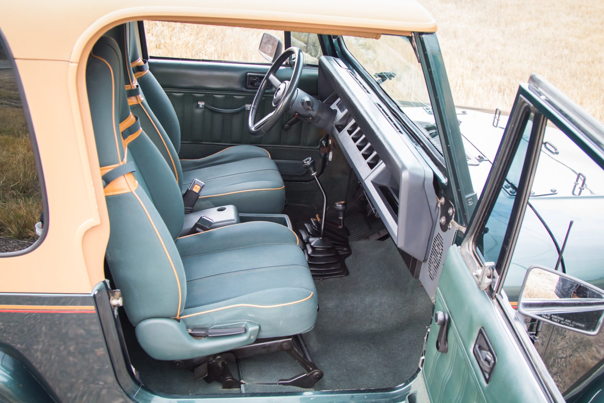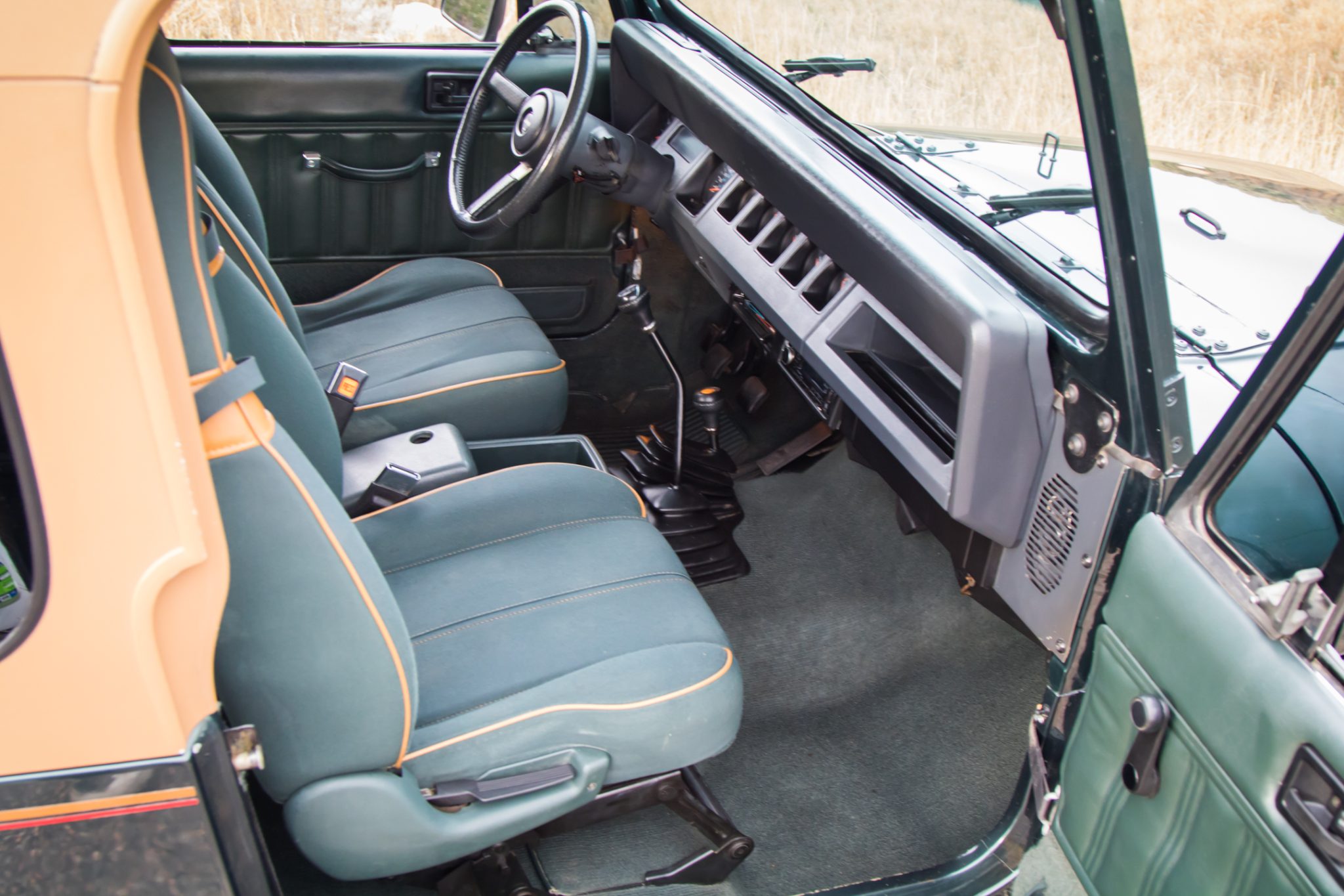 This 1993 Jeep Wrangler Sahara has remained registered in Colorado since new and shows 47k miles It is finished in Hunter Green Metallic over green cloth and powered by a 4.0-liter inline-six linked with a five-speed manual transmission and a dual-range transfer case. Equipment includes a removable tan hardtop, 15″ convex five-spoke alloy wheels, power steering, front disc brakes, a padded roll bar, and a Kenwood stereo.