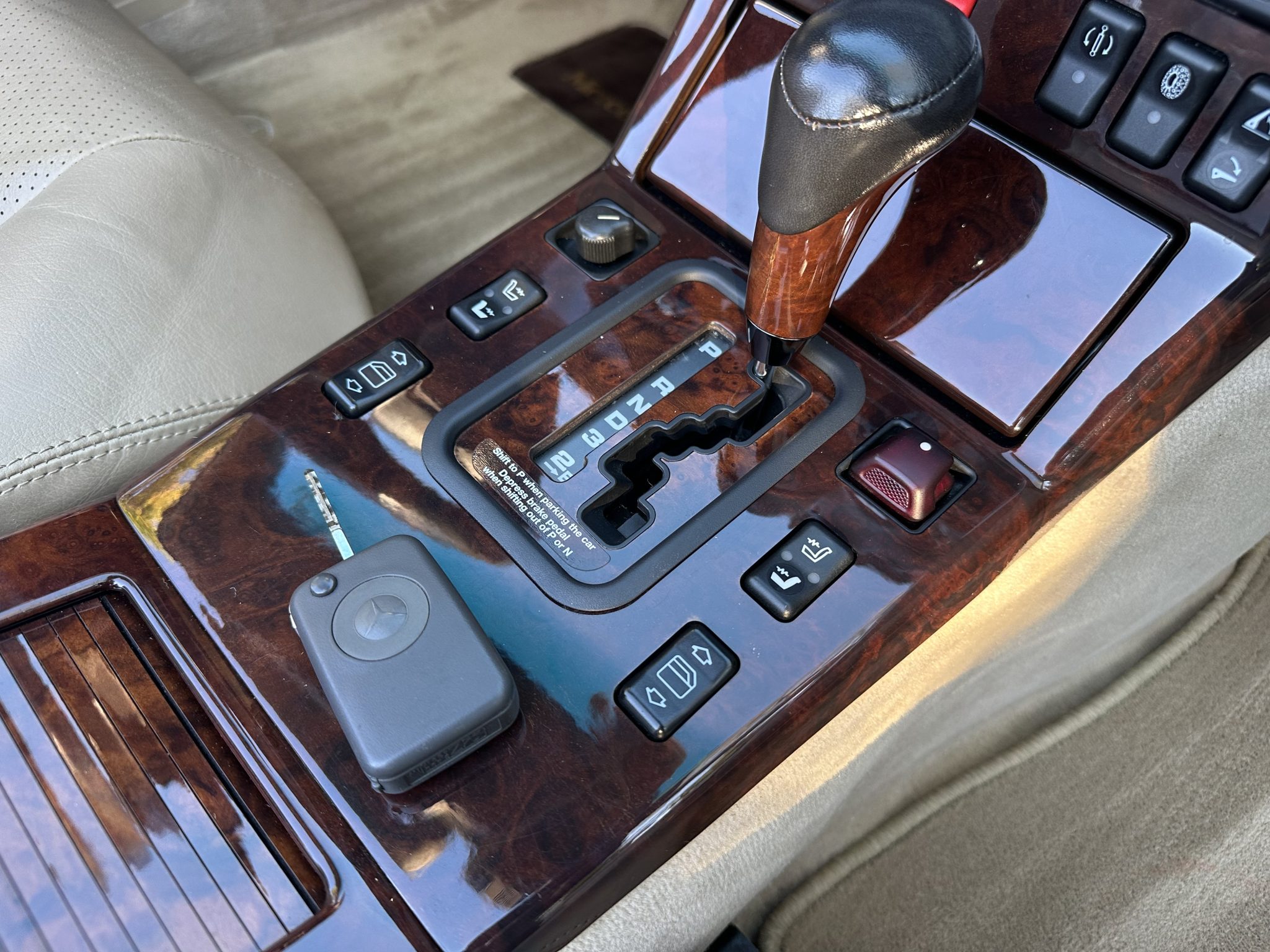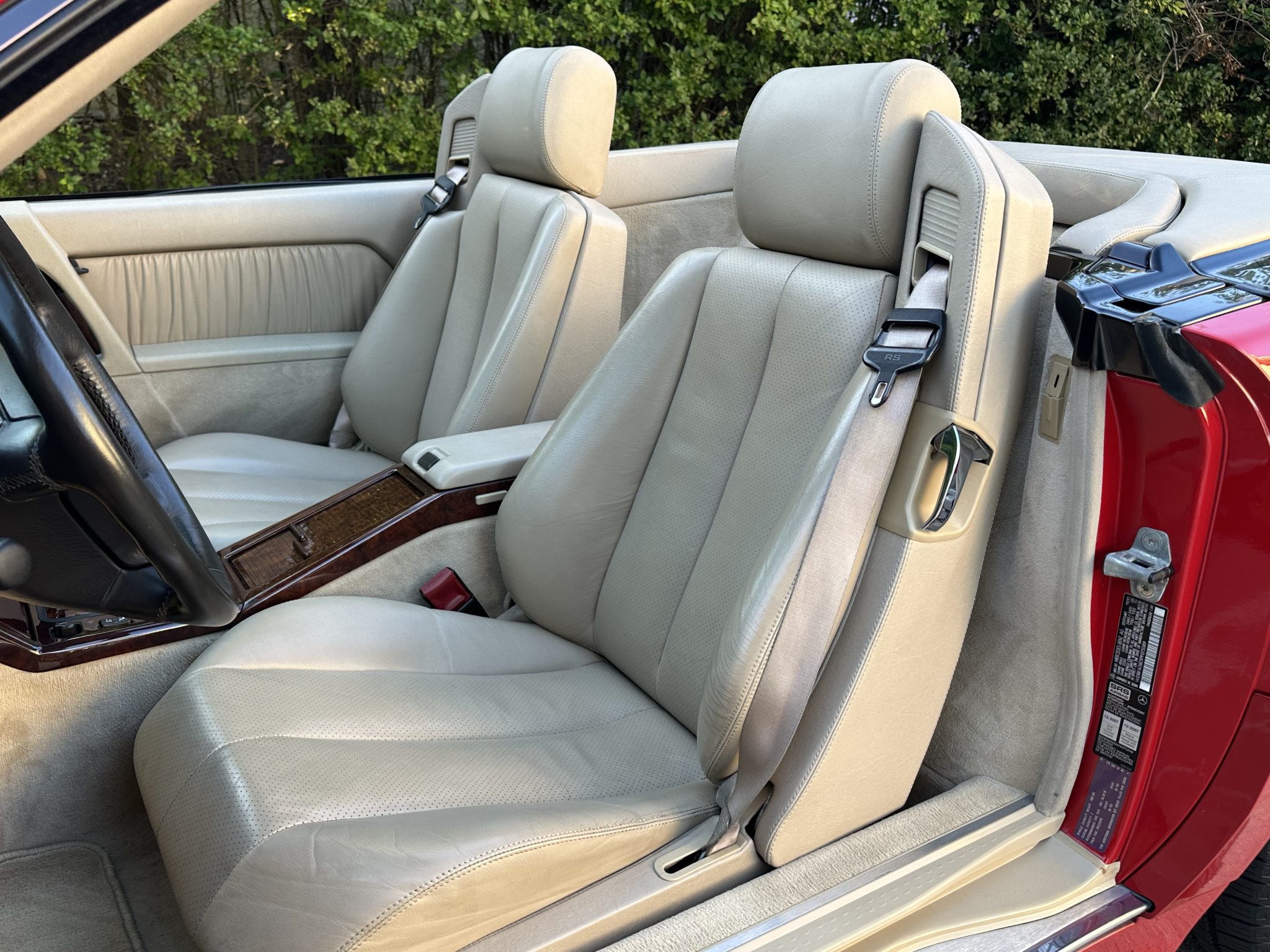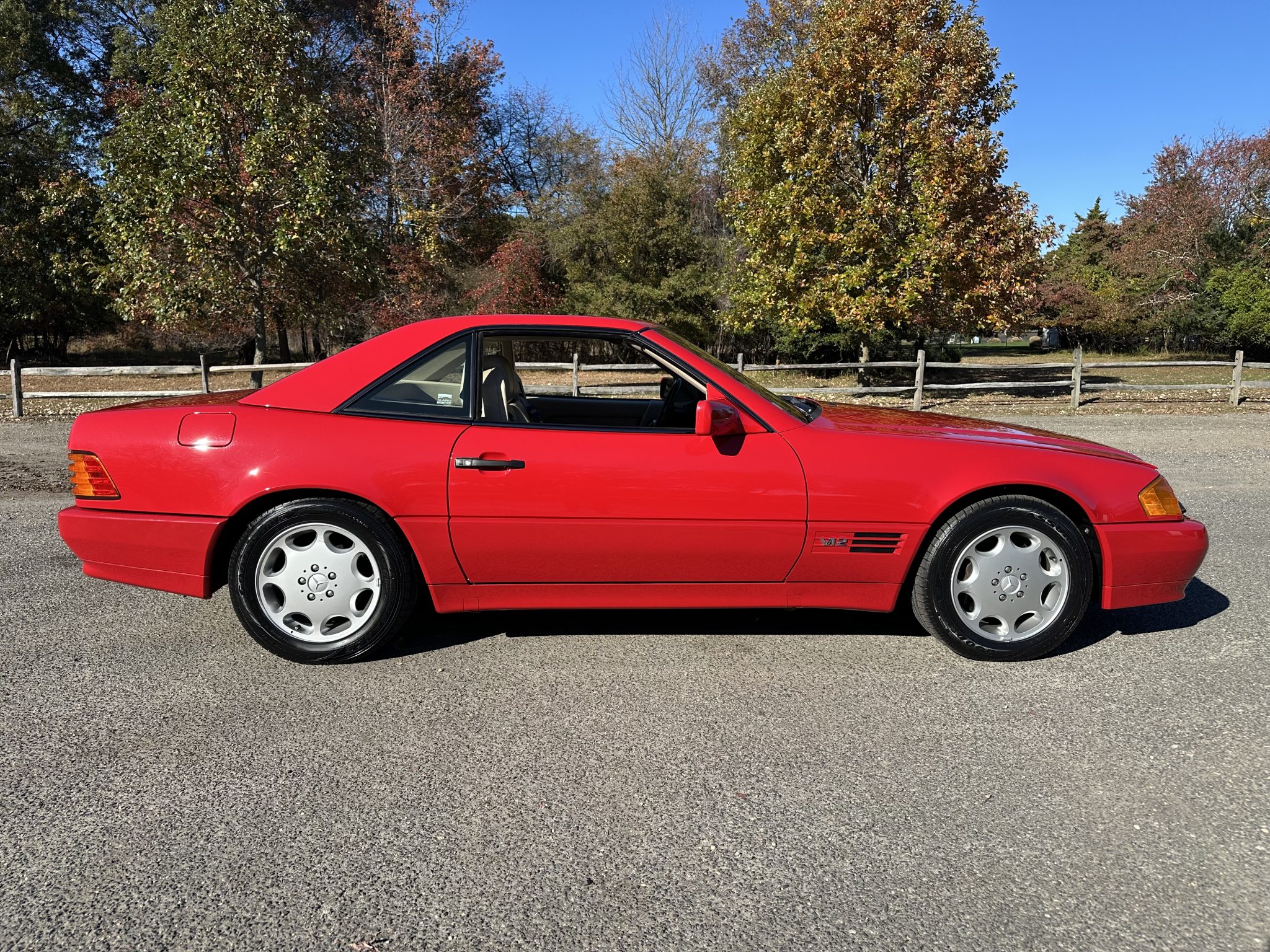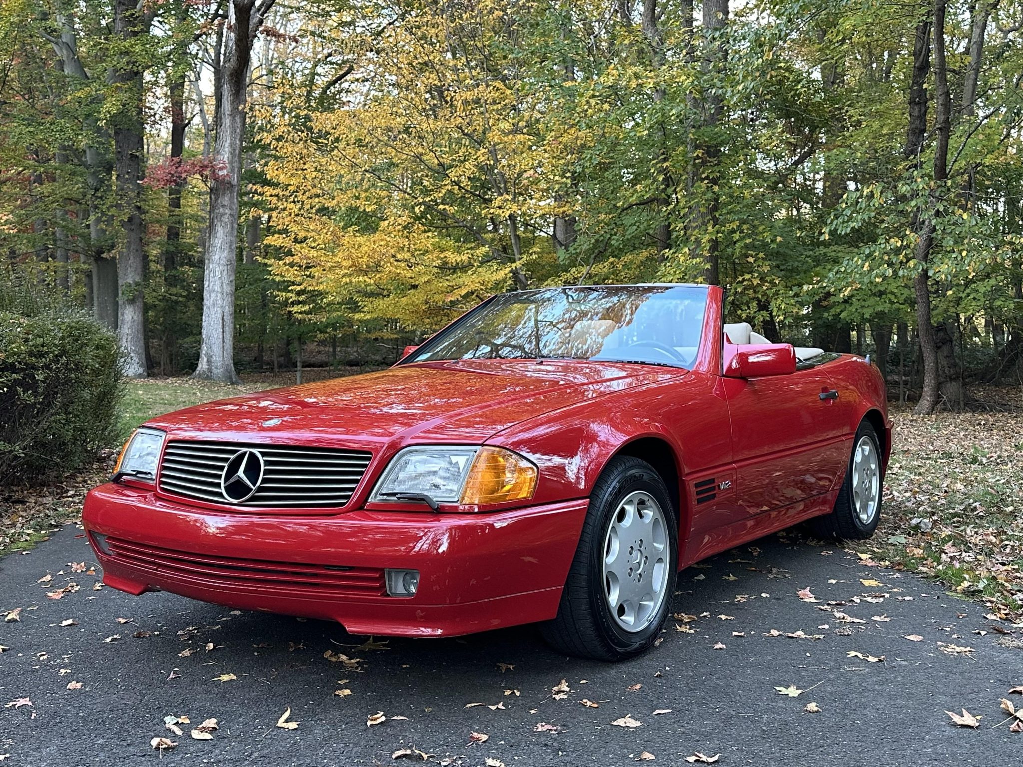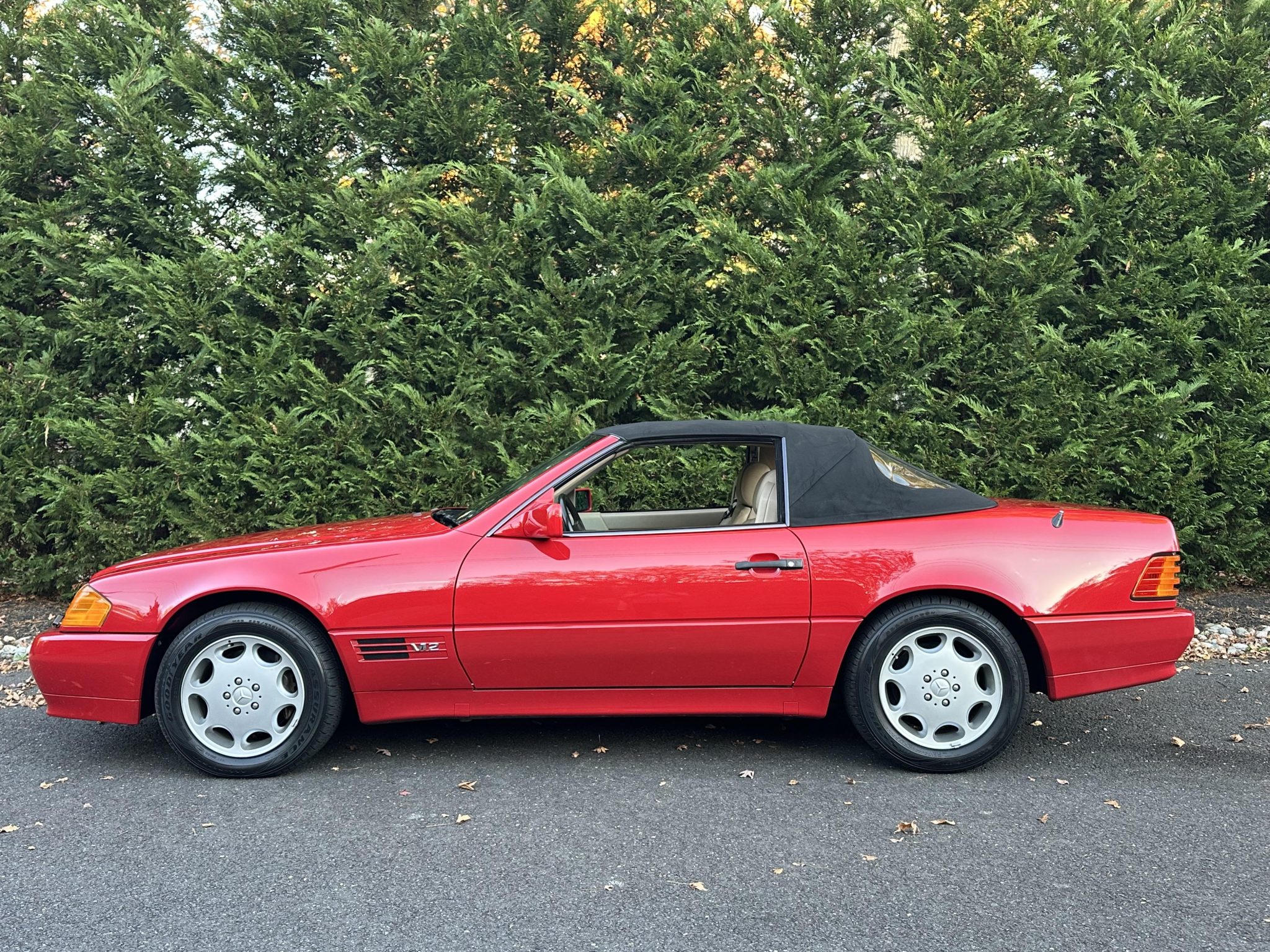 This 1993 Mercedes-Benz 600SL is finished in Signal Red over Parchment leather and is powered by a 6.0-liter V12 paired with a four-speed automatic transmission. Features include a removable body-color hardtop, a black soft top, an Adaptive Damping System, antilock disc brakes, 16″ alloy wheels, heated power-adjustable seats, automatic climate control, cruise control, and a CD/cassette stereo