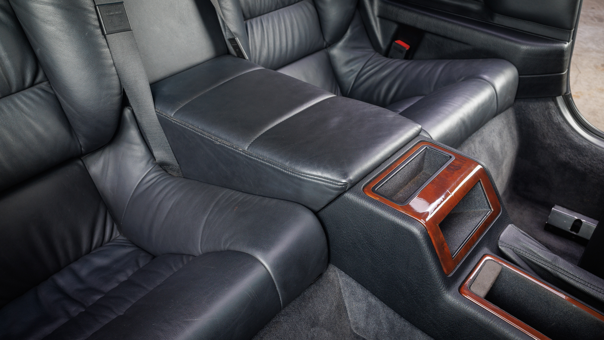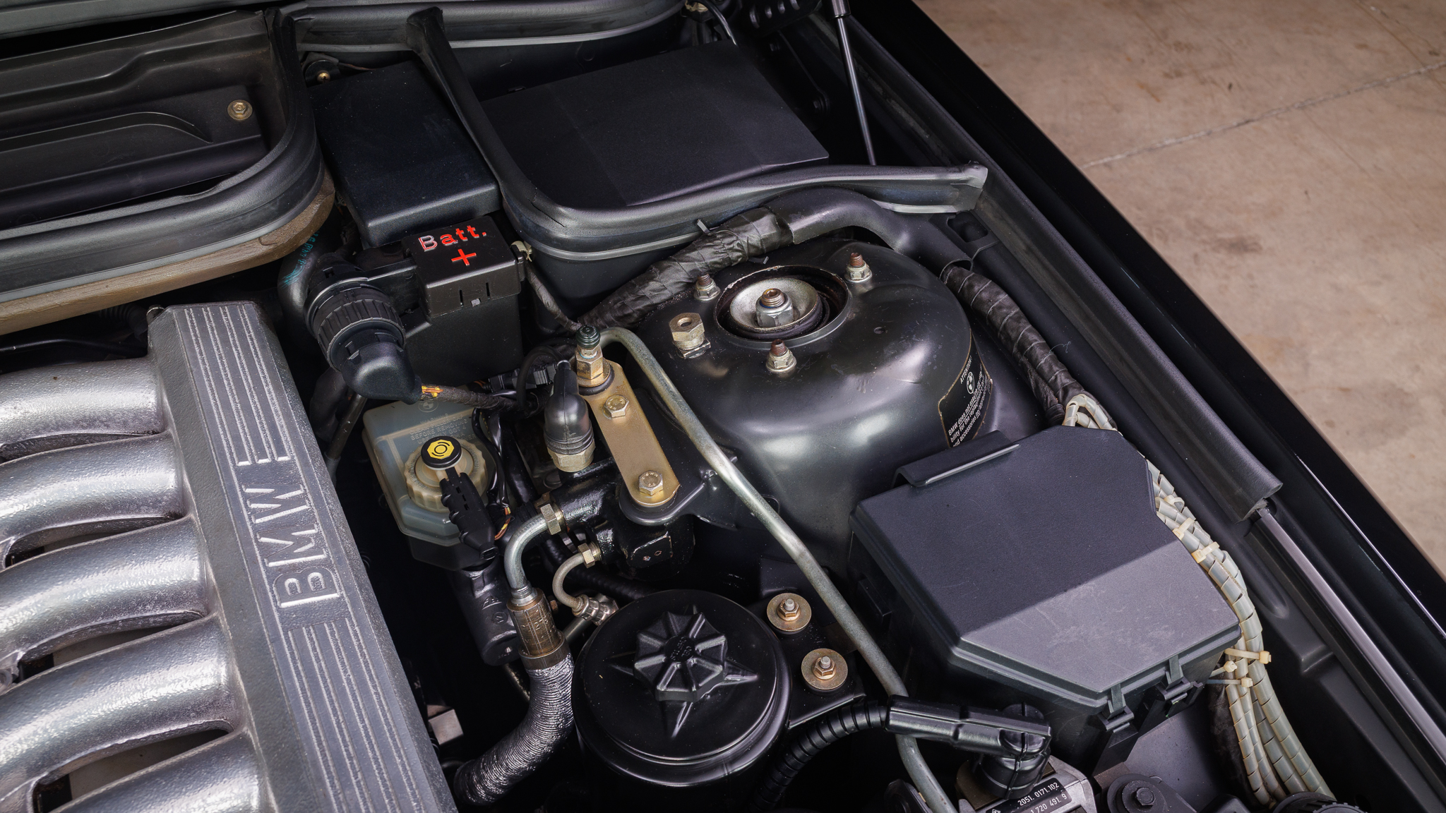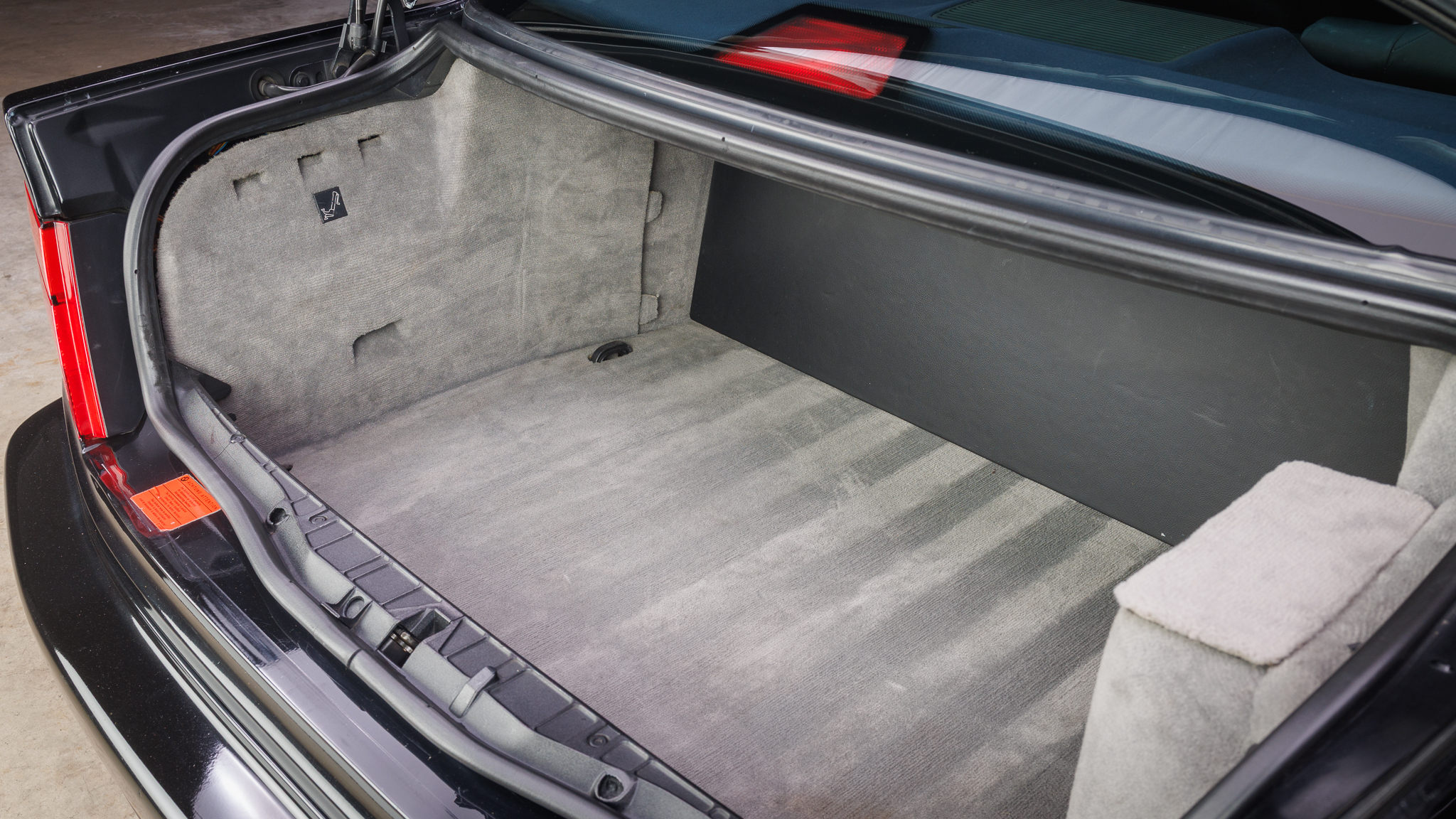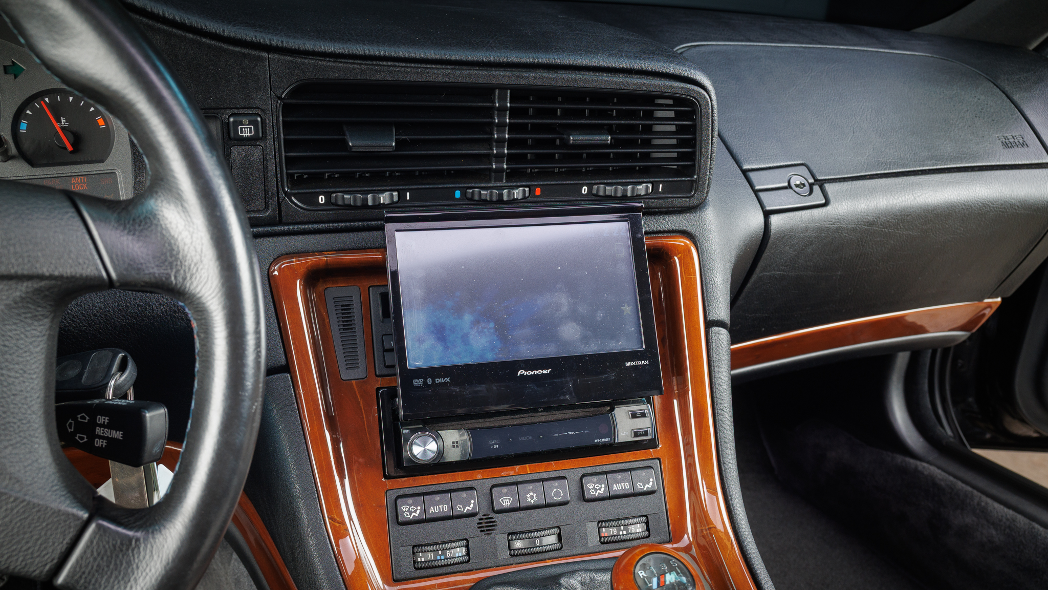 It is powered by a 5.6-liter V12 linked with a six-speed manual transmission and a limited-slip differential, and it is finished in Jet Black over black leather. The car has been modified with Bilstein shocks, H&R springs, adjustable camber plates and end links, MagnaFlow mufflers, a Turner Conforti ECU chip, aftermarket fuel injectors, a honed intake manifold, a short-shift kit, and a Pioneer CD stereo. Additional features include a power-operated sunroof, fog lights, dual-zone automatic climate control, heated and power-adjustable front seats, and cruise control.
