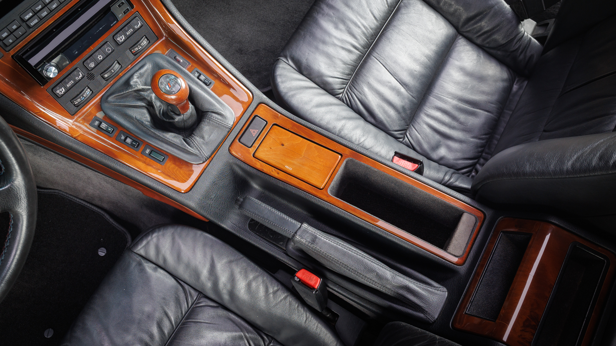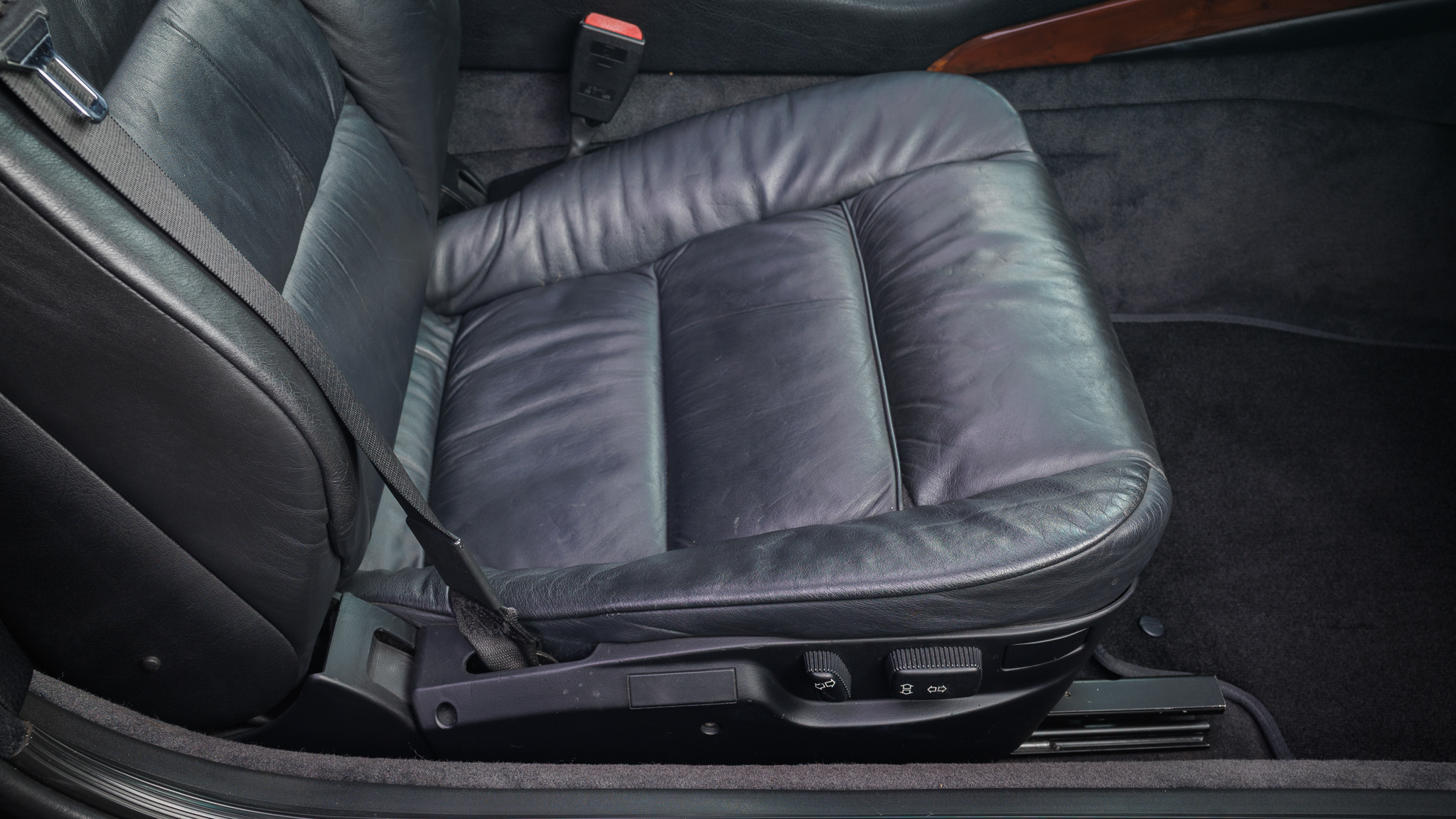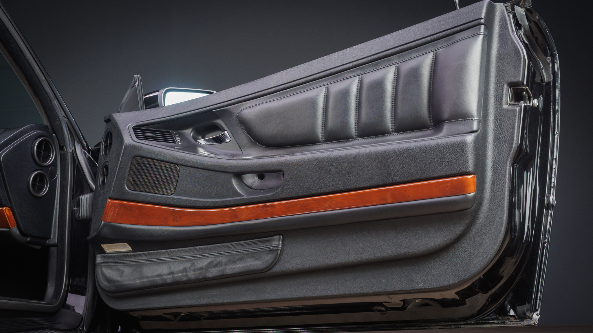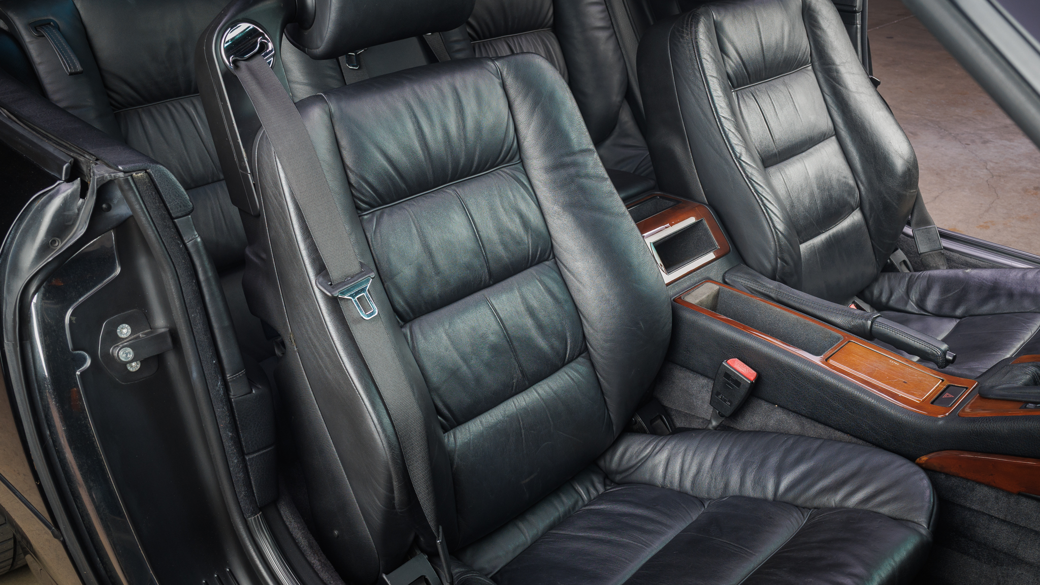 It is powered by a 5.6-liter V12 linked with a six-speed manual transmission and a limited-slip differential, and it is finished in Jet Black over black leather. The car has been modified with Bilstein shocks, H&R springs, adjustable camber plates and end links, MagnaFlow mufflers, a Turner Conforti ECU chip, aftermarket fuel injectors, a honed intake manifold, a short-shift kit, and a Pioneer CD stereo. Additional features include a power-operated sunroof, fog lights, dual-zone automatic climate control, heated and power-adjustable front seats, and cruise control.