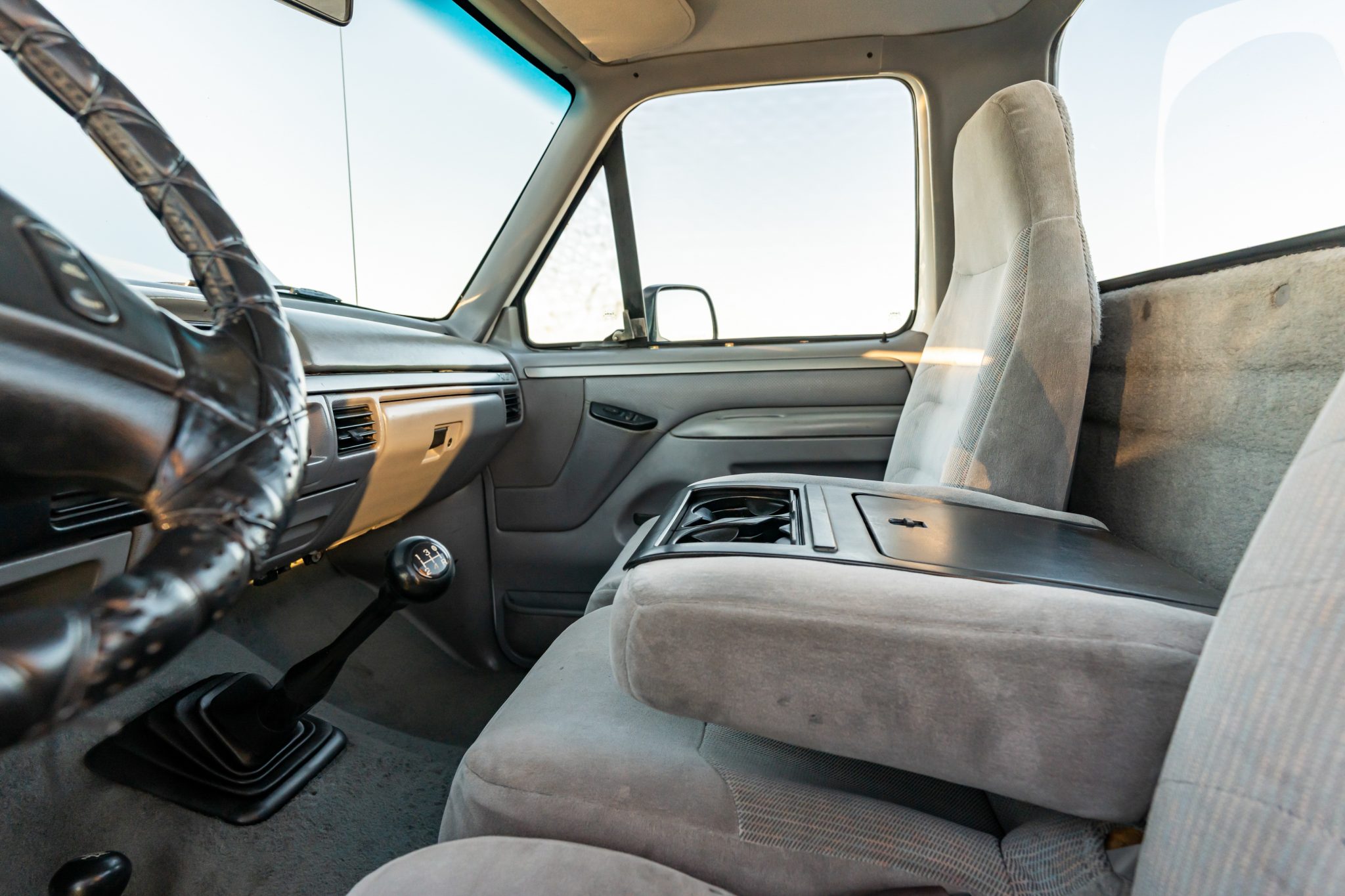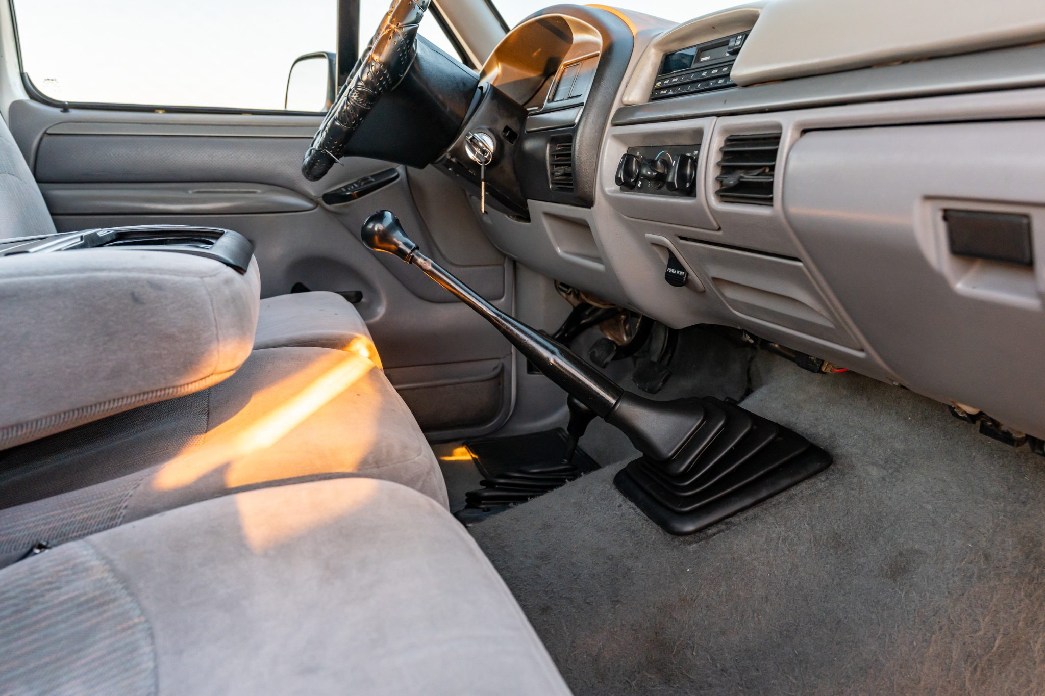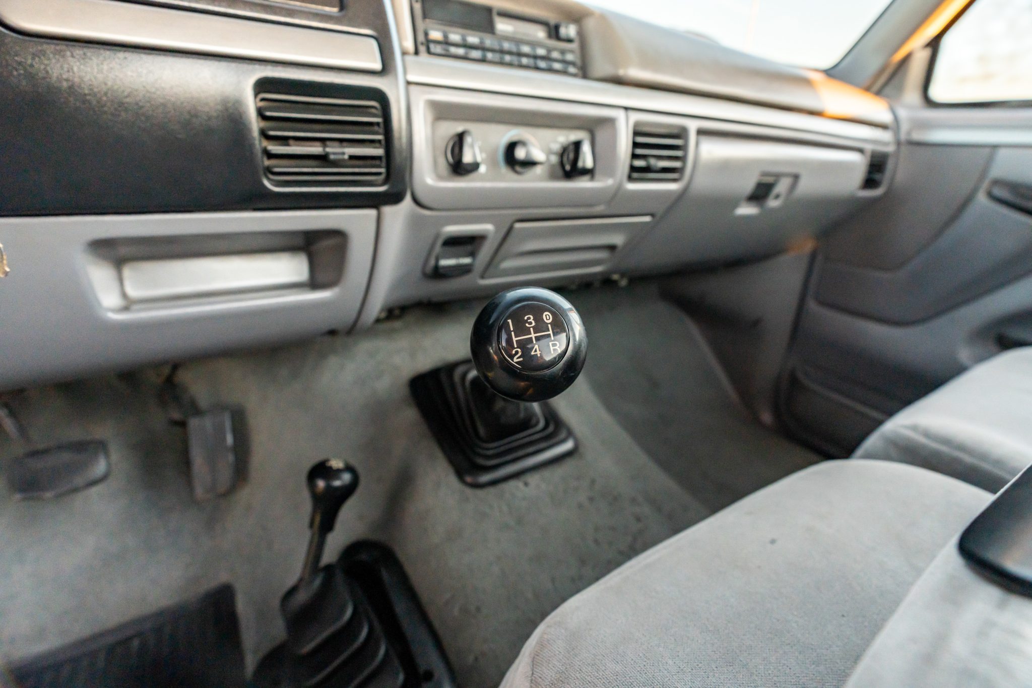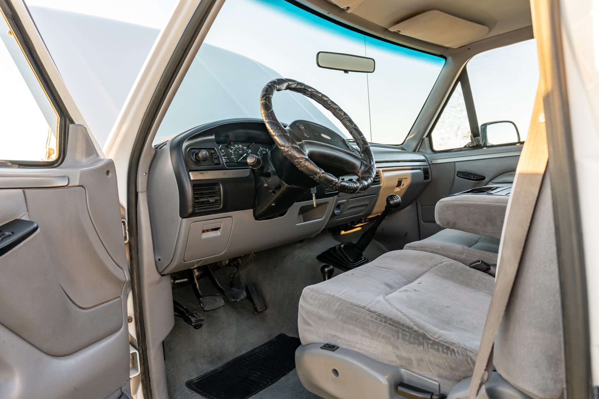 Power is provided by a 7.3-liter turbodiesel V8 linked to a five-speed manual transmission and a dual-range transfer case, and the truck is finished in Oxford White over Opal Gray cloth. Equipment includes 16″ eight-hole alloy wheels, a leveling kit, front disc brakes, manually locking front hubs, a receiver hitch, air conditioning, cruise control, and an AM/FM/cassette stereo.