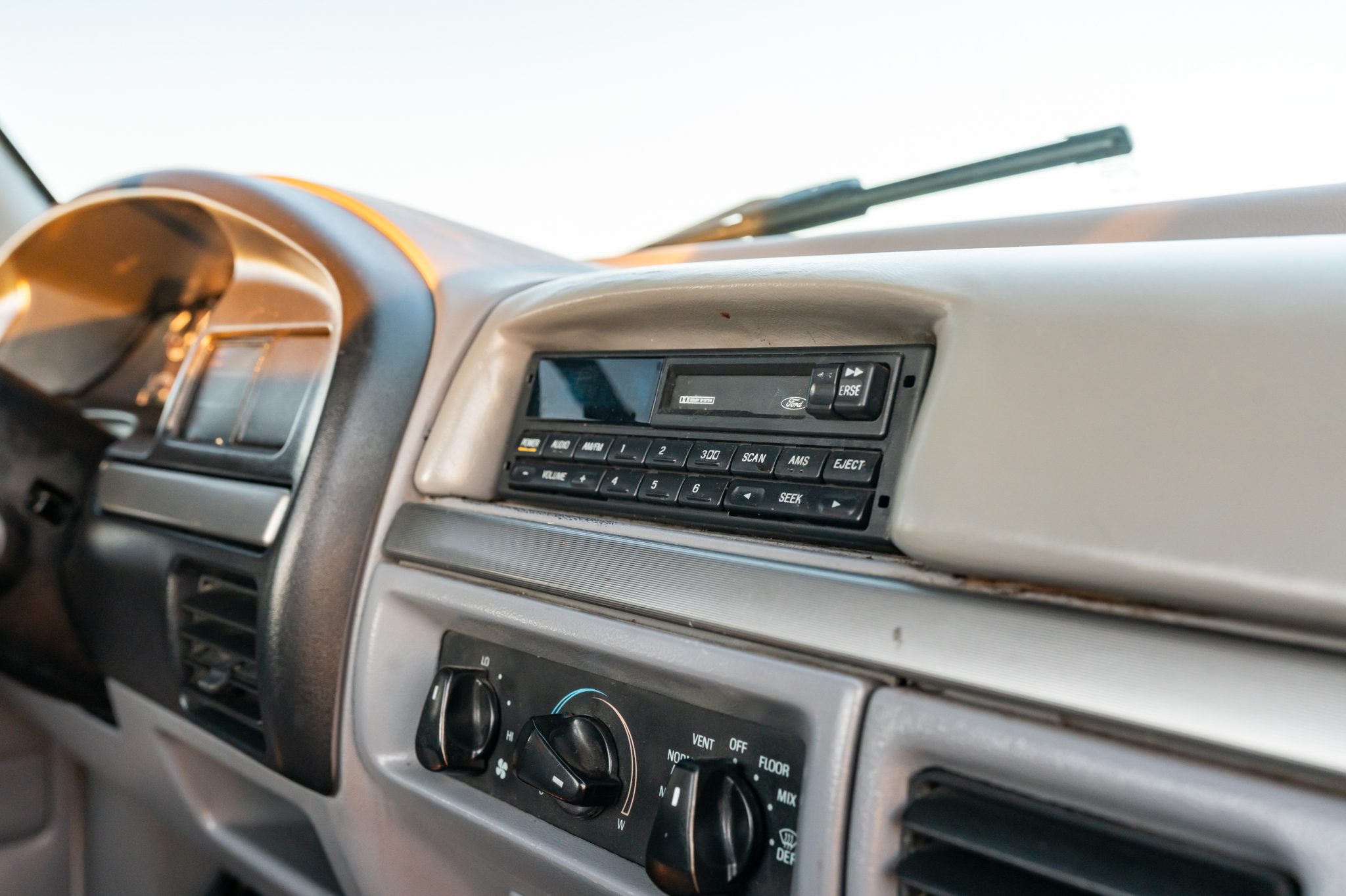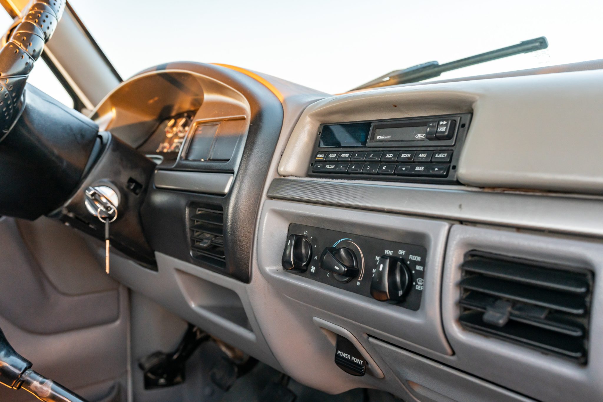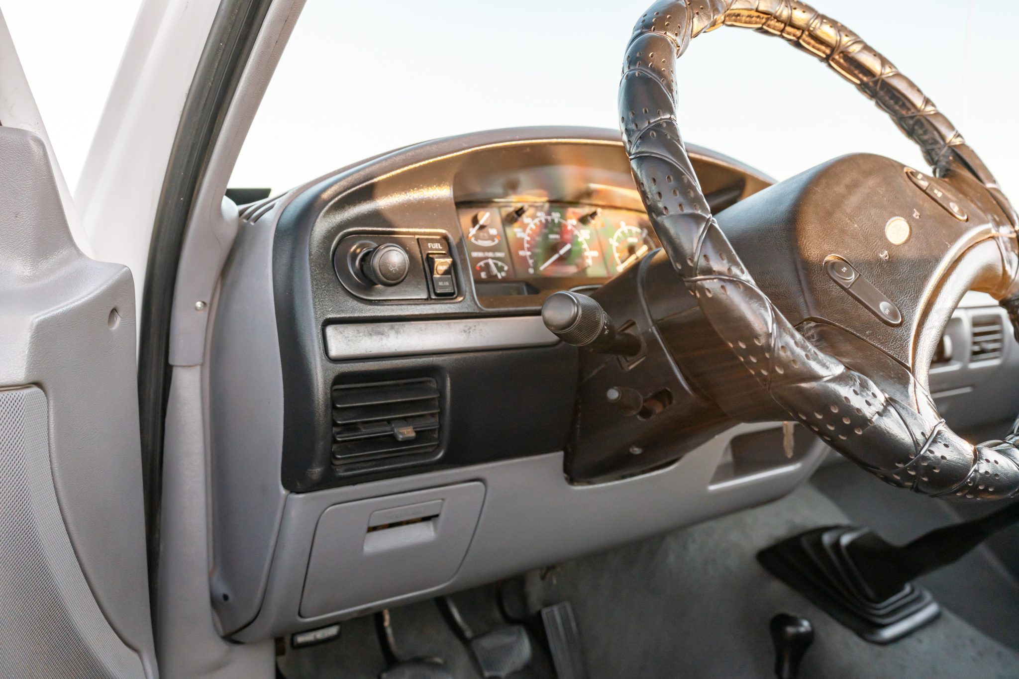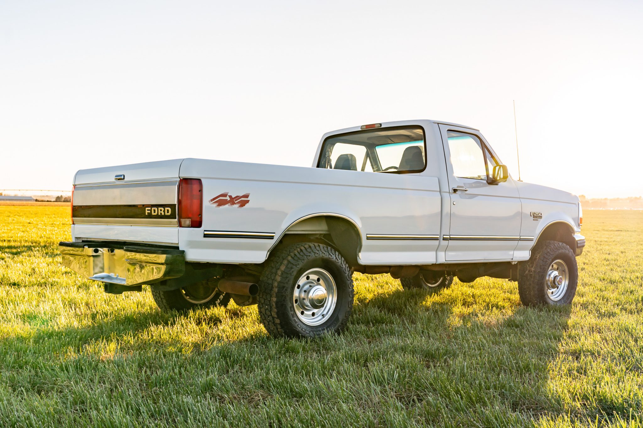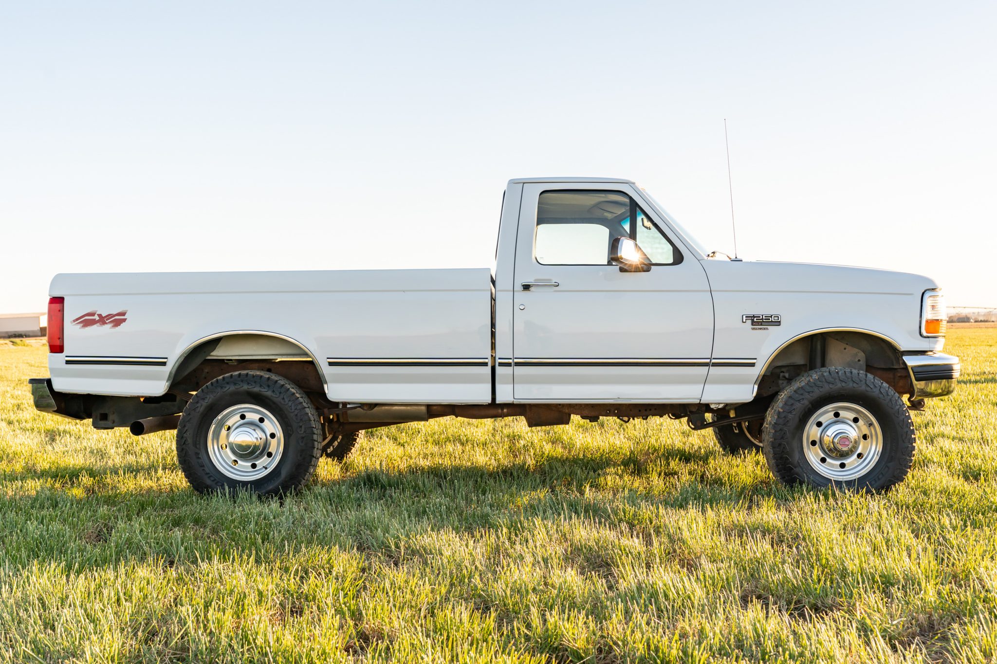 Power is provided by a 7.3-liter turbodiesel V8 linked to a five-speed manual transmission and a dual-range transfer case, and the truck is finished in Oxford White over Opal Gray cloth. Equipment includes 16″ eight-hole alloy wheels, a leveling kit, front disc brakes, manually locking front hubs, a receiver hitch, air conditioning, cruise control, and an AM/FM/cassette stereo.