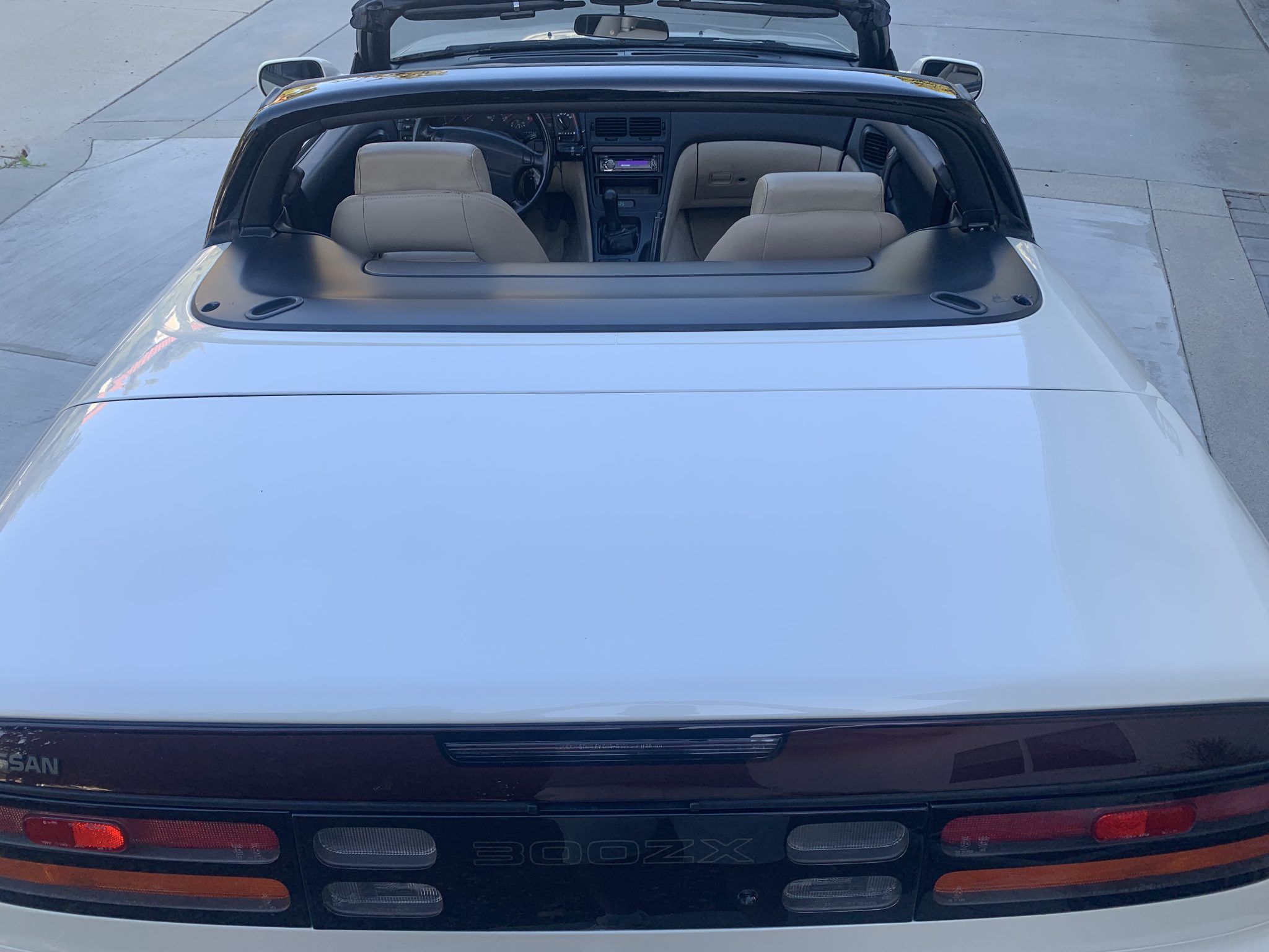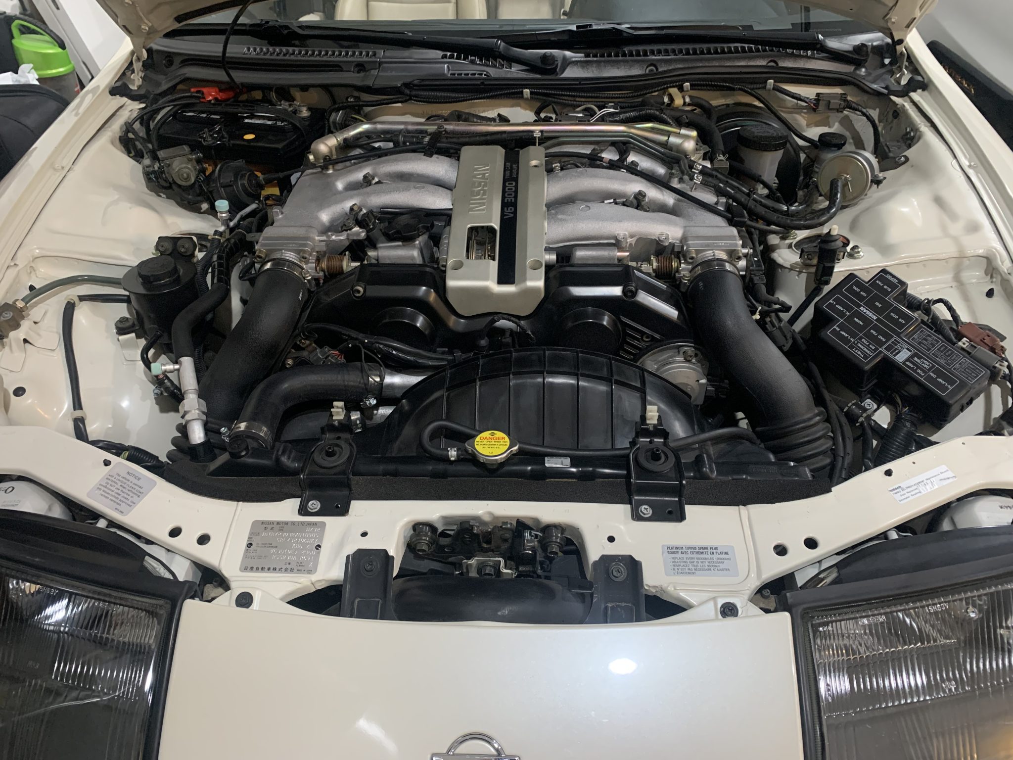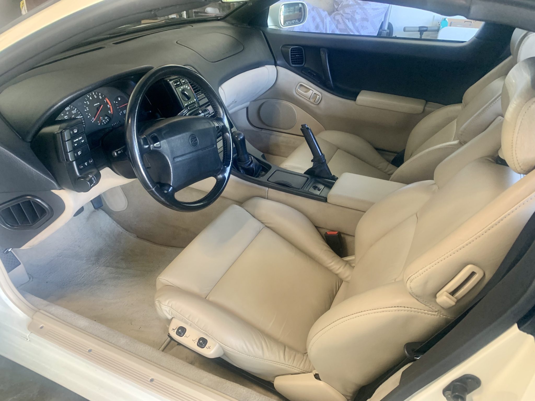 The car is finished in Glacier White Pearl Glow over tan leather and is powered by a 3.0-liter V6 mated to a five-speed manual transmission and a limited-slip differential. It is equipped with 16″ alloy wheels, a black convertible soft top, fog lights, power-adjustable seats, air conditioning, cruise control, and a Kenwood CD stereo.