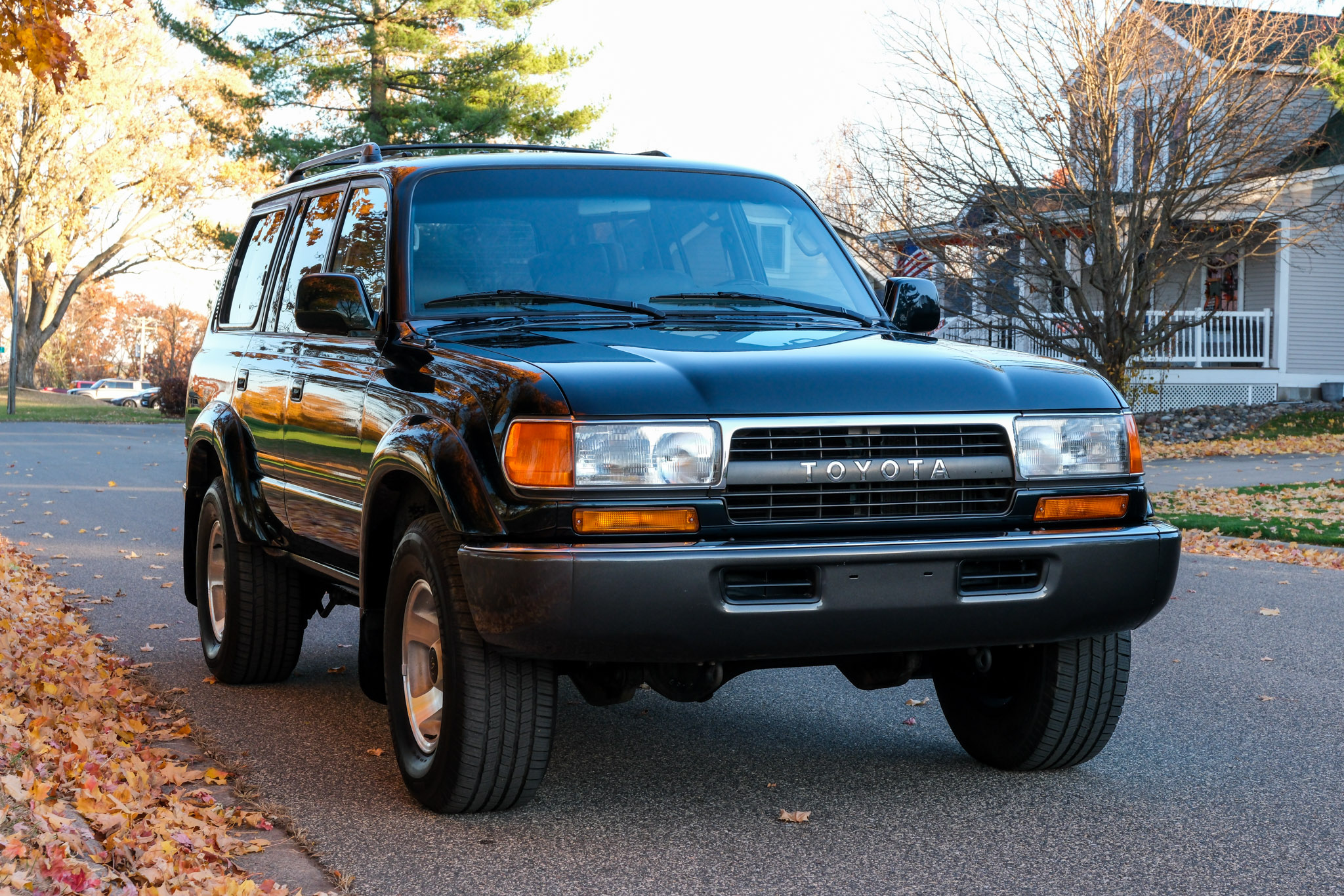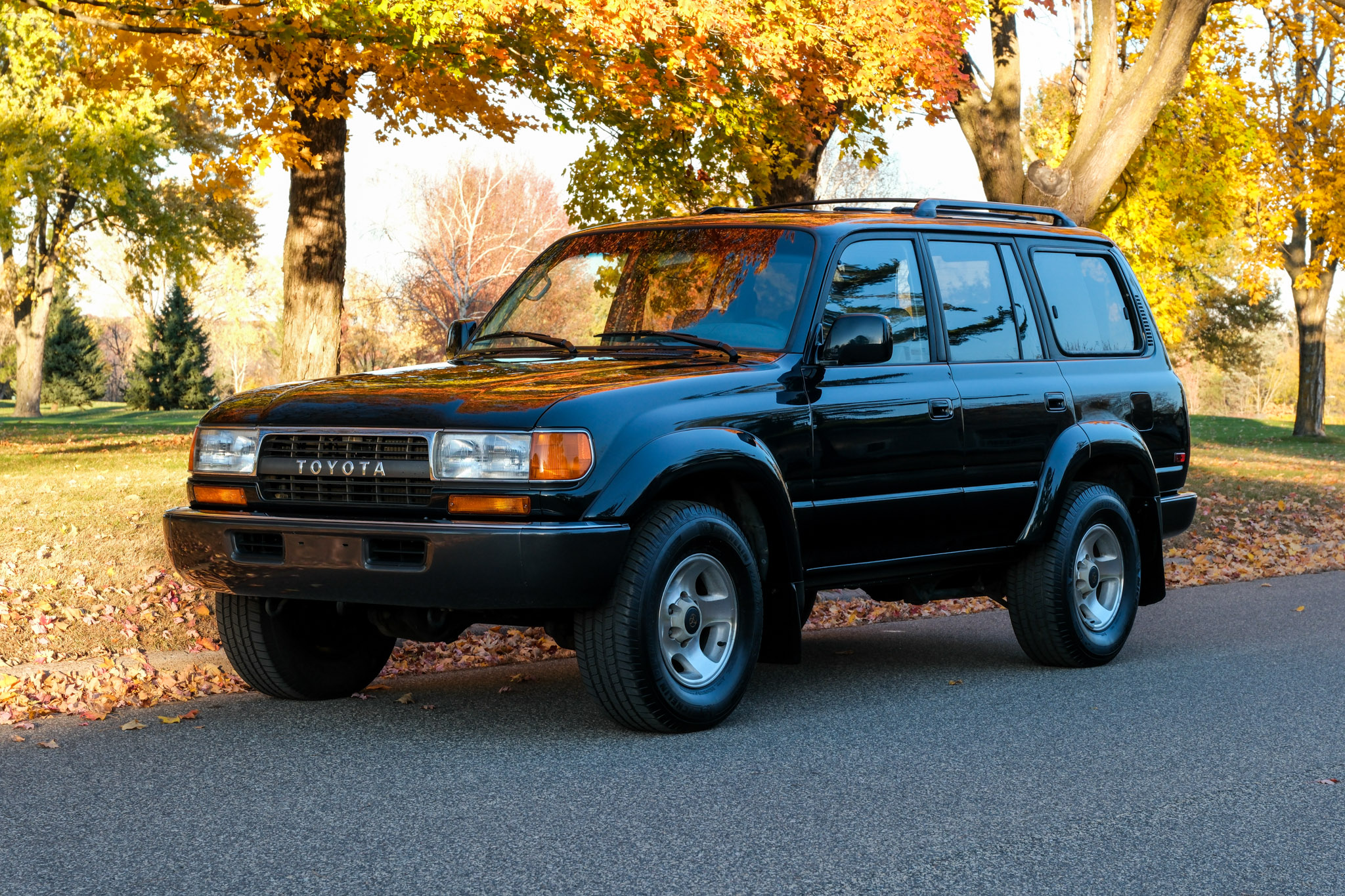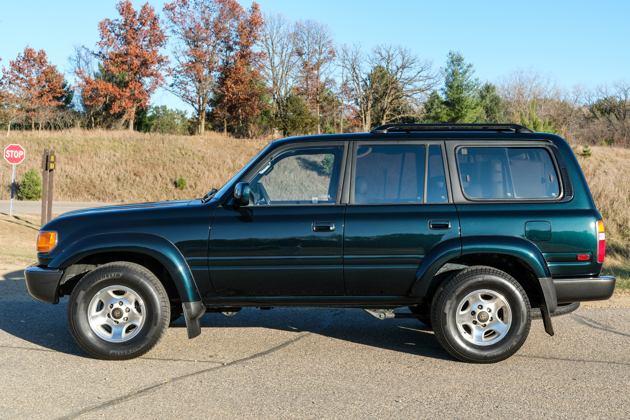 is finished in green over gray upholstery. Power is provided by a 4.5L 1FZ-FE inline-six linked with a four-speed automatic transmission, a dual-range transfer case, and a locking center differential. The truck has 16″ alloy wheels, a sunroof, a roof rack, folding third-row seats, power-adjustable front seats, cruise control, and air conditioning. This FZJ80 shows 207k miles
