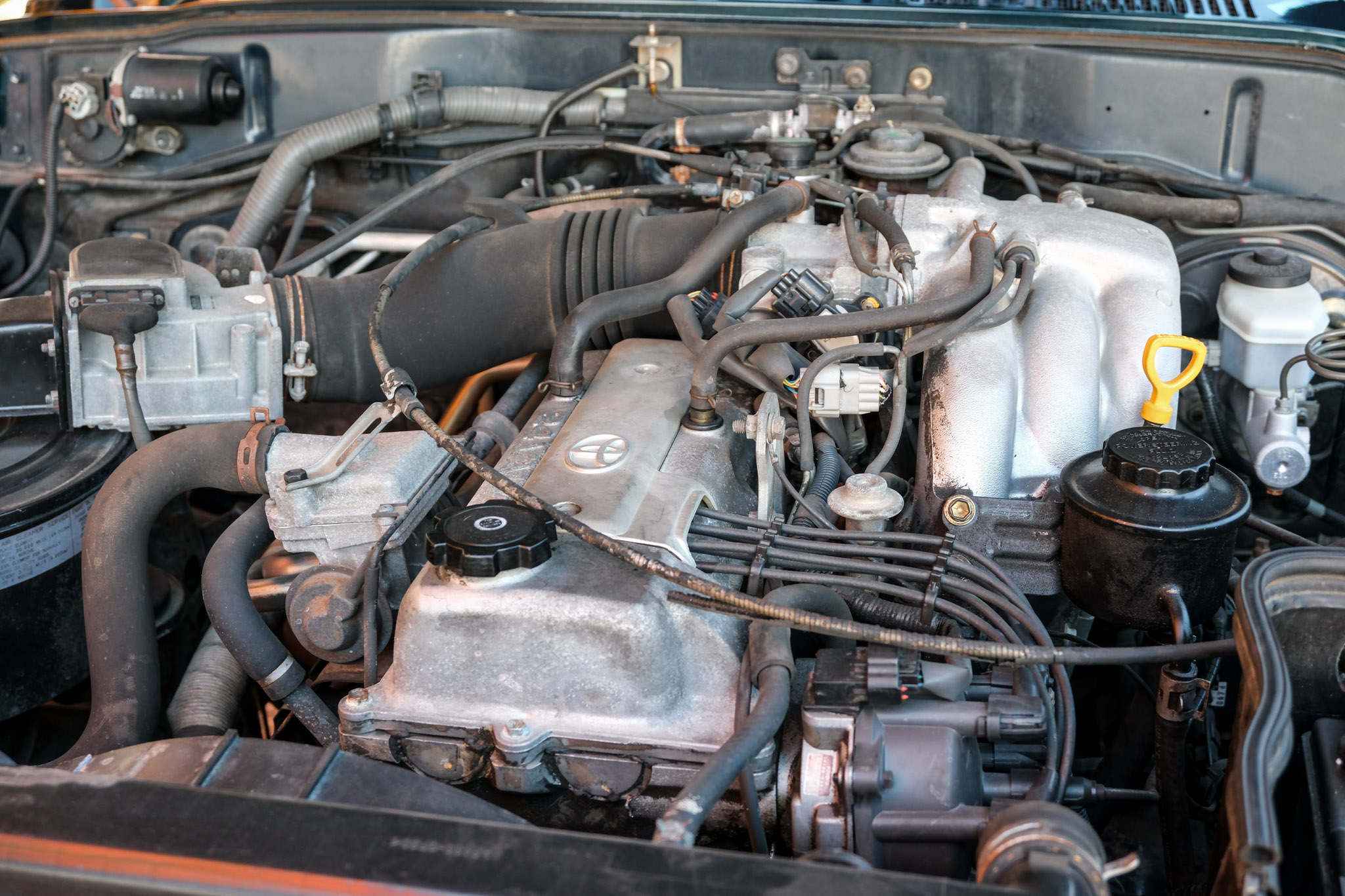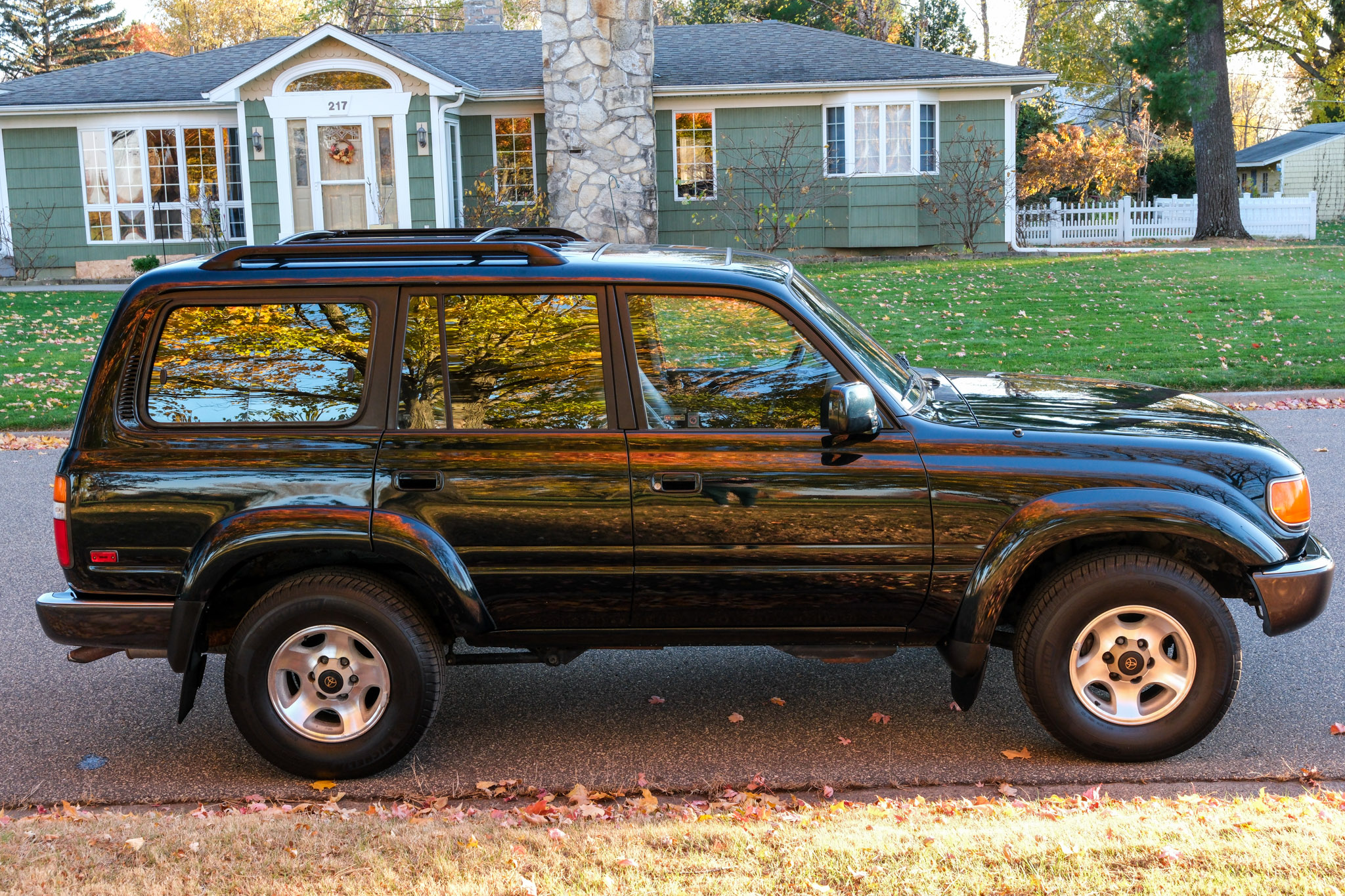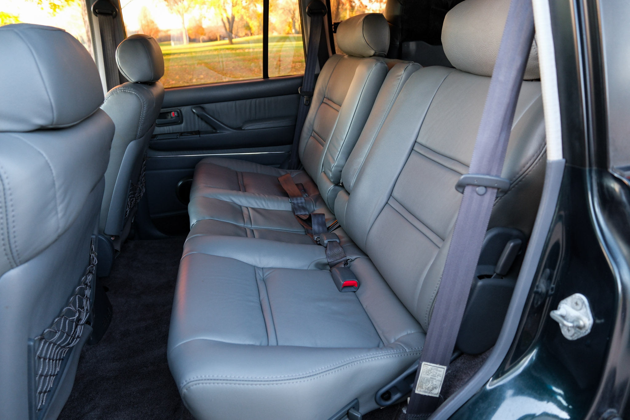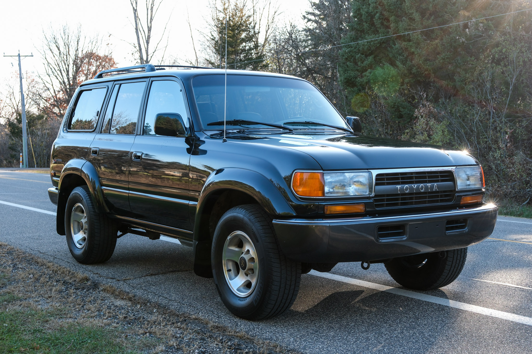 is finished in green over gray upholstery. Power is provided by a 4.5L 1FZ-FE inline-six linked with a four-speed automatic transmission, a dual-range transfer case, and a locking center differential. The truck has 16″ alloy wheels, a sunroof, a roof rack, folding third-row seats, power-adjustable front seats, cruise control, and air conditioning. This FZJ80 shows 207k miles