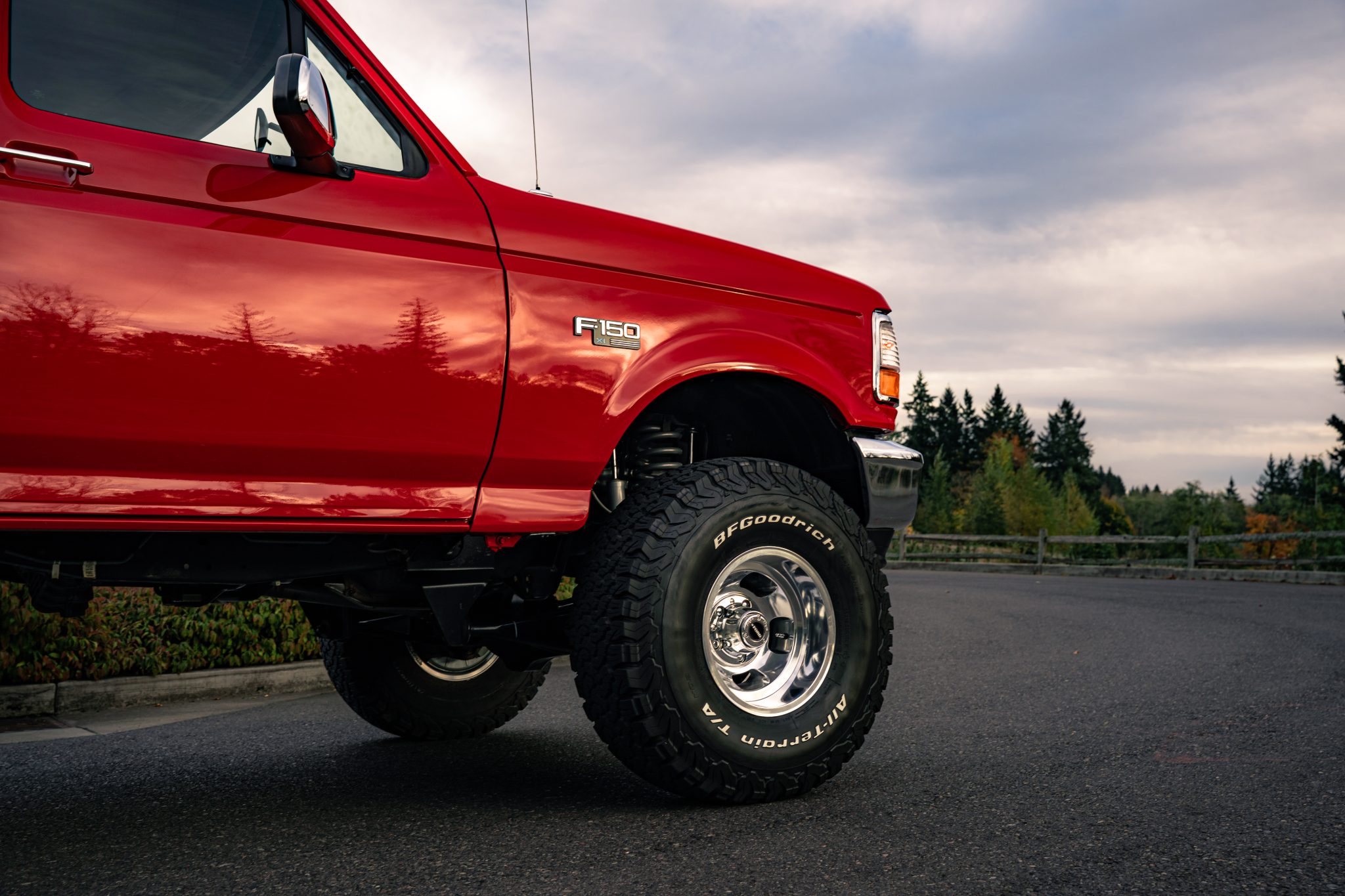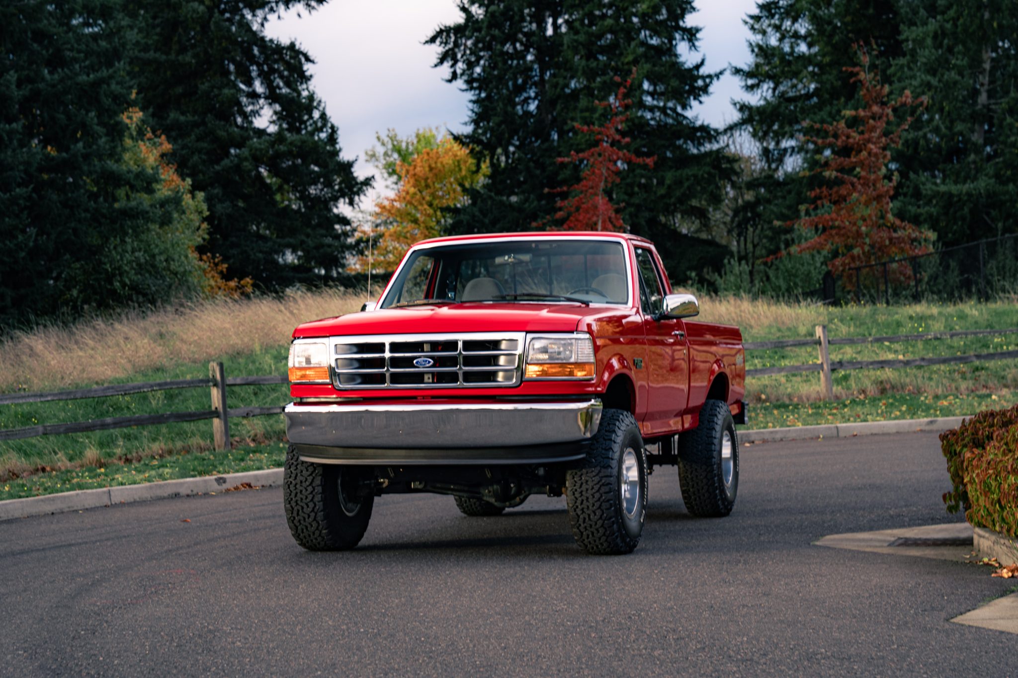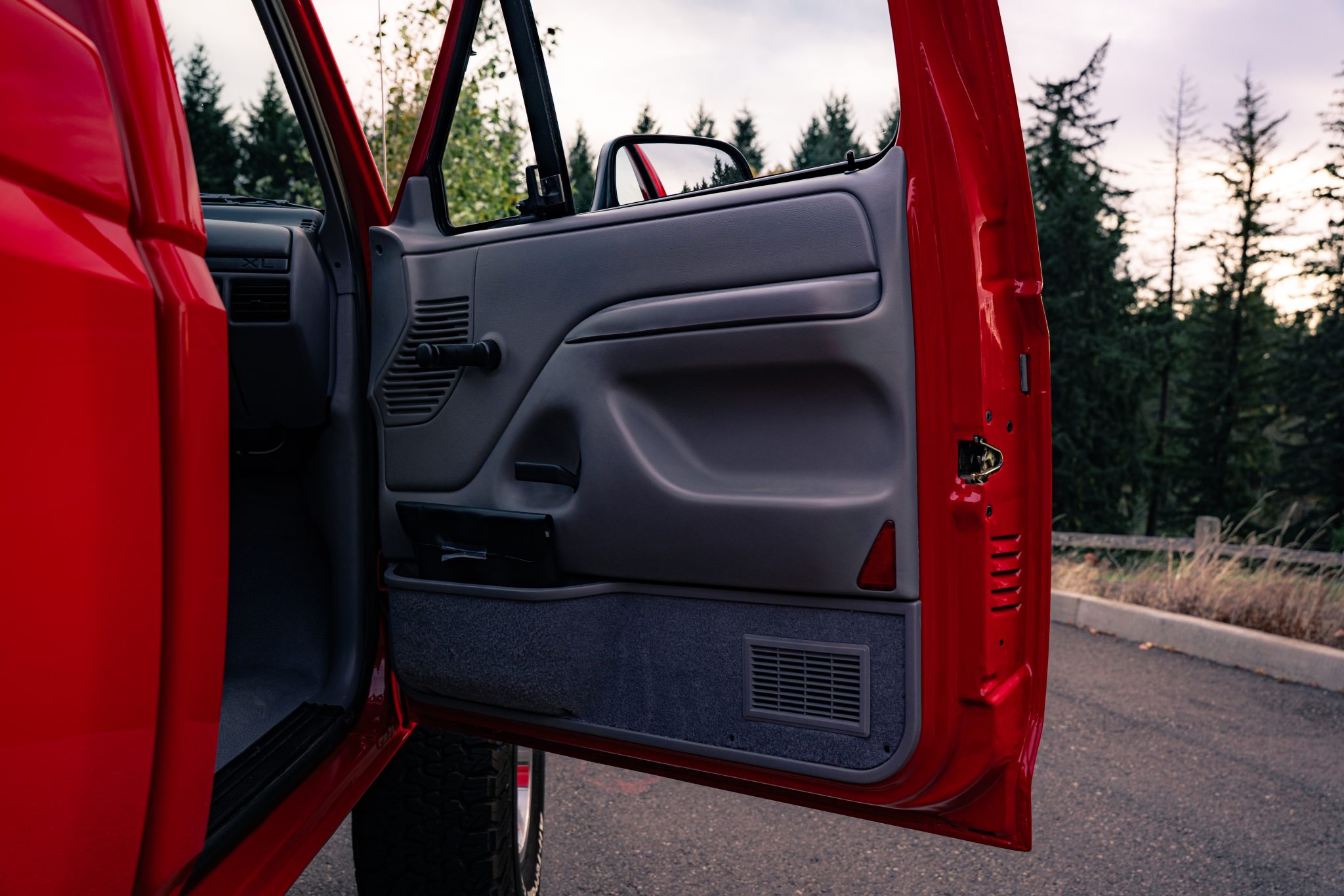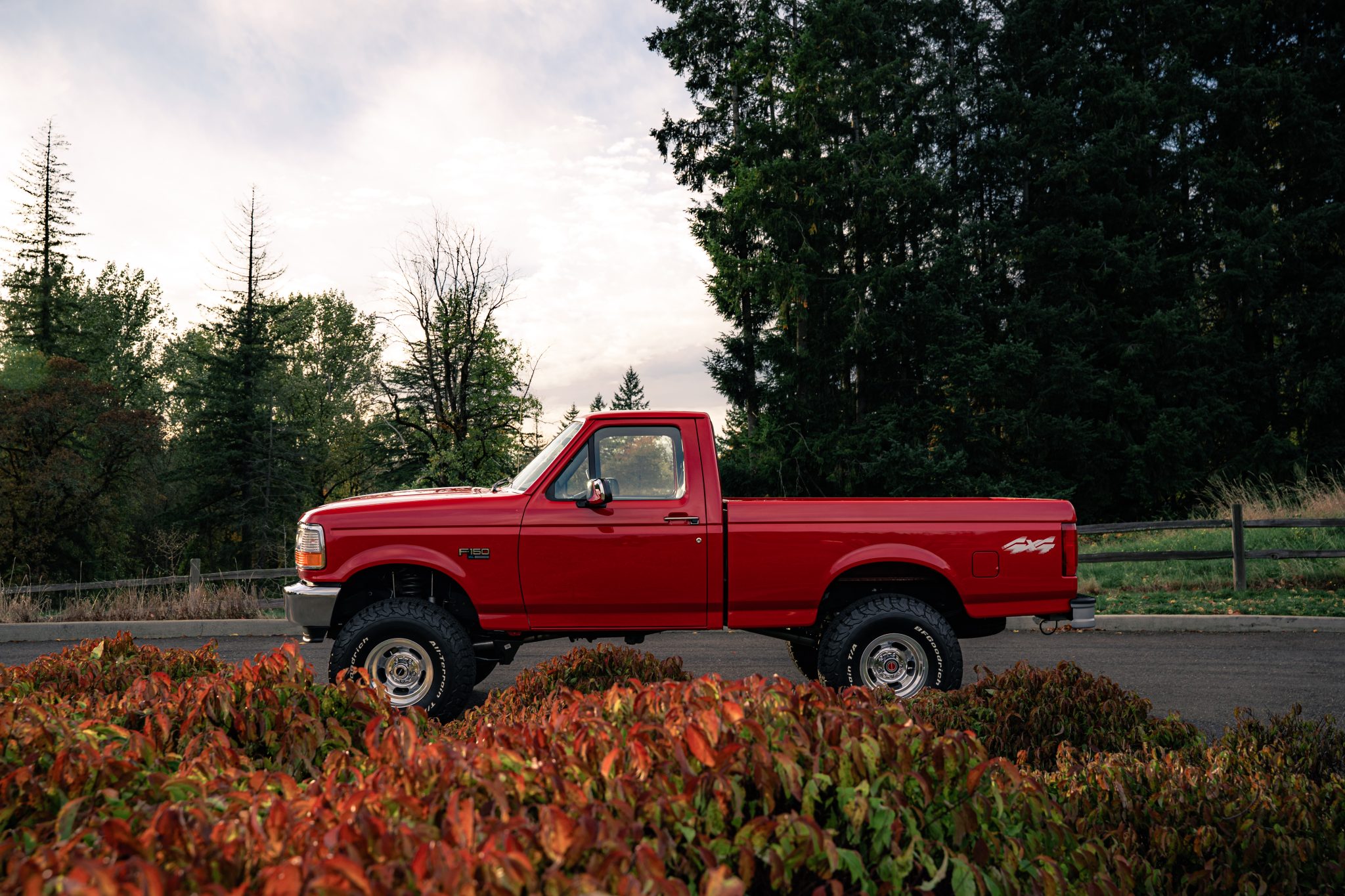 This 1995 Ford F-150 XL 4×4 pickup remained has 8k miles  Finished in Bright Red over Opal Gray cloth, the truck is powered by a 5.0-liter V8 linked with a five-speed manual transmission, a dual-range transfer case, and limited-slip front and rear differentials. Equipment includes a 4″ Rough Country suspension lift, 15″ slotted alloy wheels, air conditioning, cruise control, and a cassette stereo.