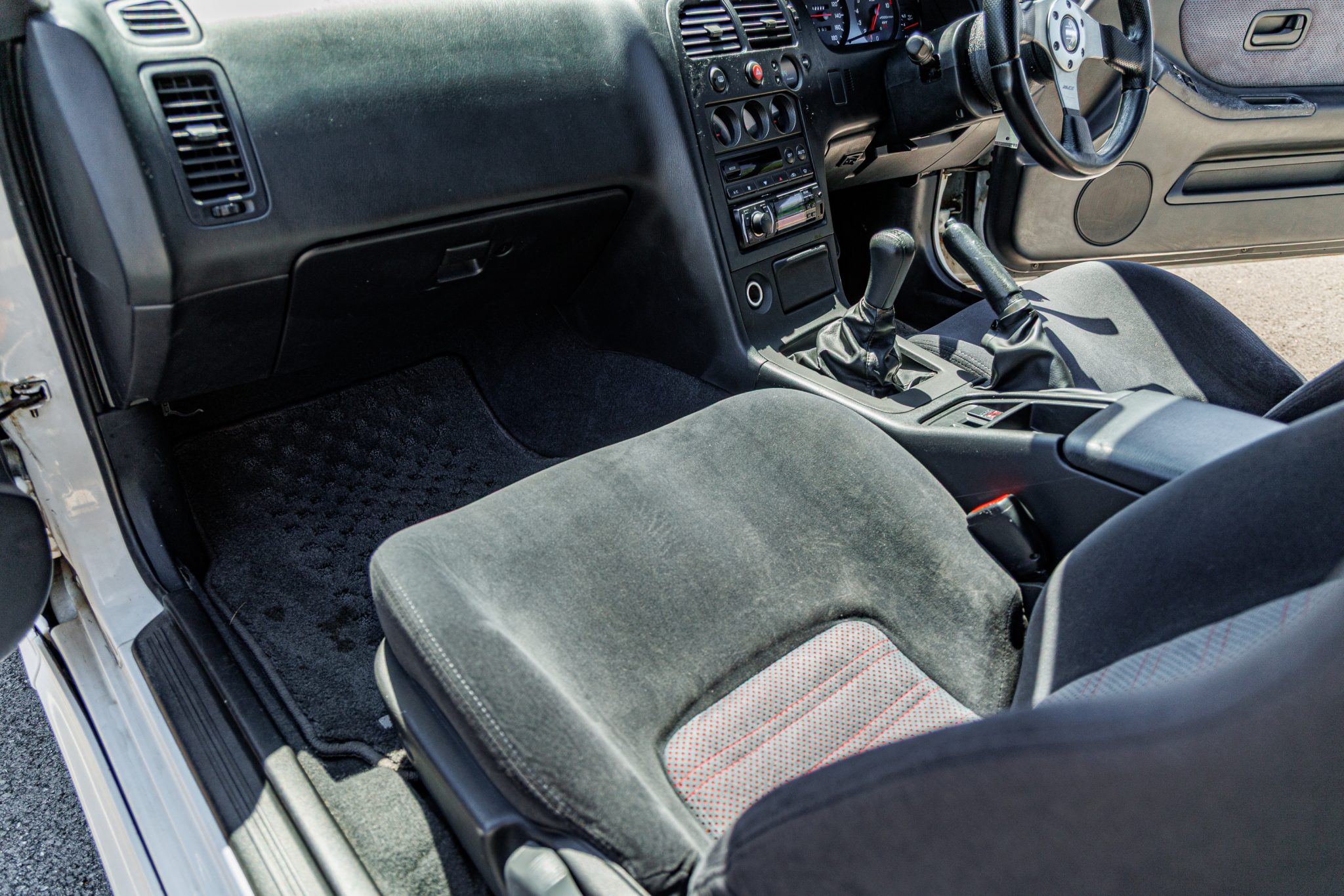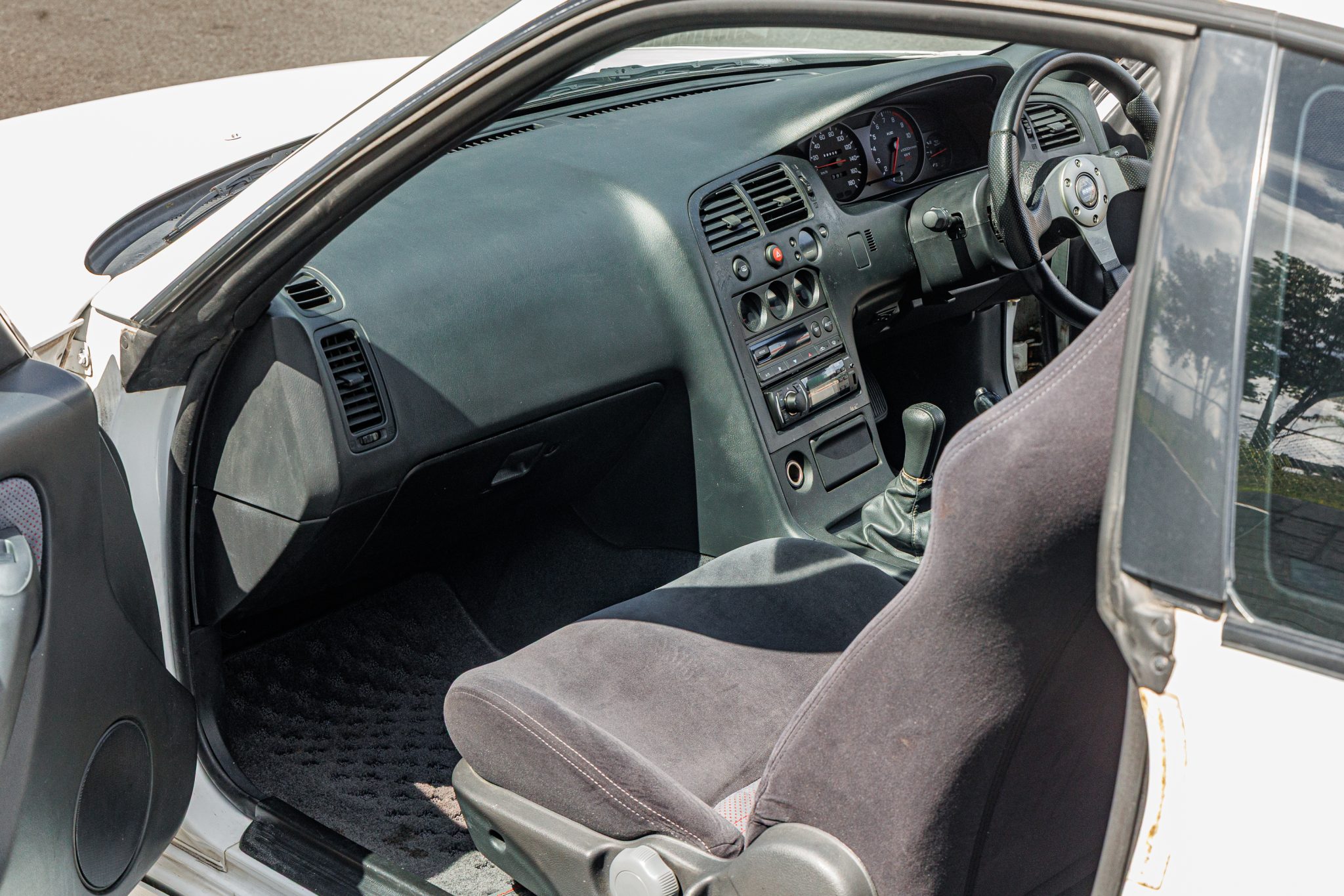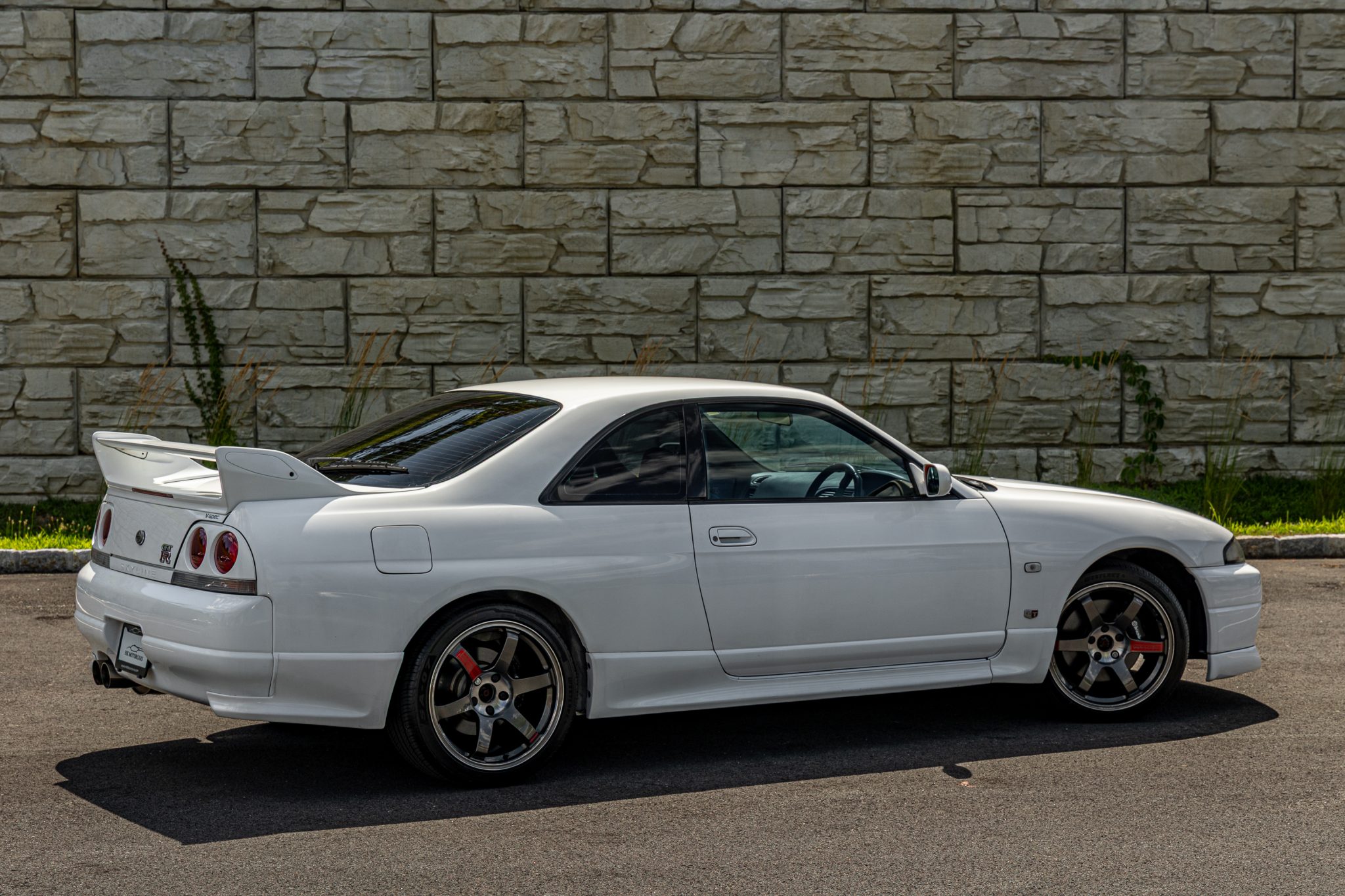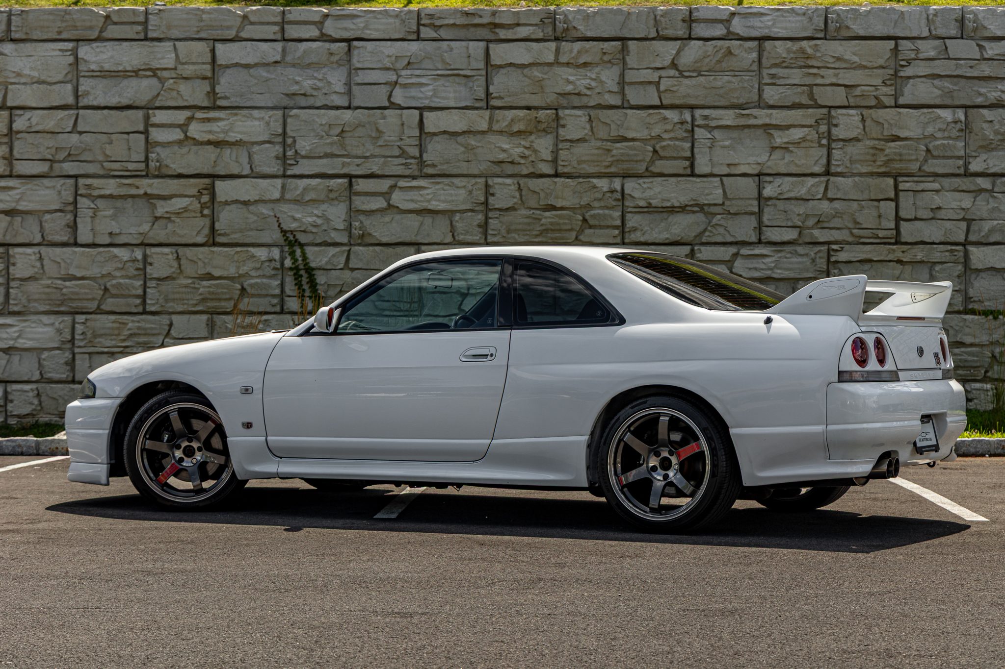 This 1995 Nissan Skyline GT-R is finished in white over two-tone gray cloth and powered by a twin-turbocharged 2.6L inline-six linked with a five-speed manual transmission and an ATTESA E-TS all-wheel-drive system with a limited-slip rear differential. It rides on 18″ RAYS Volk Racing TE37SL forged alloy wheels coupled with Brembo disc brakes and Tein adjustable coilovers at all four corners and is further equipped with Super HICAS rear-axle steering. Additional features include a front lip spoiler and rear wing along with a MOMO steering wheel, a Boss digital media receiver, a NISMO downpipe, and an aftermarket muffler.