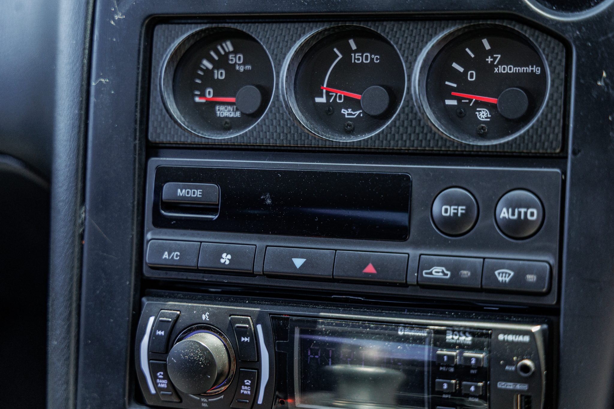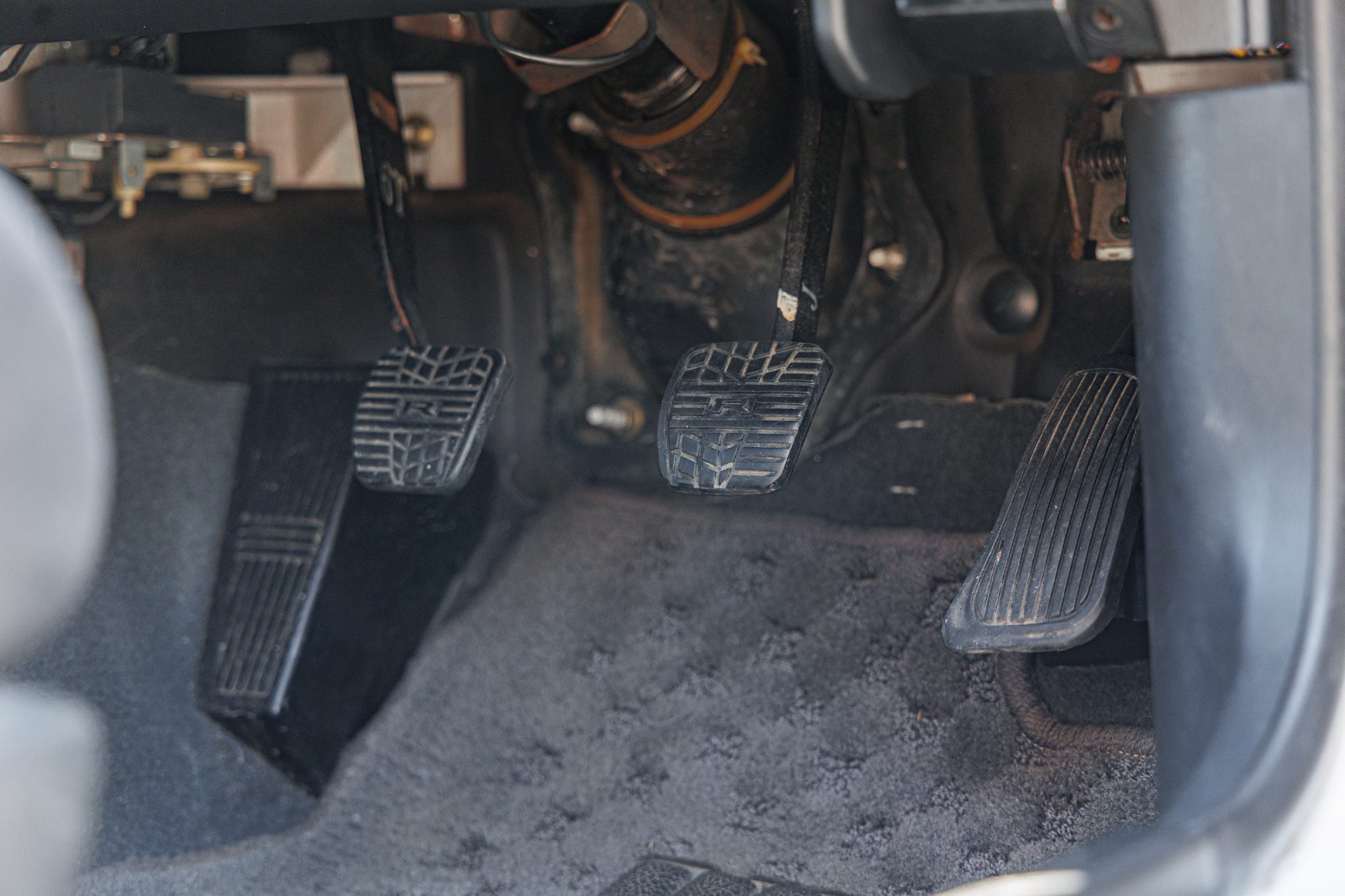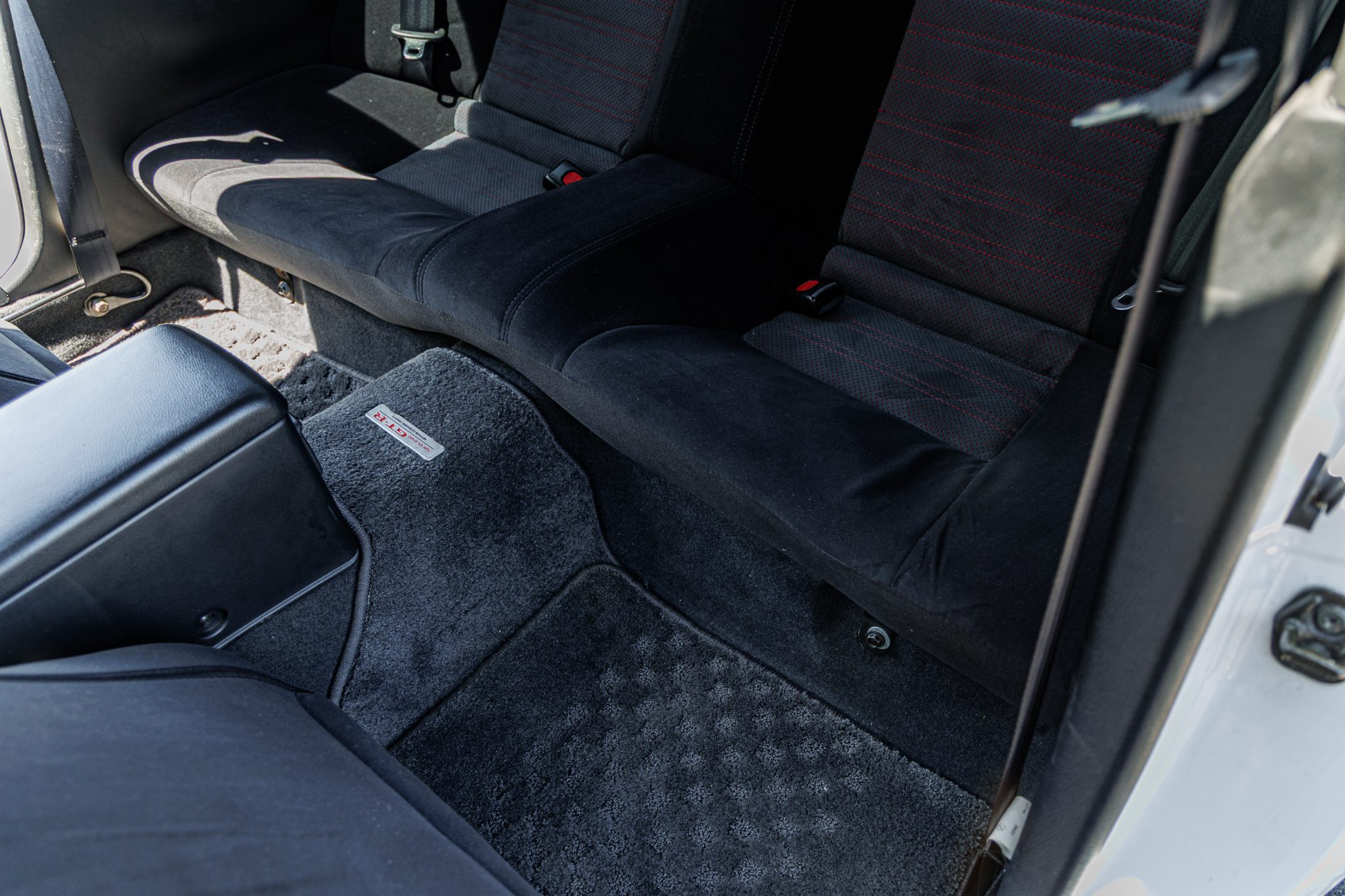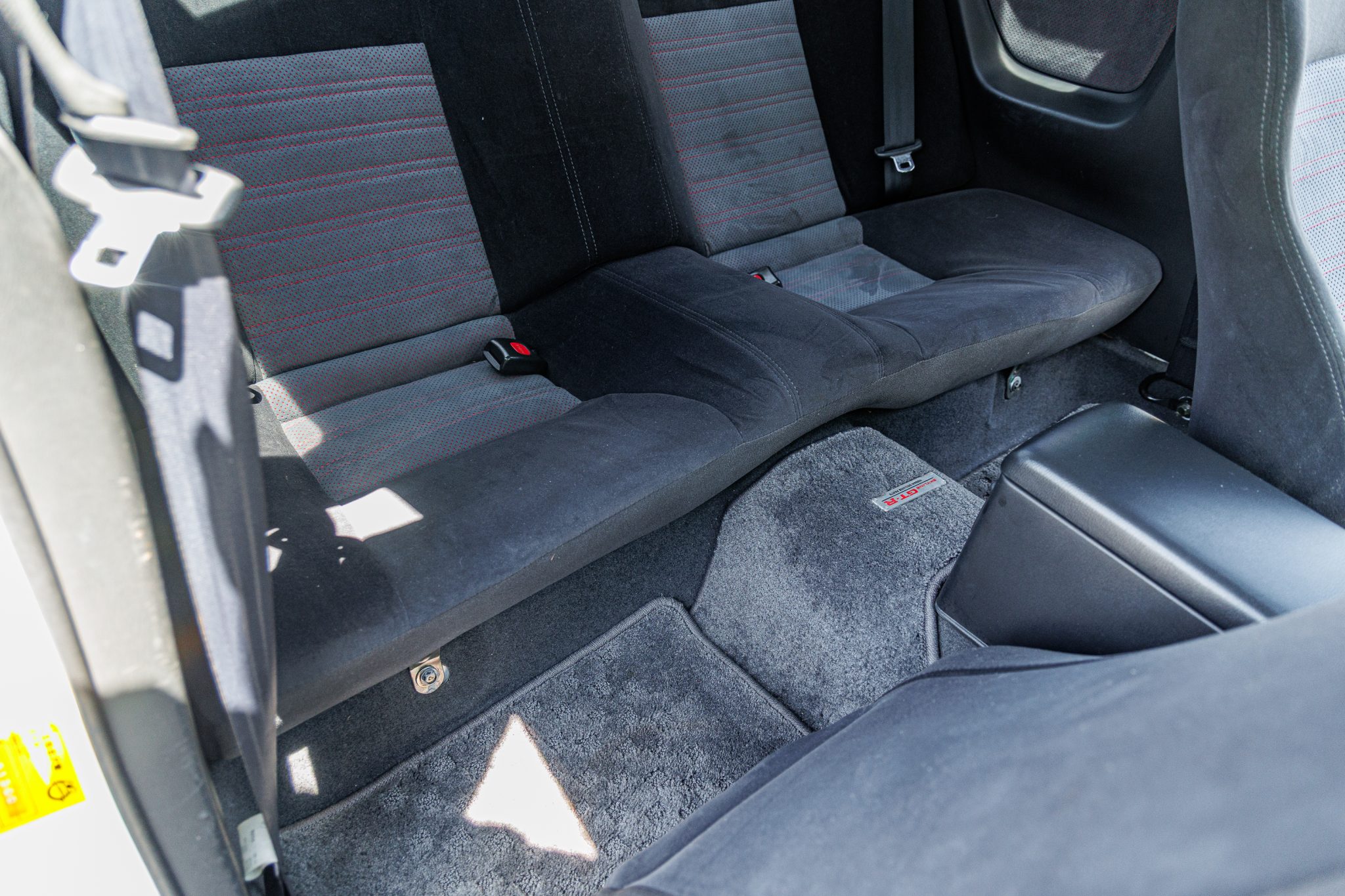 This 1995 Nissan Skyline GT-R is finished in white over two-tone gray cloth and powered by a twin-turbocharged 2.6L inline-six linked with a five-speed manual transmission and an ATTESA E-TS all-wheel-drive system with a limited-slip rear differential. It rides on 18″ RAYS Volk Racing TE37SL forged alloy wheels coupled with Brembo disc brakes and Tein adjustable coilovers at all four corners and is further equipped with Super HICAS rear-axle steering. Additional features include a front lip spoiler and rear wing along with a MOMO steering wheel, a Boss digital media receiver, a NISMO downpipe, and an aftermarket muffler.